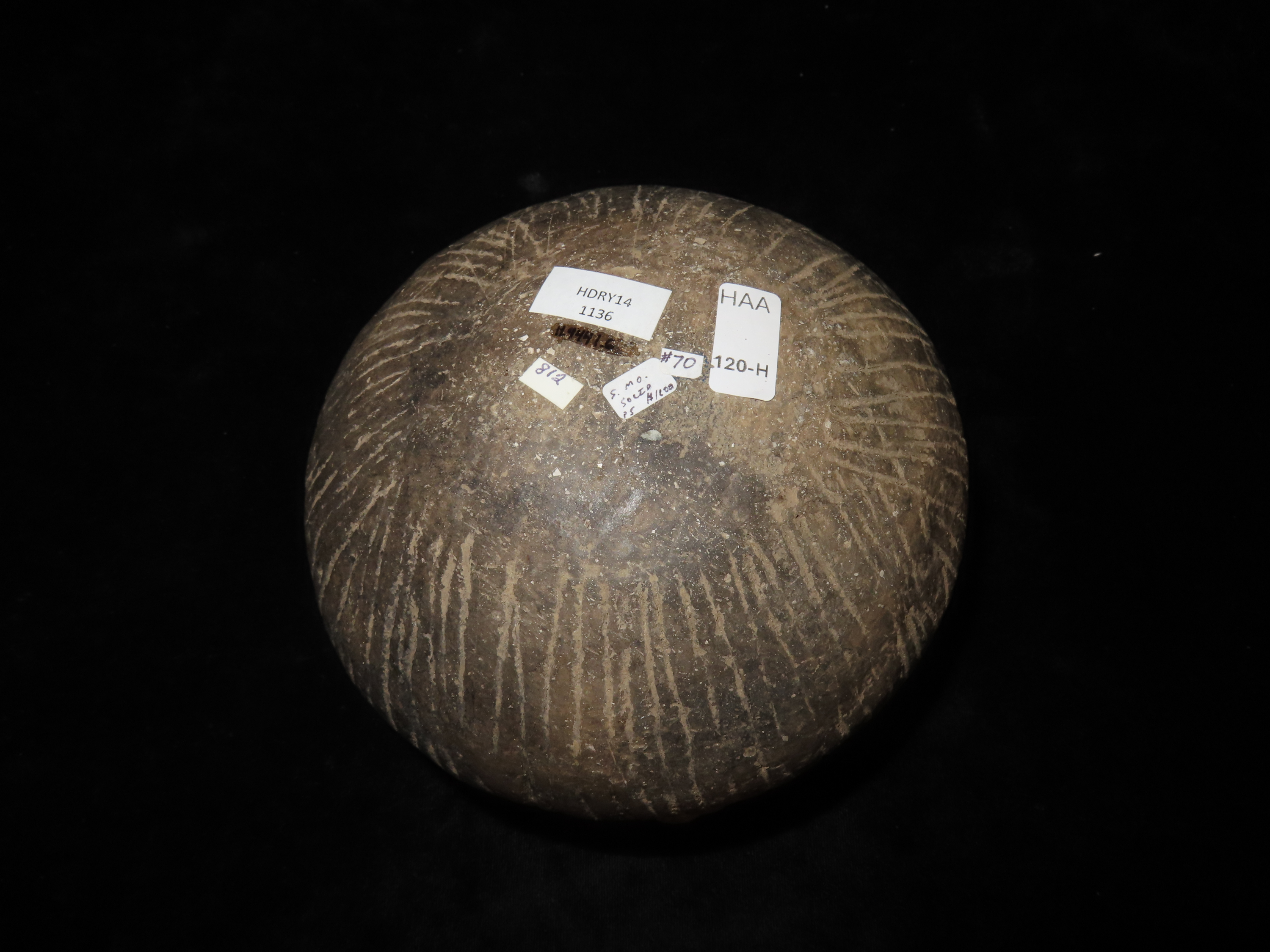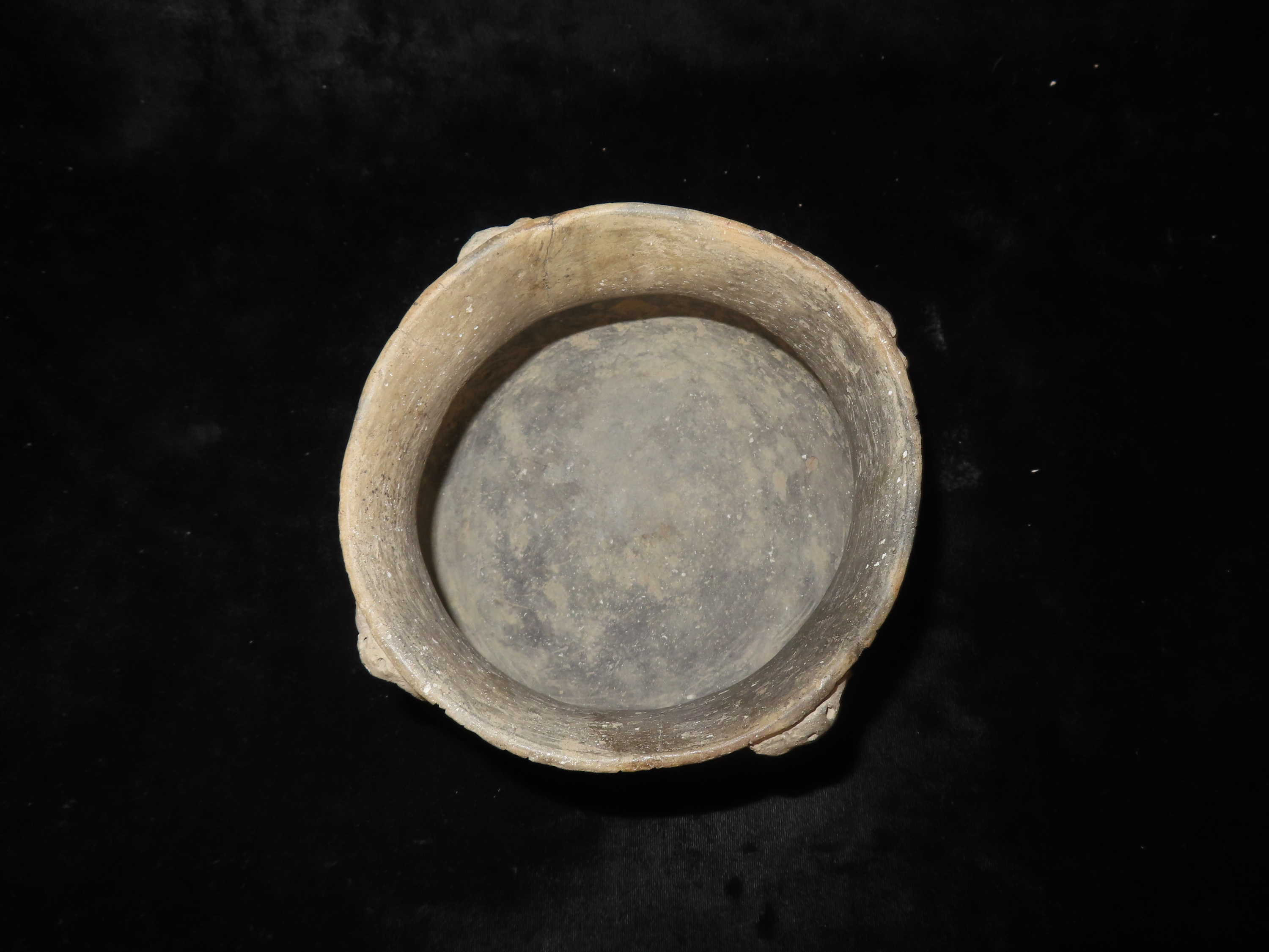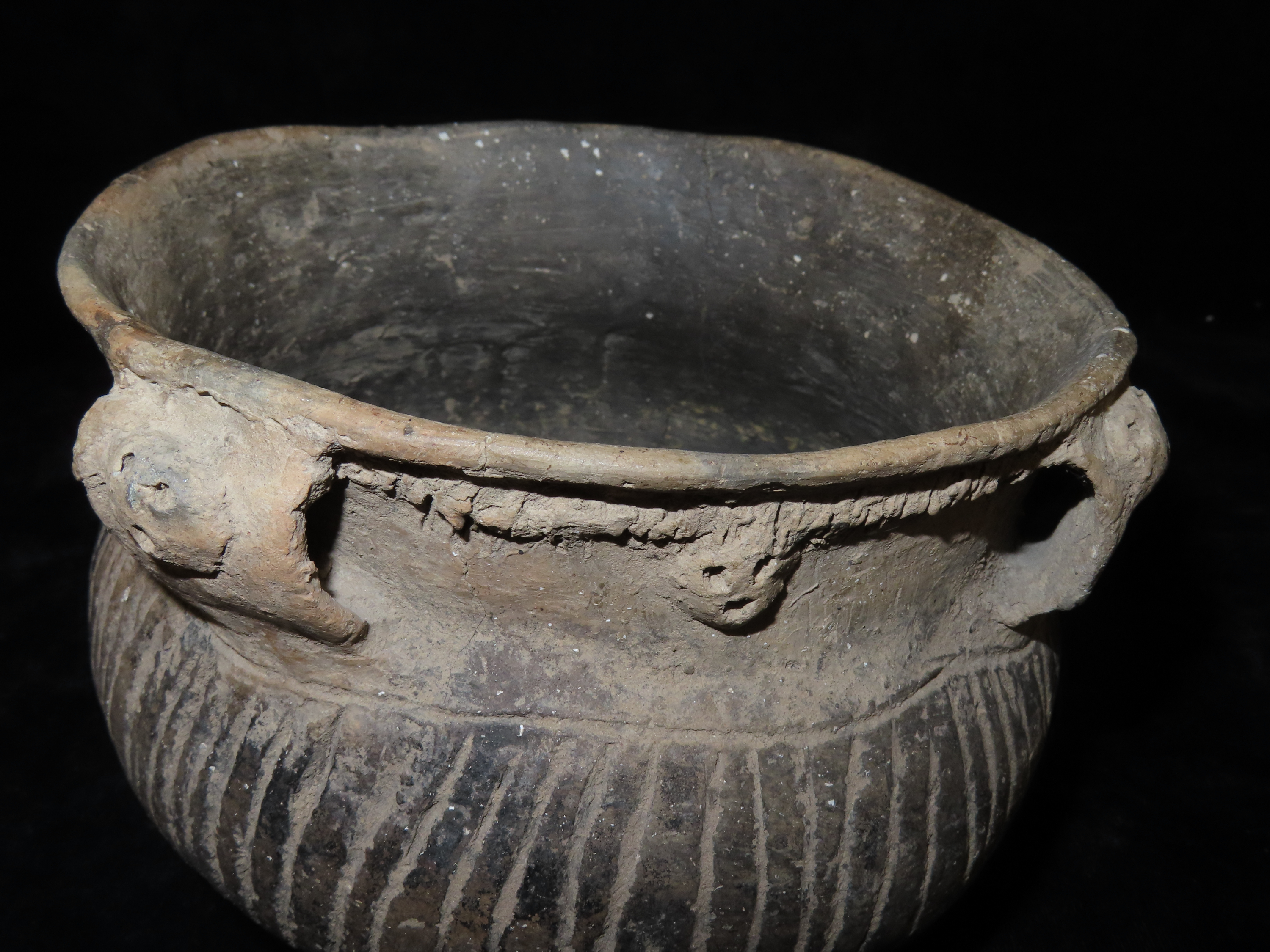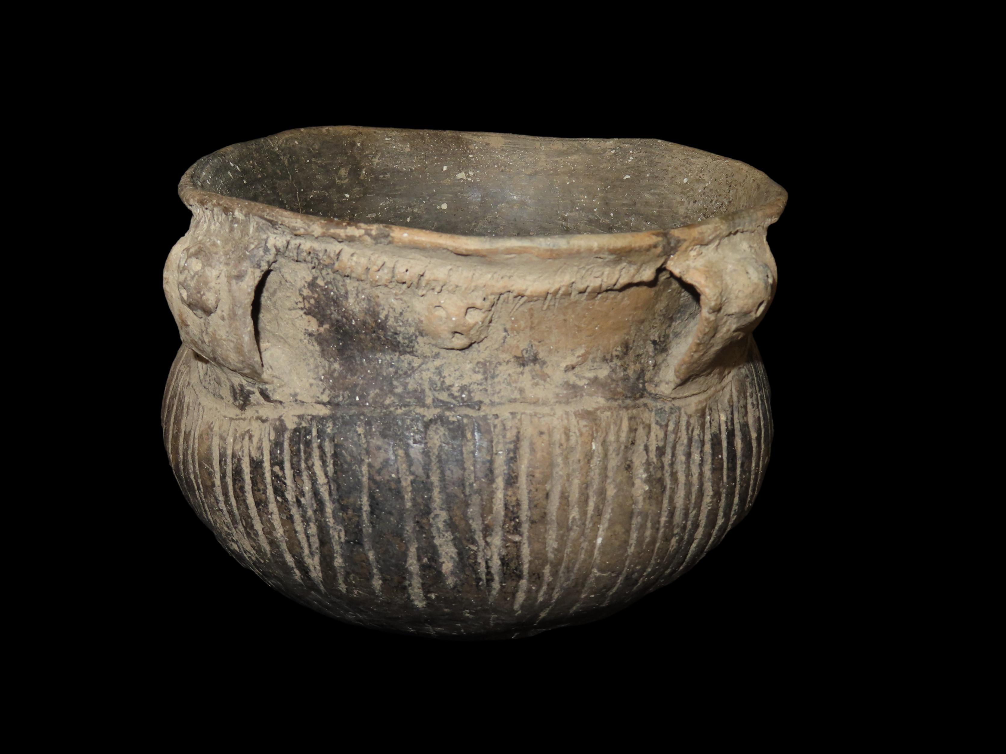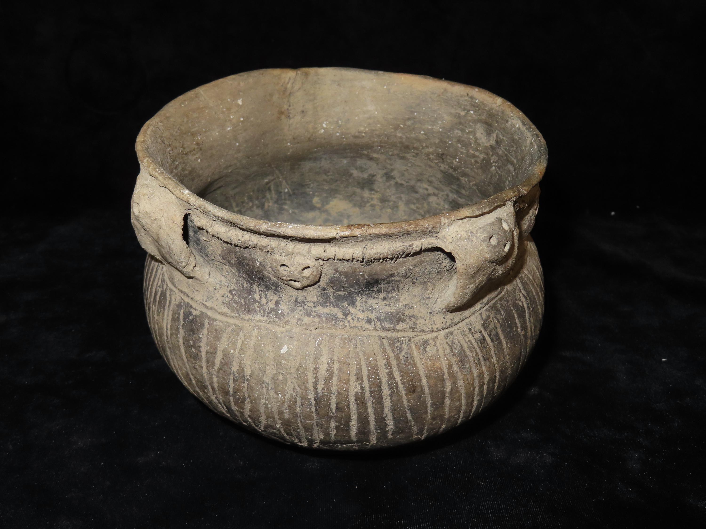 Impressive Human Effigy Strap Handle Pottery Bowl, S. Missouri. Has 8 detailed Faces around the bowl, one one each of the 4 strap handles and another inbetween each of the handles. Also Nicely Engraved around the entire bowl with a raised rope design also around the top egde. Very nice example with a lot of extra details! Solid condition with no restoration, does have a couple of small pressure cracks, but they have never been repaired or glued, and appear very stable. Nice rare pot!