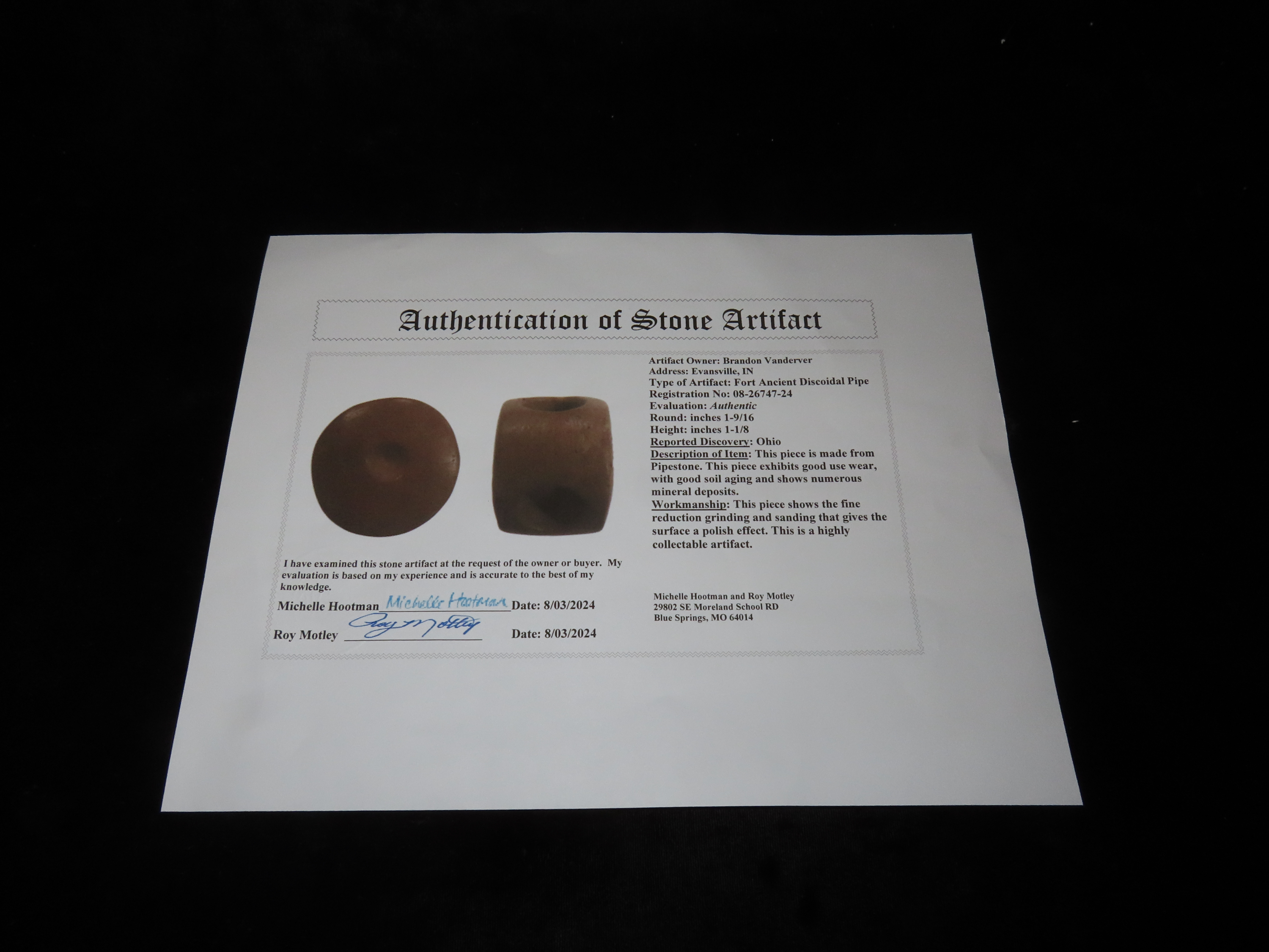 Incredible Fort Ancient Discoidal Effigy Pipe from Ohio. Motley COA. Made from a well polished and nicely patianted piece of Pipestone. Nice rare example!