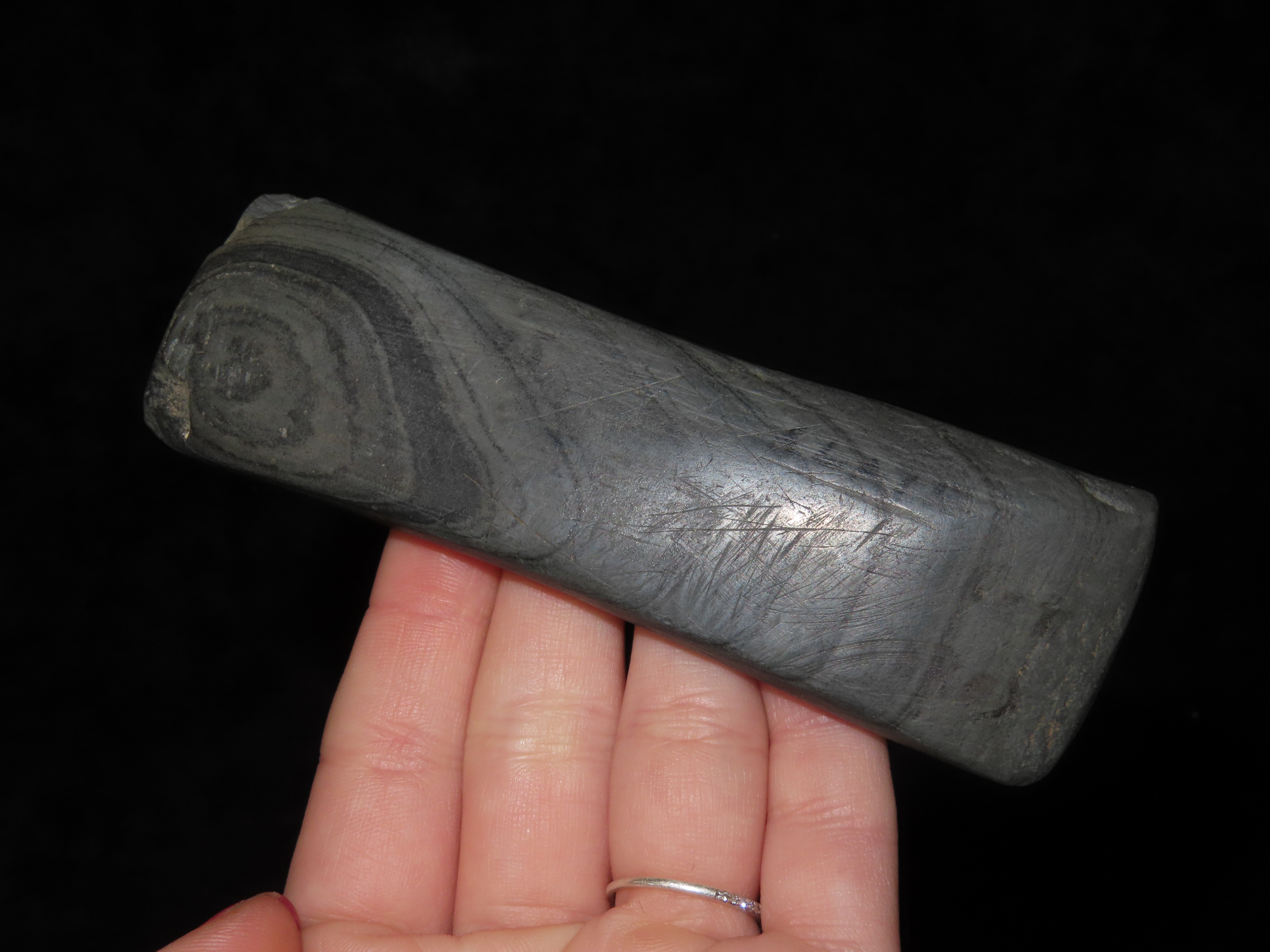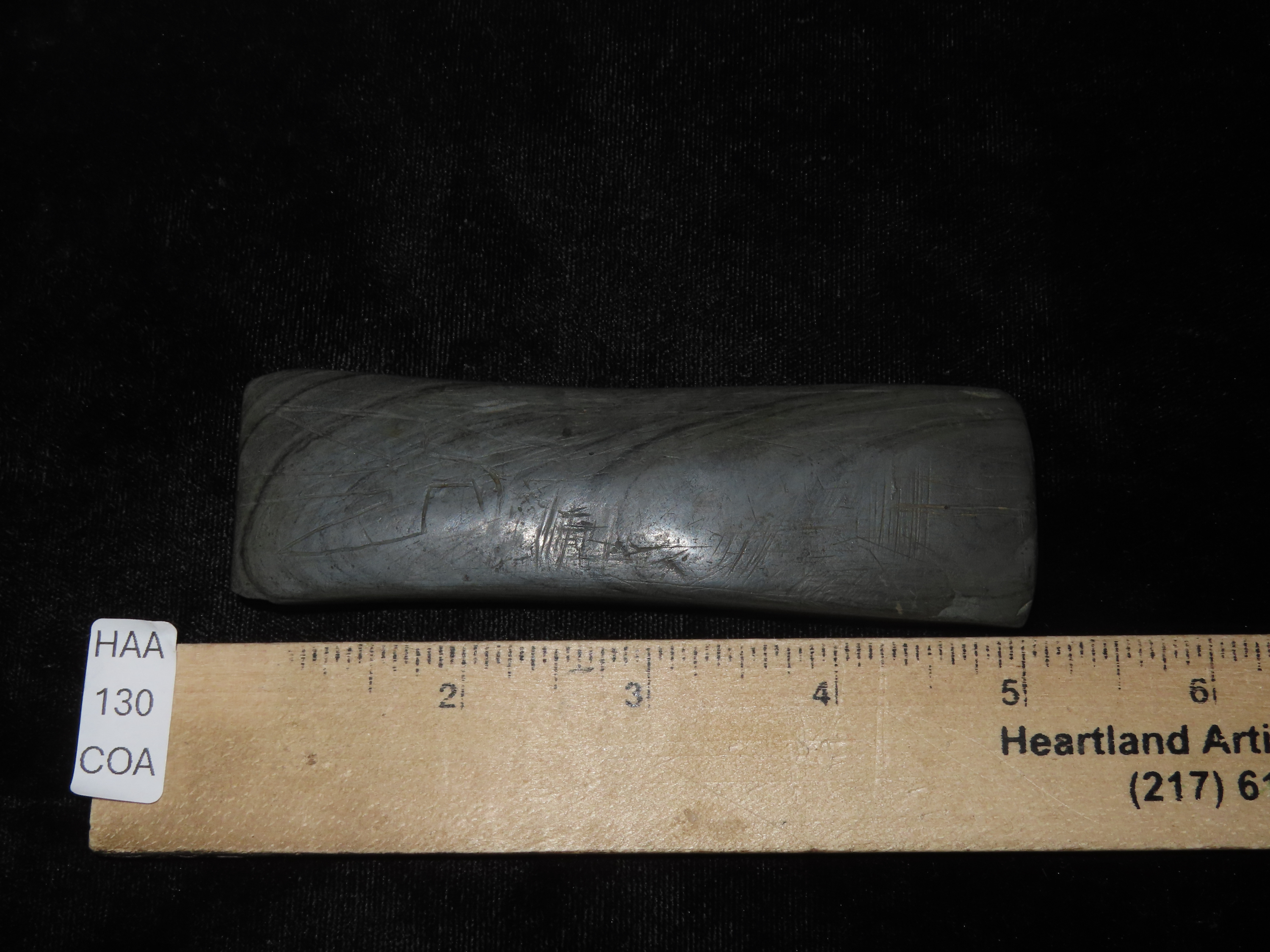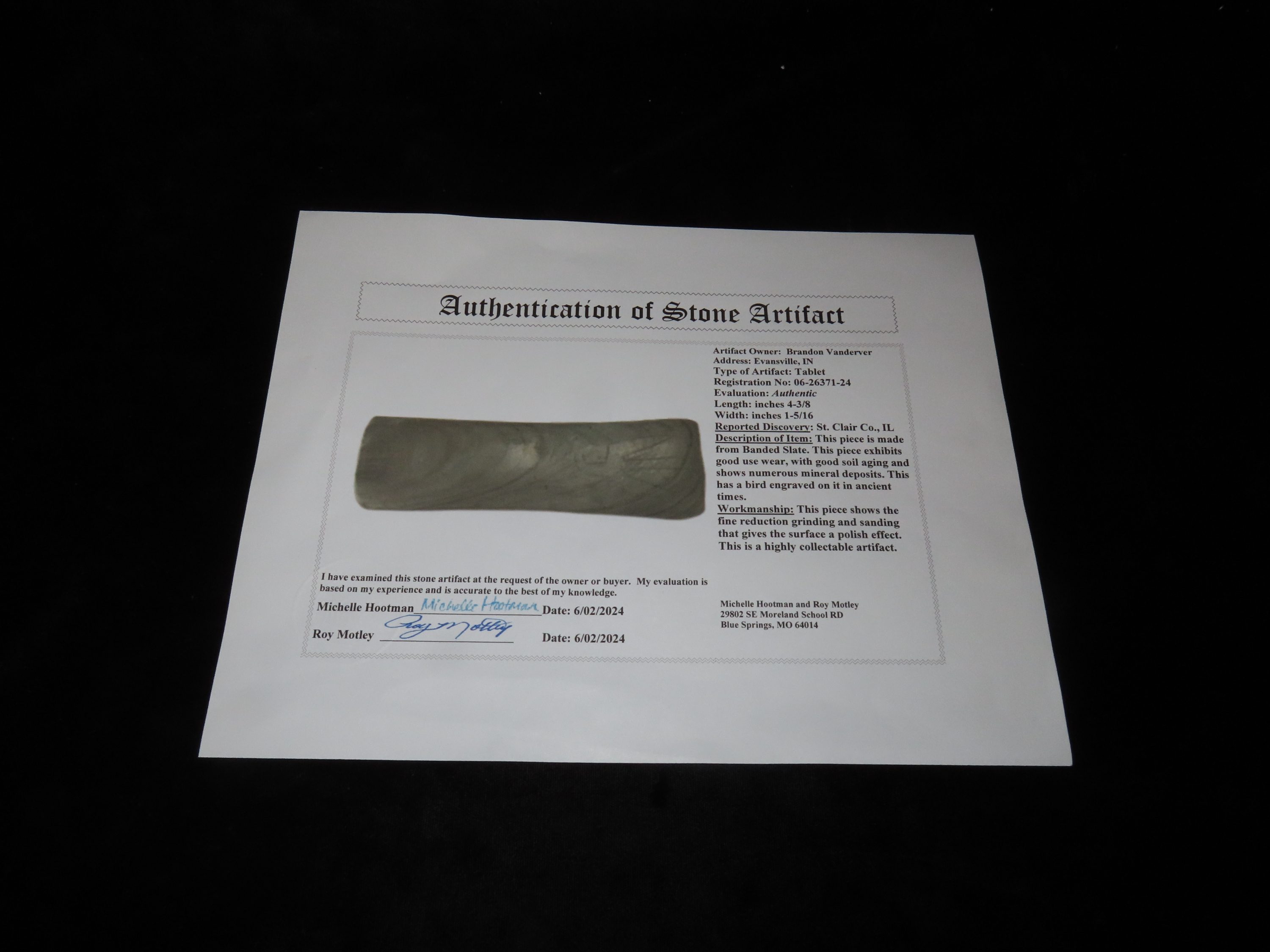 Rare Engraved Cahokia Tablet, St. Clair Co. Illinois. Motley COA. Has a Bird or Birdman nicely carved on one side. Nice piece of Banded Slate with great vivid Banding, amazing polish. Nice rare artifact with heavy no brainer Patina!
