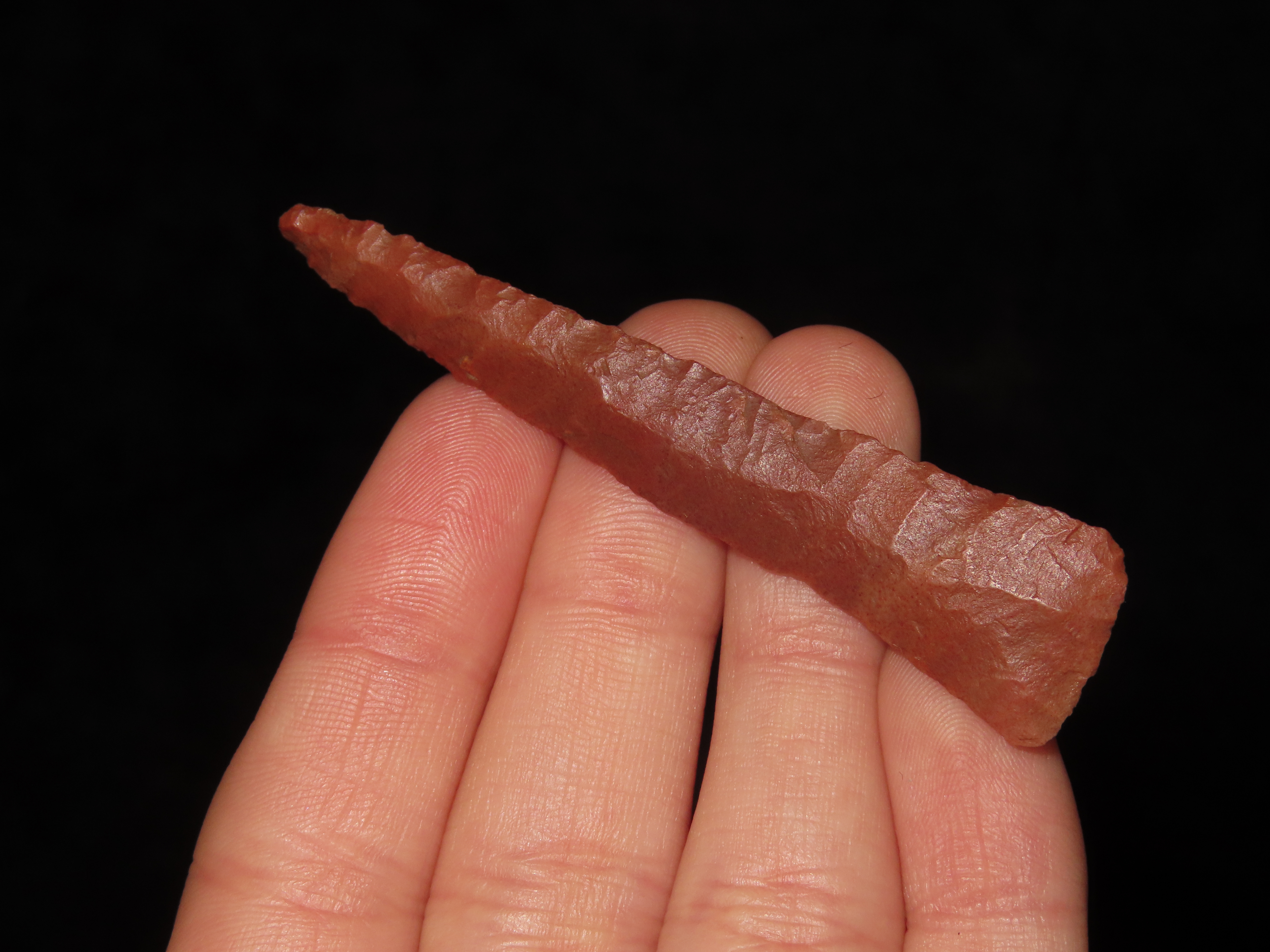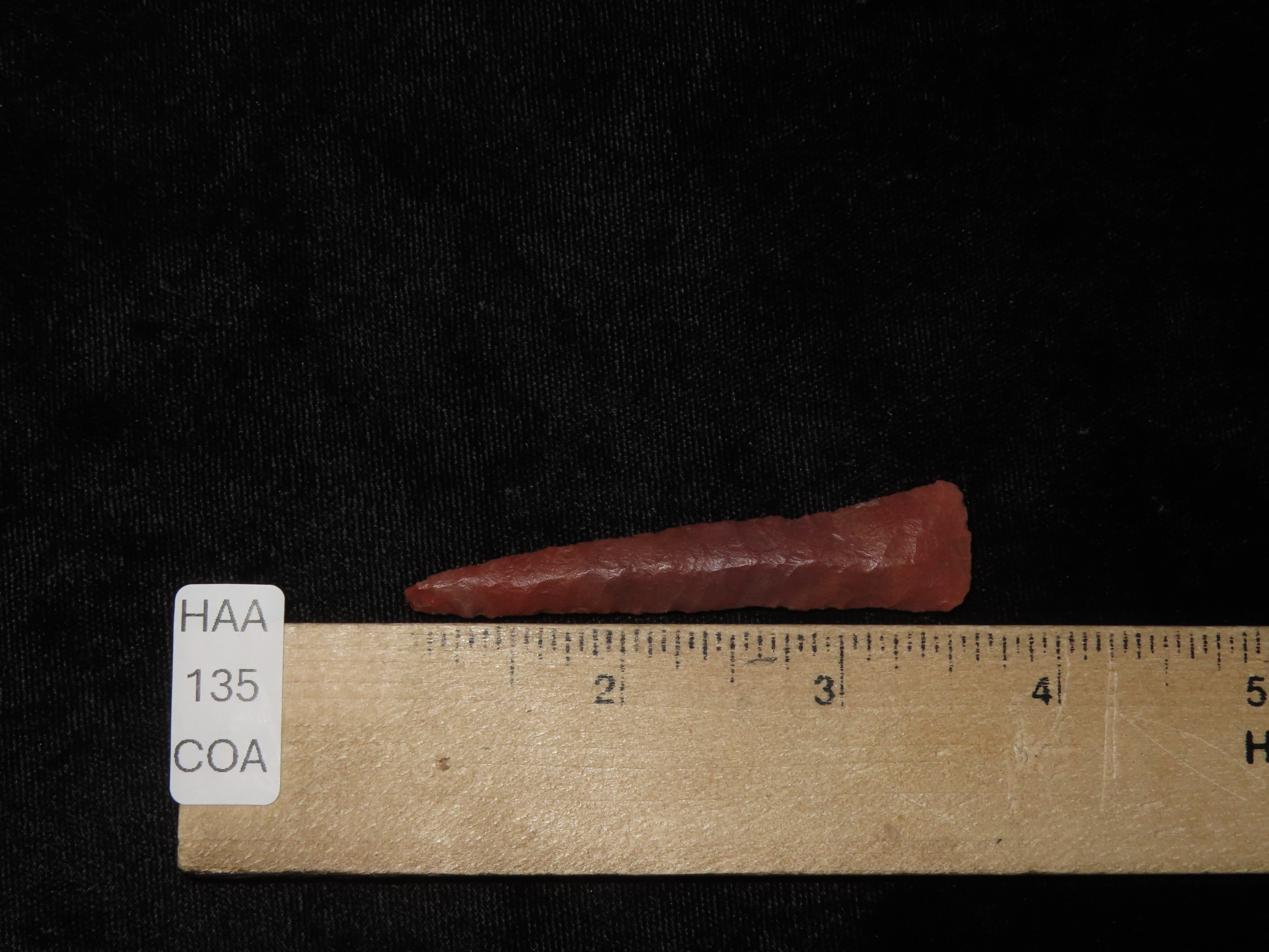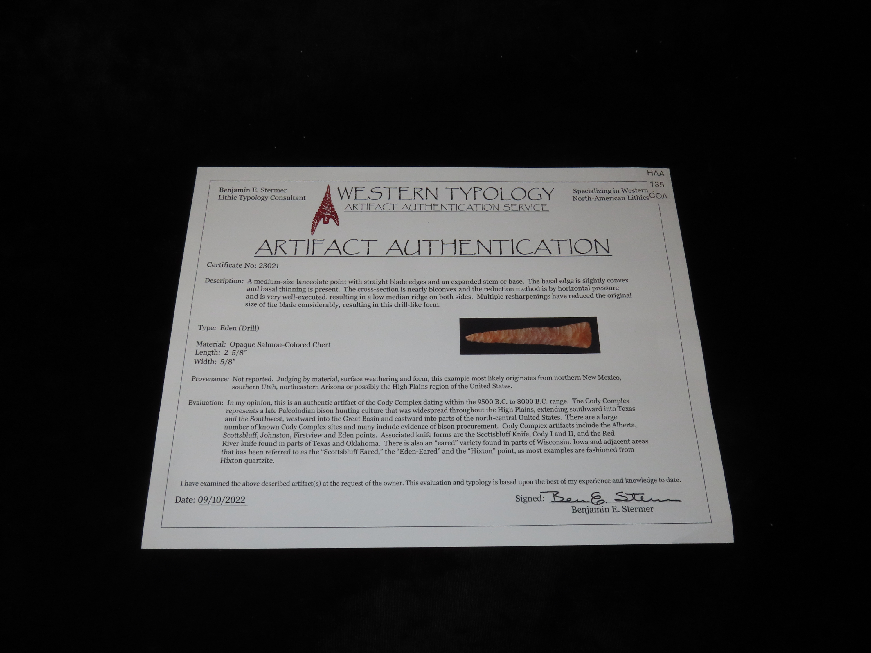 Amazing 2 5/8″ Eden, Stermer COA. Incredible early flaking. Likely found in the New Mexico-Utah area or High Plains area. Rare Cody Complex era Paleo piece with great color and no brainer patina!
