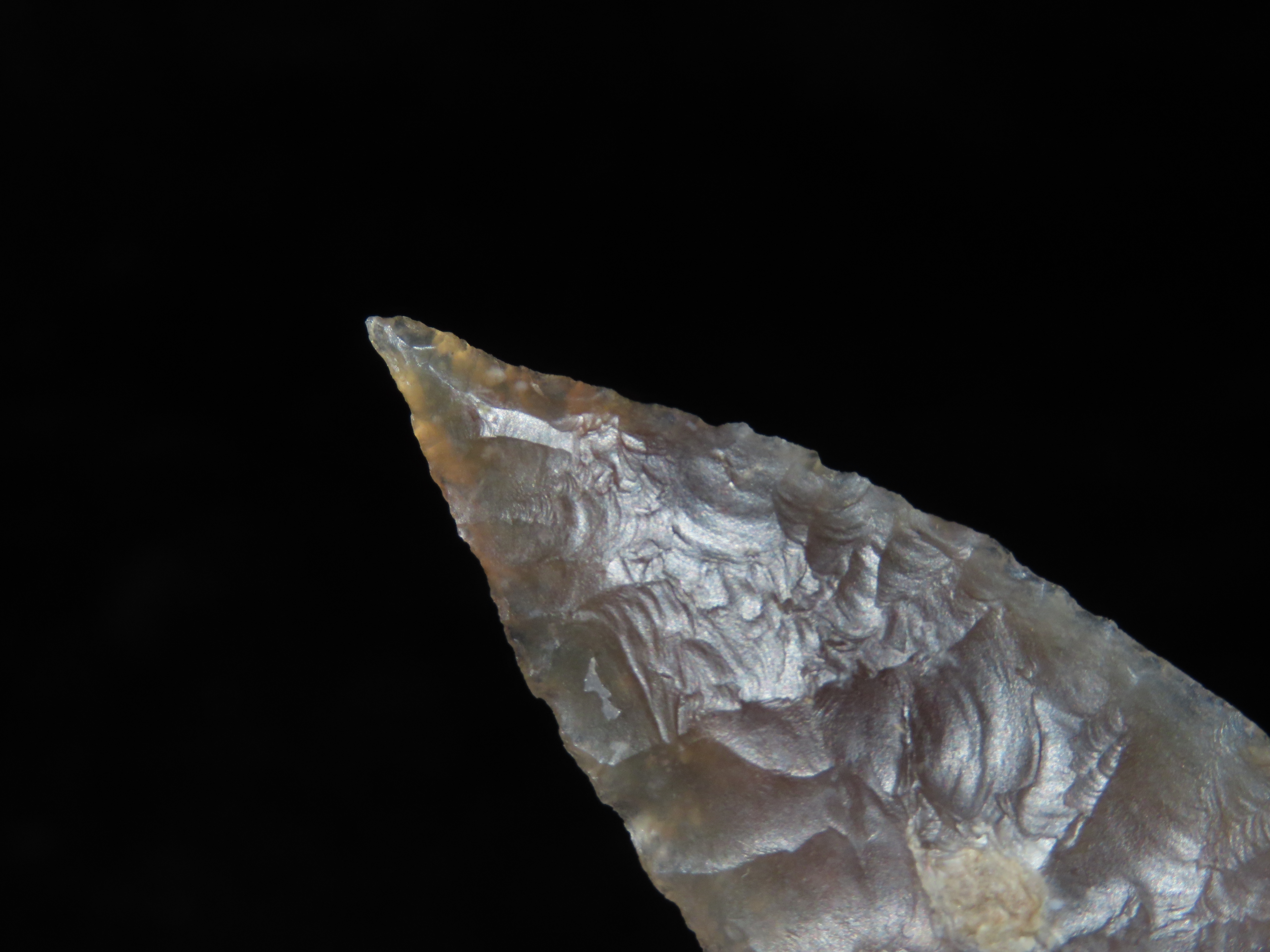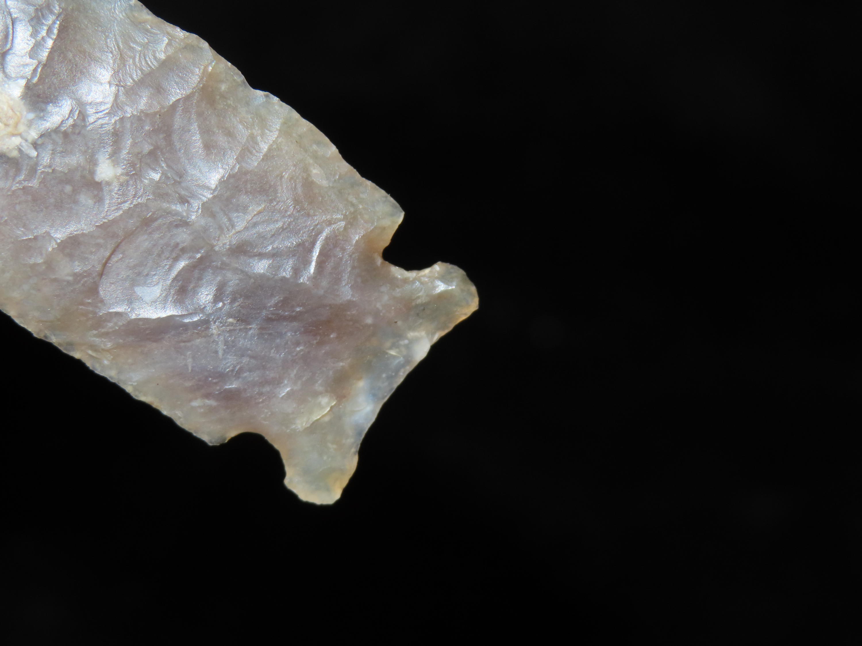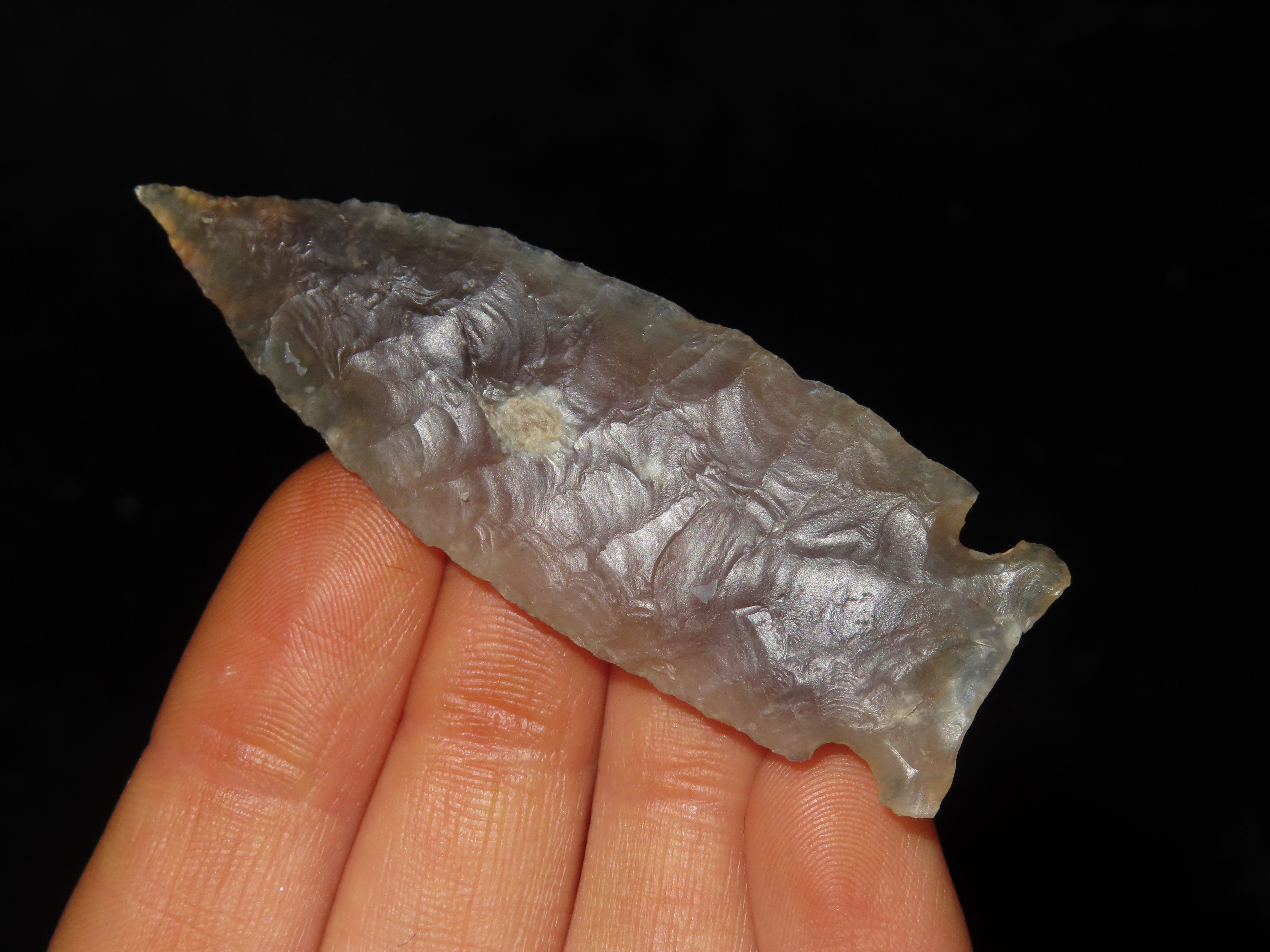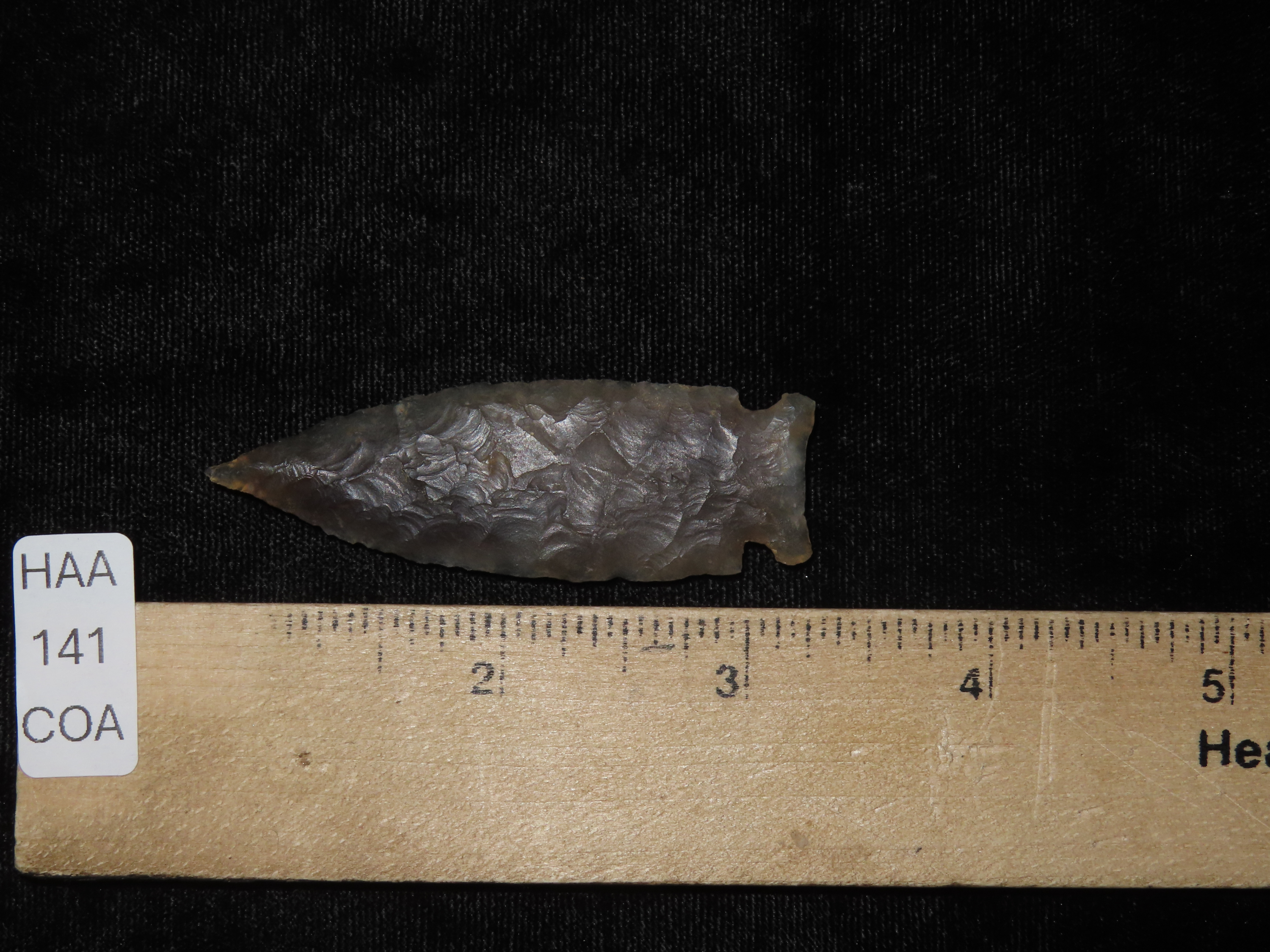 Phenomenal 2 9/16″ Knife River Lookingbill, Missoula Co. Montana. Motley COA. Highly Translucent and wafer thin with expert flaking. Extraordinary Example! Made from a well patinated piece of Knife River Flint.