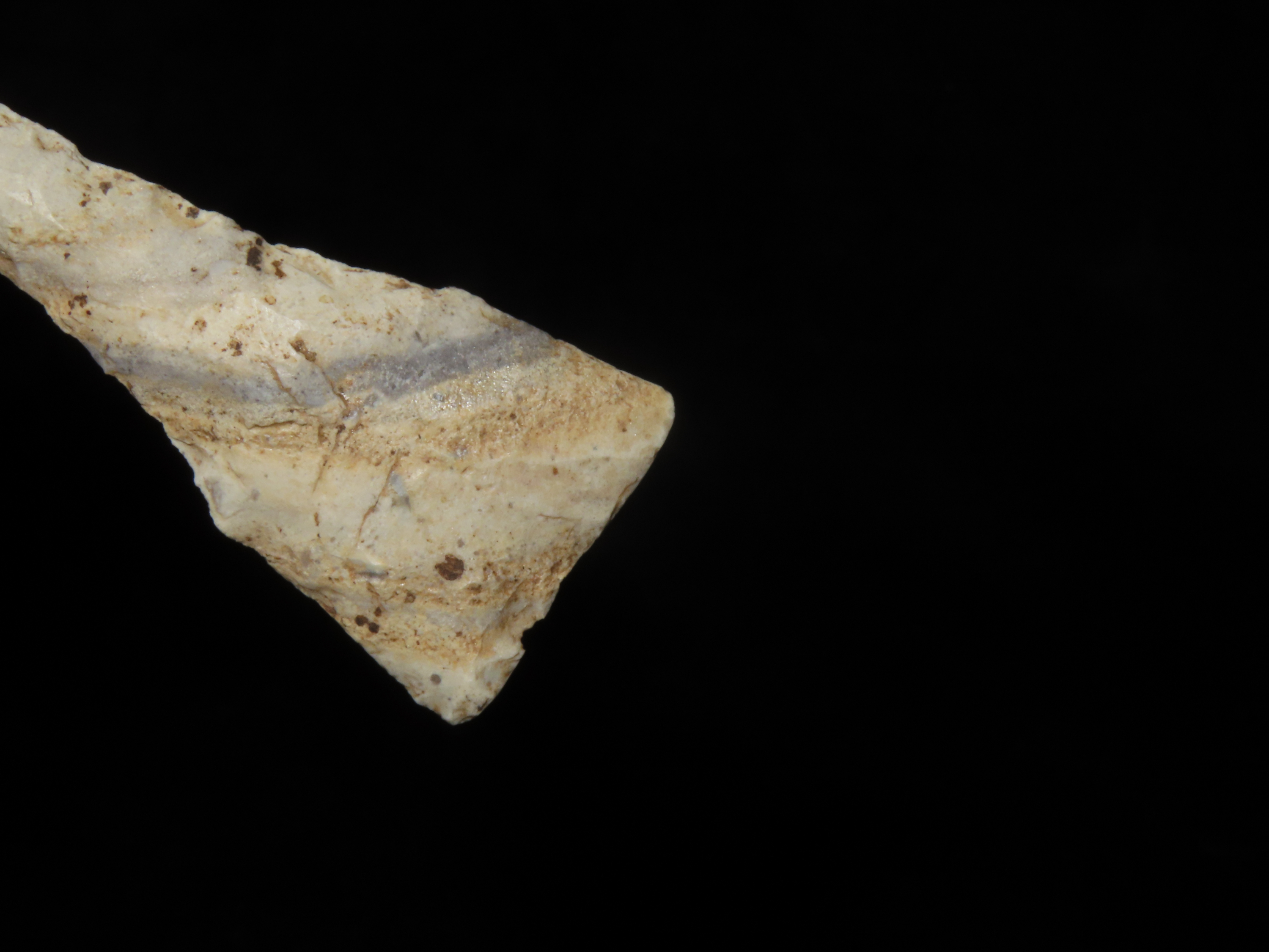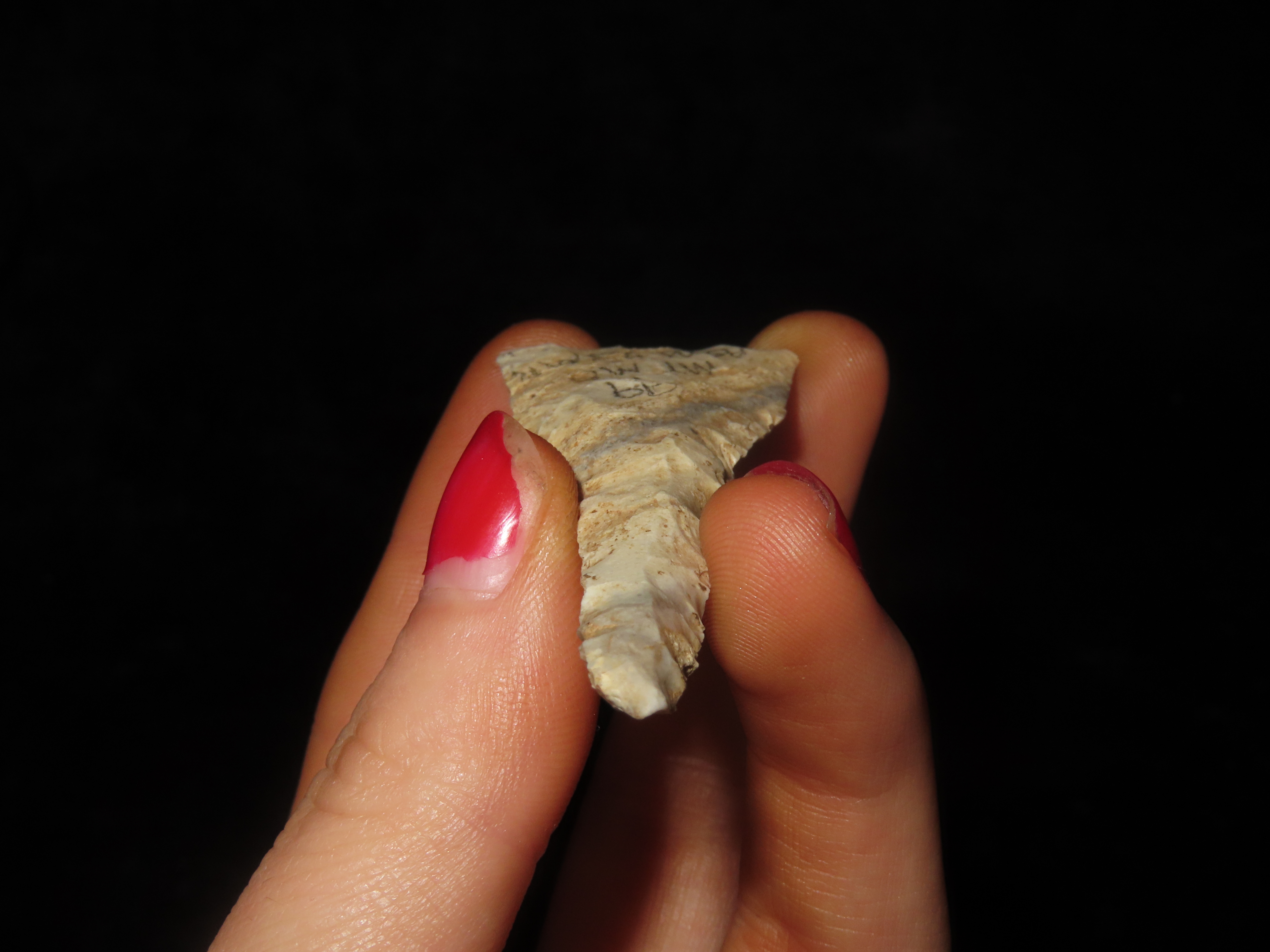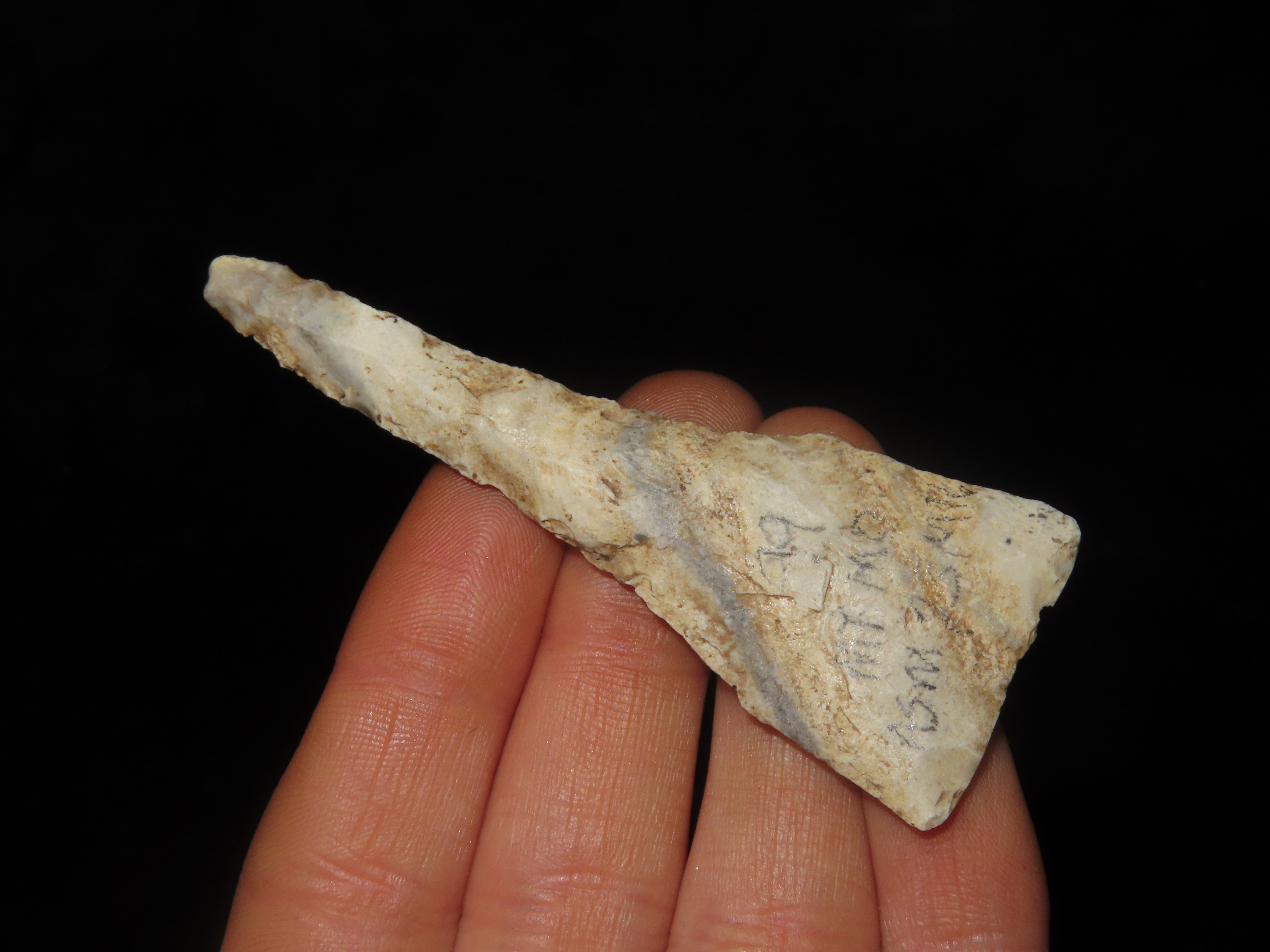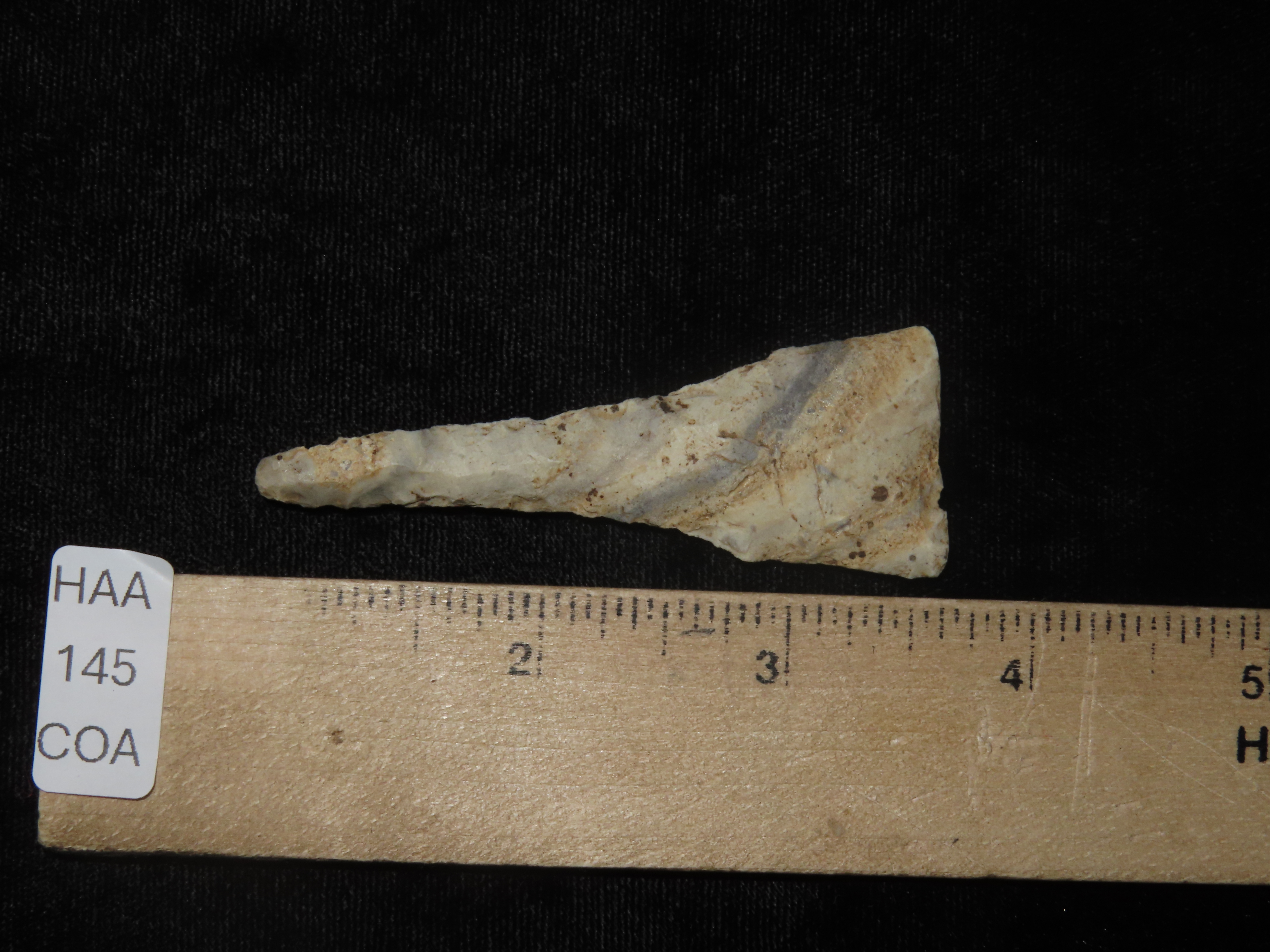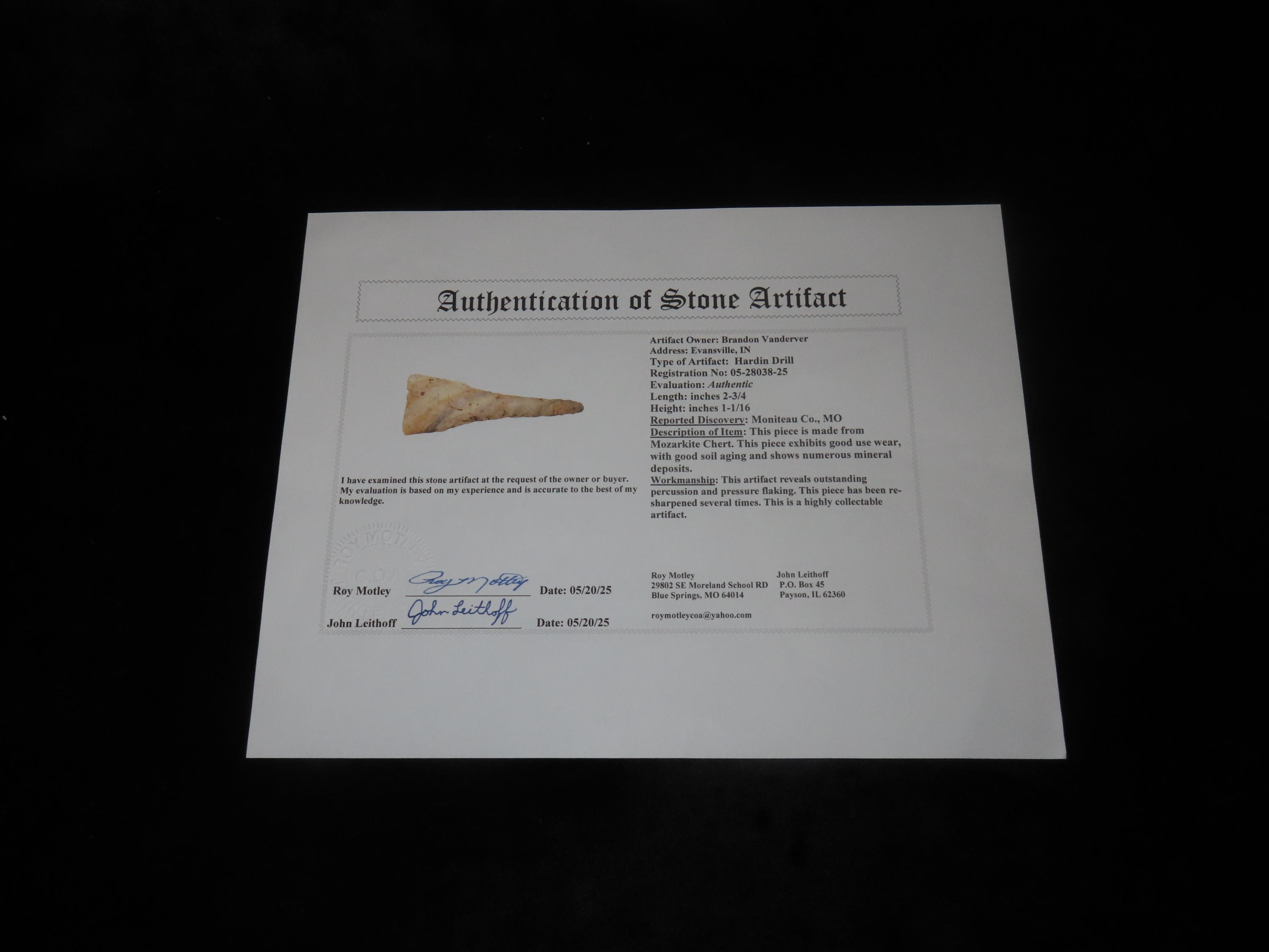 Colorful 2 3/4″ Hardin Drill, Moniteau Co. Missouri. Motley COA. Beautiful piece of heavily patinated Mozarkite Chert with excellent flaking! Covered in mineral Deposits. Great Color!