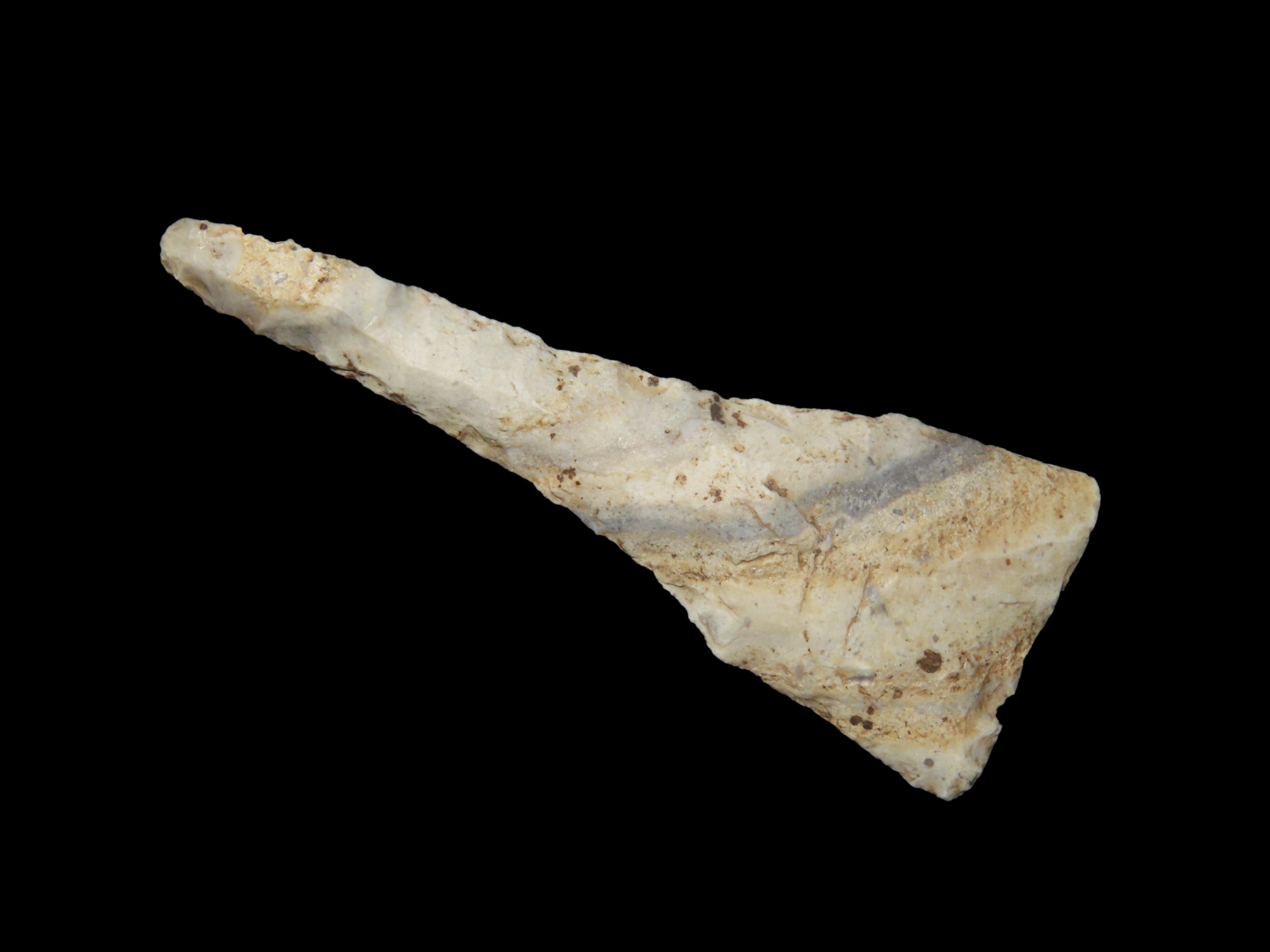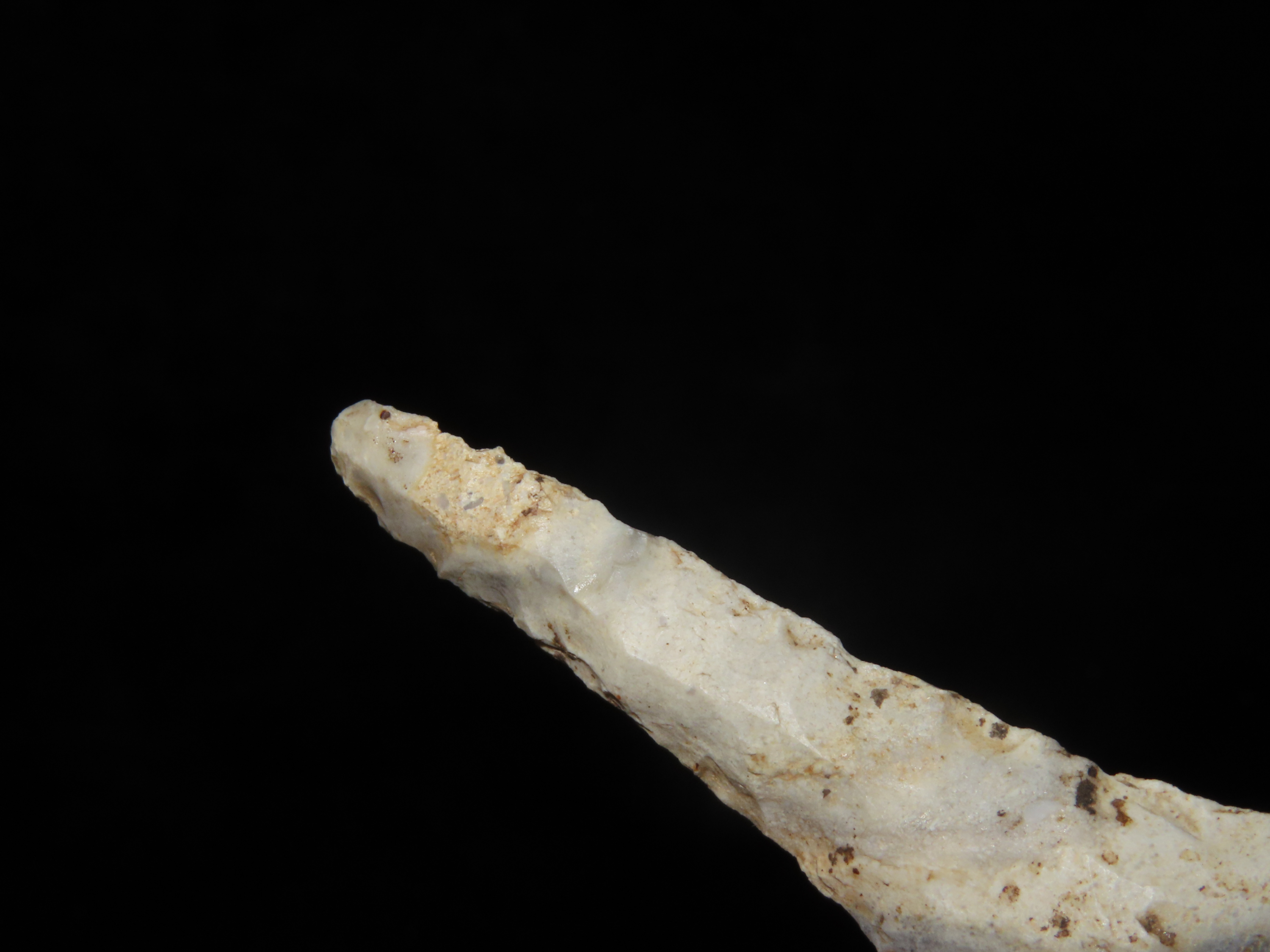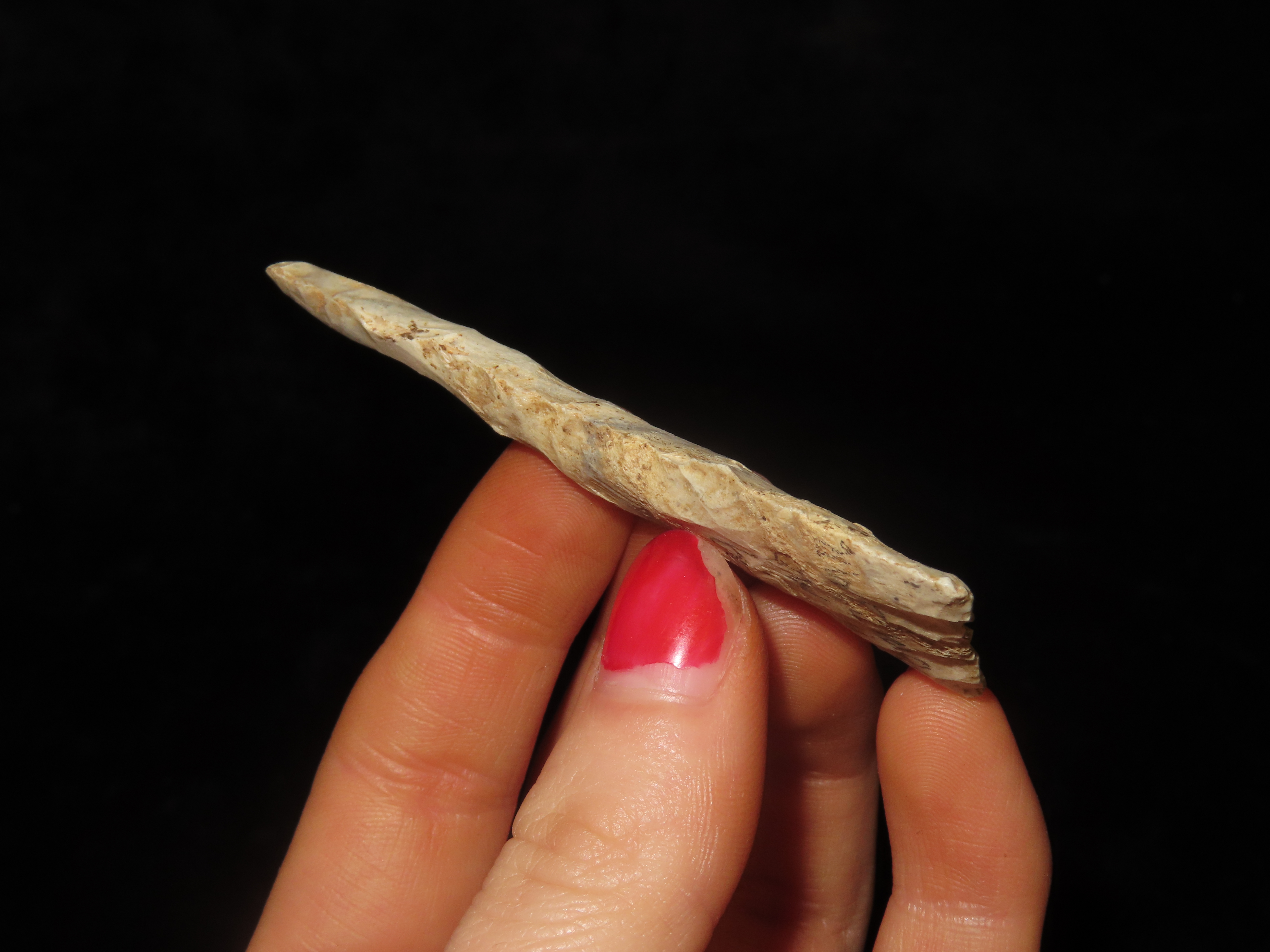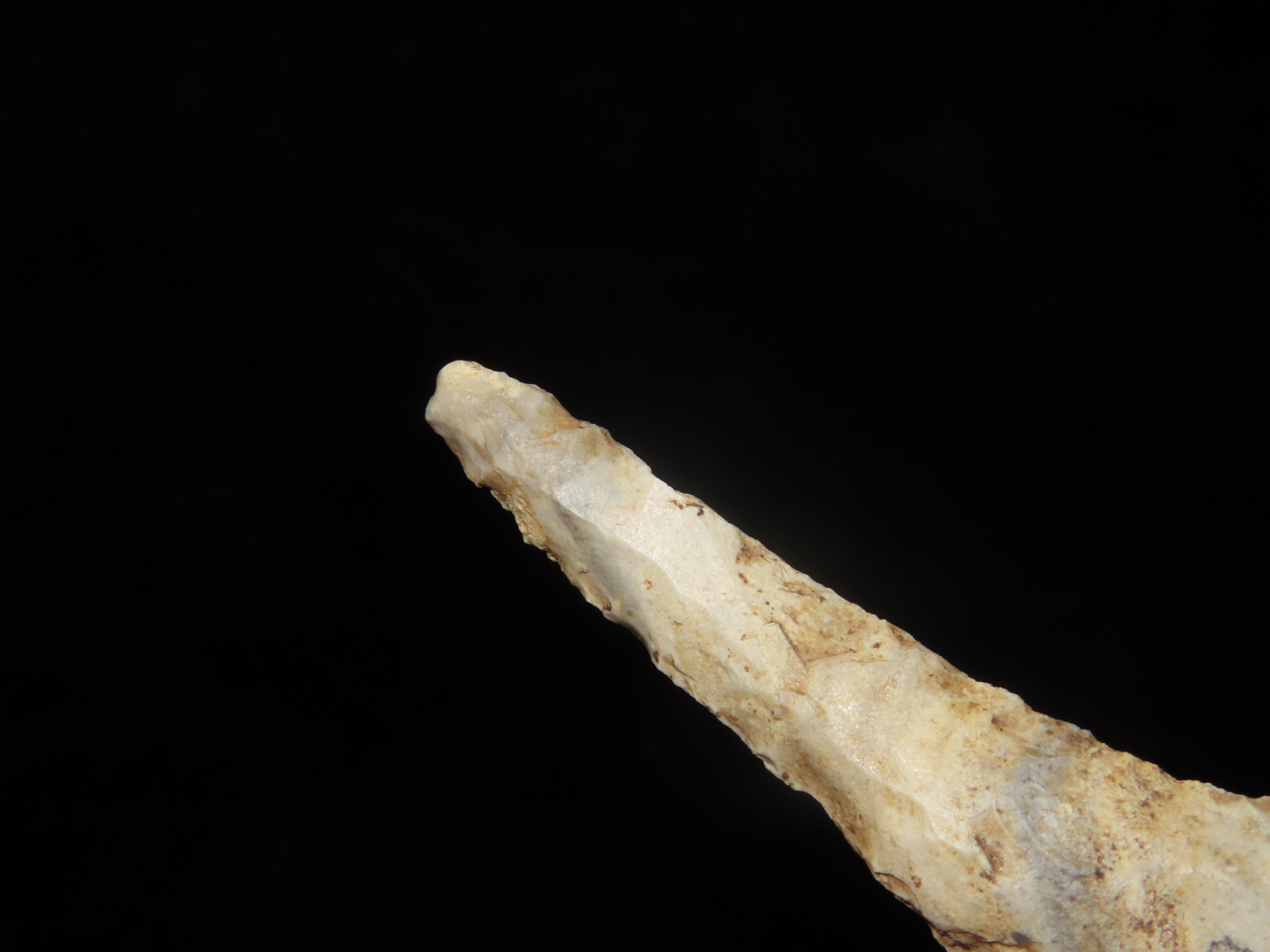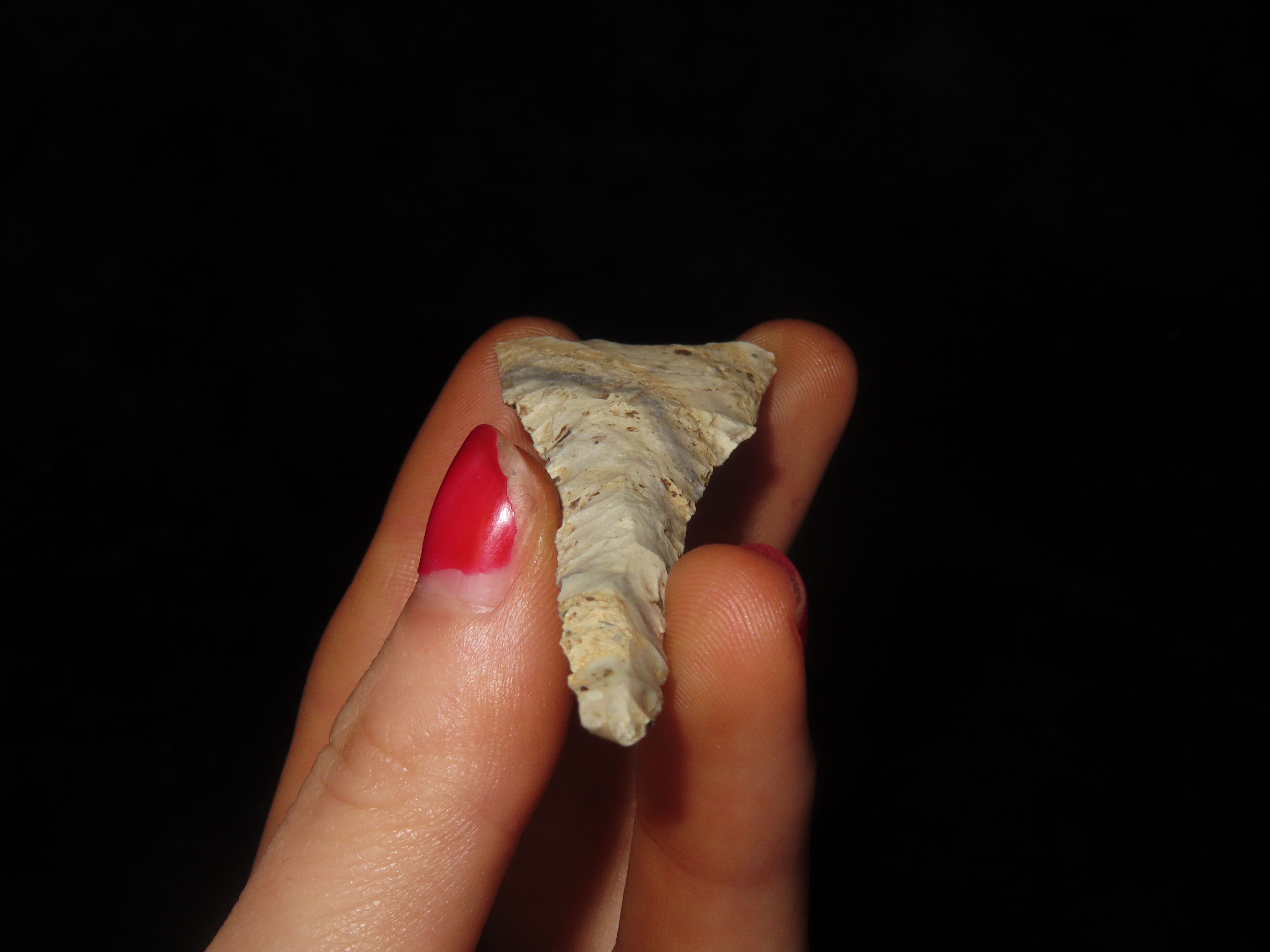 Colorful 2 3/4″ Hardin Drill, Moniteau Co. Missouri. Motley COA. Beautiful piece of heavily patinated Mozarkite Chert with excellent flaking! Covered in mineral Deposits. Great Color!