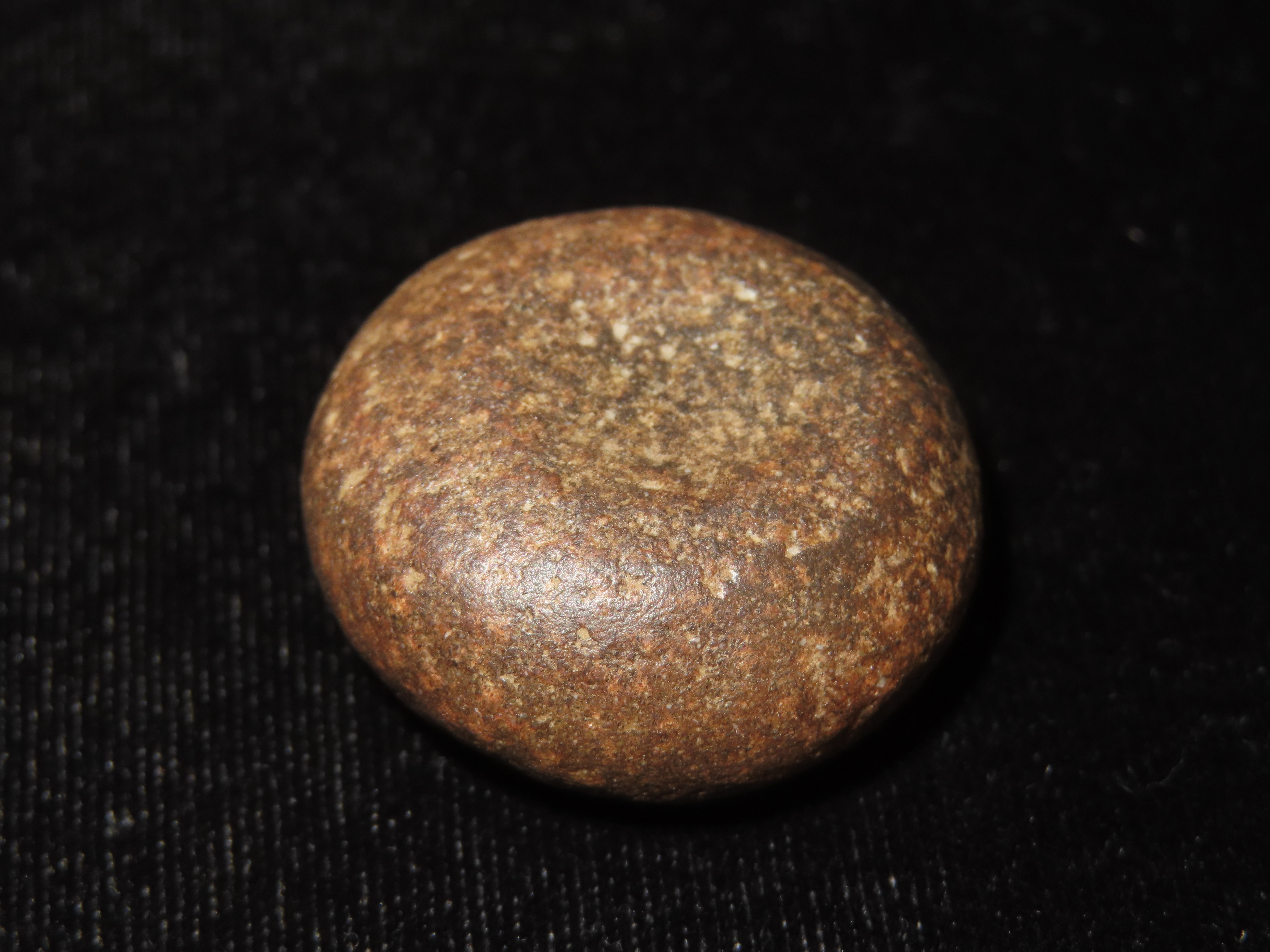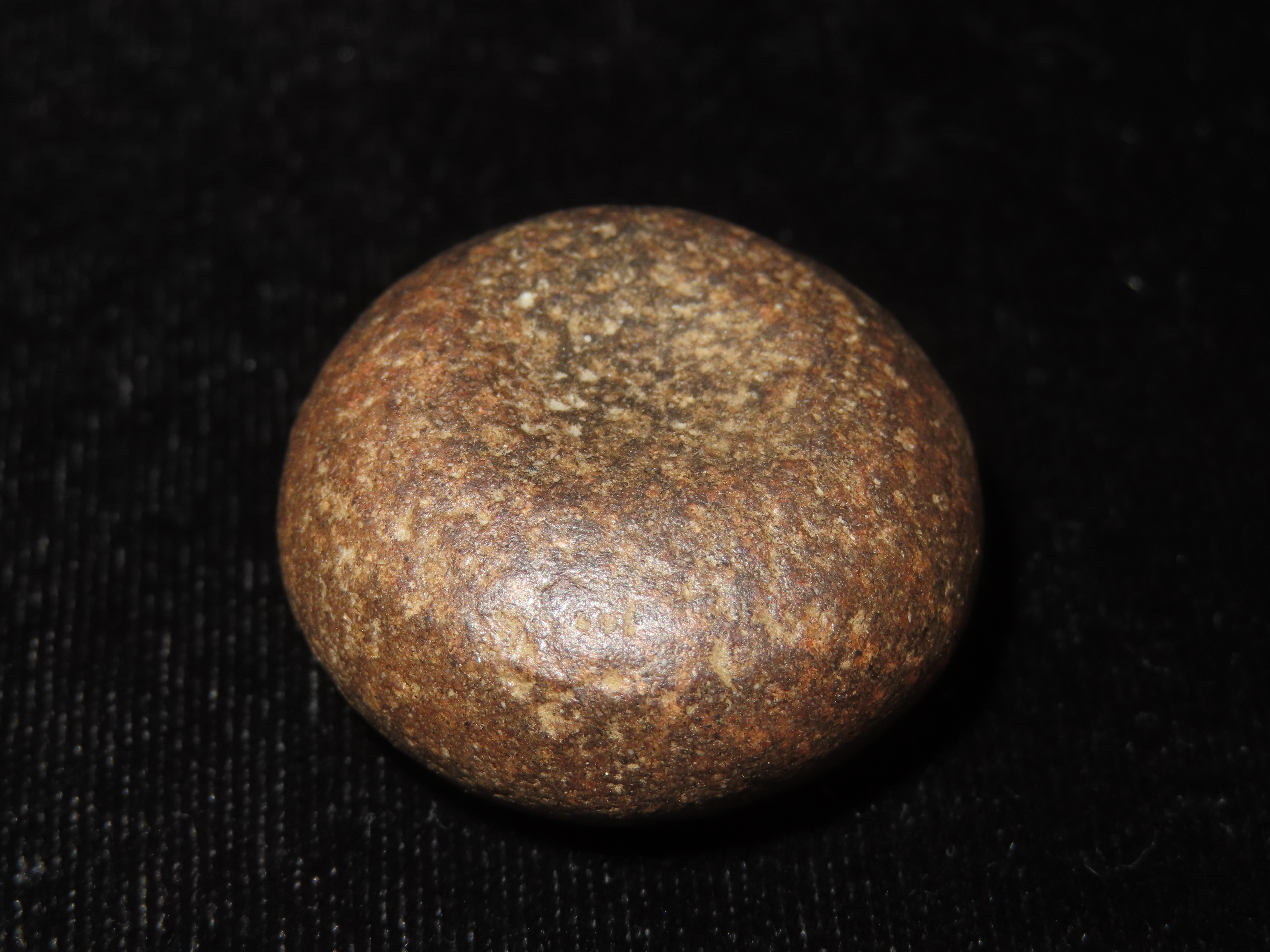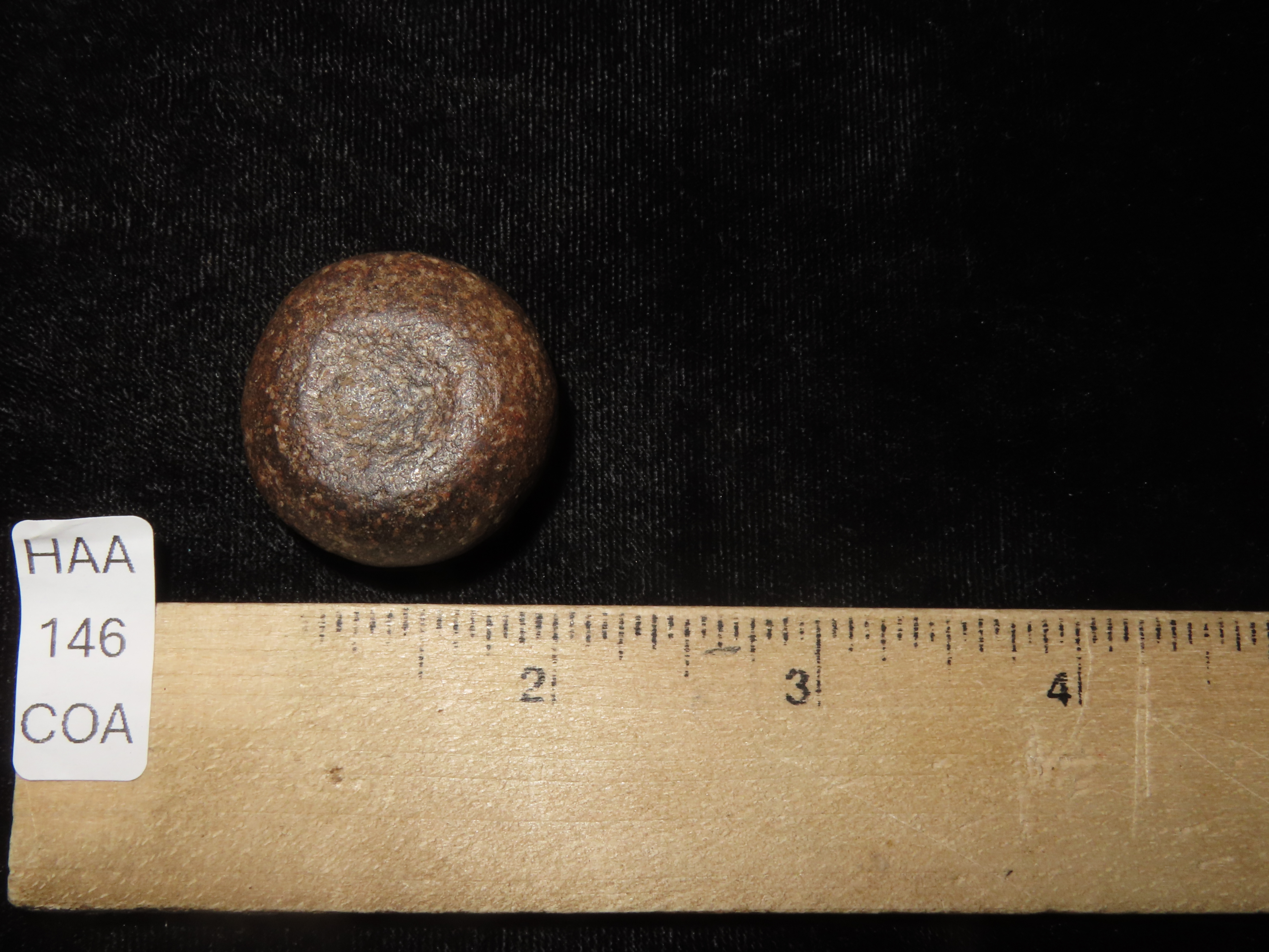 Rare 1 3/16″ Mini Jersey Bluff Discoidal, St. Clair Co. Illinois. Motley COA. This is the smallest Jersey Bluff Discoidal we have ever seen. Nicely Cupped on both sides and well polished out of a beautiful well patinated piece of reddish brown quartzite.