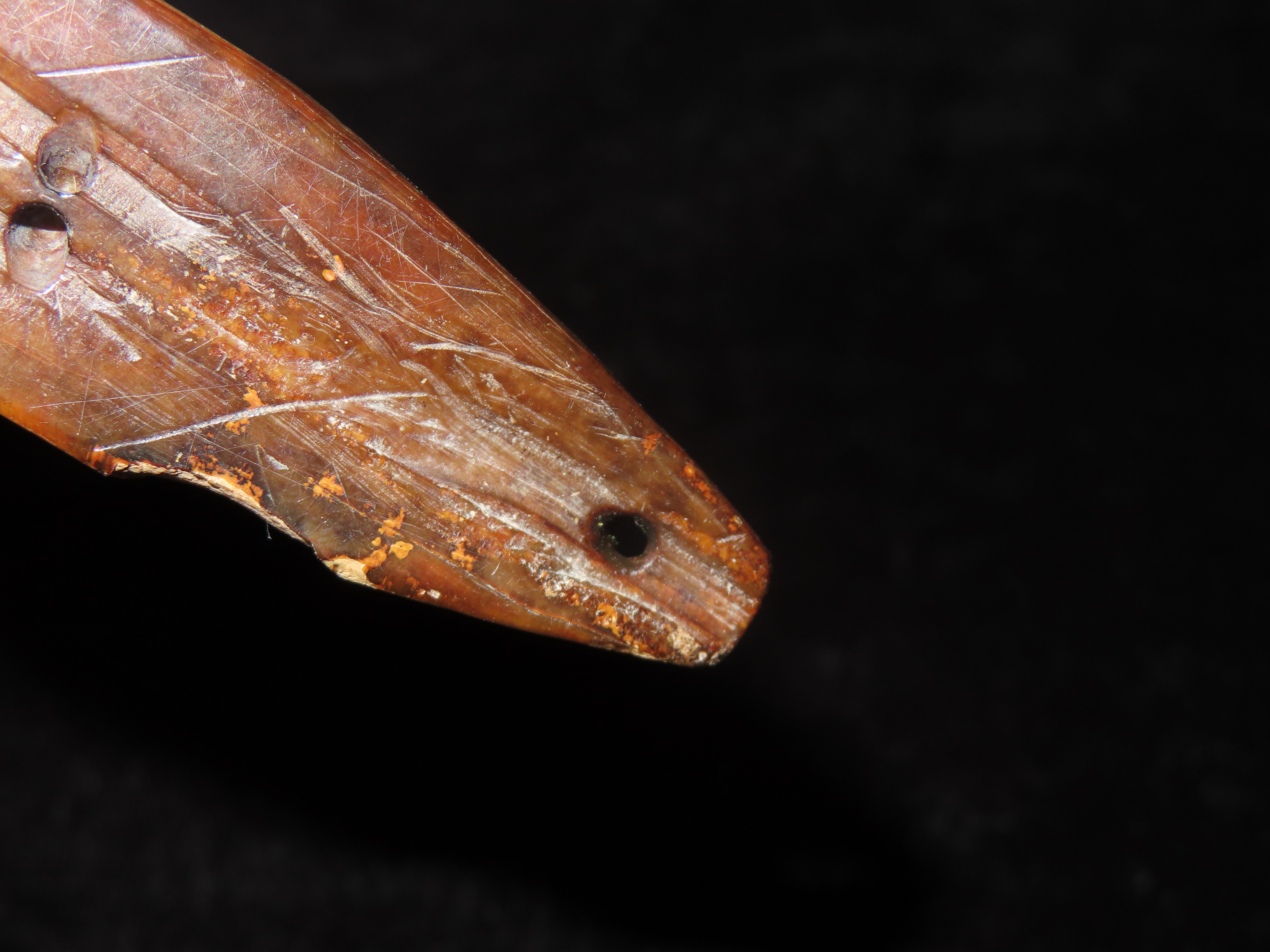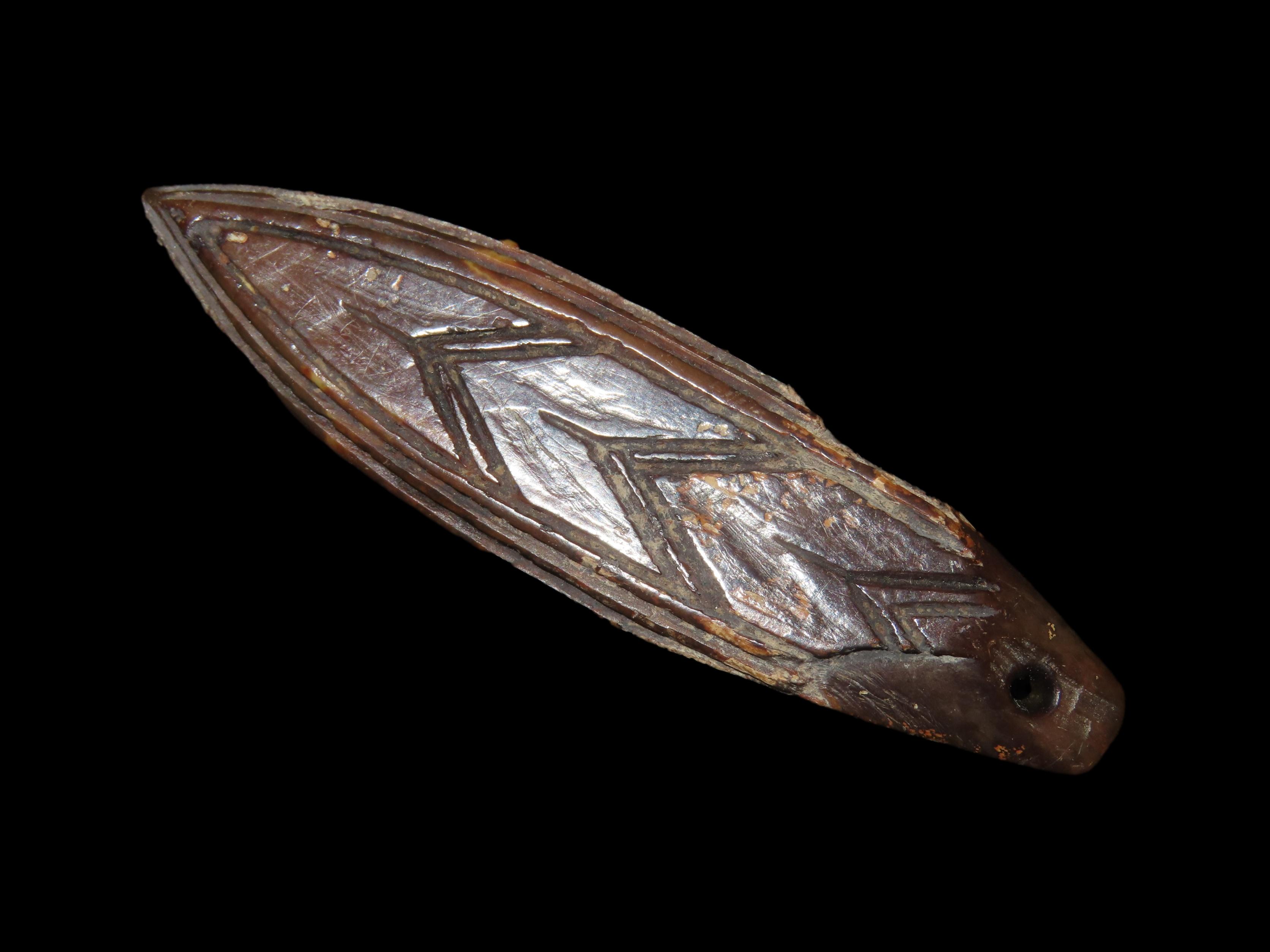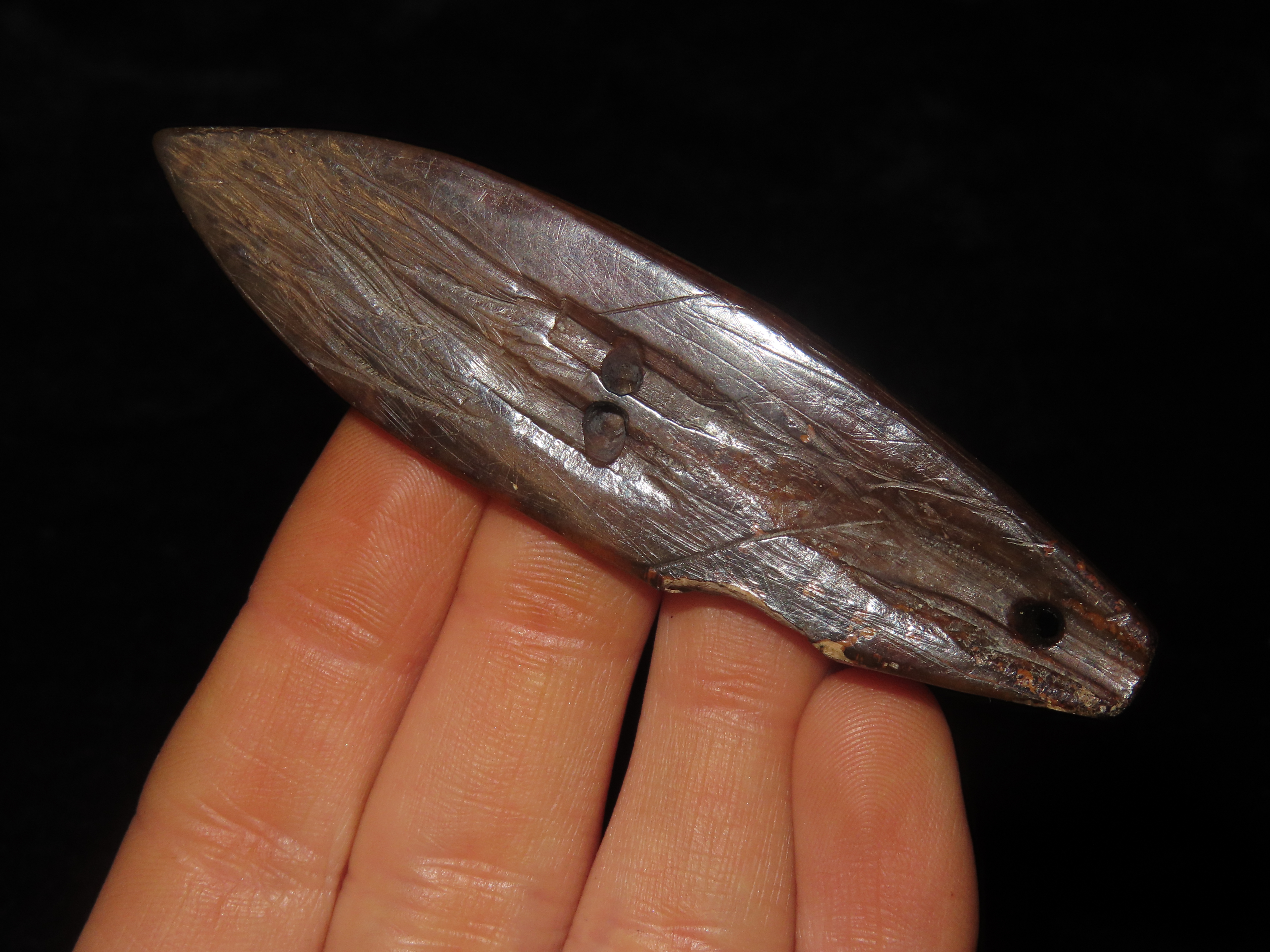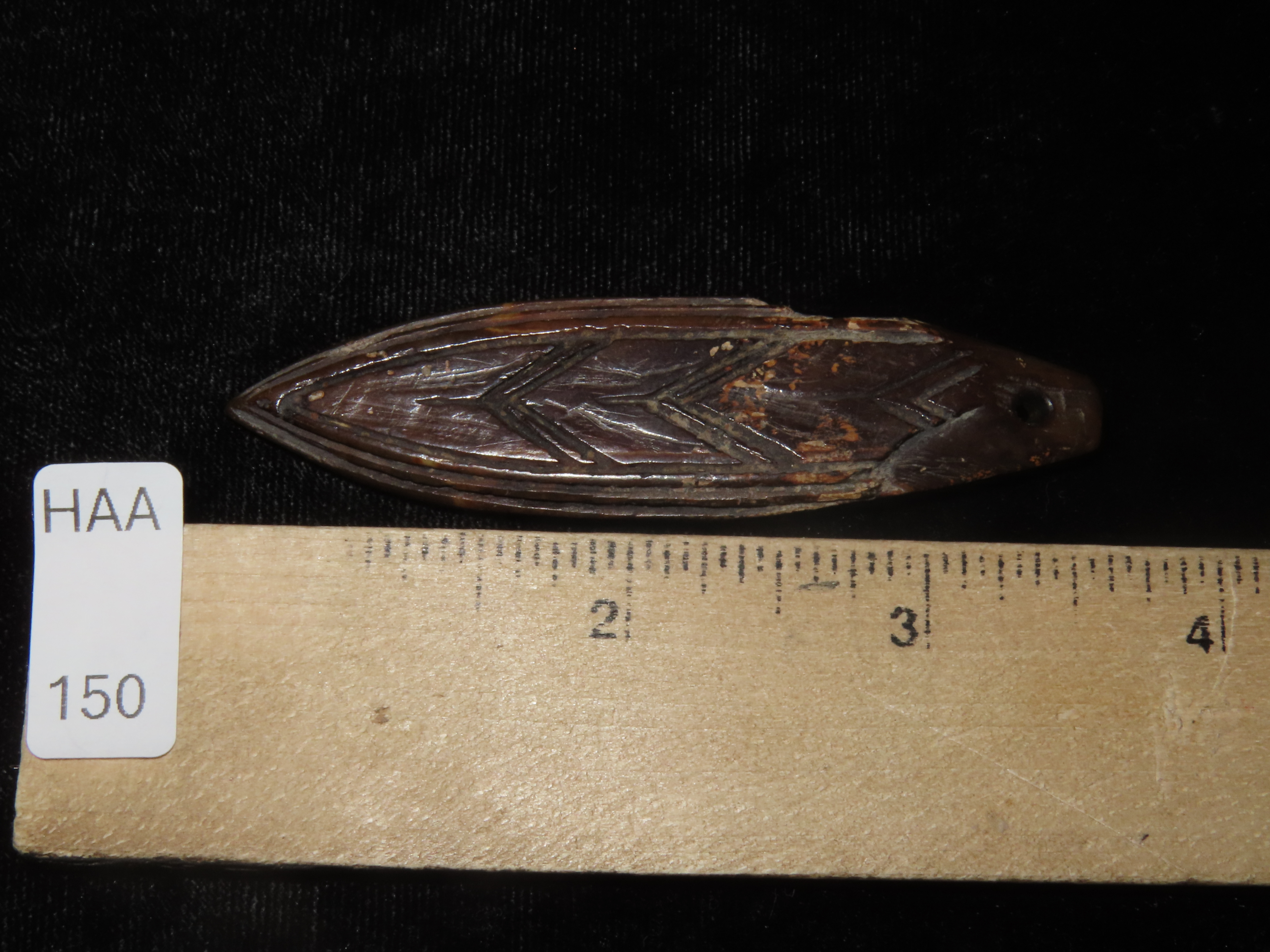 3 1/16″ Heavily Engraved Alaskan Eskimo Pendant, Fossilized Bone. Highly Polished and heavily patinated. Found on St. Lawrence Island, Alaska. Great old example!