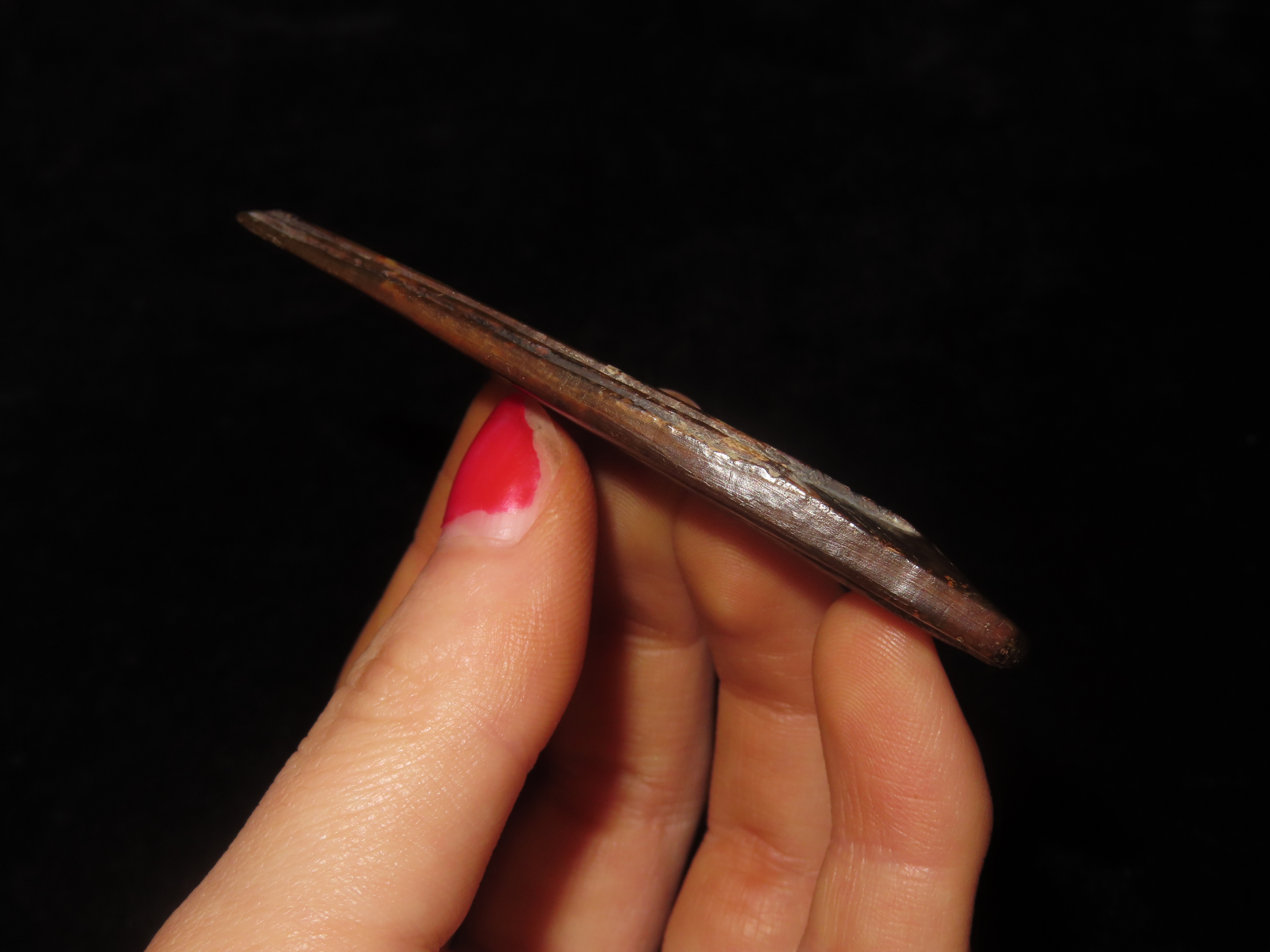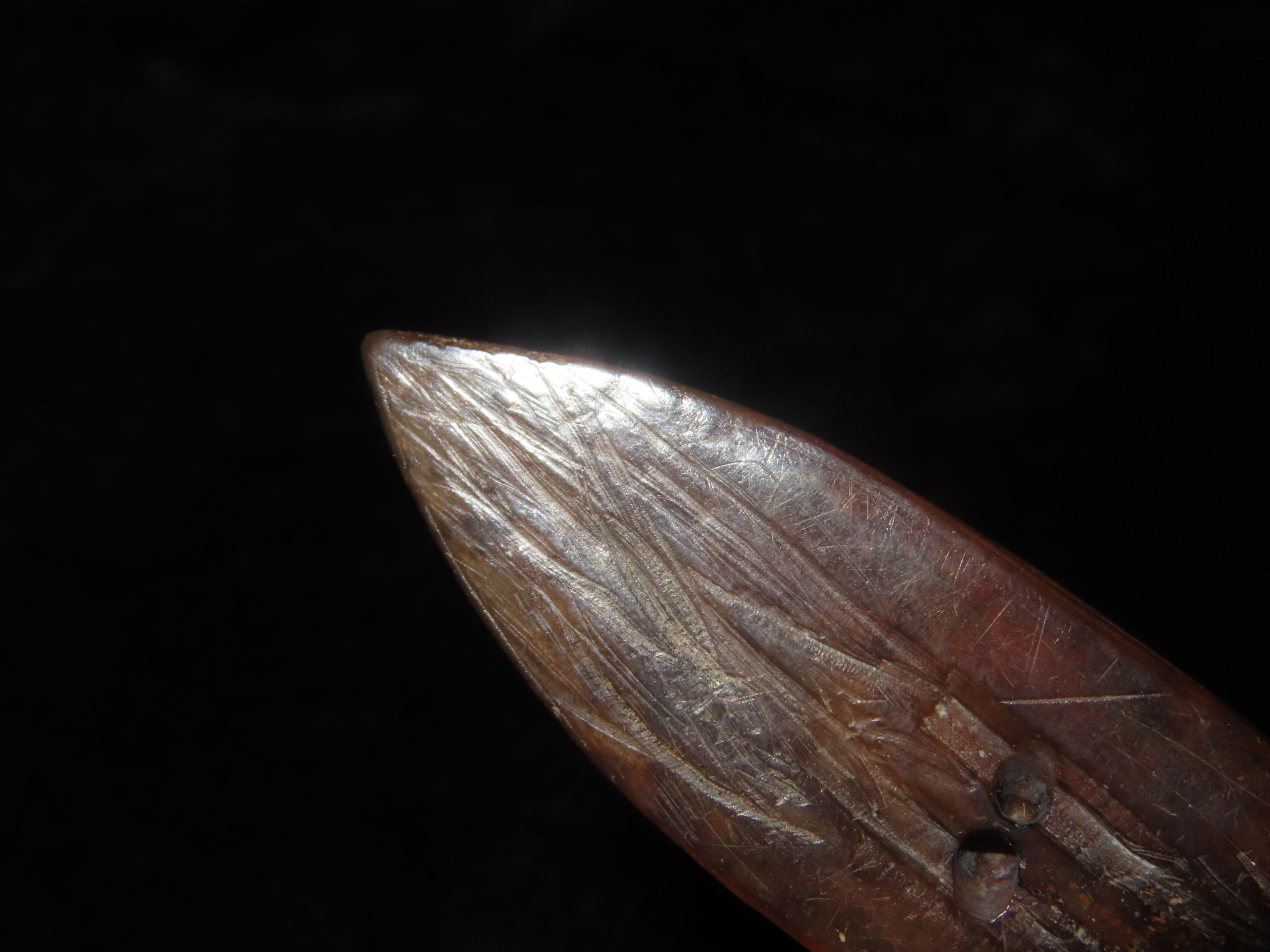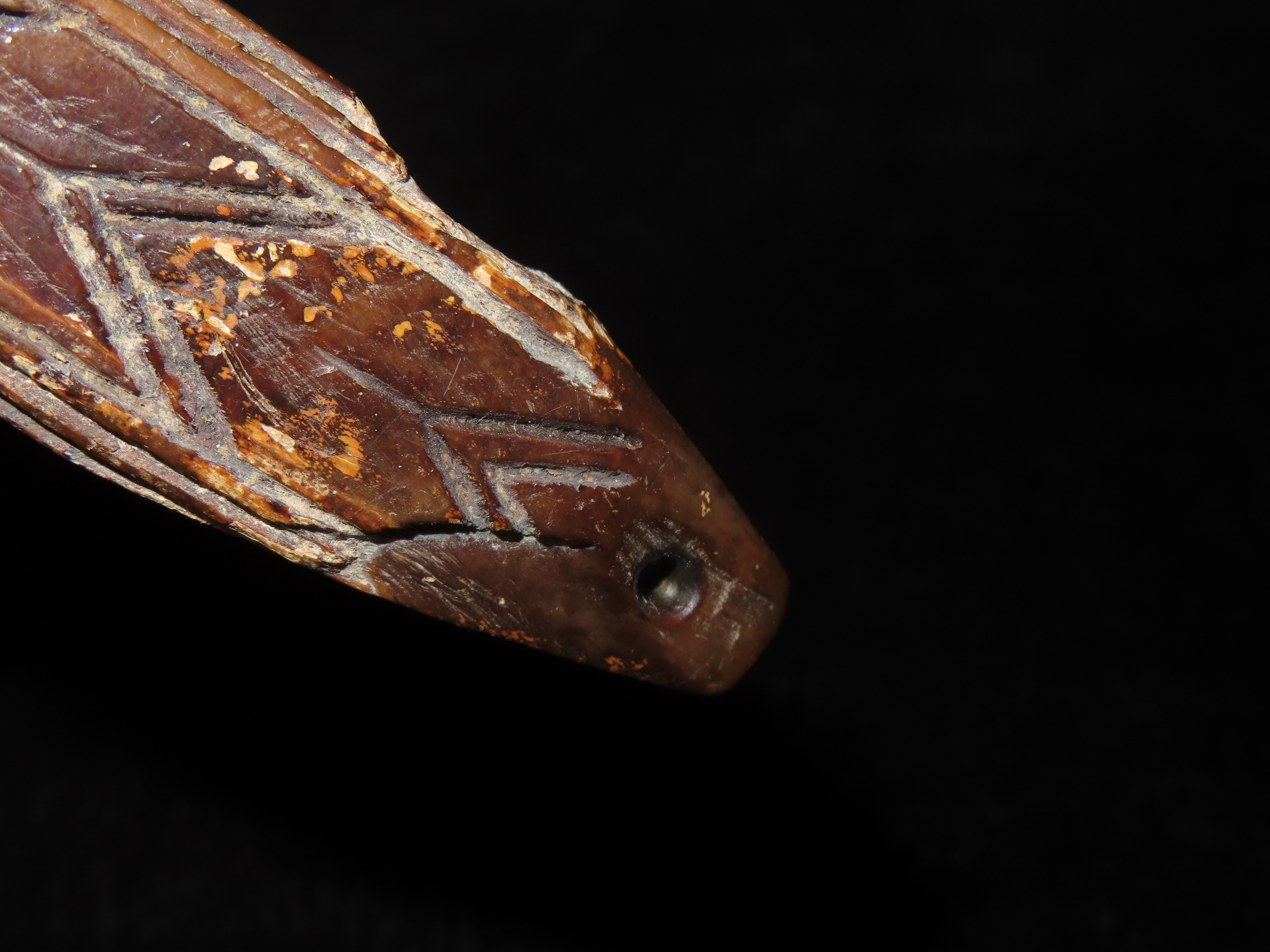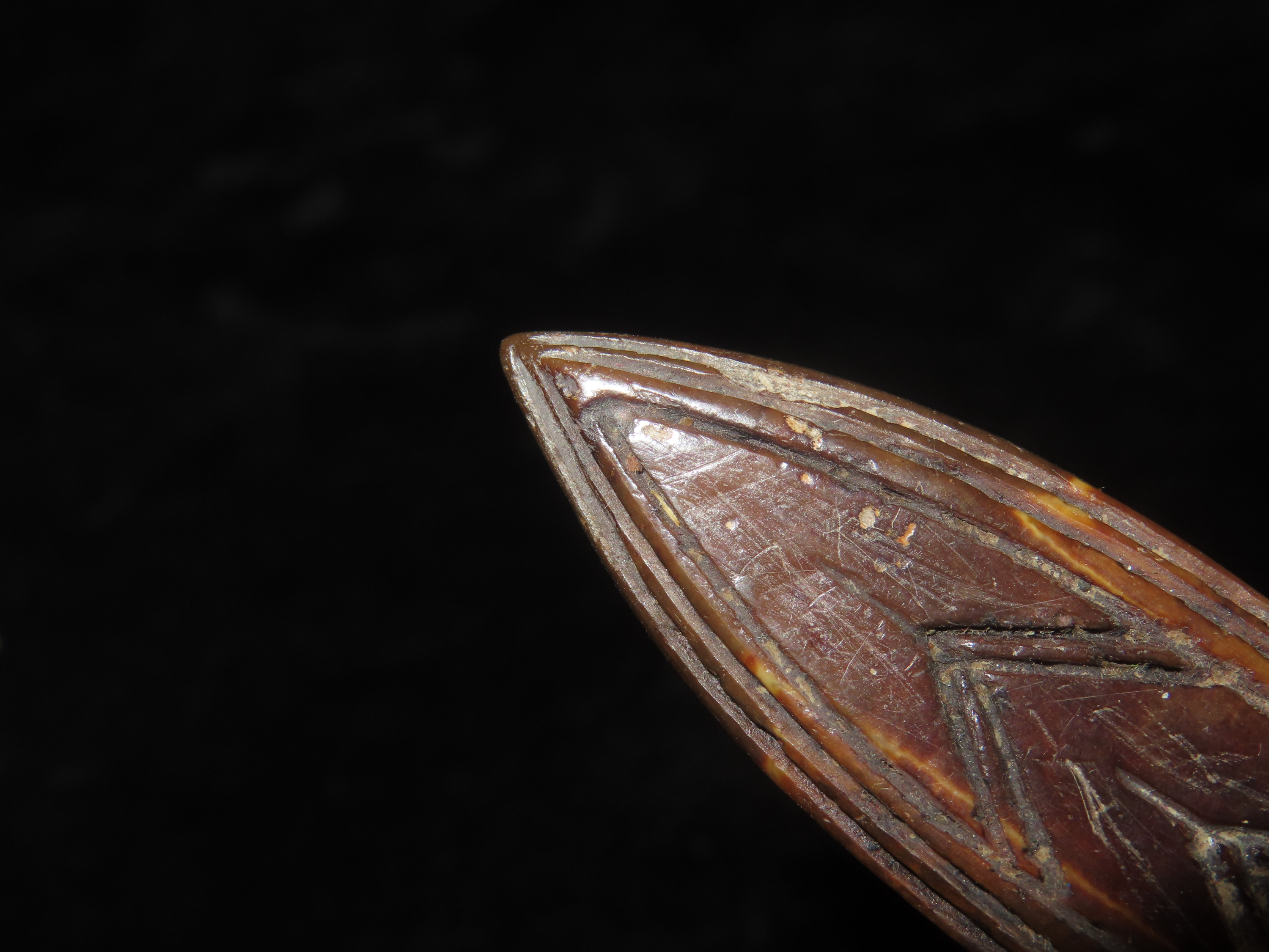 3 1/16″ Heavily Engraved Alaskan Eskimo Pendant, Fossilized Bone. Highly Polished and heavily patinated. Found on St. Lawrence Island, Alaska. Great old example!