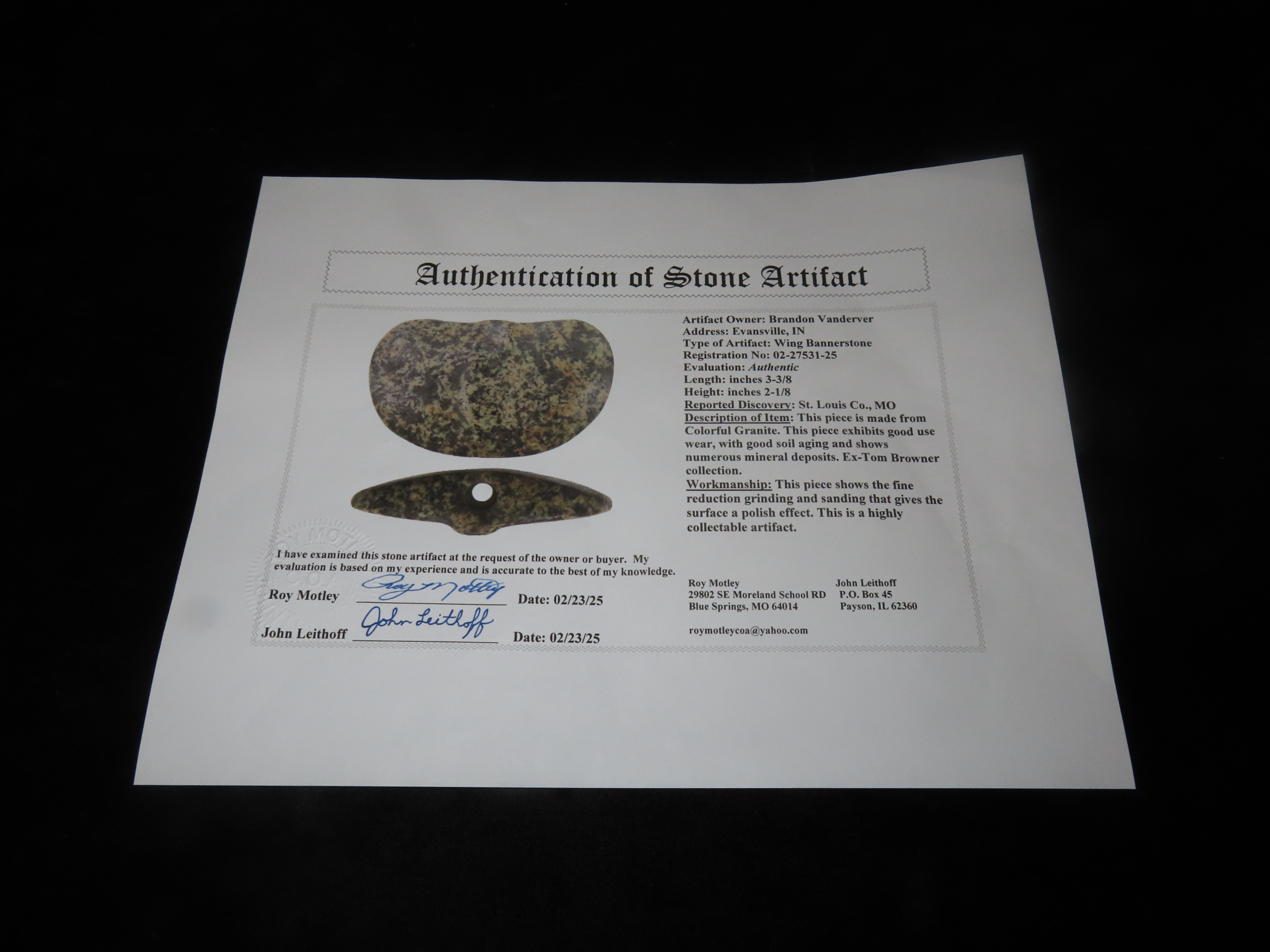 Incredible 3 3/8″ Wing Bannerstone, St. Louis Co. Missouri. Motley COA. Amazing Color and outstanding polish. Colorful piece of well patinated Granite. Ex Tom Browner Collection (#C-2) Nice collector grade example!