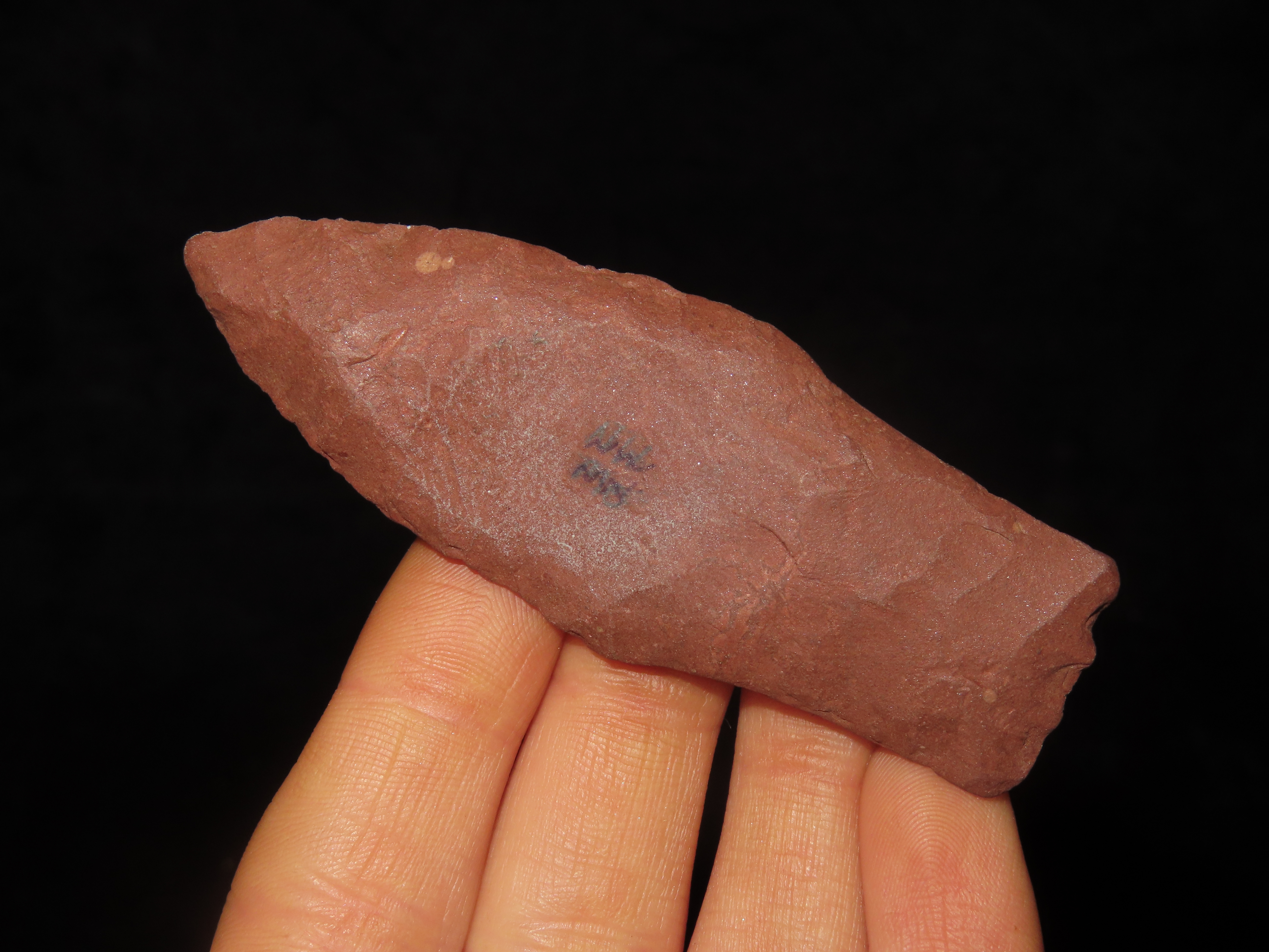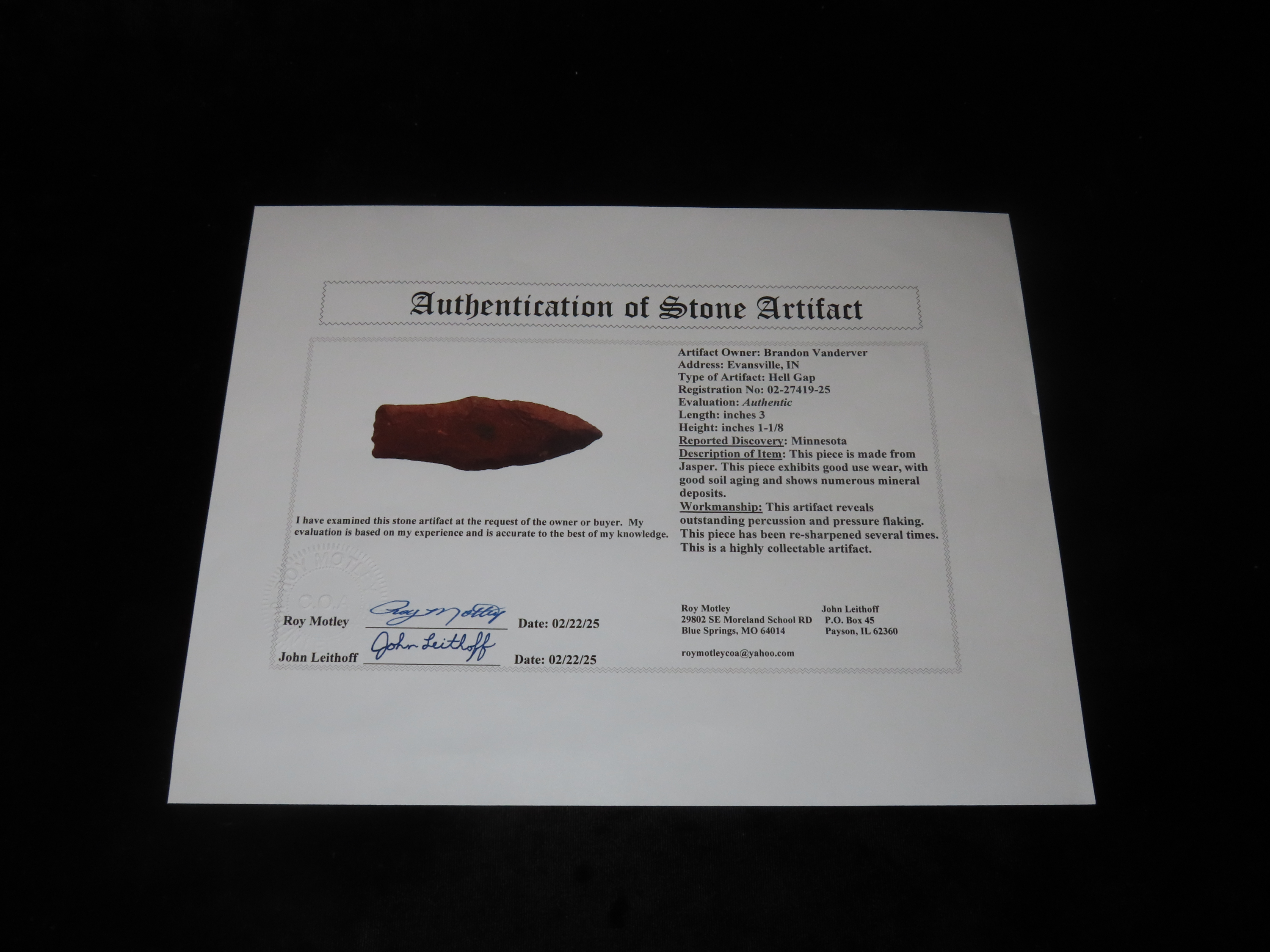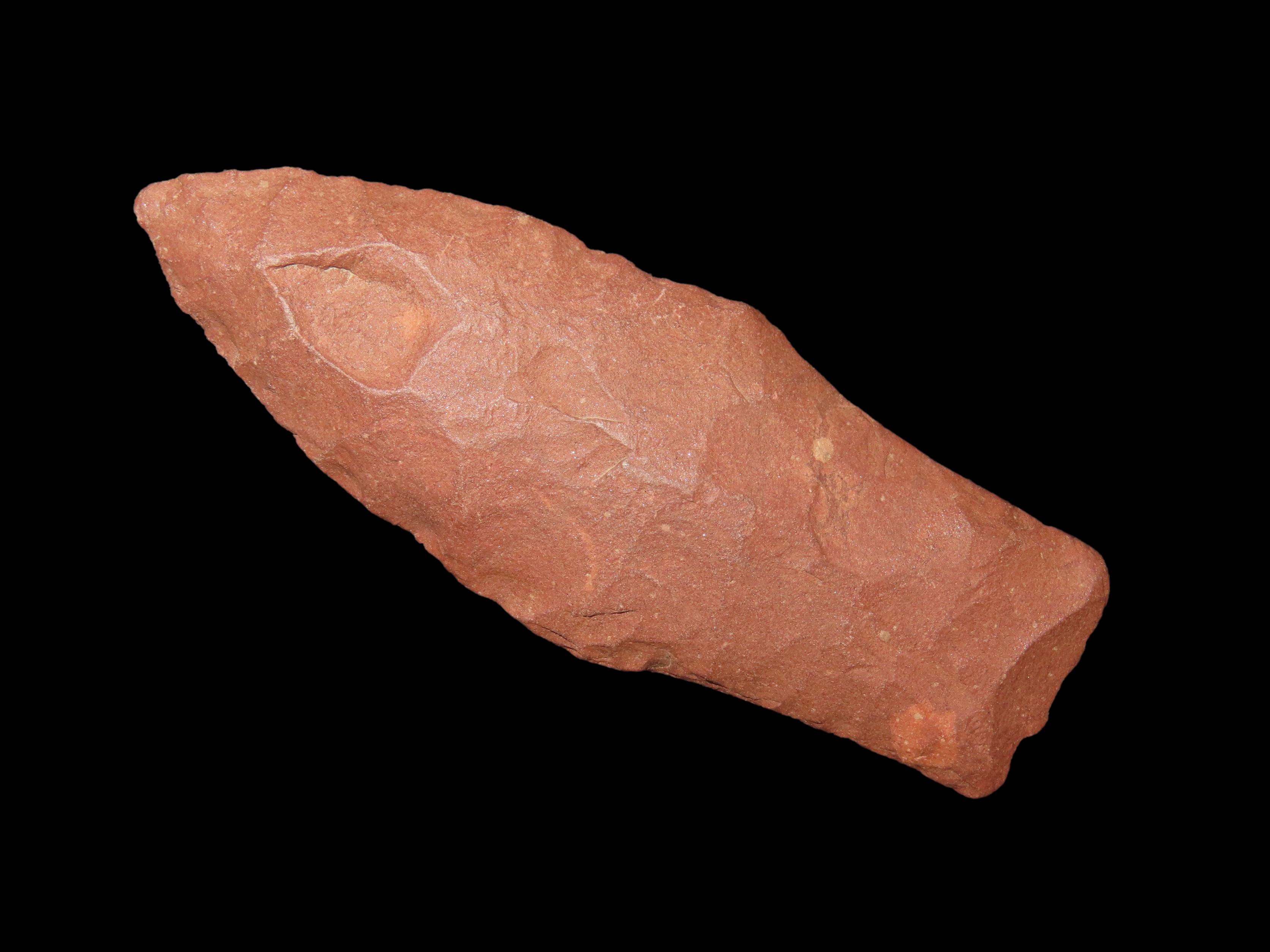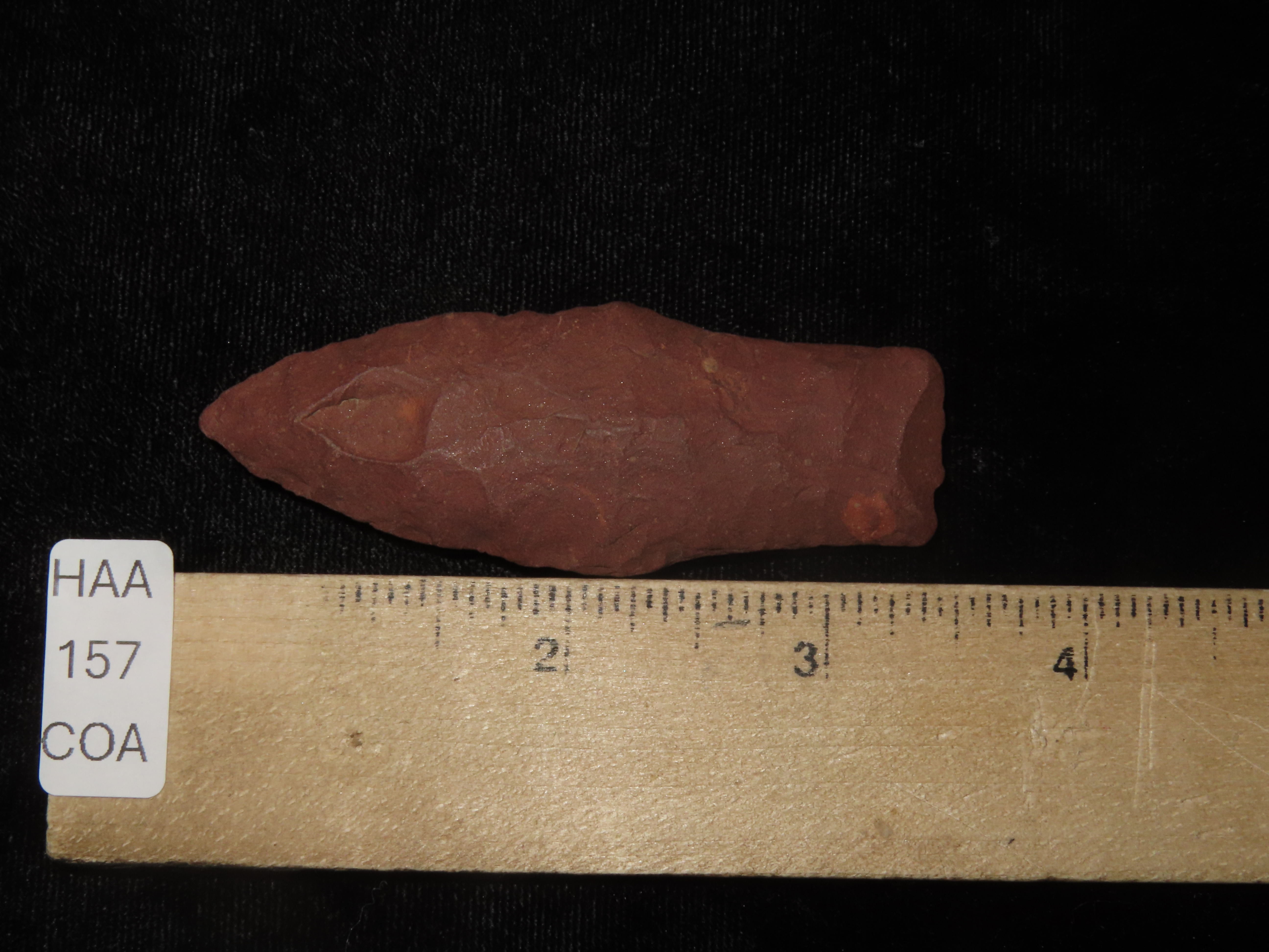 3″ long Hell Gap, Minnesota. Motley COA. Nice large example for the type, made from a beautiful brick red jasper. Nicely Flaked and well patinated.