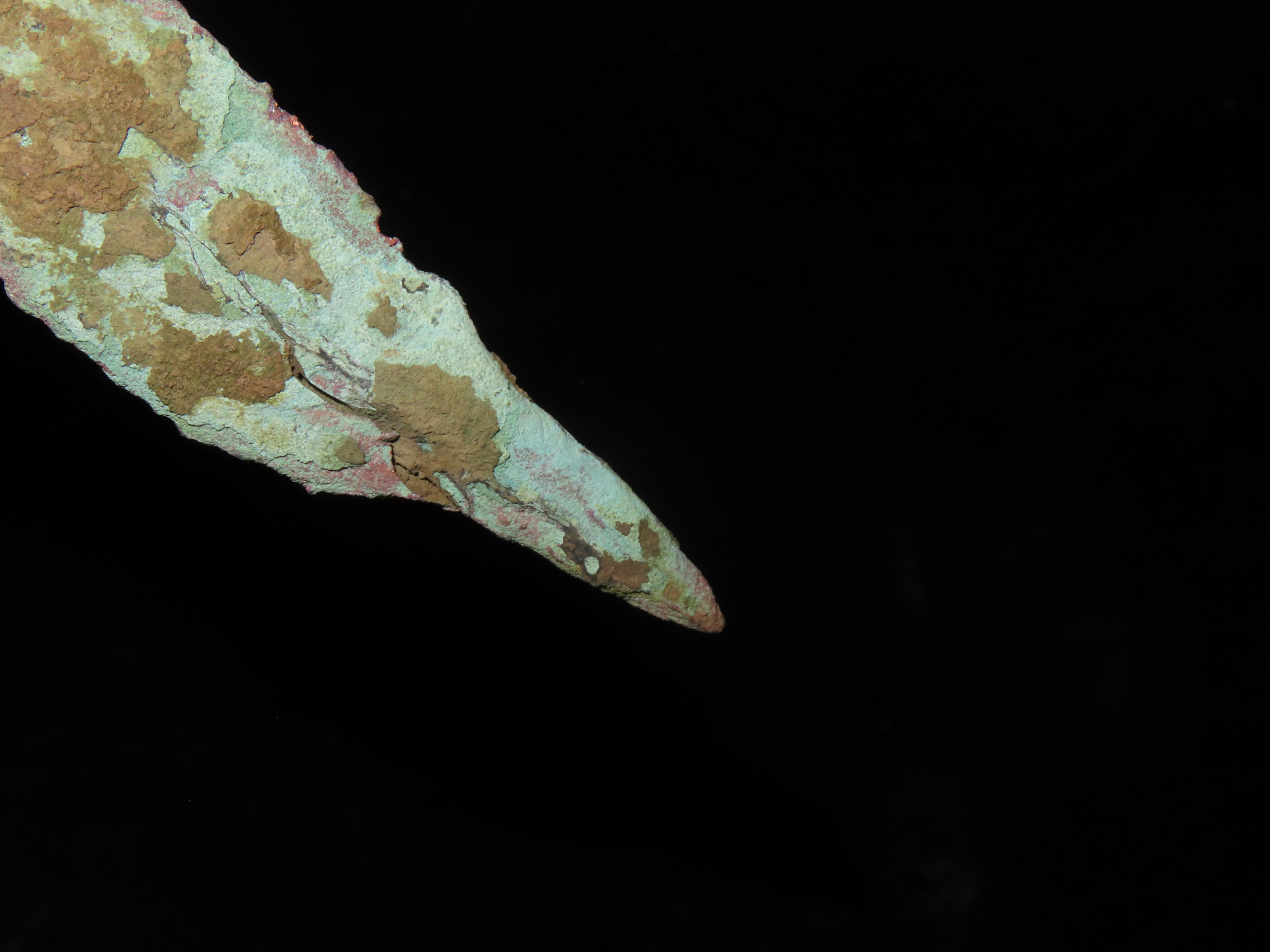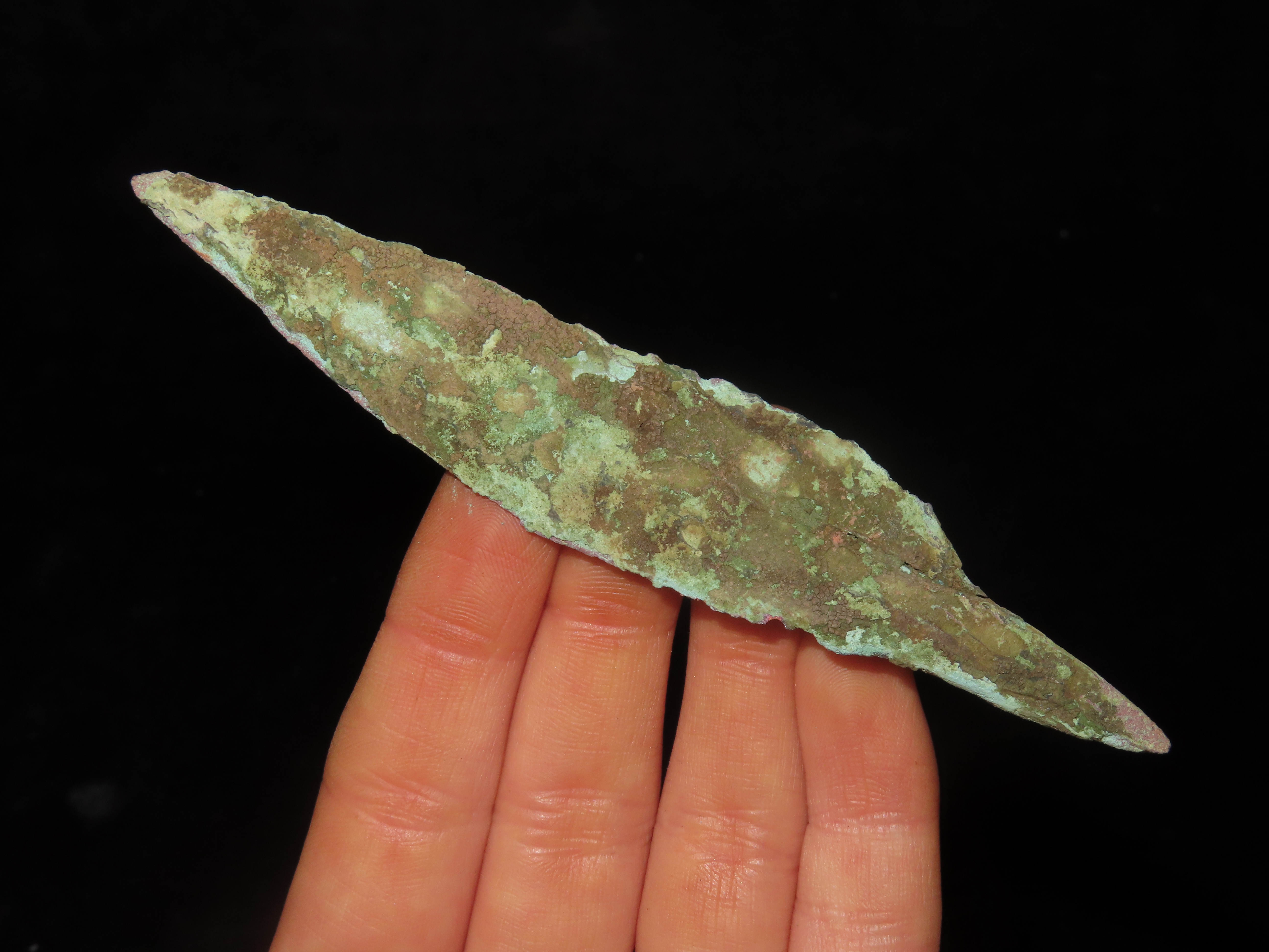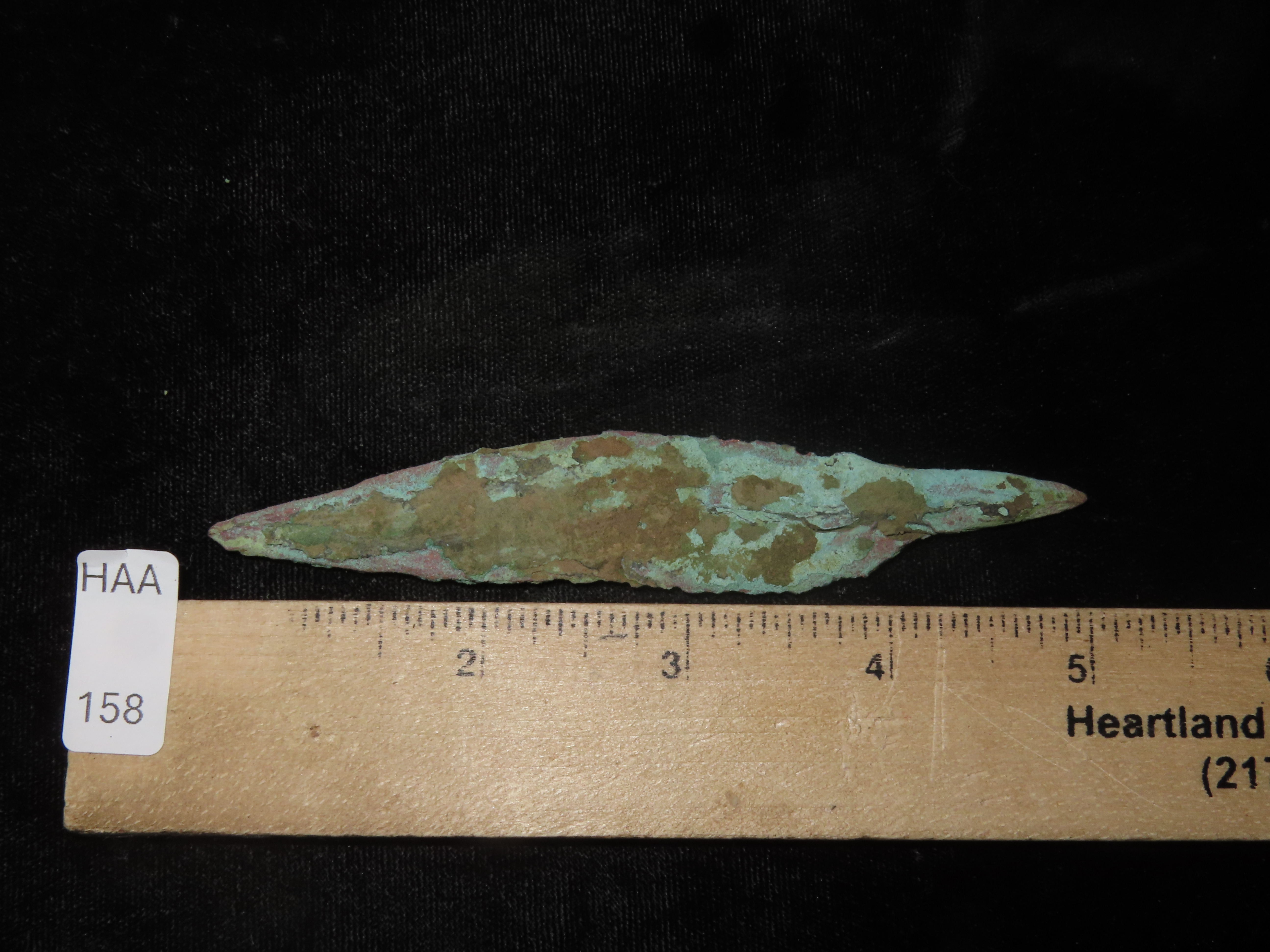 Nice 4 1/2″ OCC Copper Tang Knife / Spear, Wisconsin. Nice large example with Heavy no brainer patina.