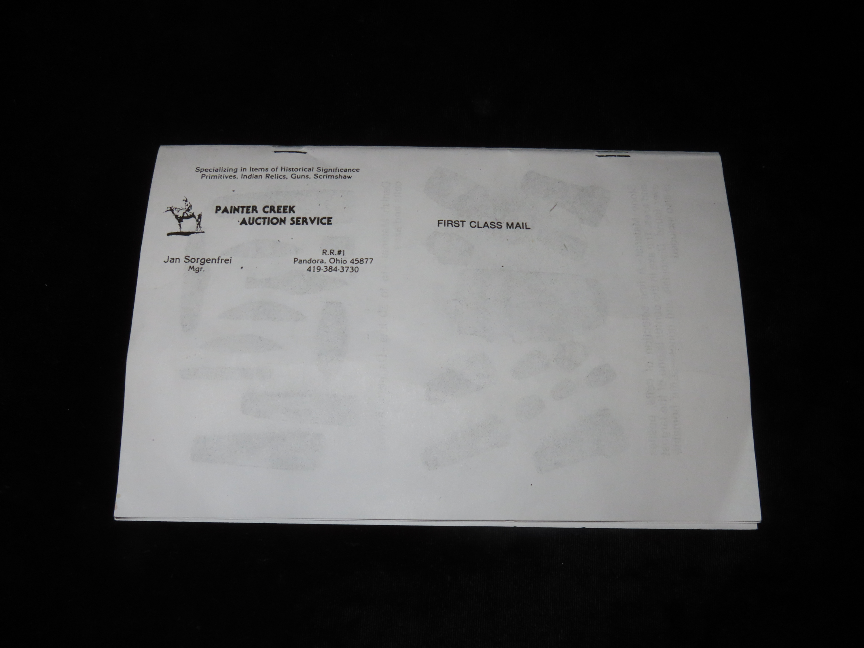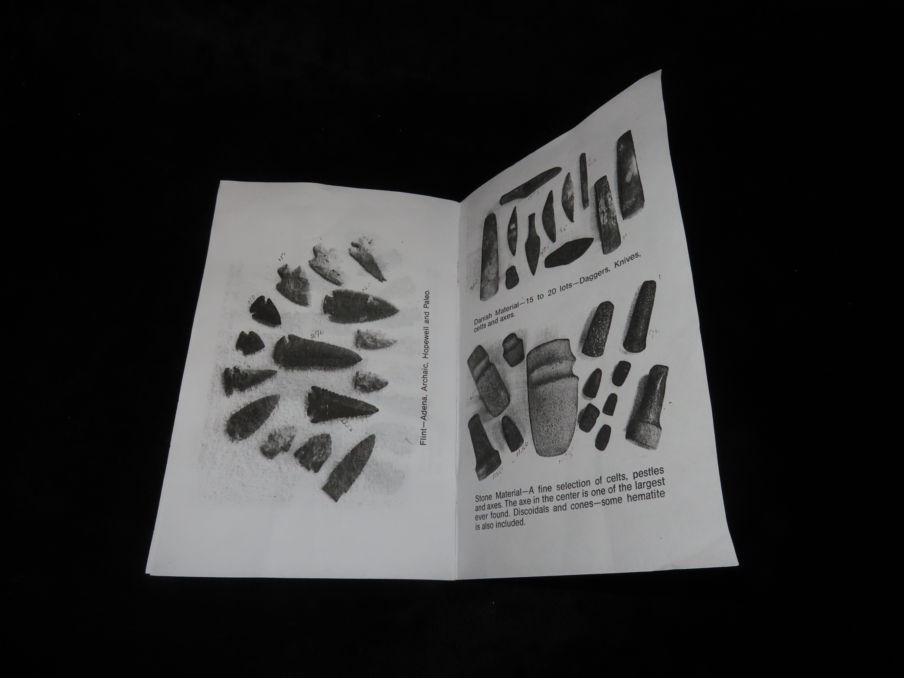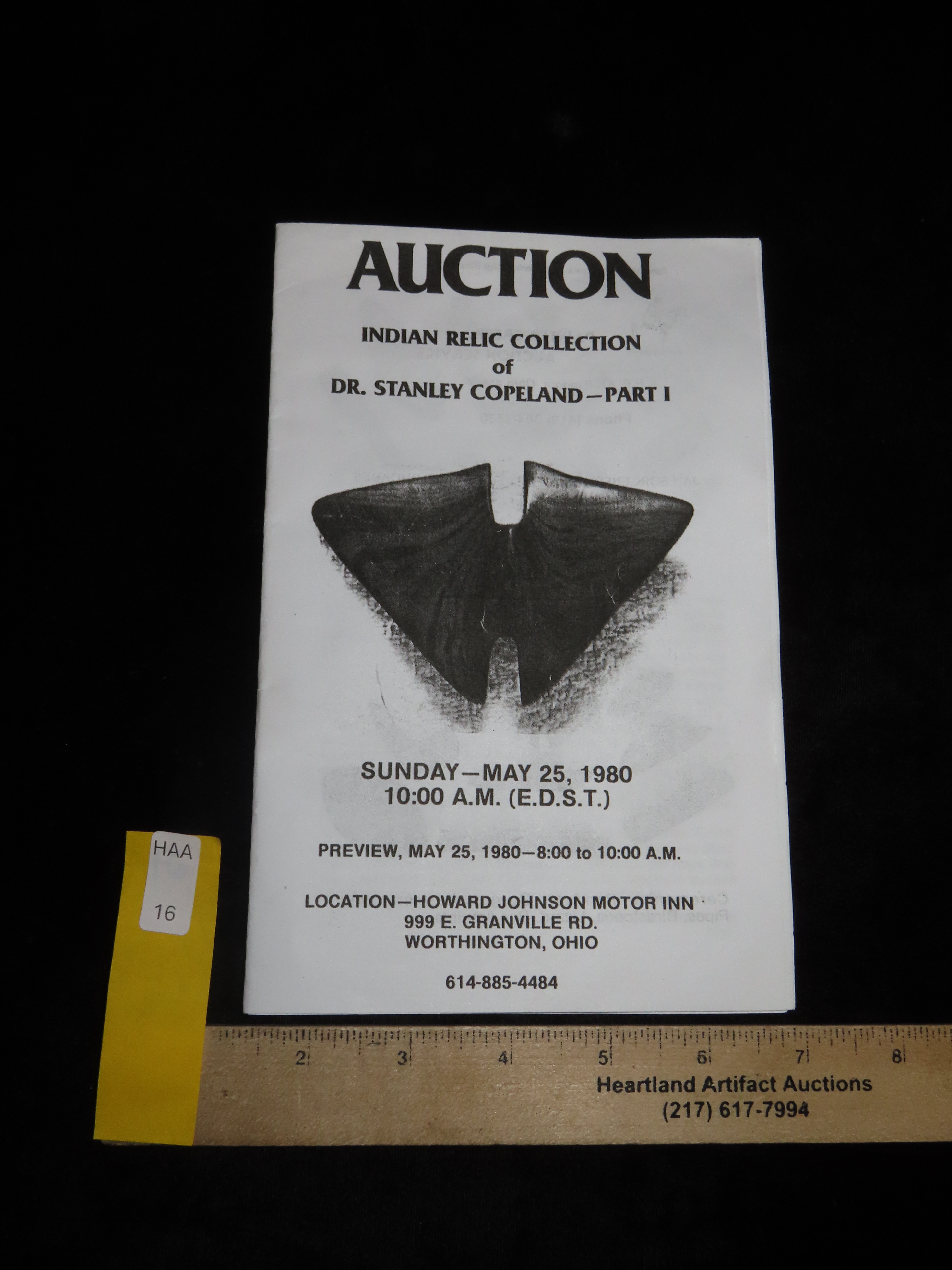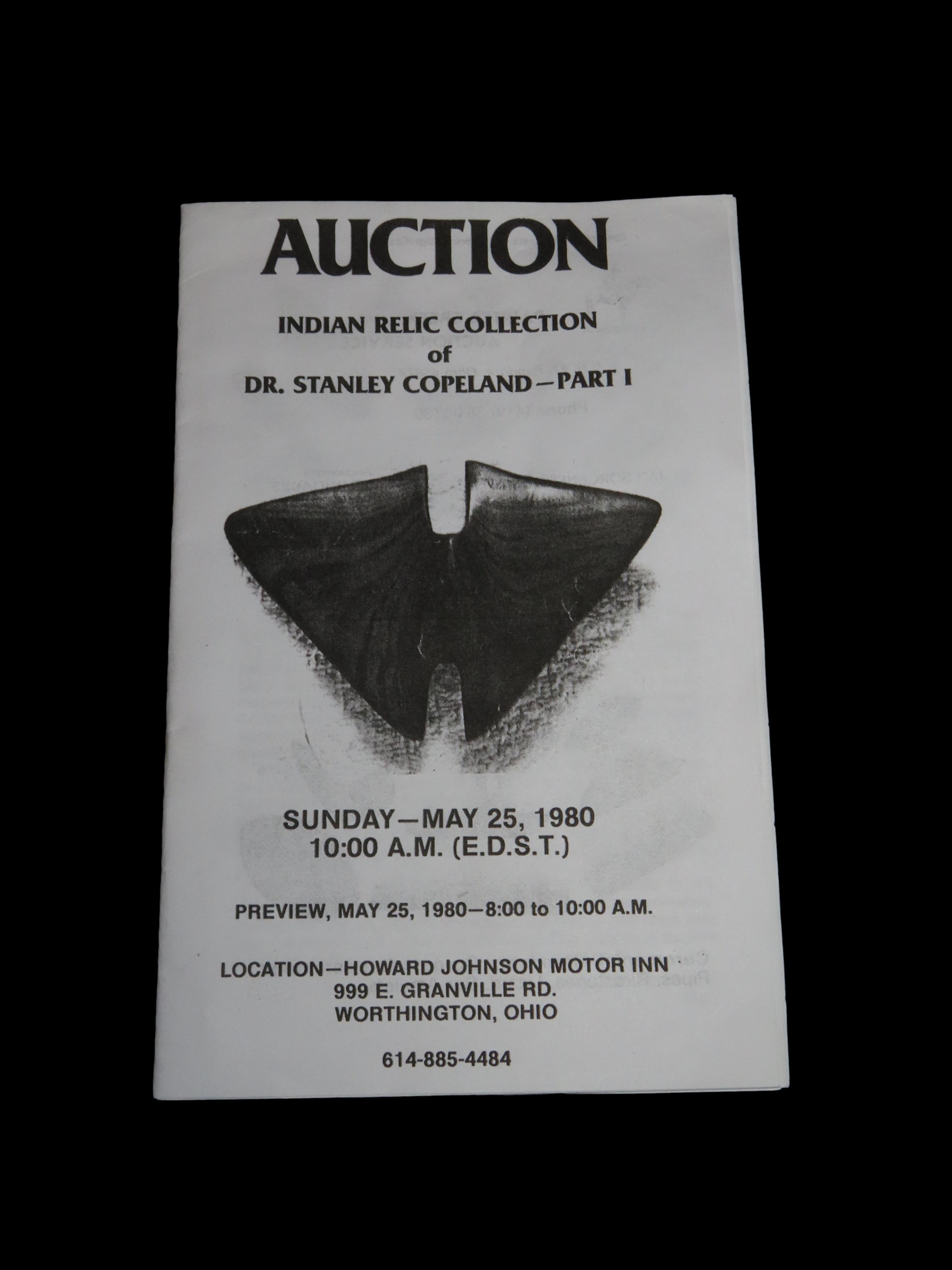 1980 Dr. Stanley Copeland Indian Artifact Collection Auction Catalog, Part 1, Painter Creek Auction Service, Bannerstone, Birdstones, Dovetail, Pipes, Tons of Great Old Time Relics. Small 12 Page Catalog.