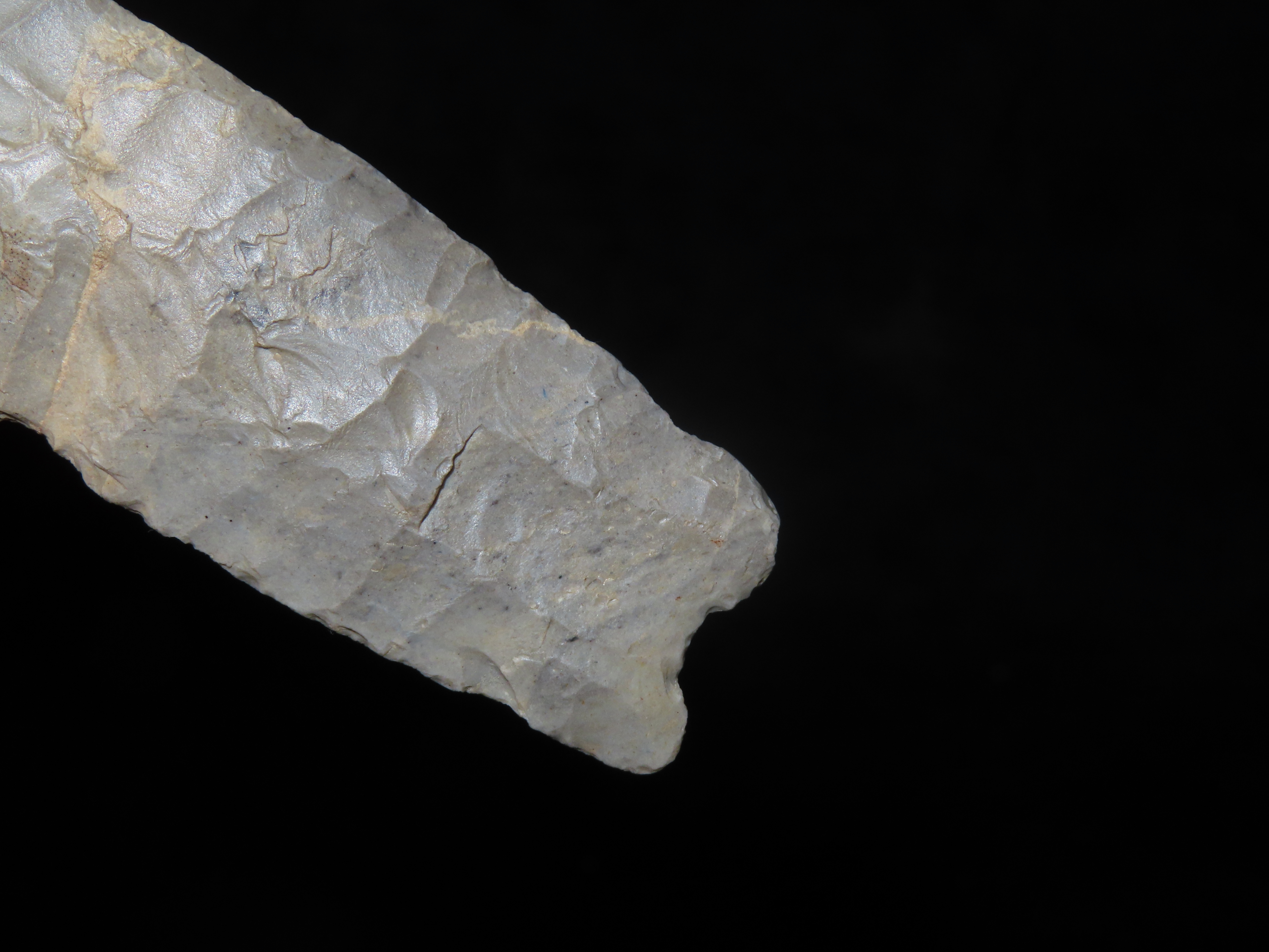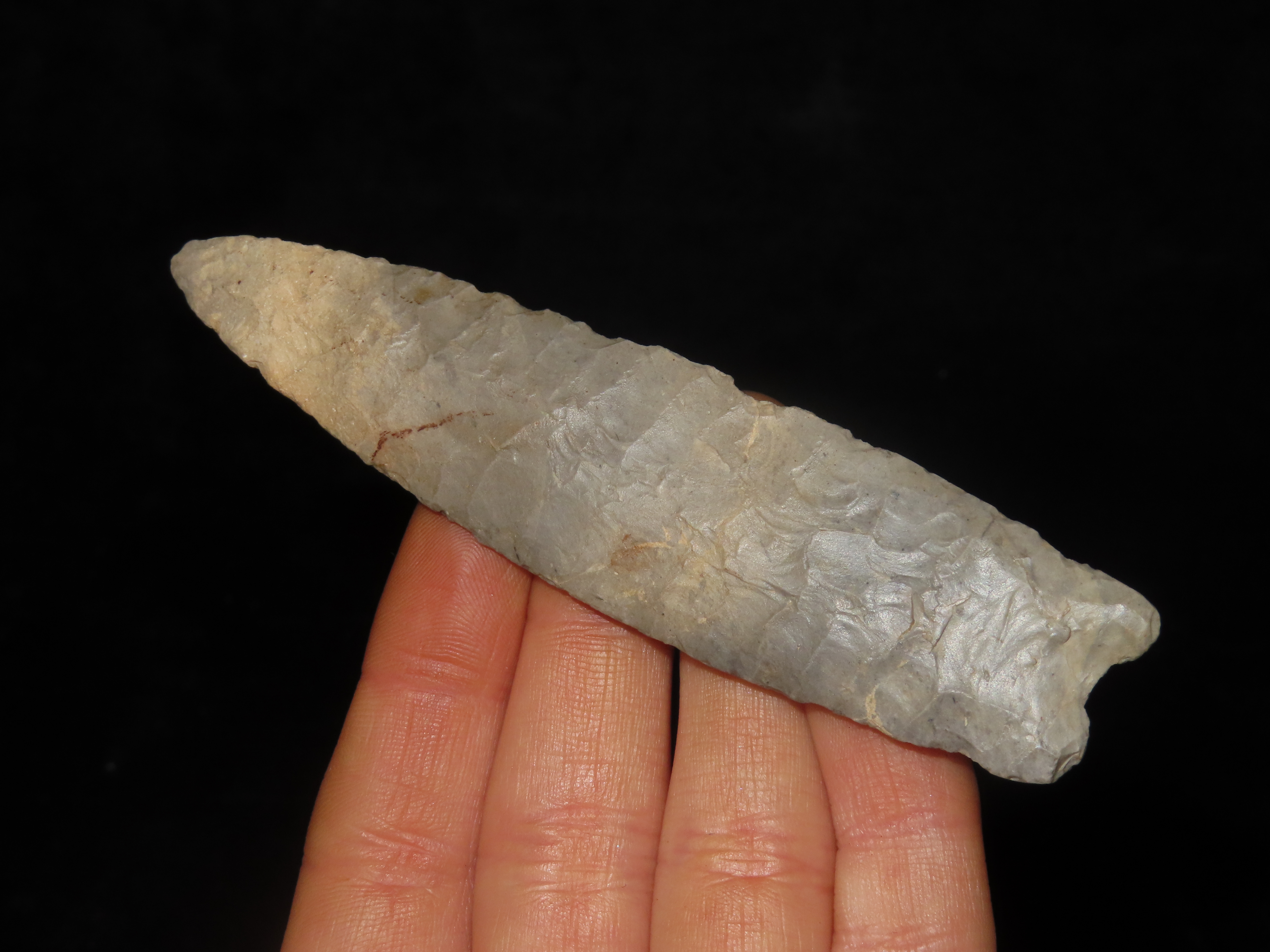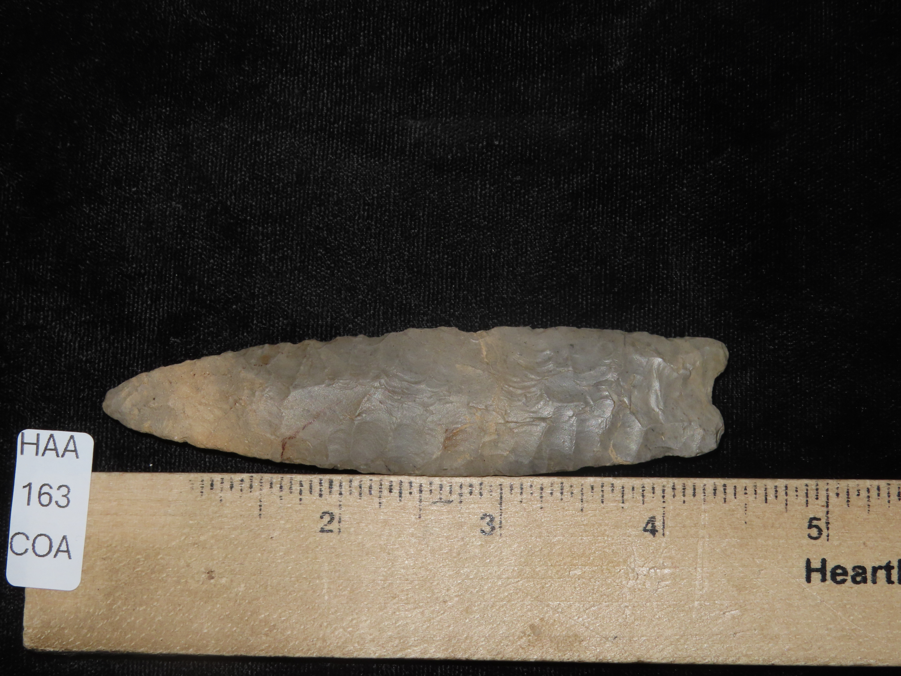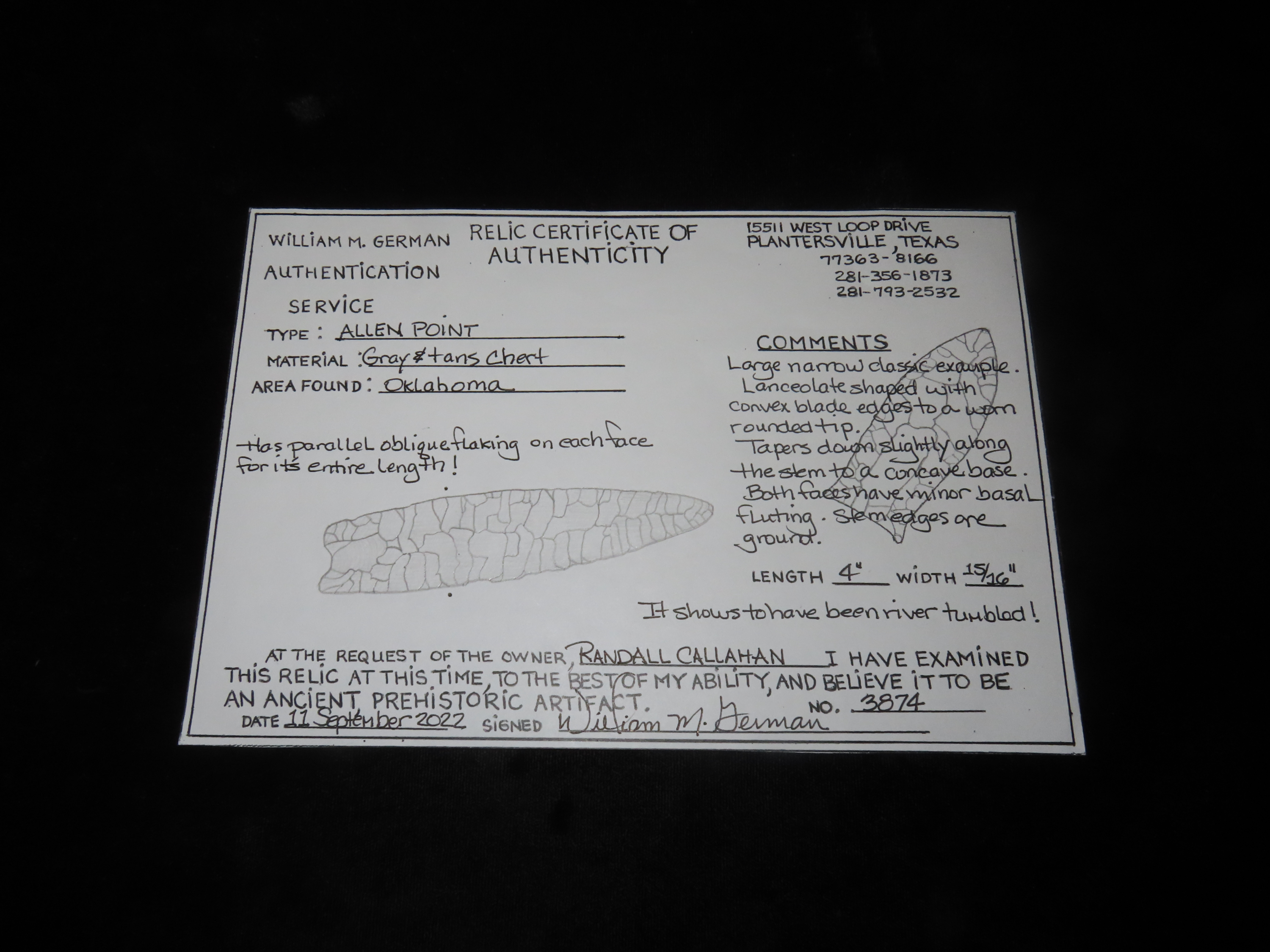 Incredible 4″ Paleo Allen, Oklahoma. Stermer & German COA’s. Incredible Early Oblique Flaking on both faces the entire length of the blade, Nice Short Flutes. Impressive Example of a more rare type! Ex Randall Callahan, Charles Kleinhert. Found in East Central Oklahoma.