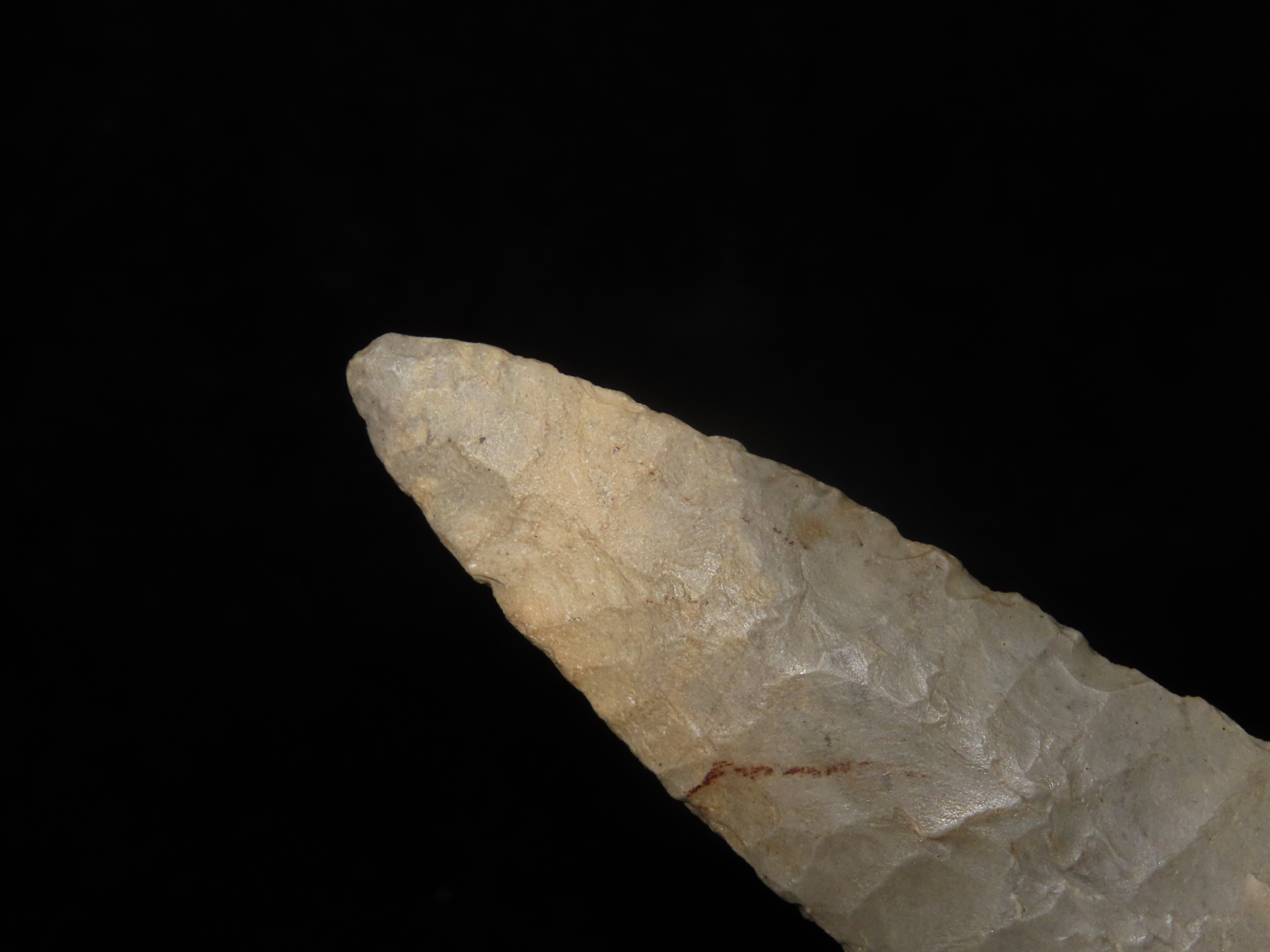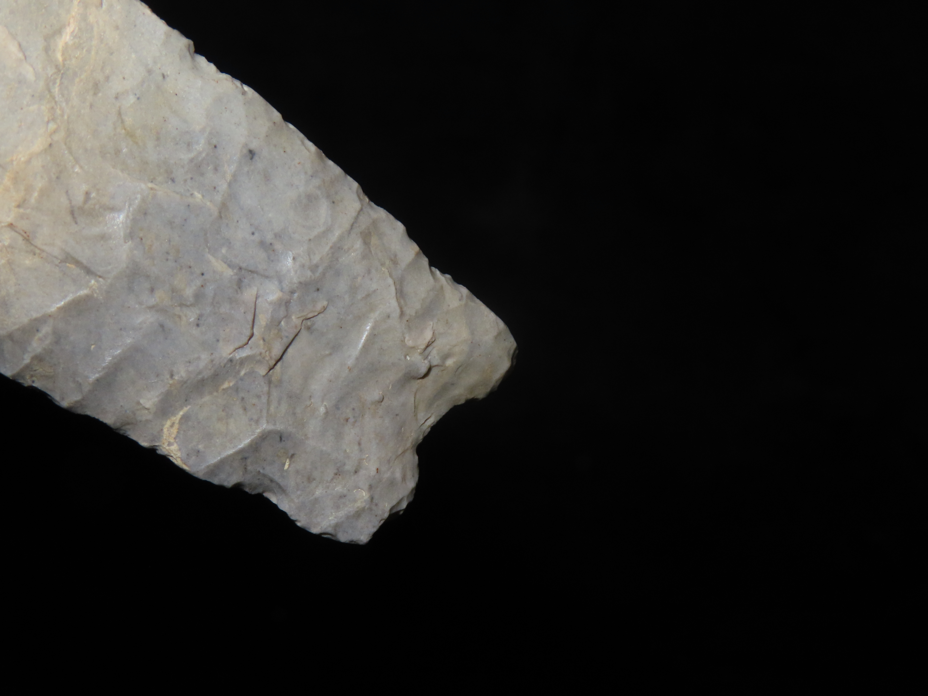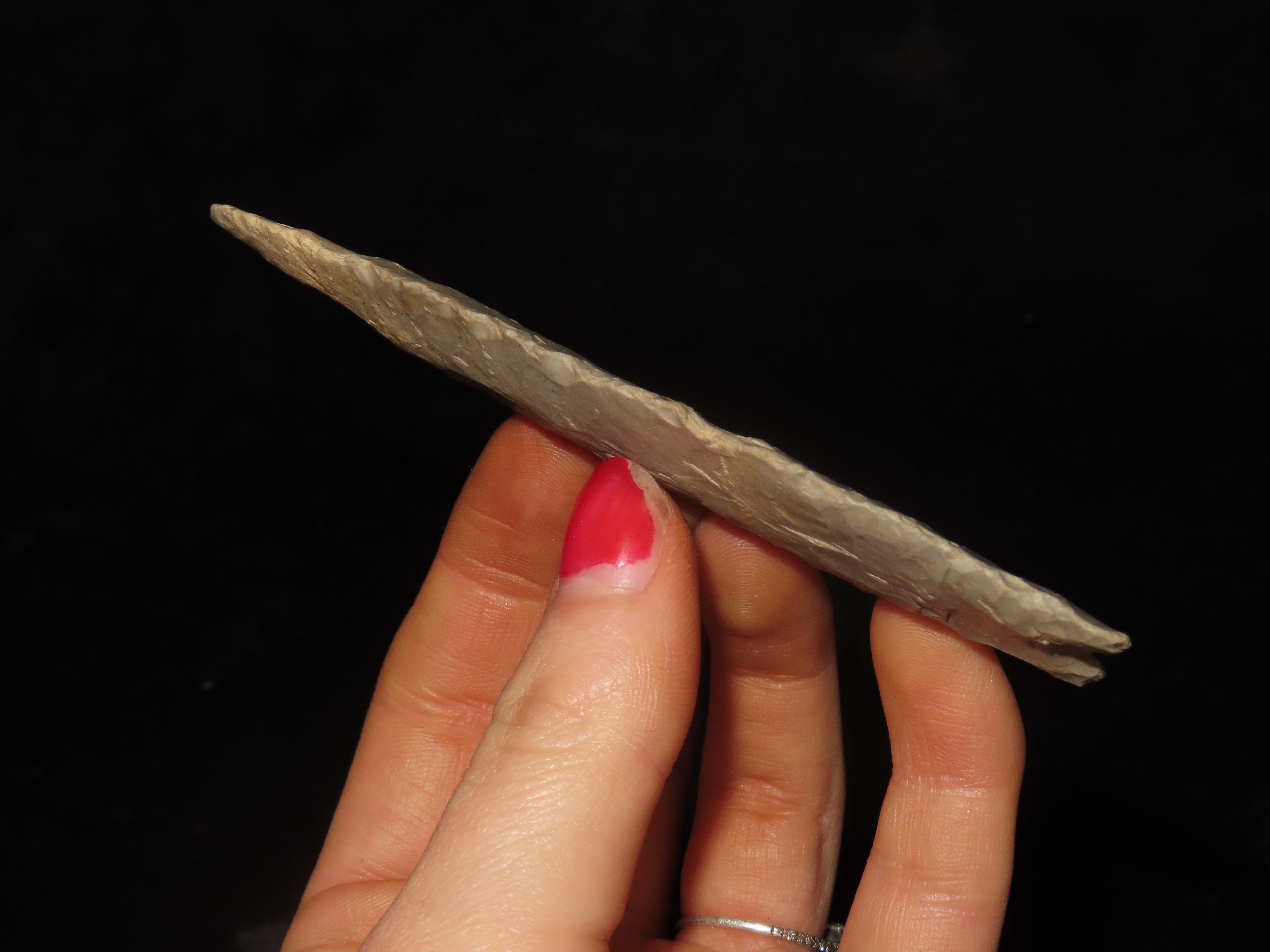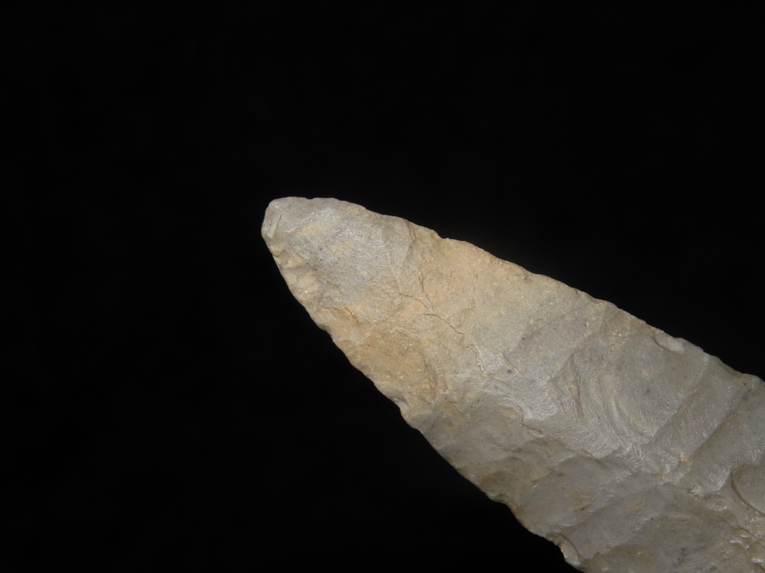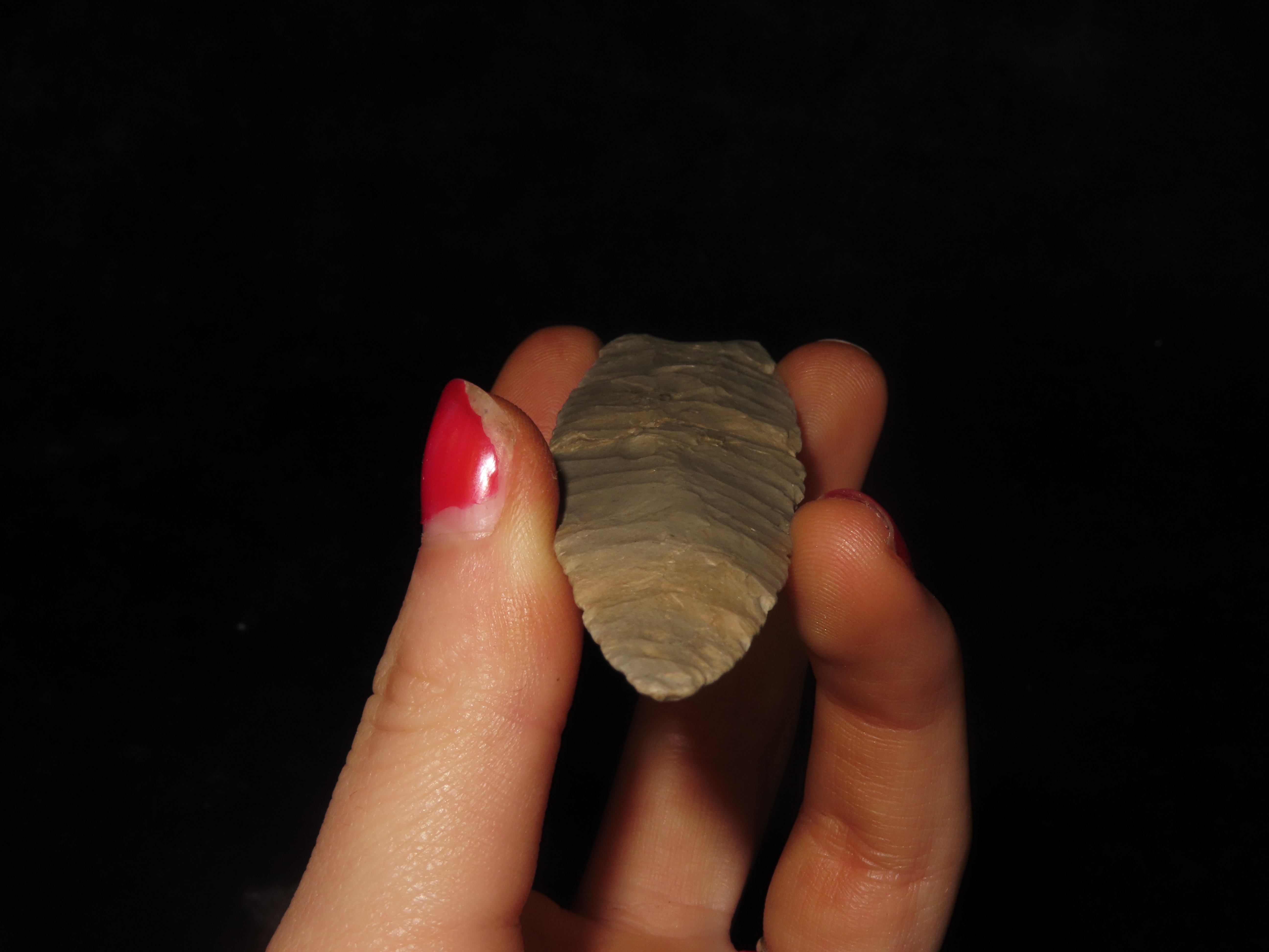 Incredible 4″ Paleo Allen, Oklahoma. Stermer & German COA’s. Incredible Early Oblique Flaking on both faces the entire length of the blade, Nice Short Flutes. Impressive Example of a more rare type! Ex Randall Callahan, Charles Kleinhert. Found in East Central Oklahoma.