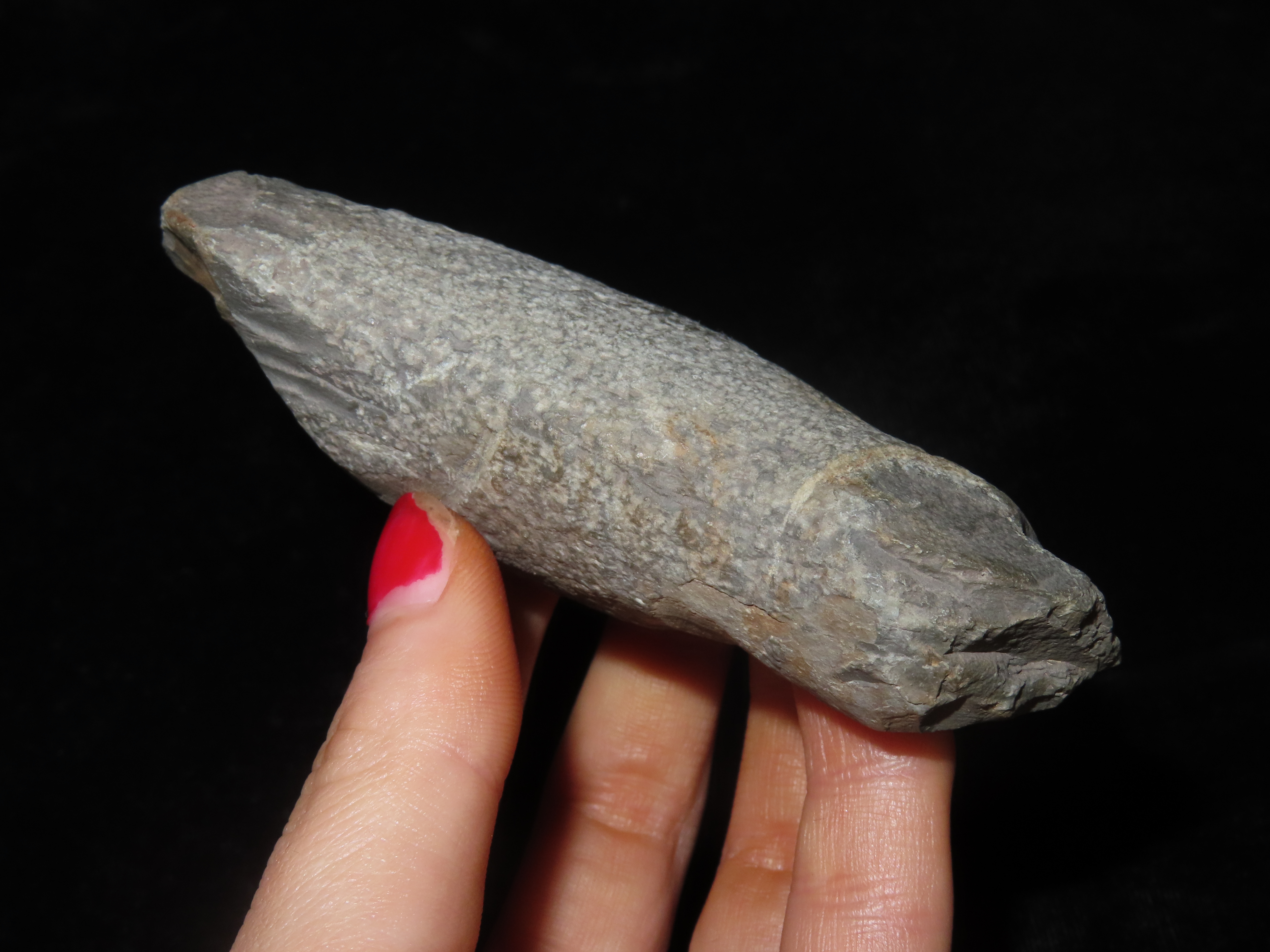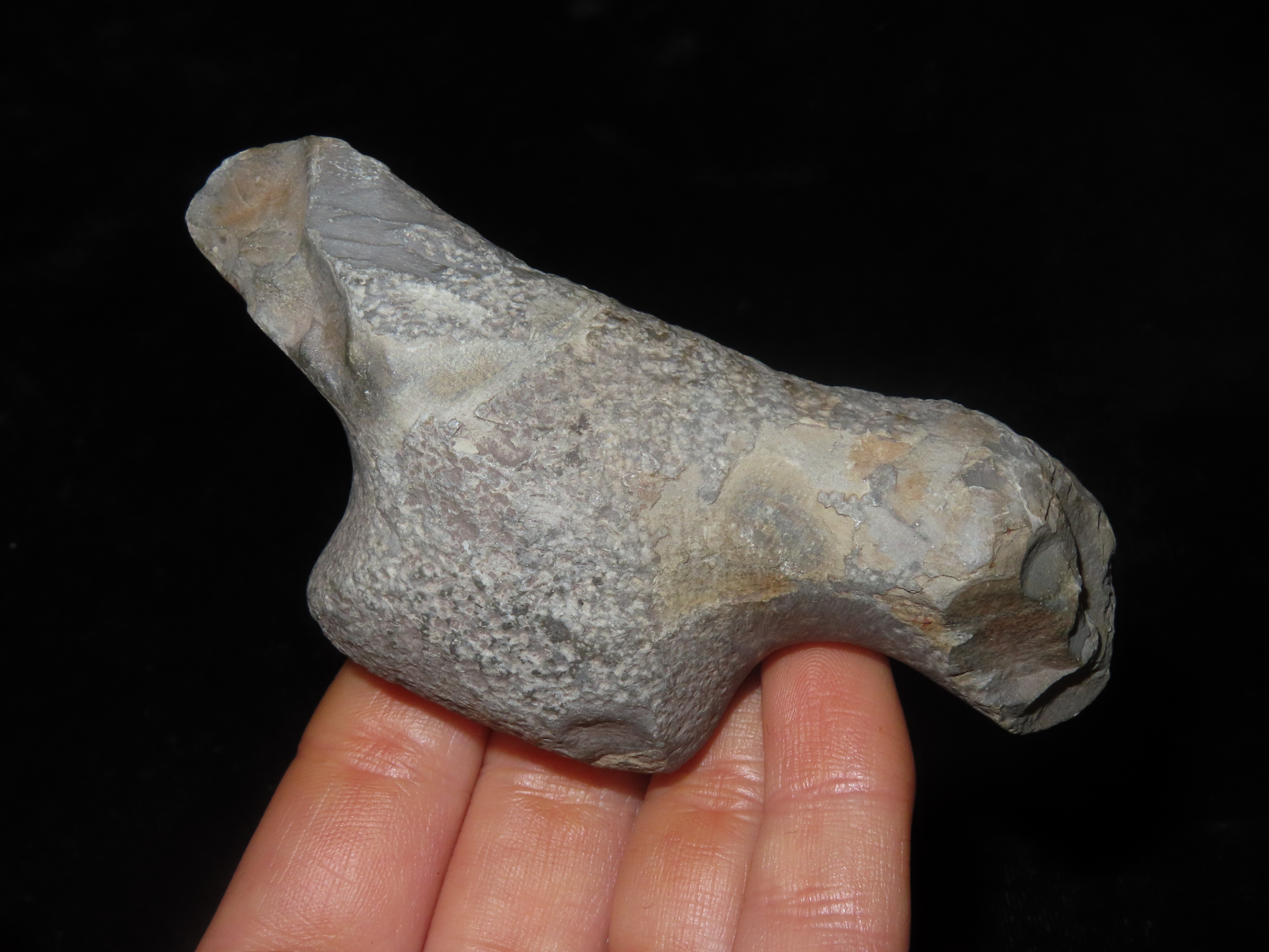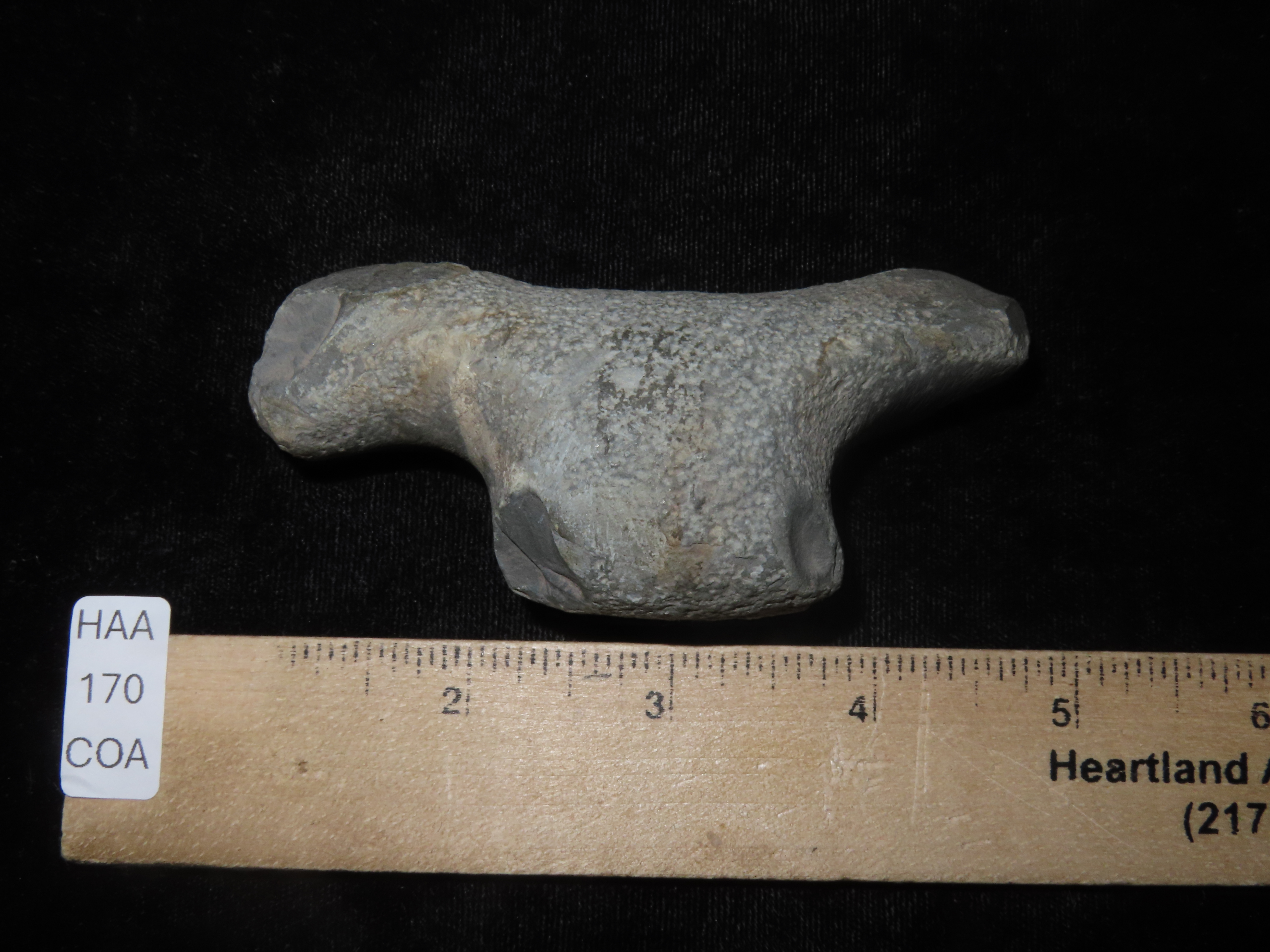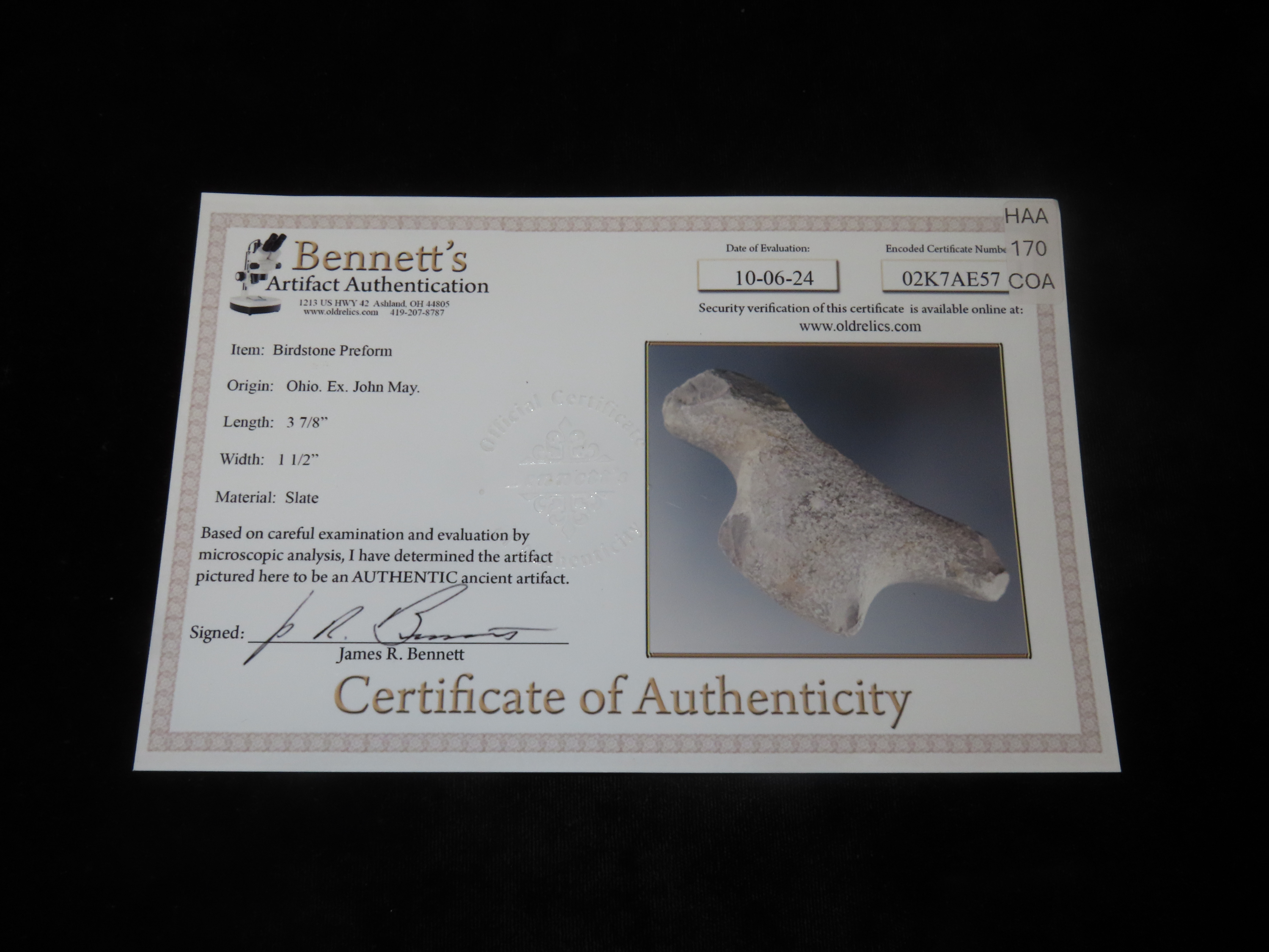 3 7/8″ Slate Birdstone Preform, Ohio. Bennett’s COA. Well shaped example with disctinct Head, Body, & Tail. Just lacked refining. Ex John May Collection.