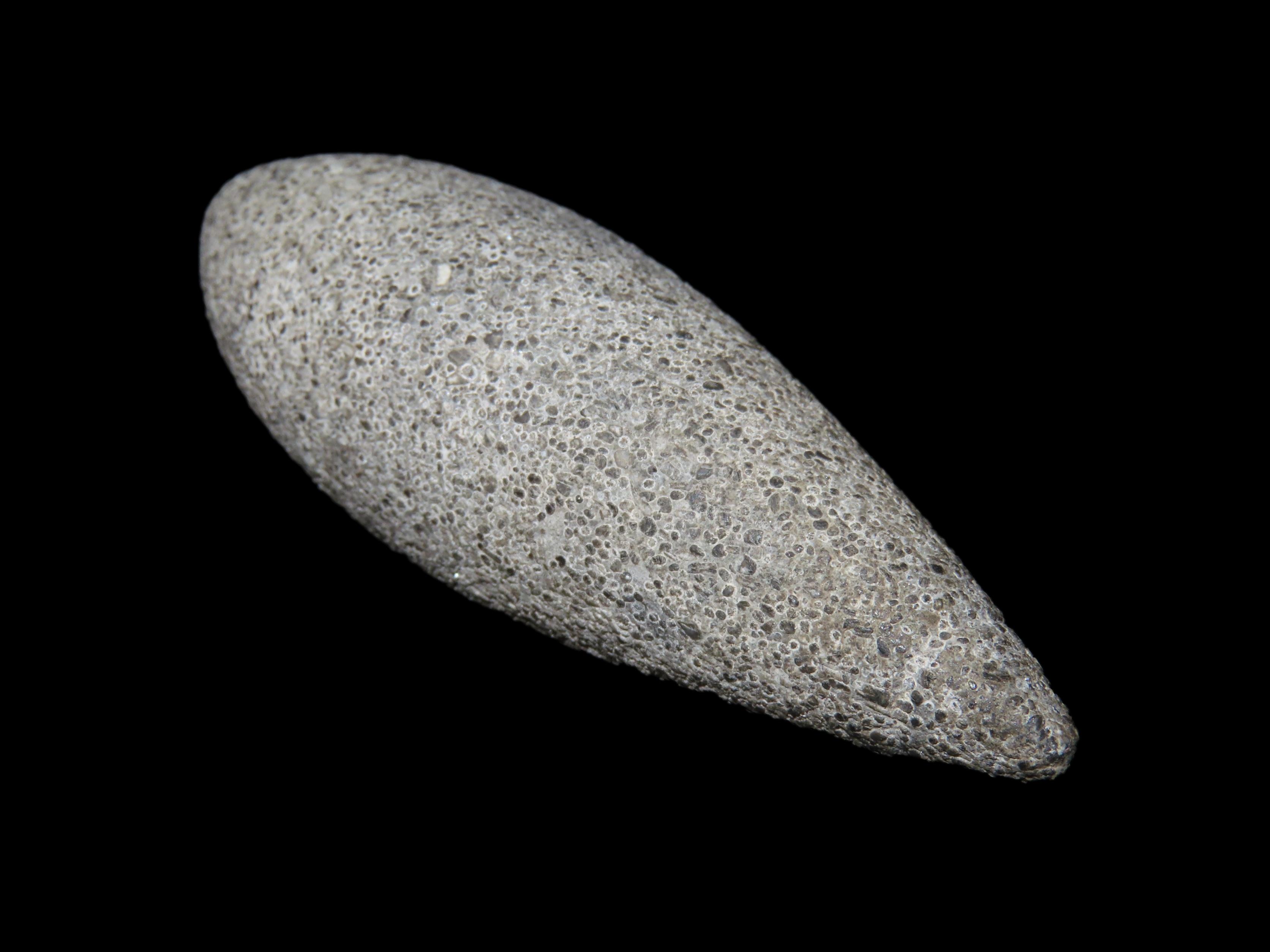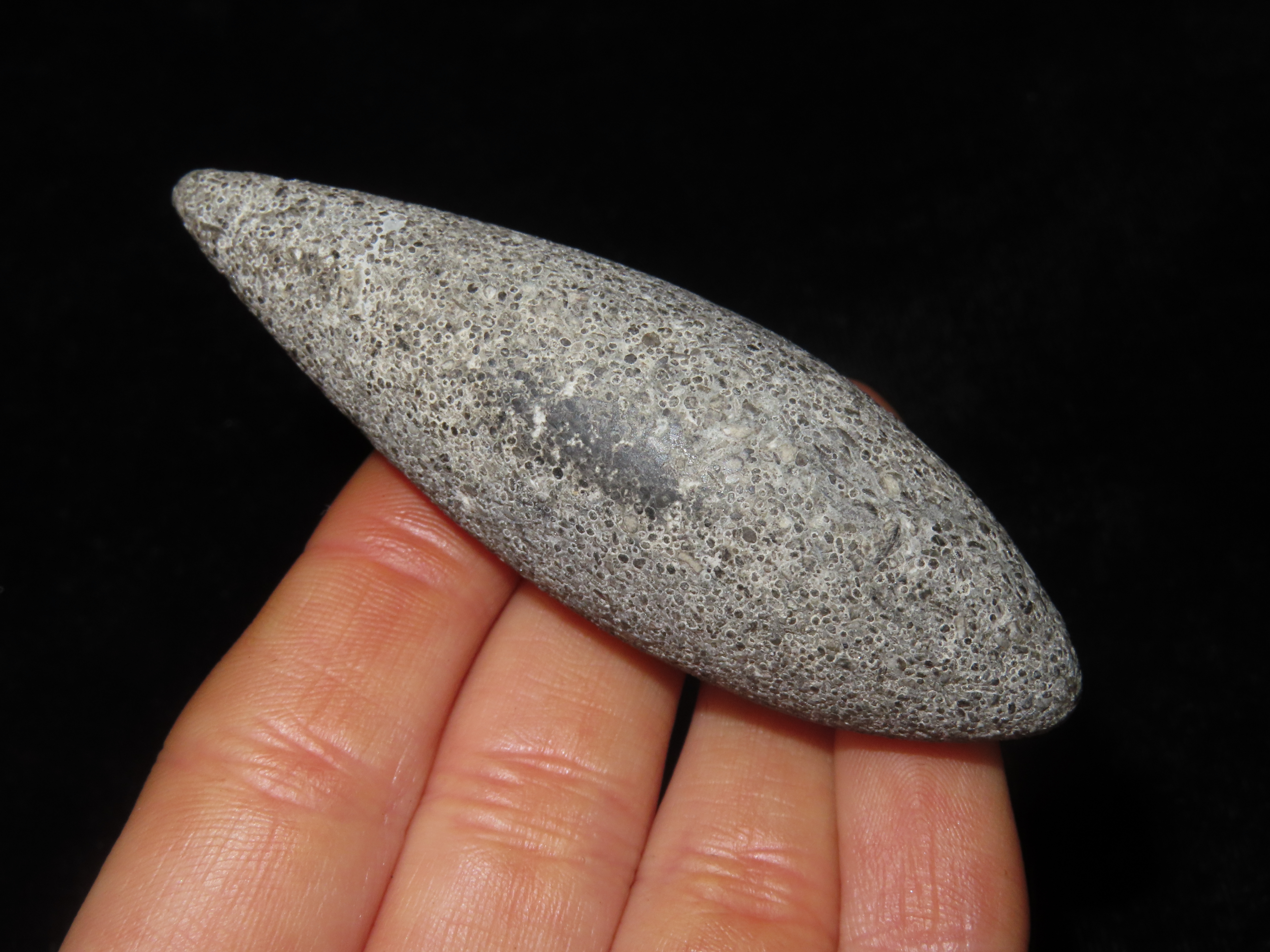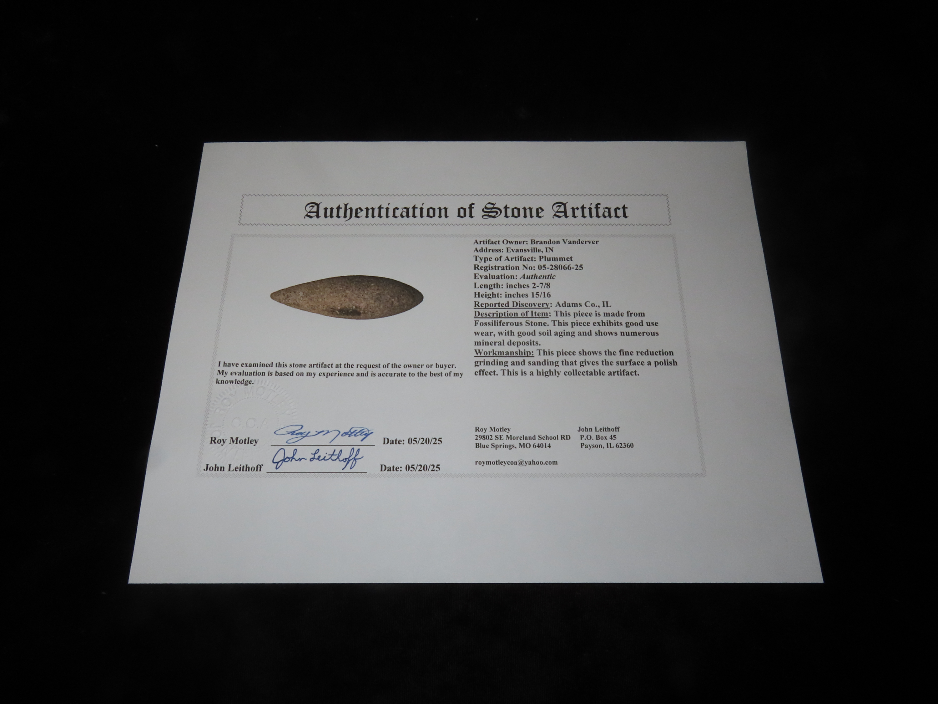 2 7/8″ Grooved Plummet, Adams Co. Illinois. Motley COA. Amazing Fossilferous Material, with 1000’s of tiny compacted fossils. Excellent form with nice polish and a shallow groove around the top. Flawless example!