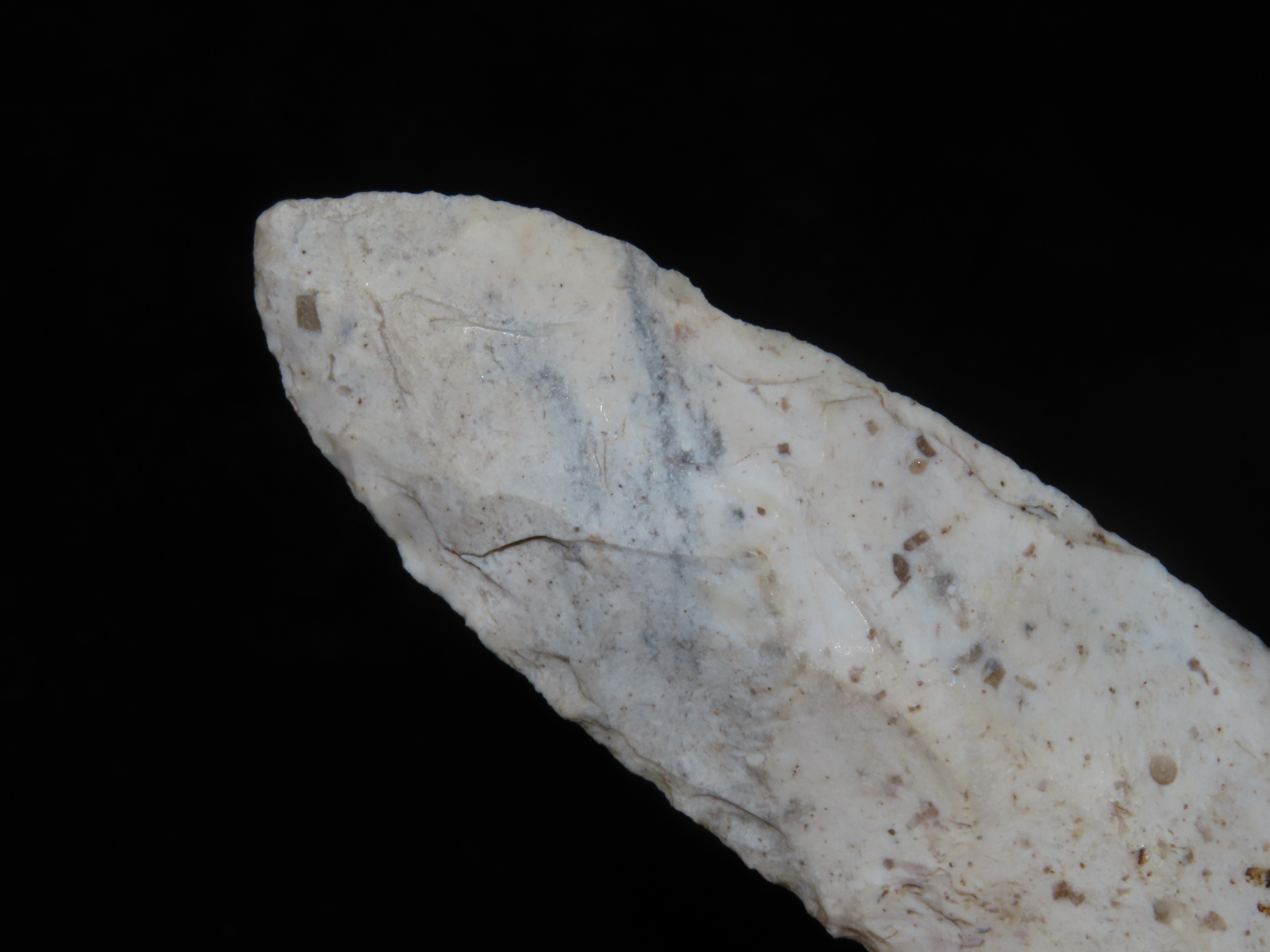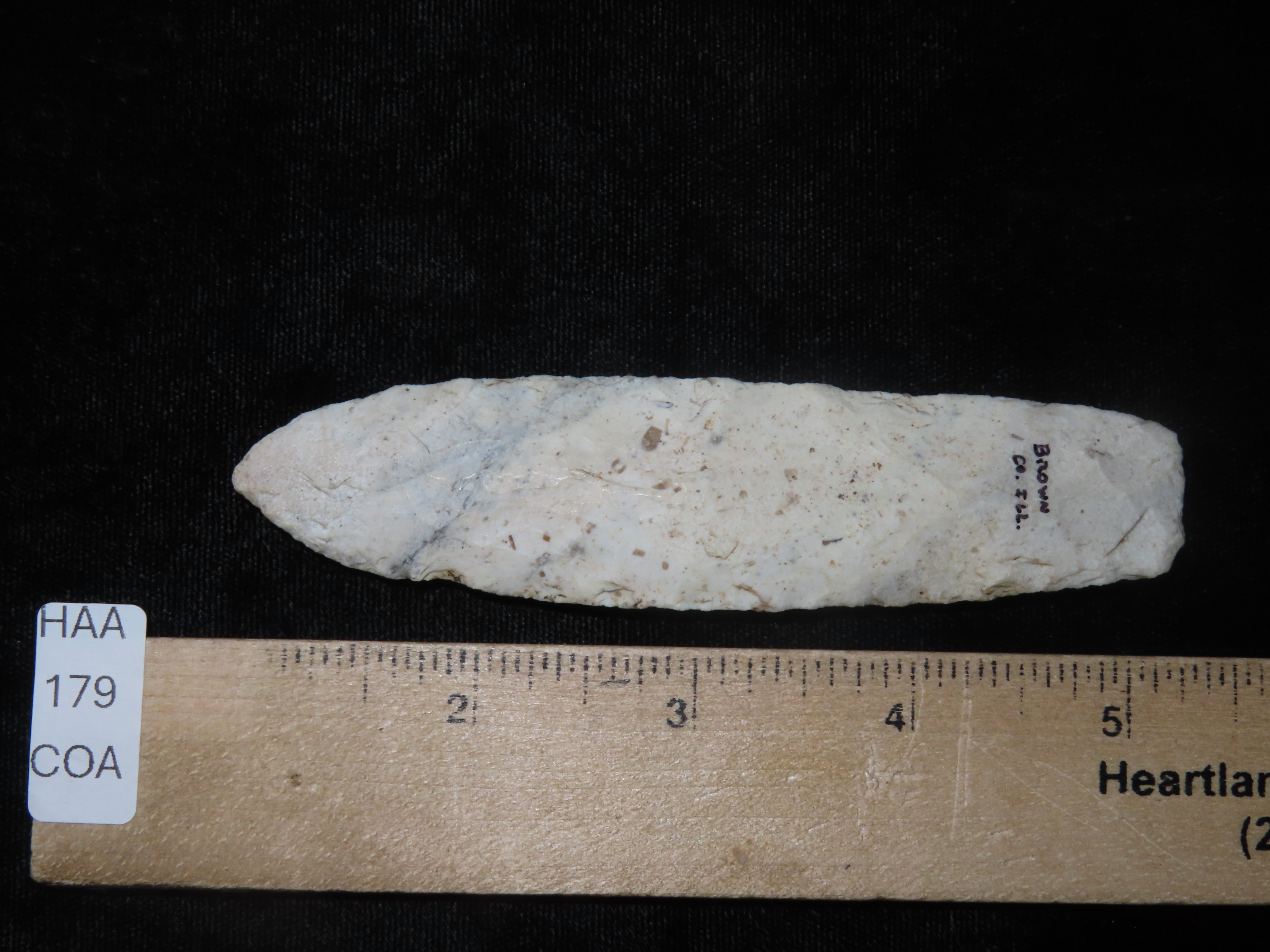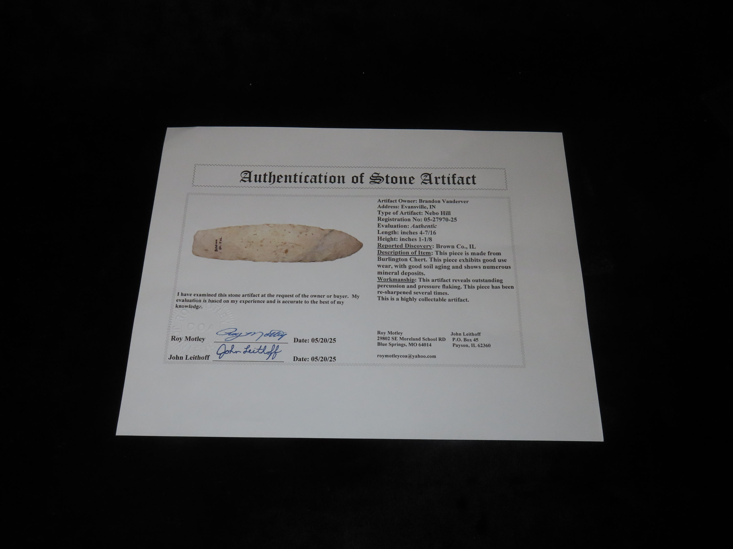 4 7/16″ Nebo Hill, Brown Co. Illinois. Motley COA. Nice examplew ith great flaking and nice deposits.