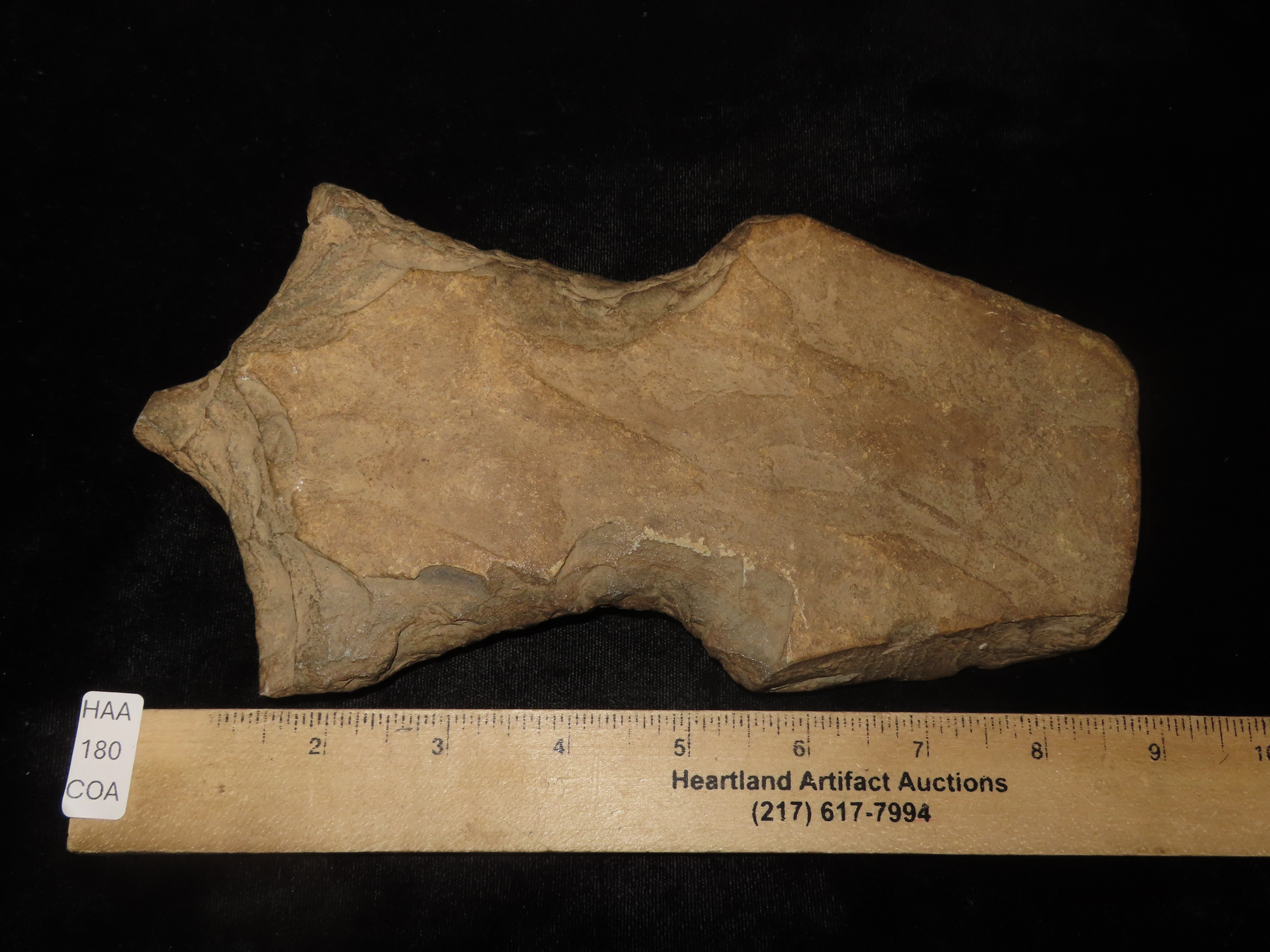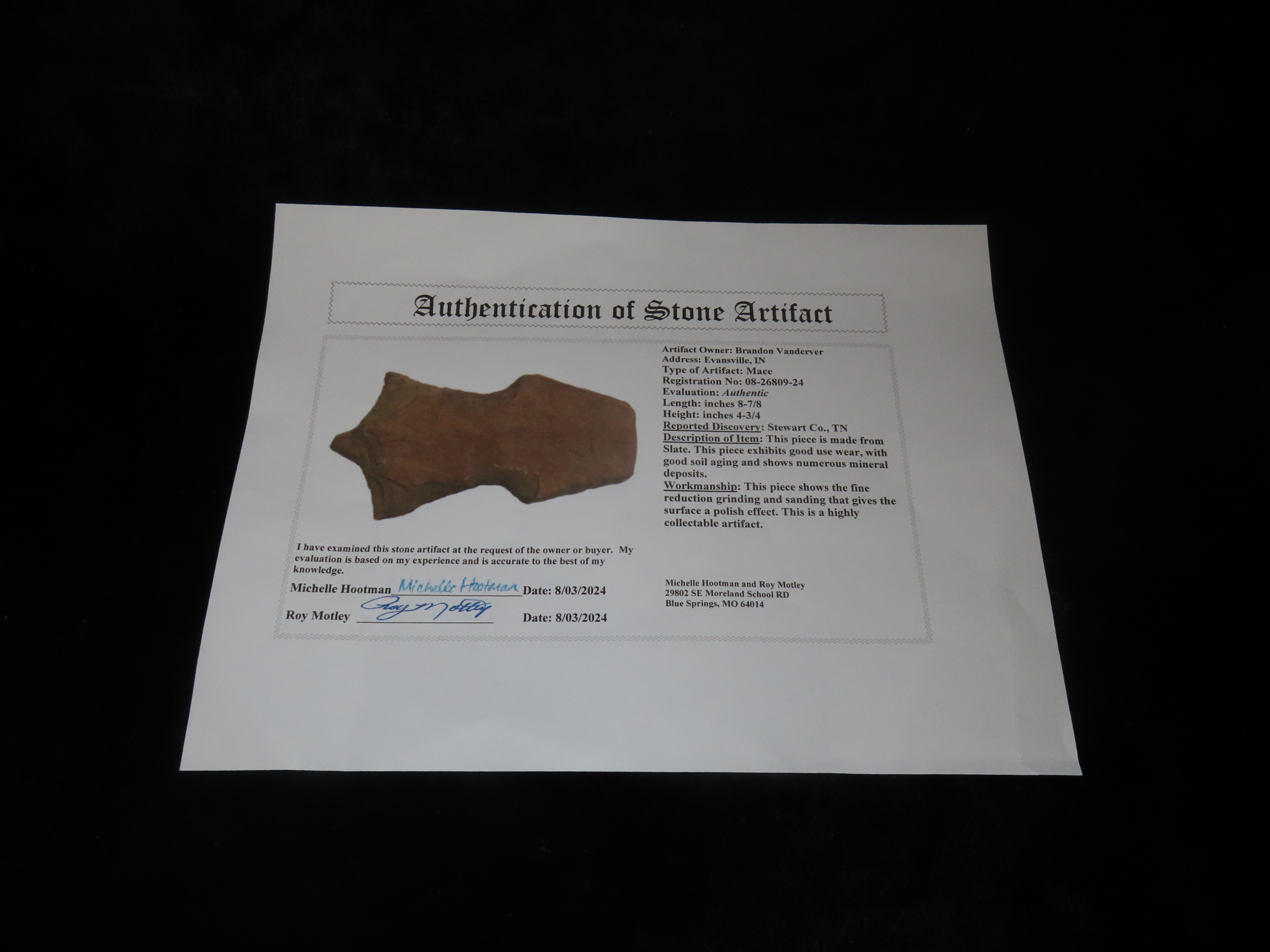 Rare 8 7/8″ Stone Mace, Stewart Co. Tennessee. Motley COA. Very rare Mace. Heavily patinated brown slate.
