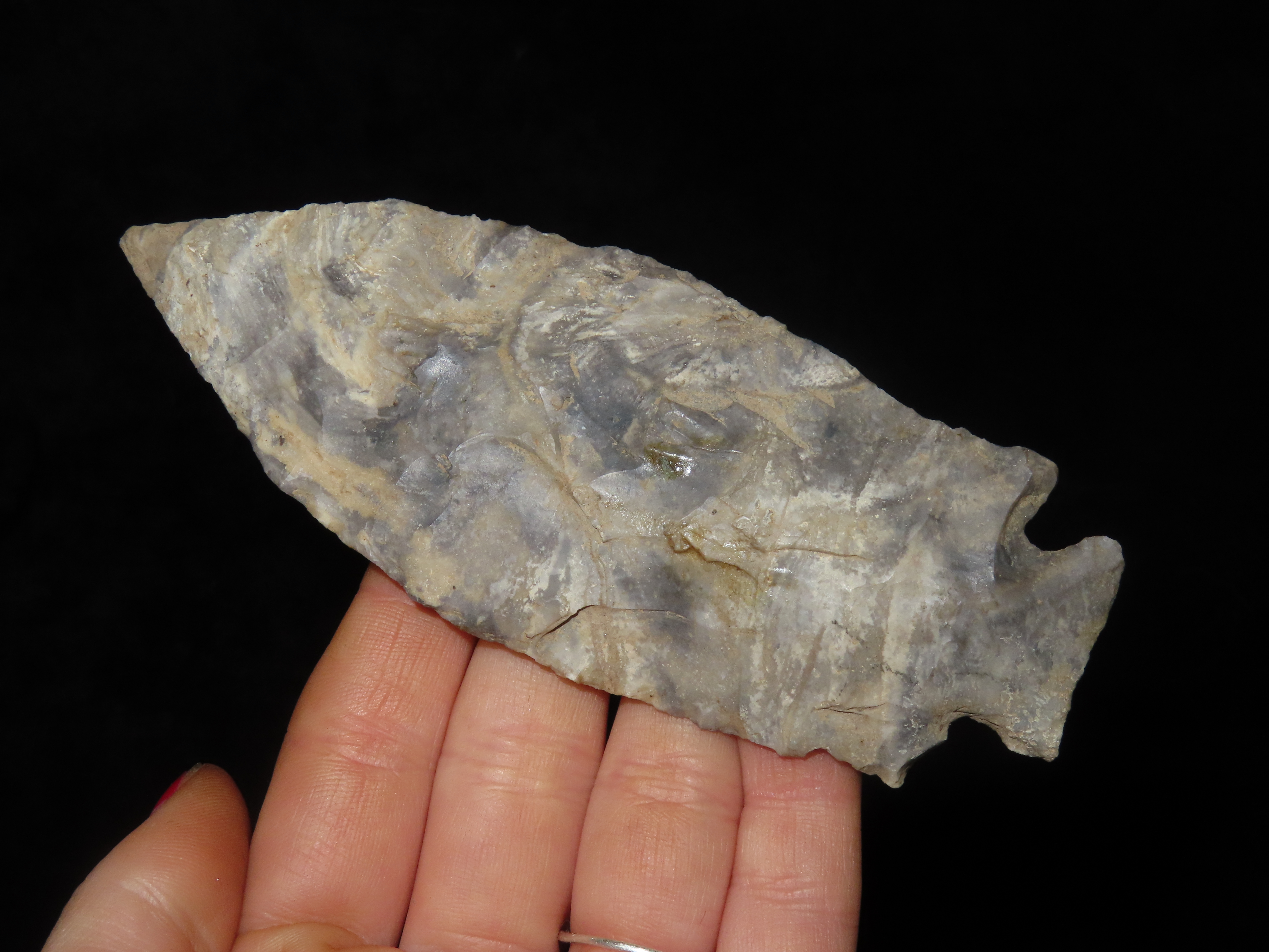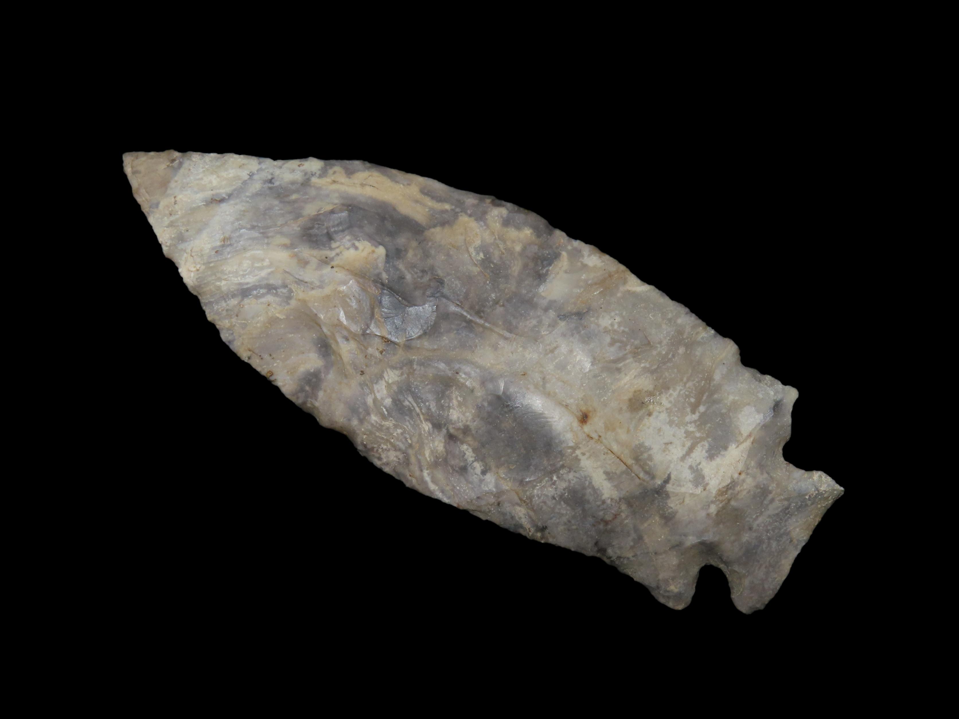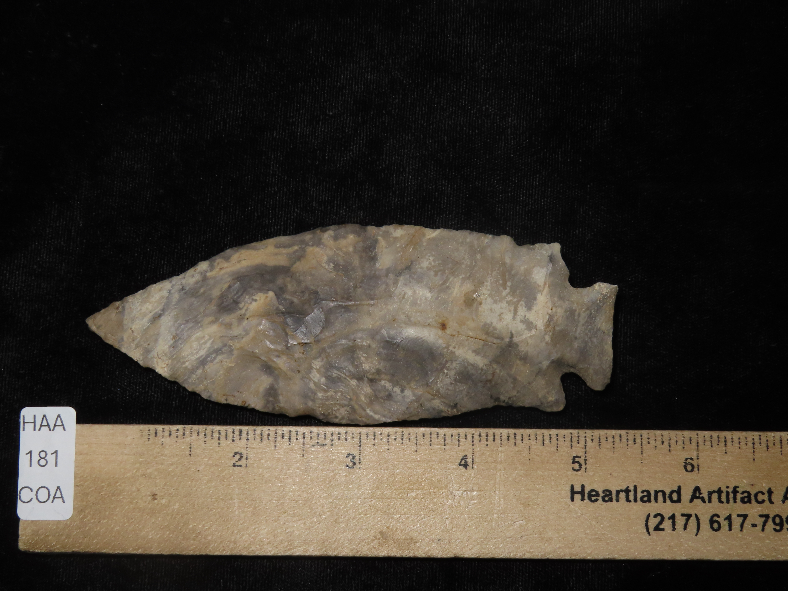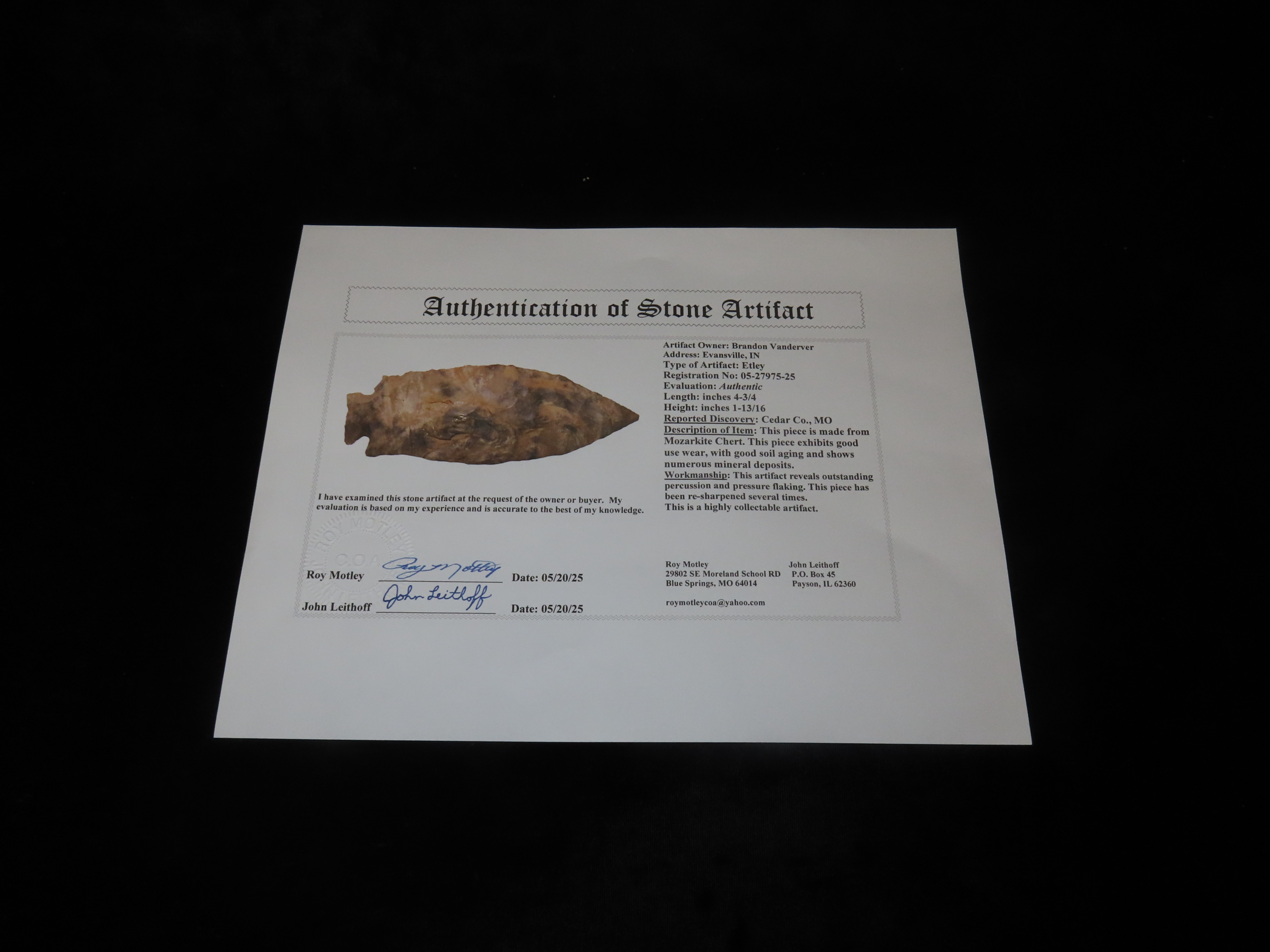 Colorful 4 3/4″ Etley, Cedar Co. Missouri. Motley COA. Made from a Beautiful piece of heavily patianted Mozarkite Chert. Nice size & Great Color!