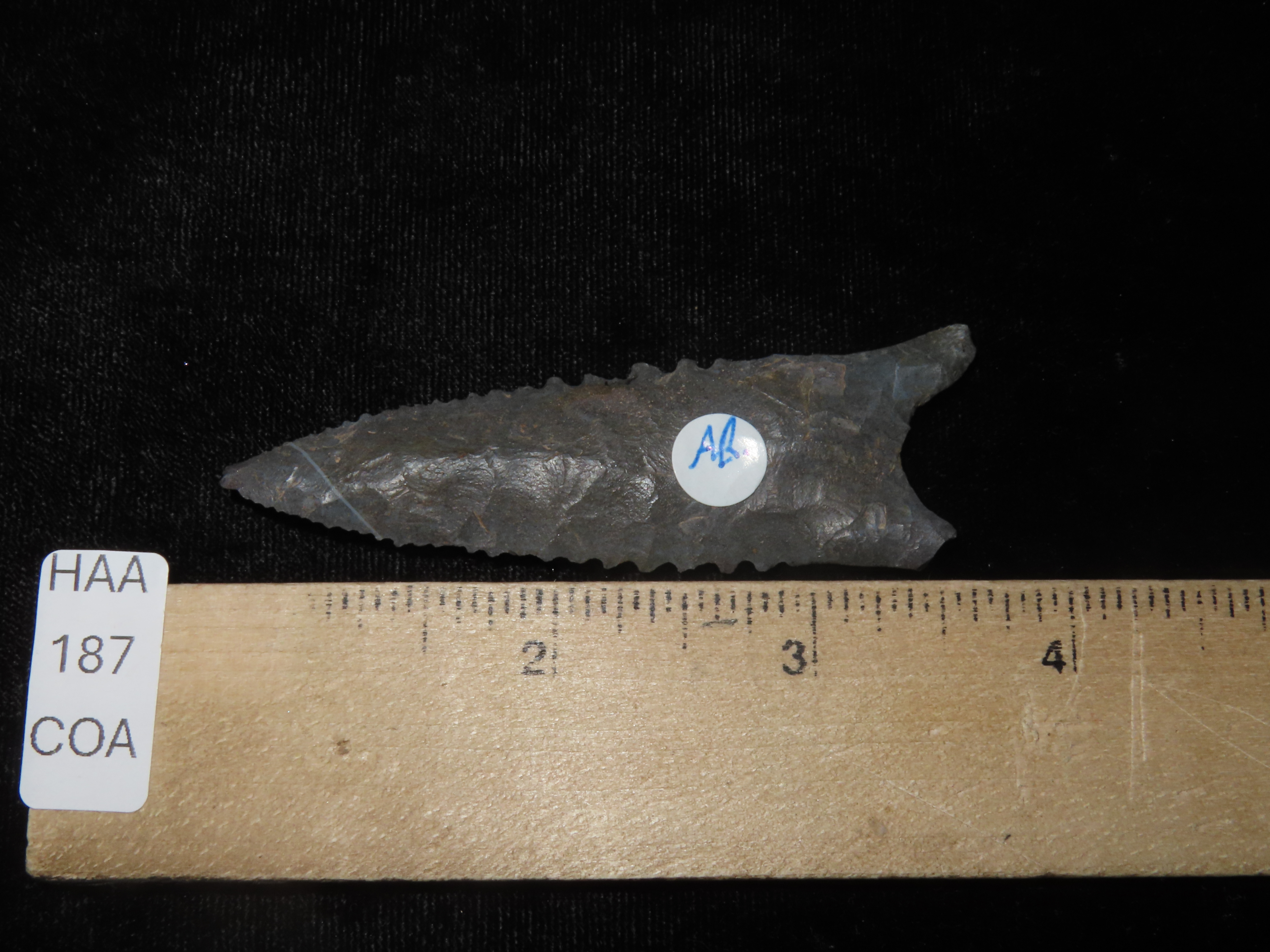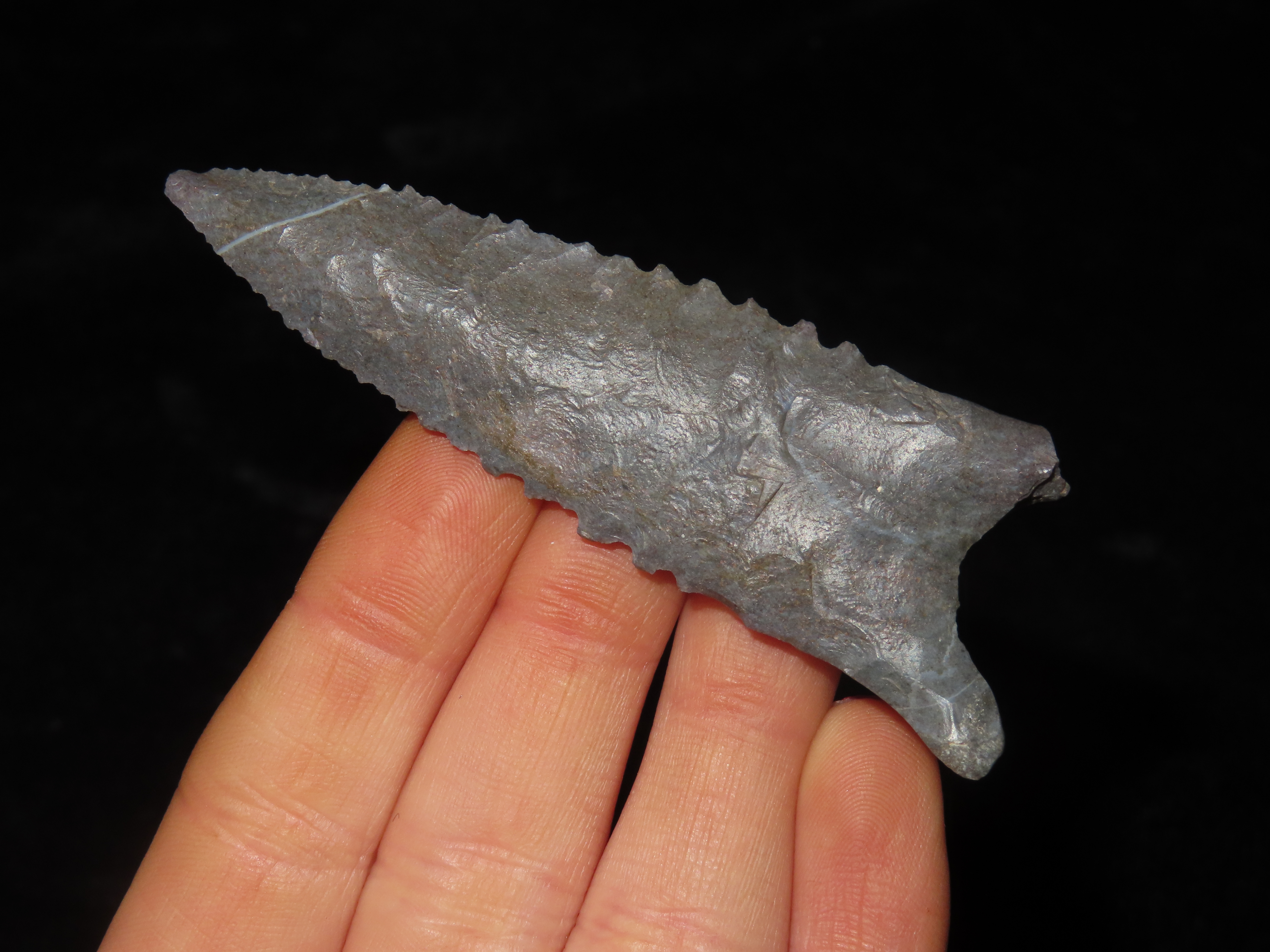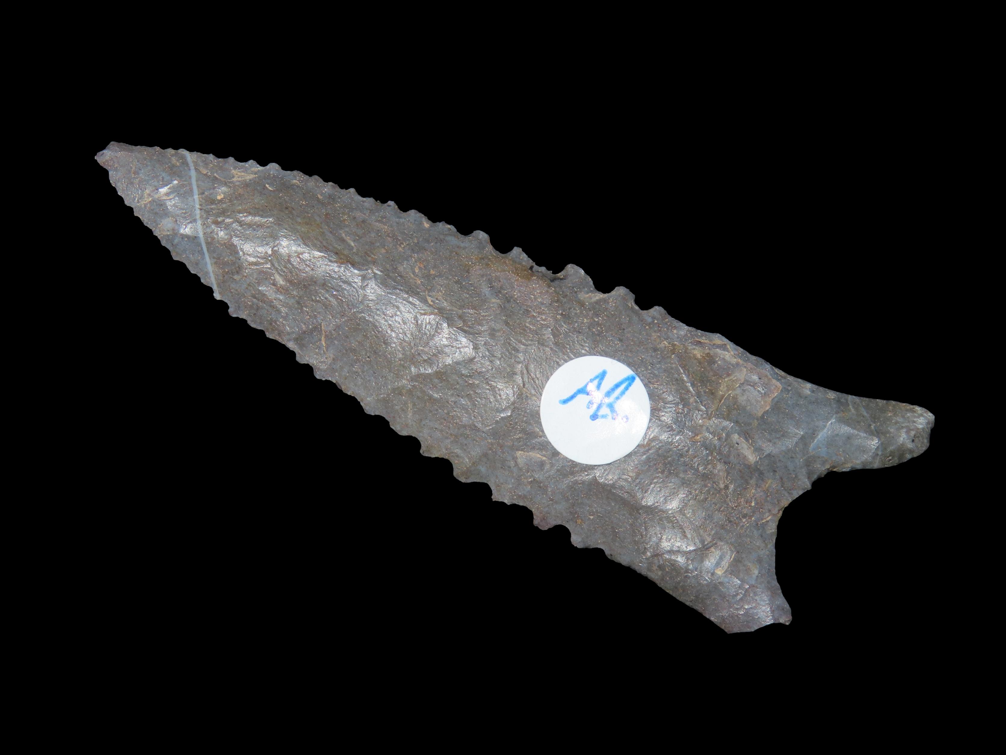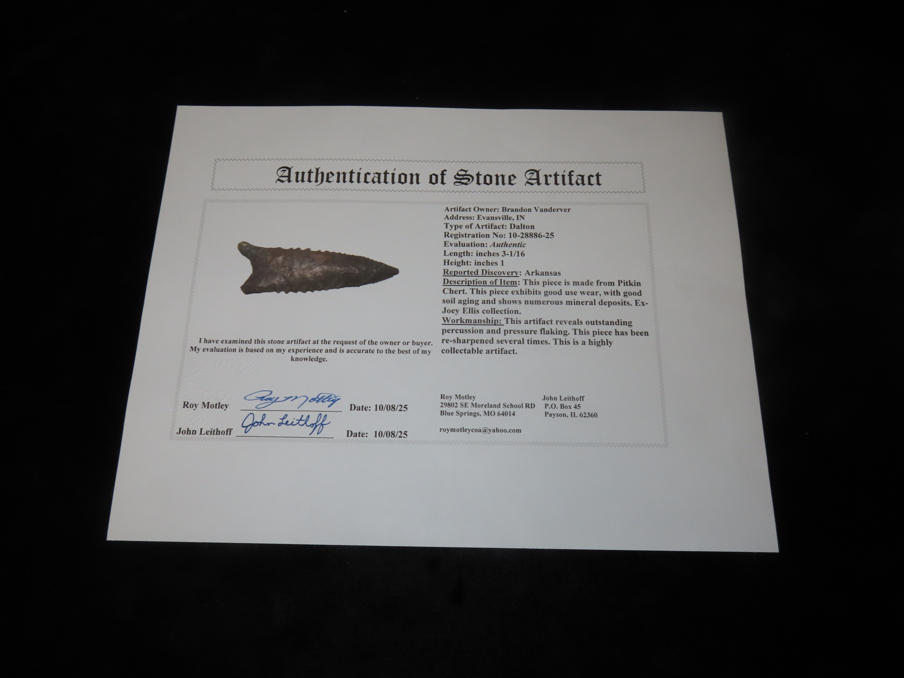 3 1/16″ Serrated Pitkin Chert Dalton, Arkansas. Motley COA. Amazing serrations, nice classic form, thin and well flaked. Ex Joey Ellis Collection.
