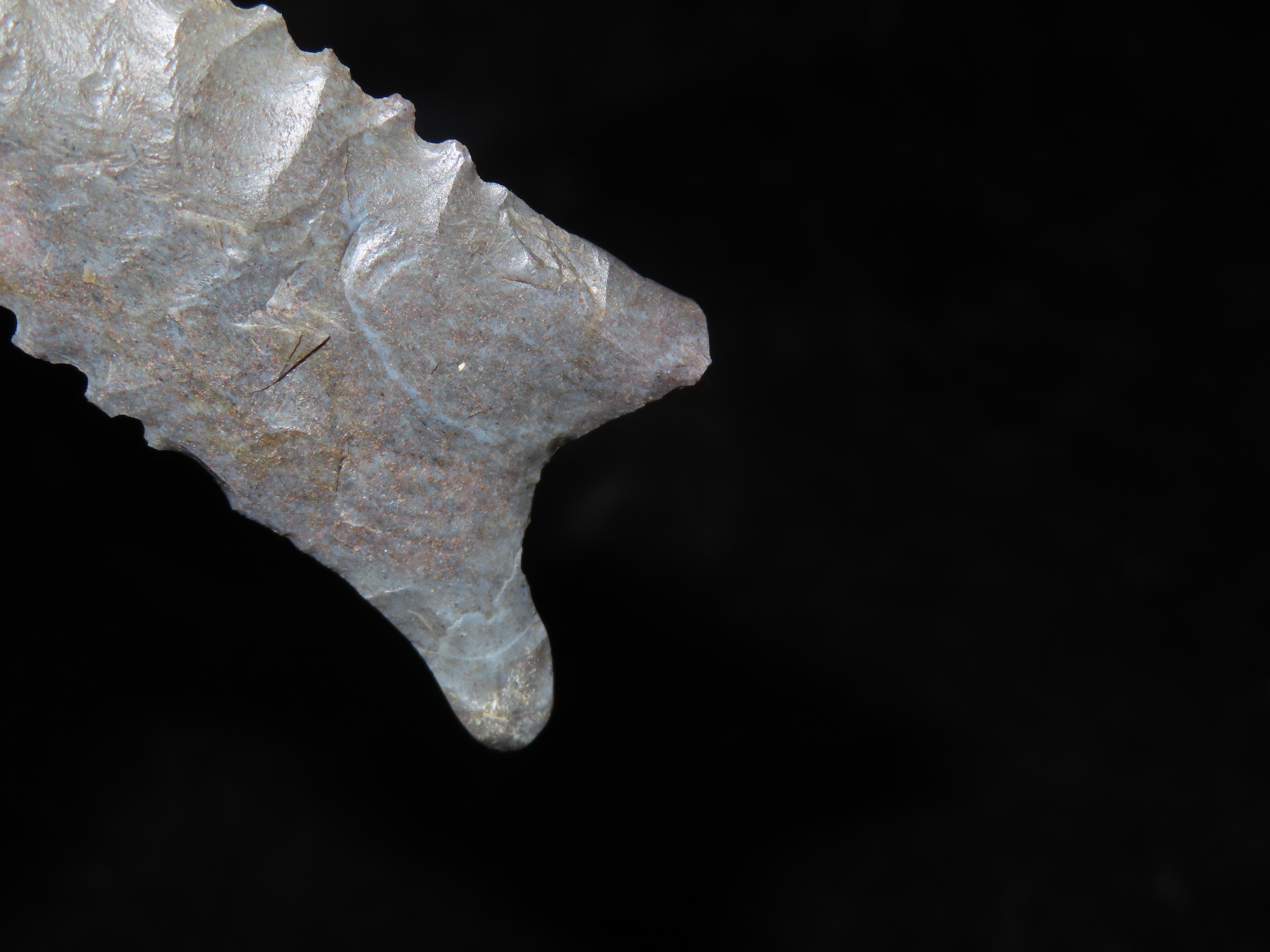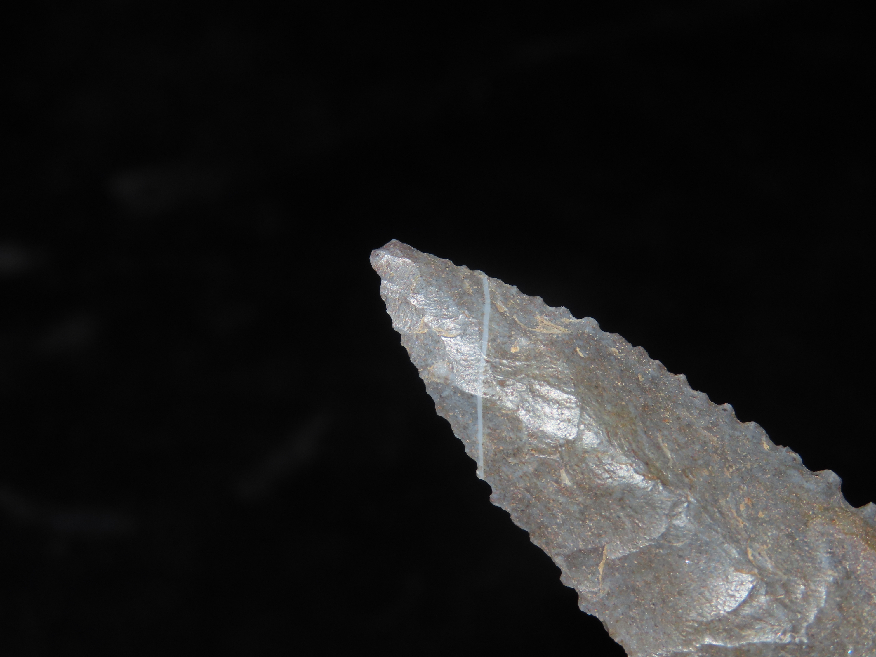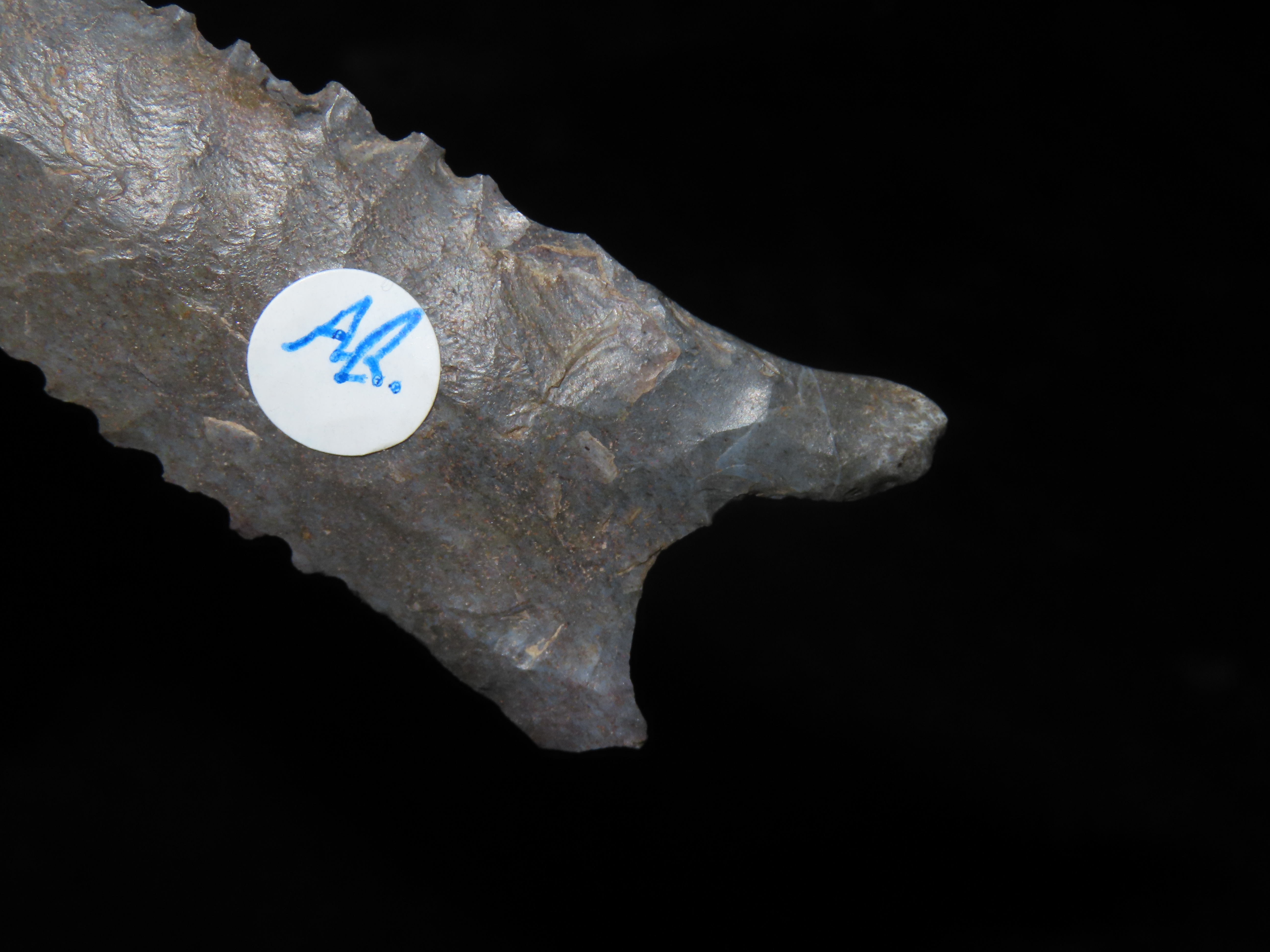 3 1/16″ Serrated Pitkin Chert Dalton, Arkansas. Motley COA. Amazing serrations, nice classic form, thin and well flaked. Ex Joey Ellis Collection.