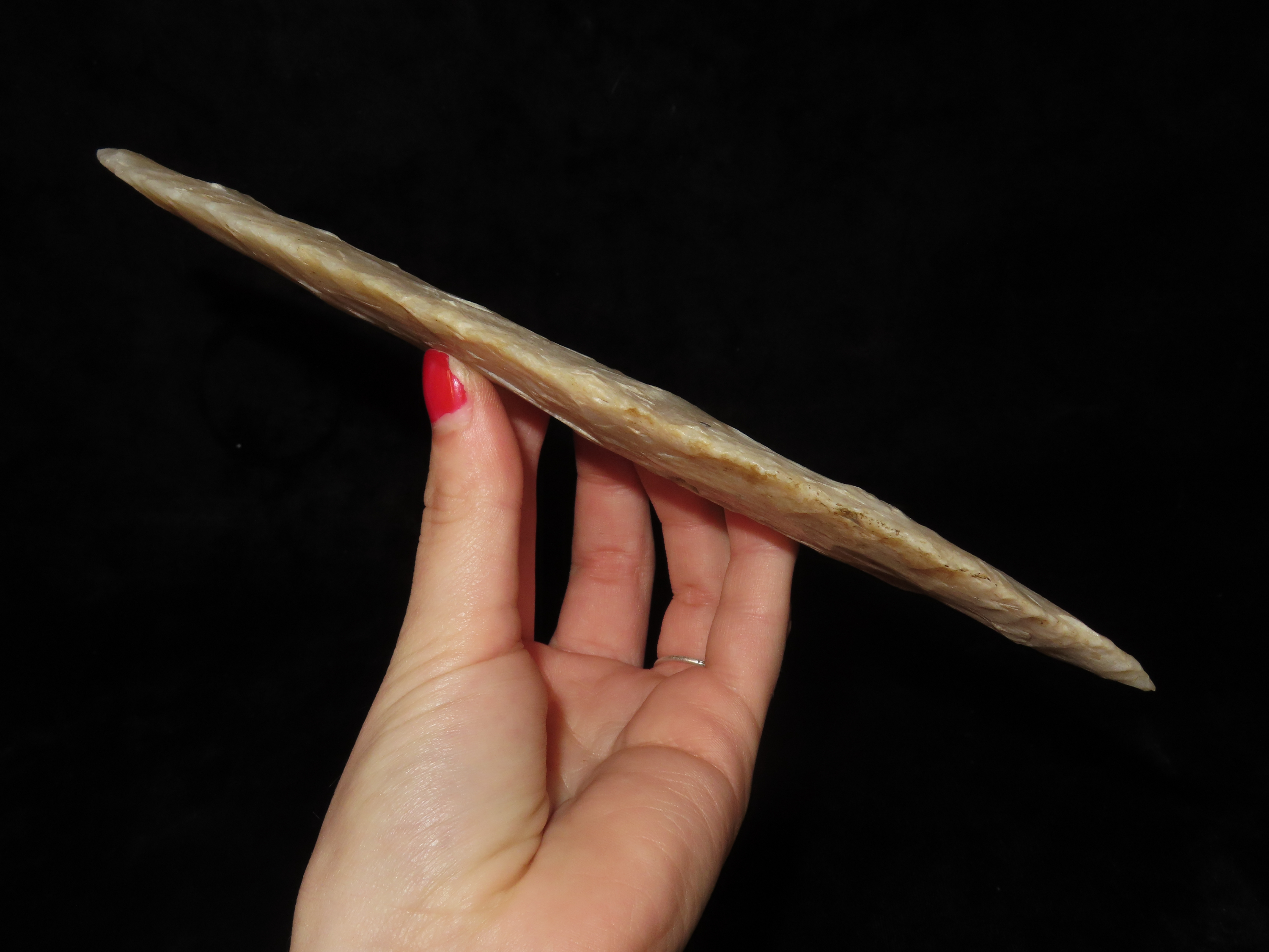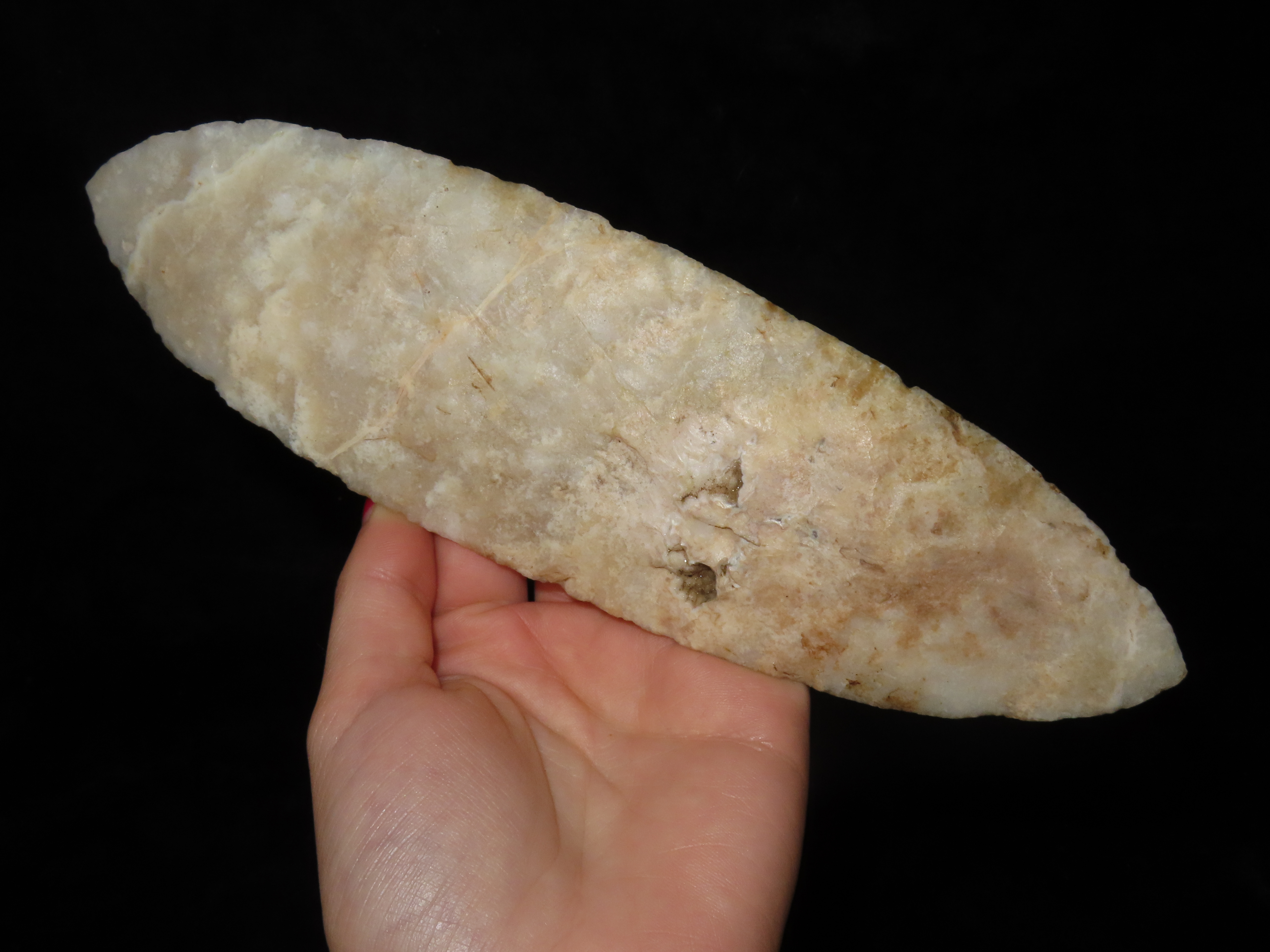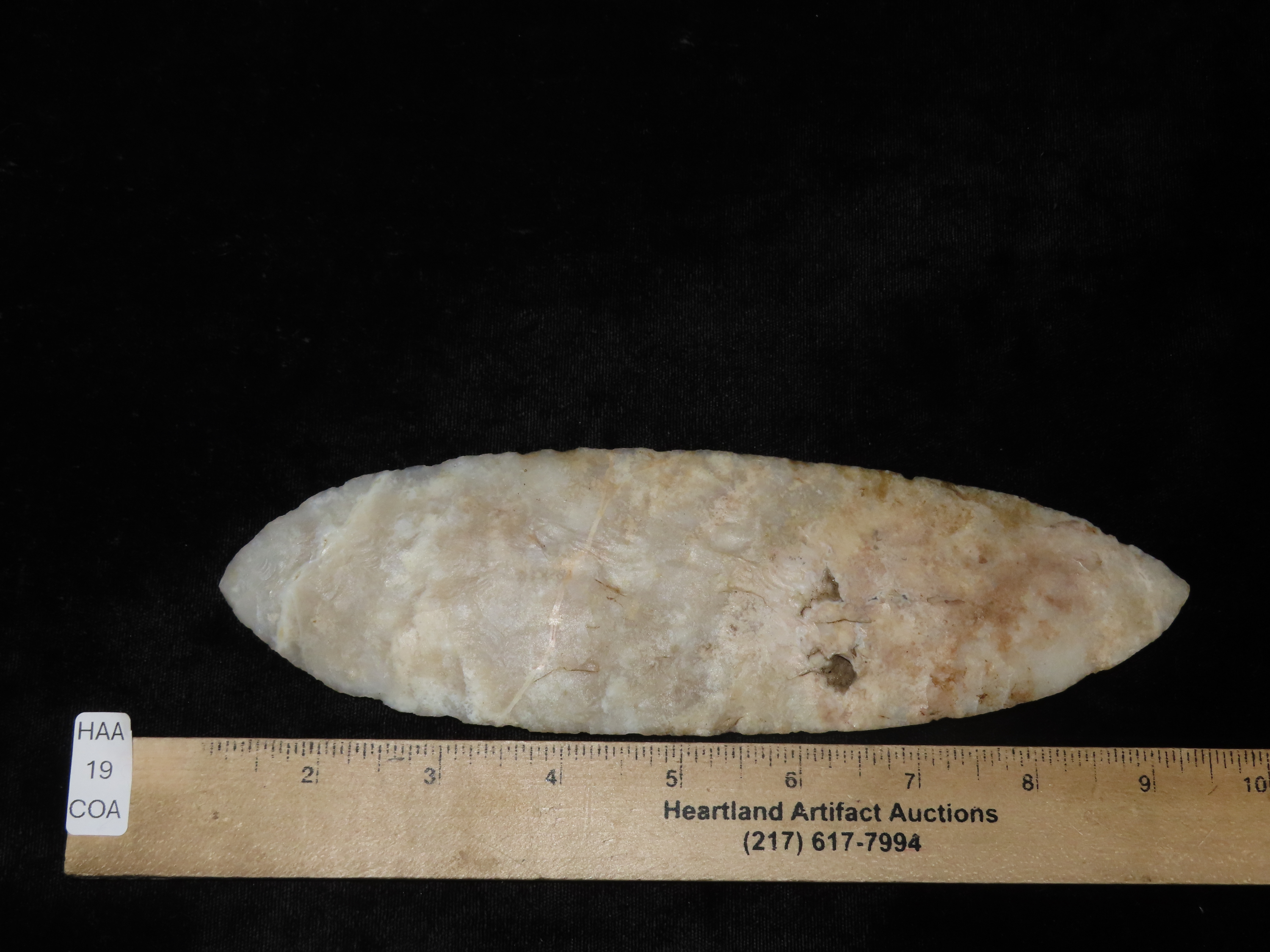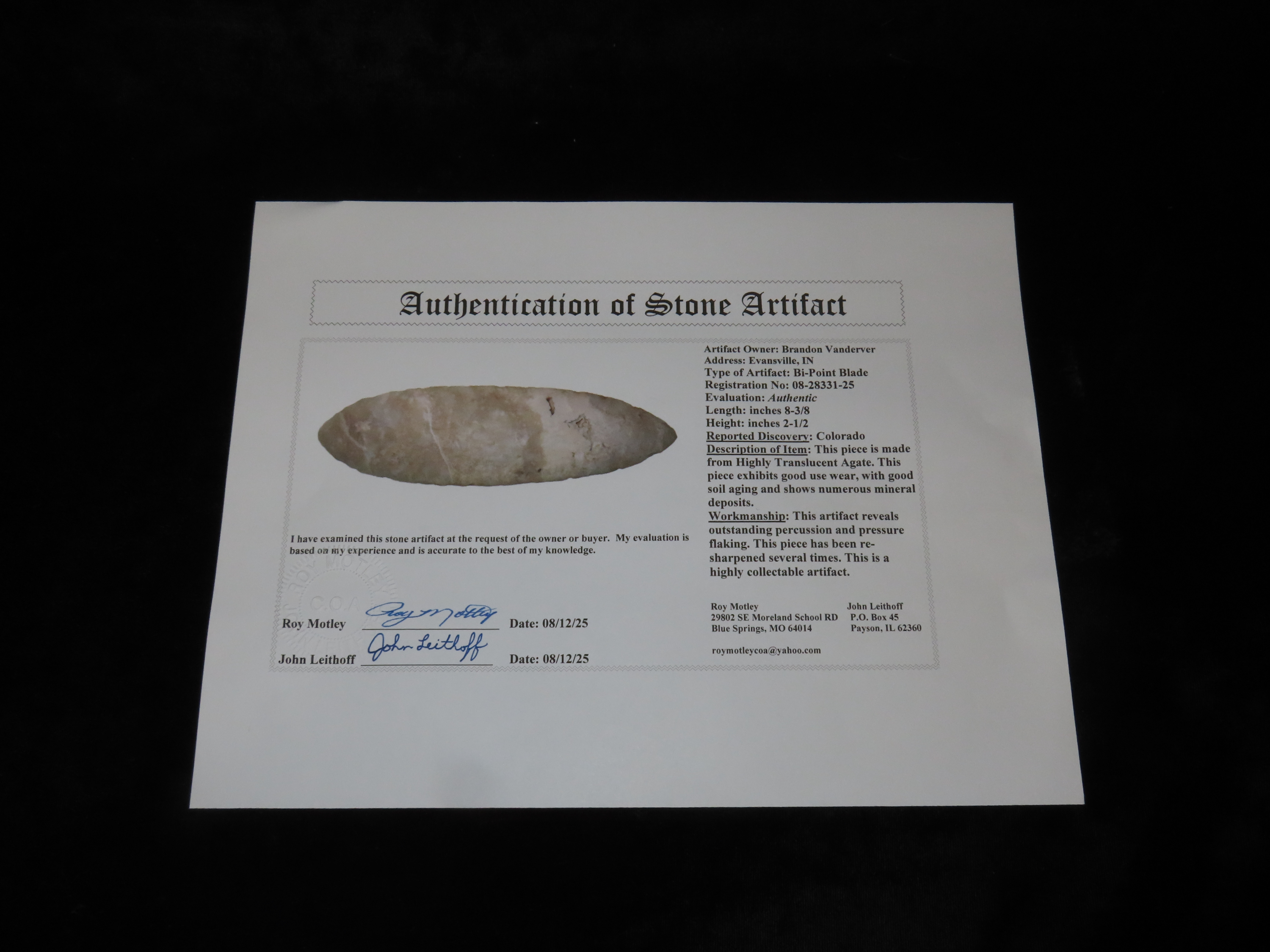 Exceptional 8 3/8″ Translucent Agate Bi-Point Blade, Colorado, Motley COA. Amazing Large Knife made from a well Patinated & nicely Colored Agate, Highly Translucent. Very well faked, thin and perfect!