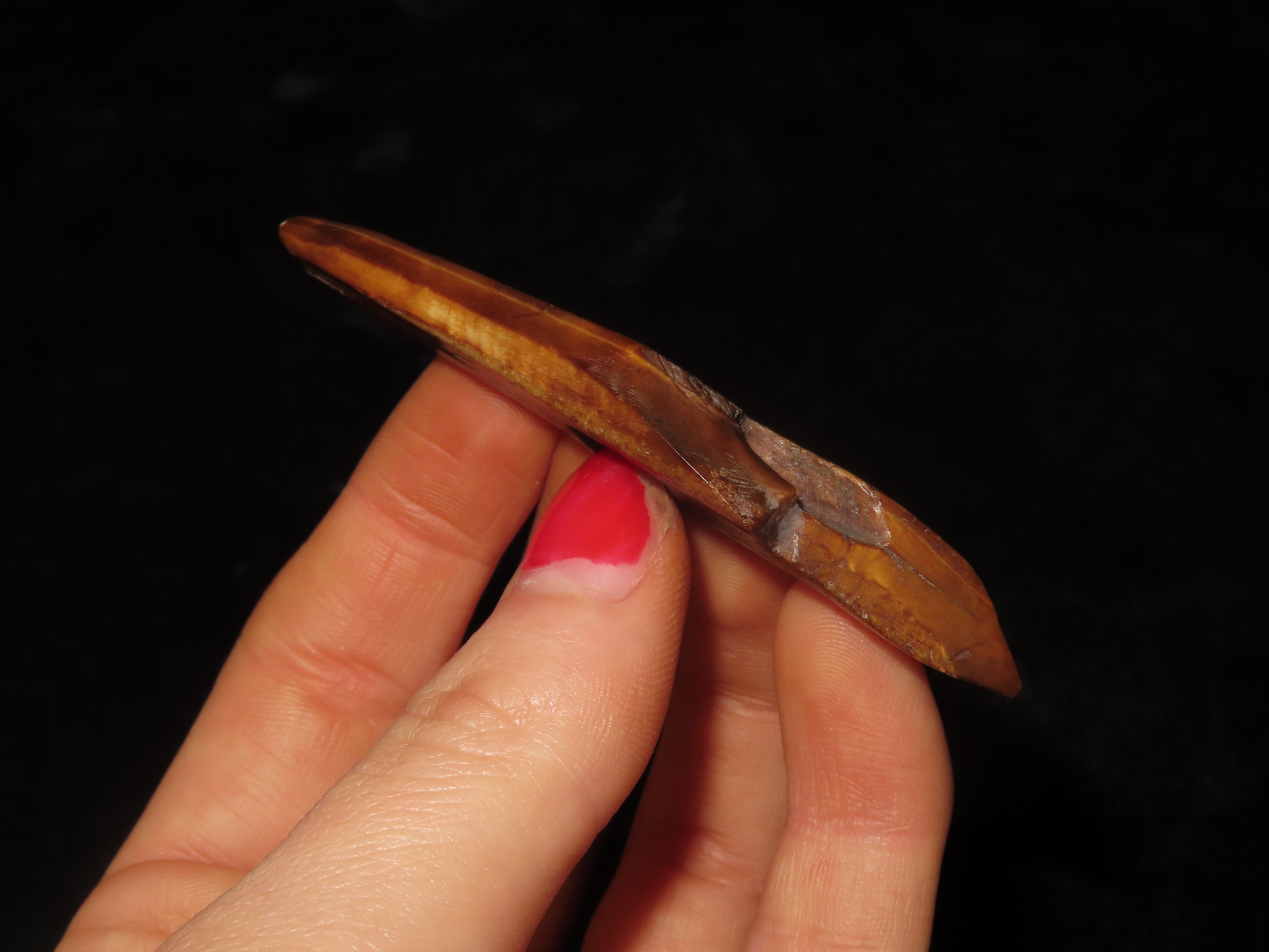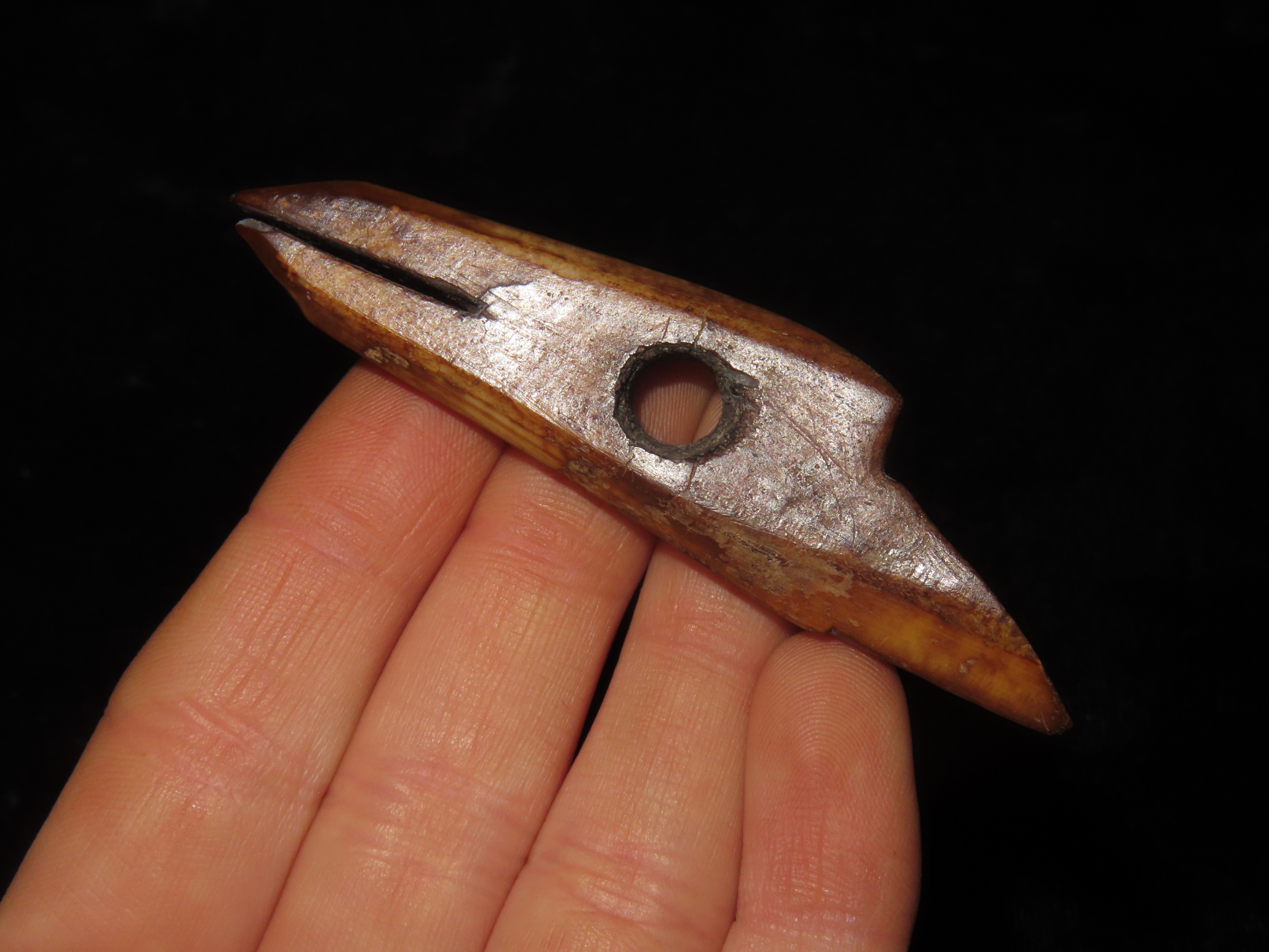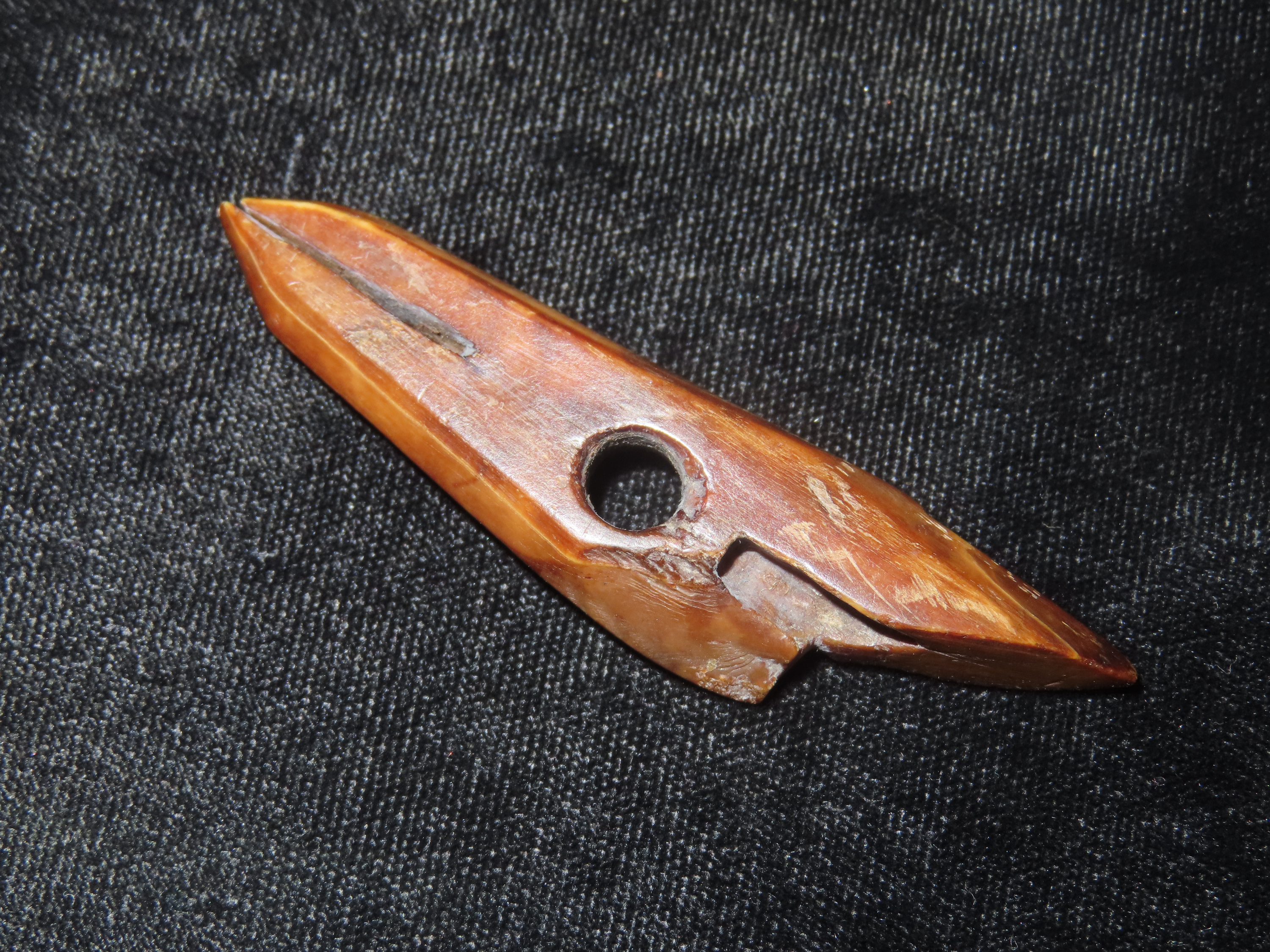 2 7/8″ Alaskan Harpoon Toggle. Very nice example, Highly Polished with amazing naturally aged color & patina. Made from Fossilized bone.