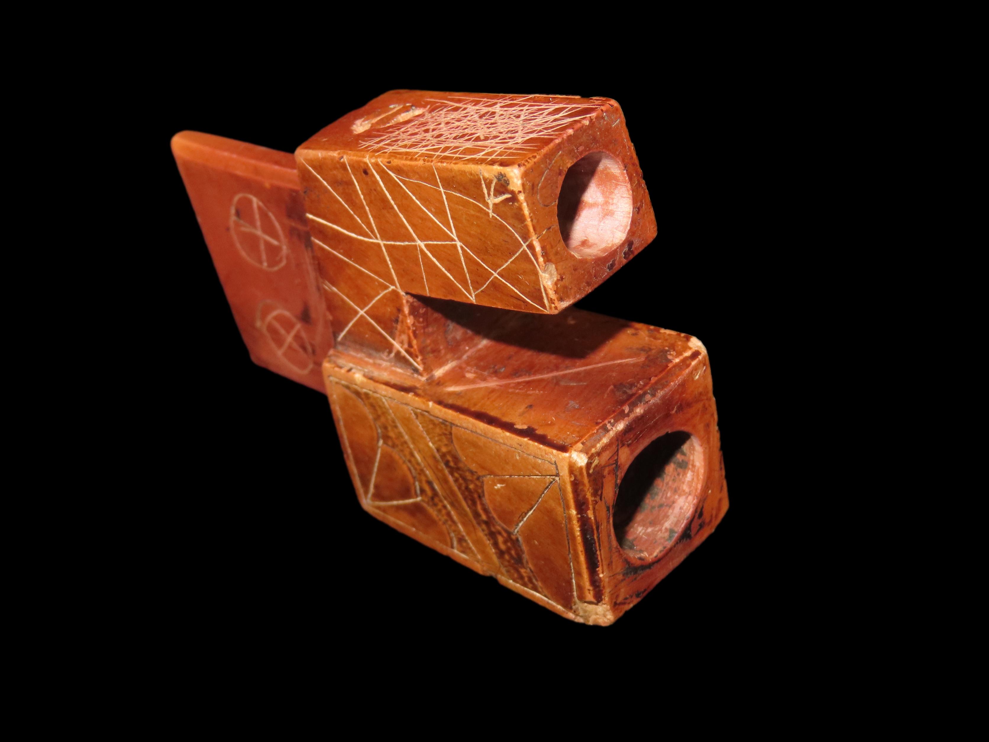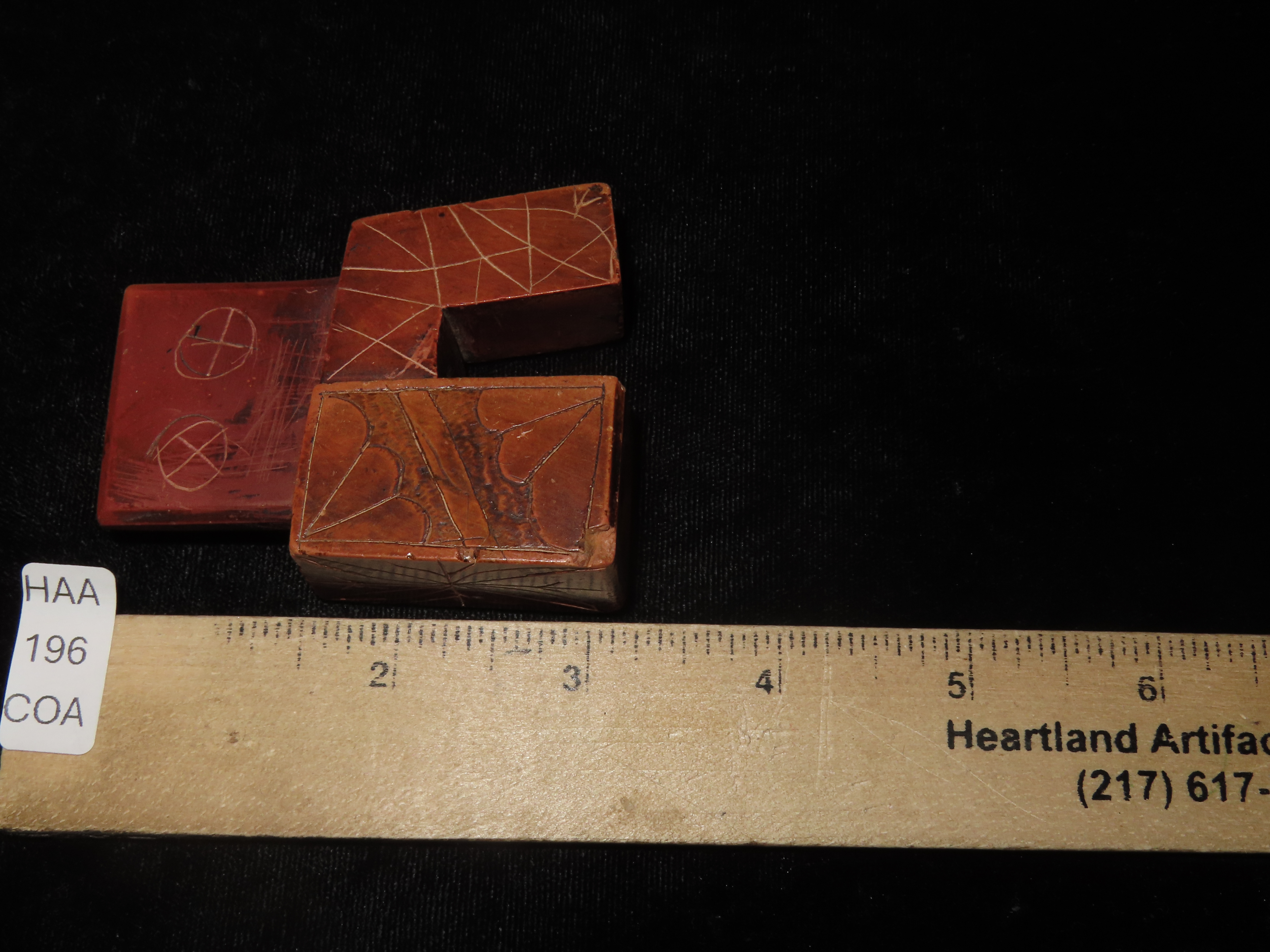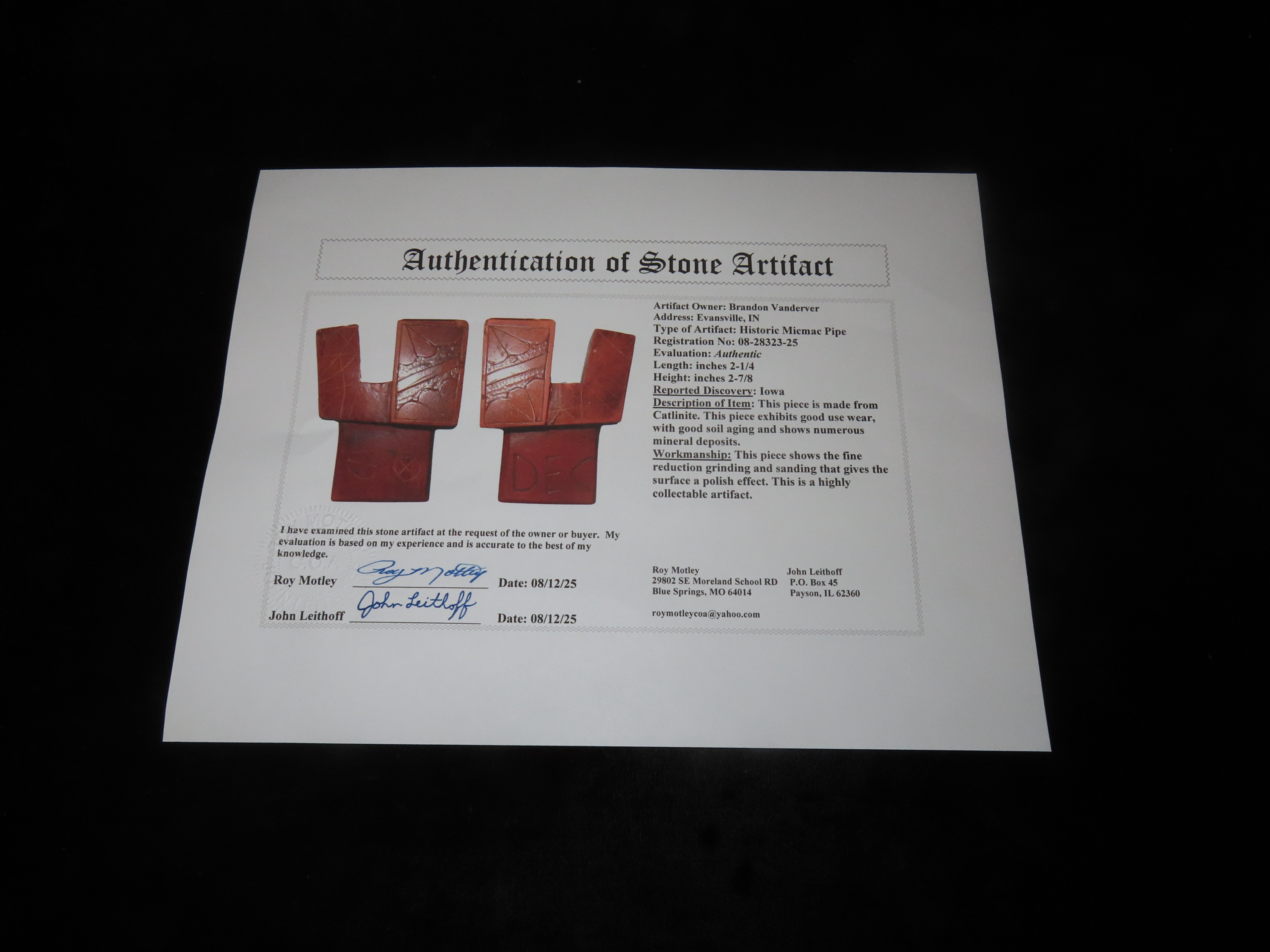 2 7/8″ Heavily Engraved Catlinite micmac Pipe, Iowa. Motley COA. Nice Historic Pipe from the late 1800’s to early 1900’s. Nicely engraved all over with great use wear and no brainer patina. Nicely shaped and wellpolished.