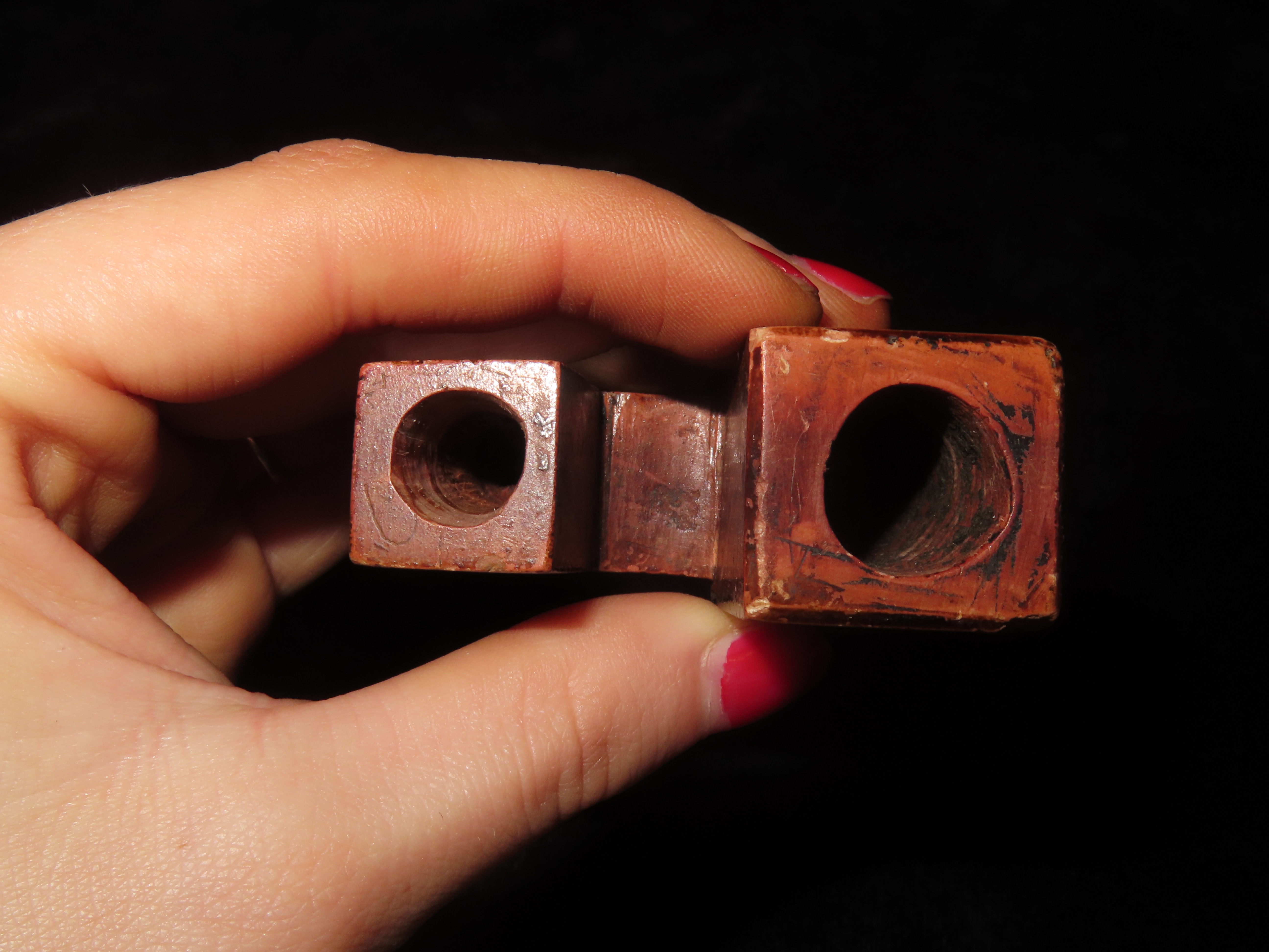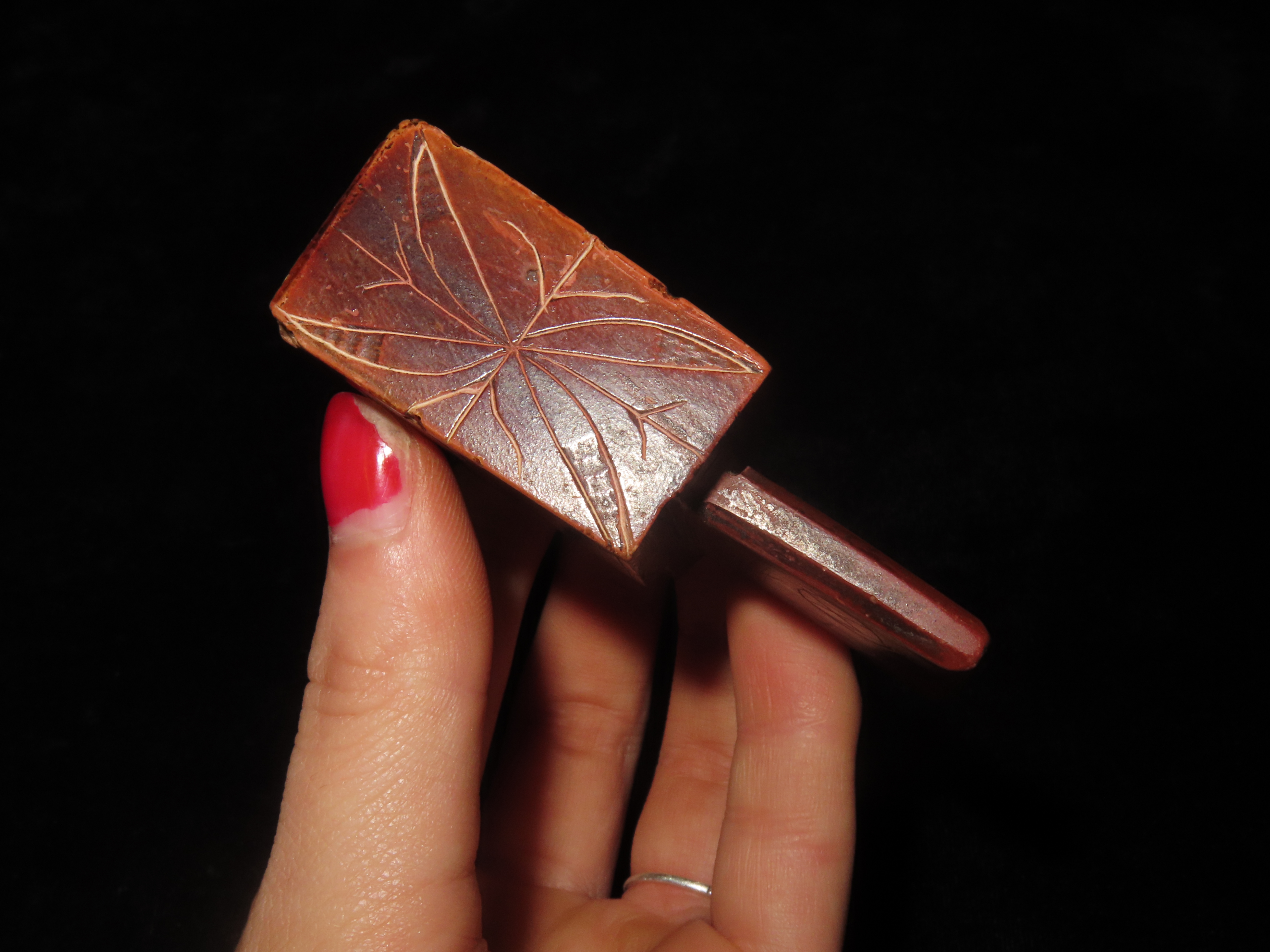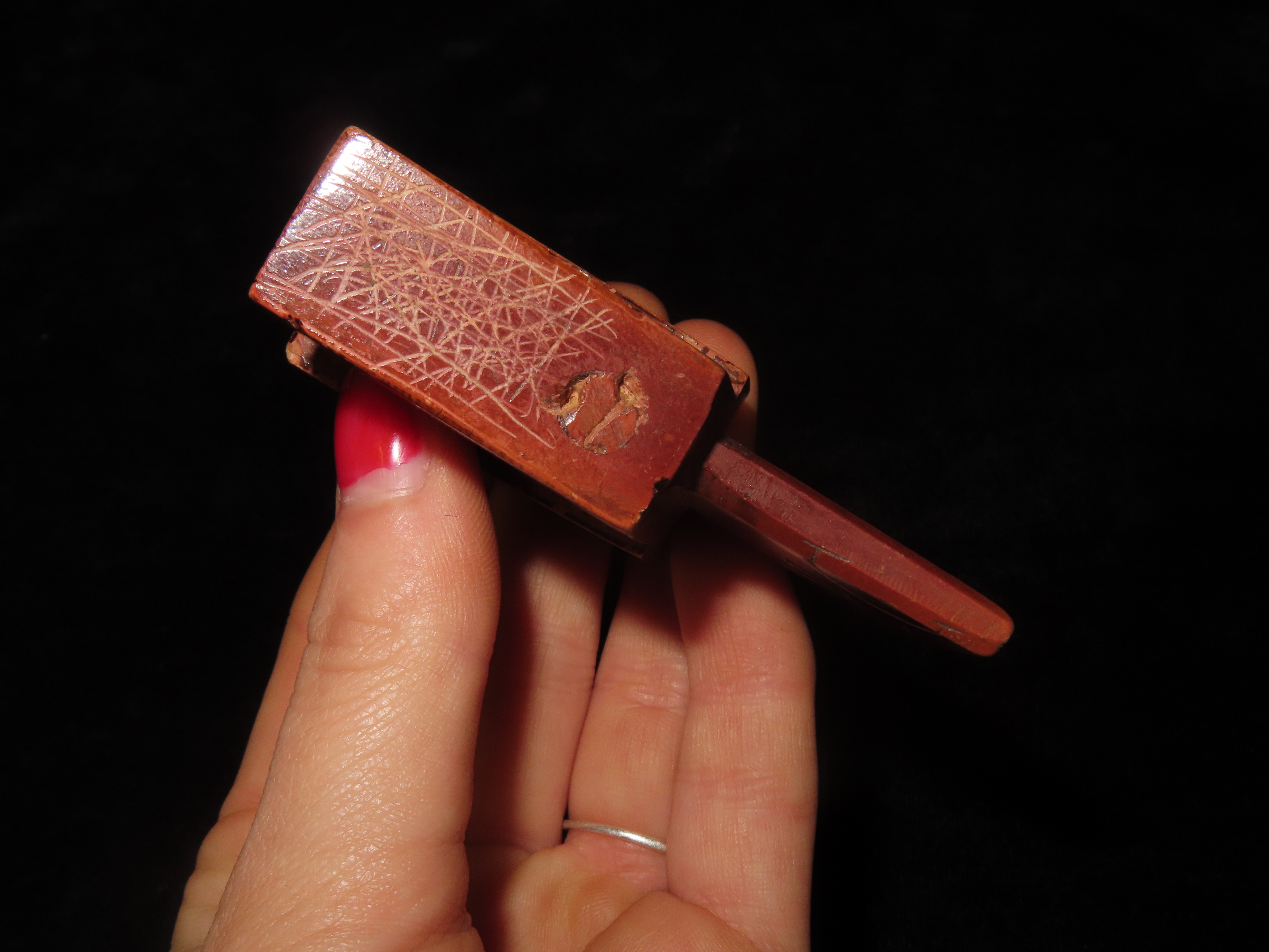 2 7/8″ Heavily Engraved Catlinite micmac Pipe, Iowa. Motley COA. Nice Historic Pipe from the late 1800’s to early 1900’s. Nicely engraved all over with great use wear and no brainer patina. Nicely shaped and wellpolished.