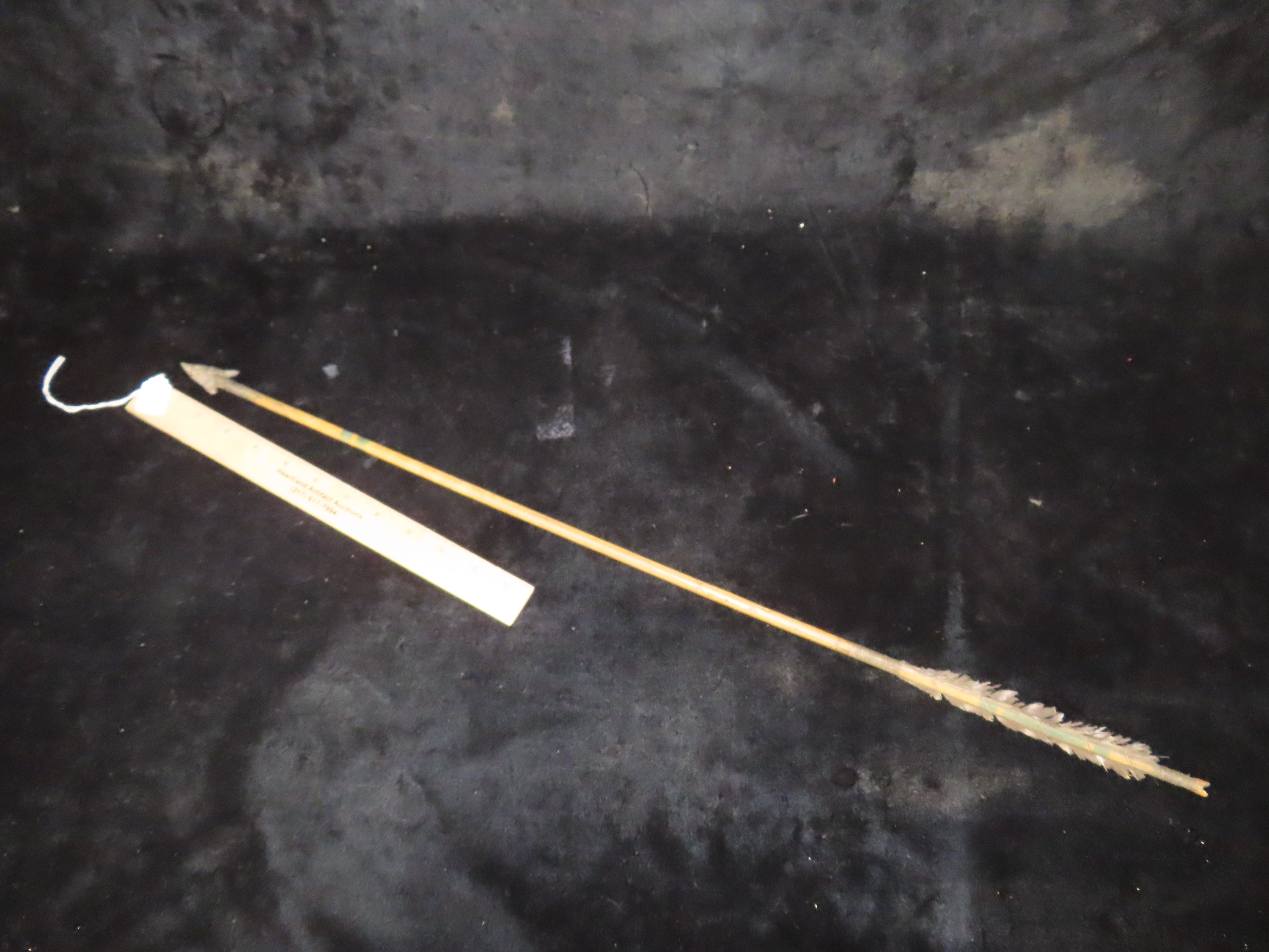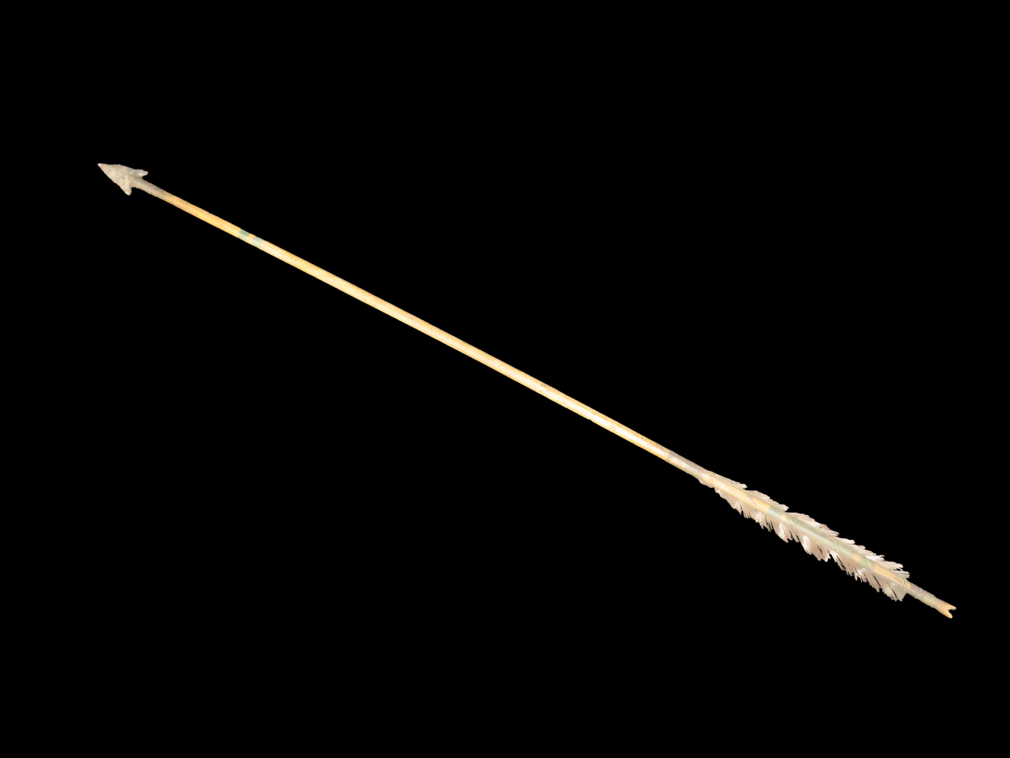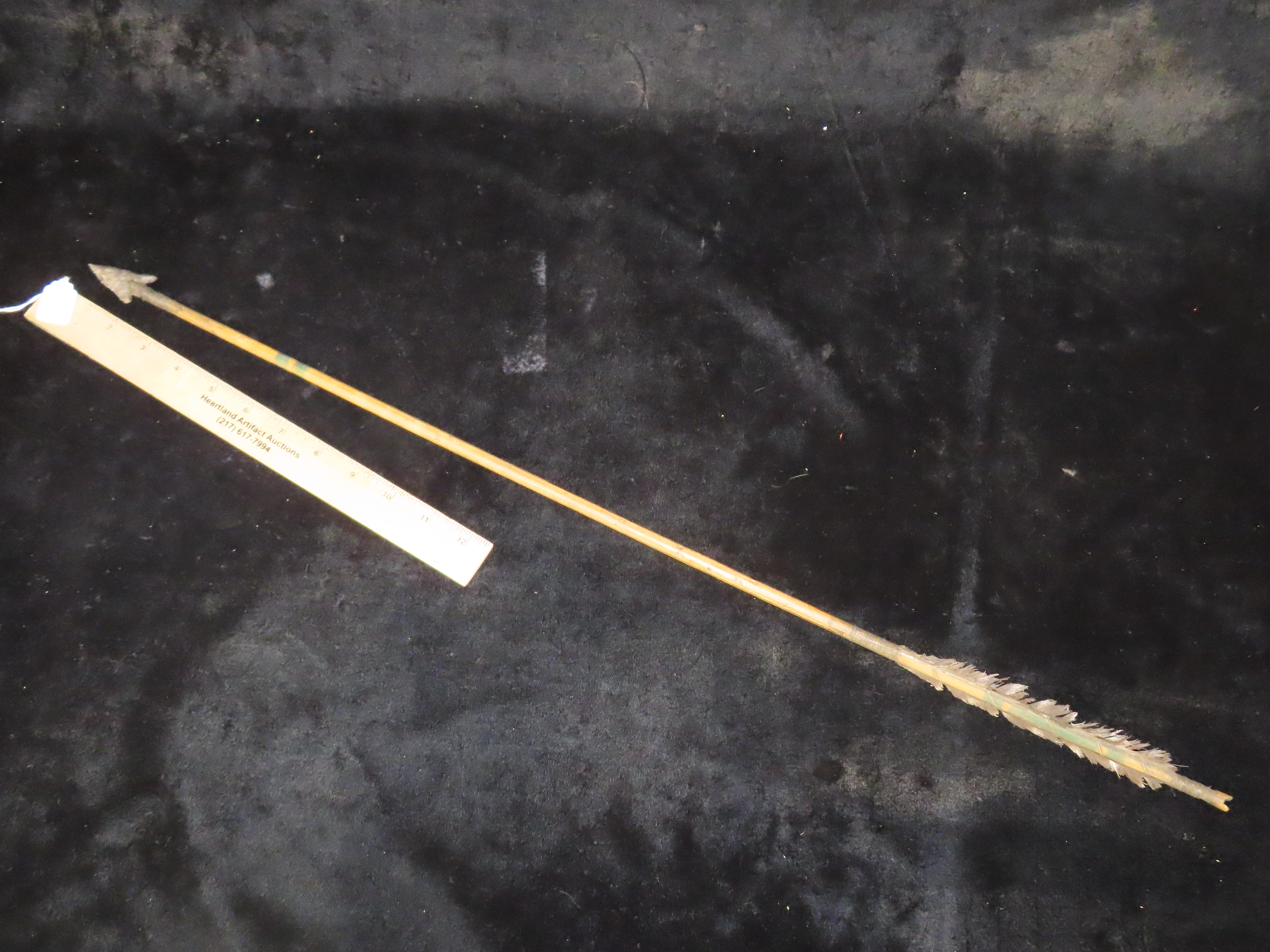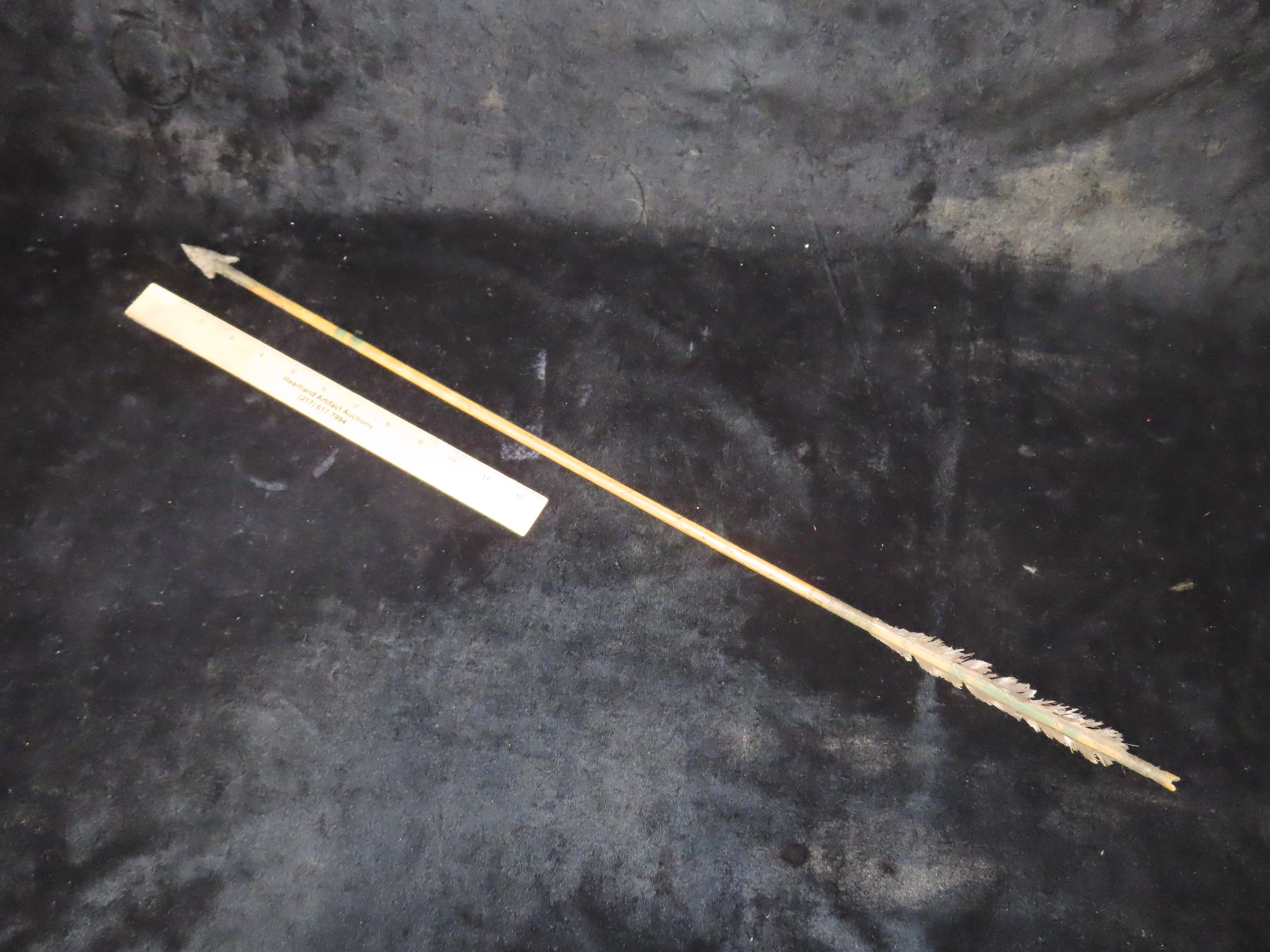 Exceptional 28 3/8″ All Original Historic Plains Indian Arrow with Original Hafted Arrowhead, Original Feathers & Sinew, Fully Intact Example. Amazing piece of American History. Museum Grade example.