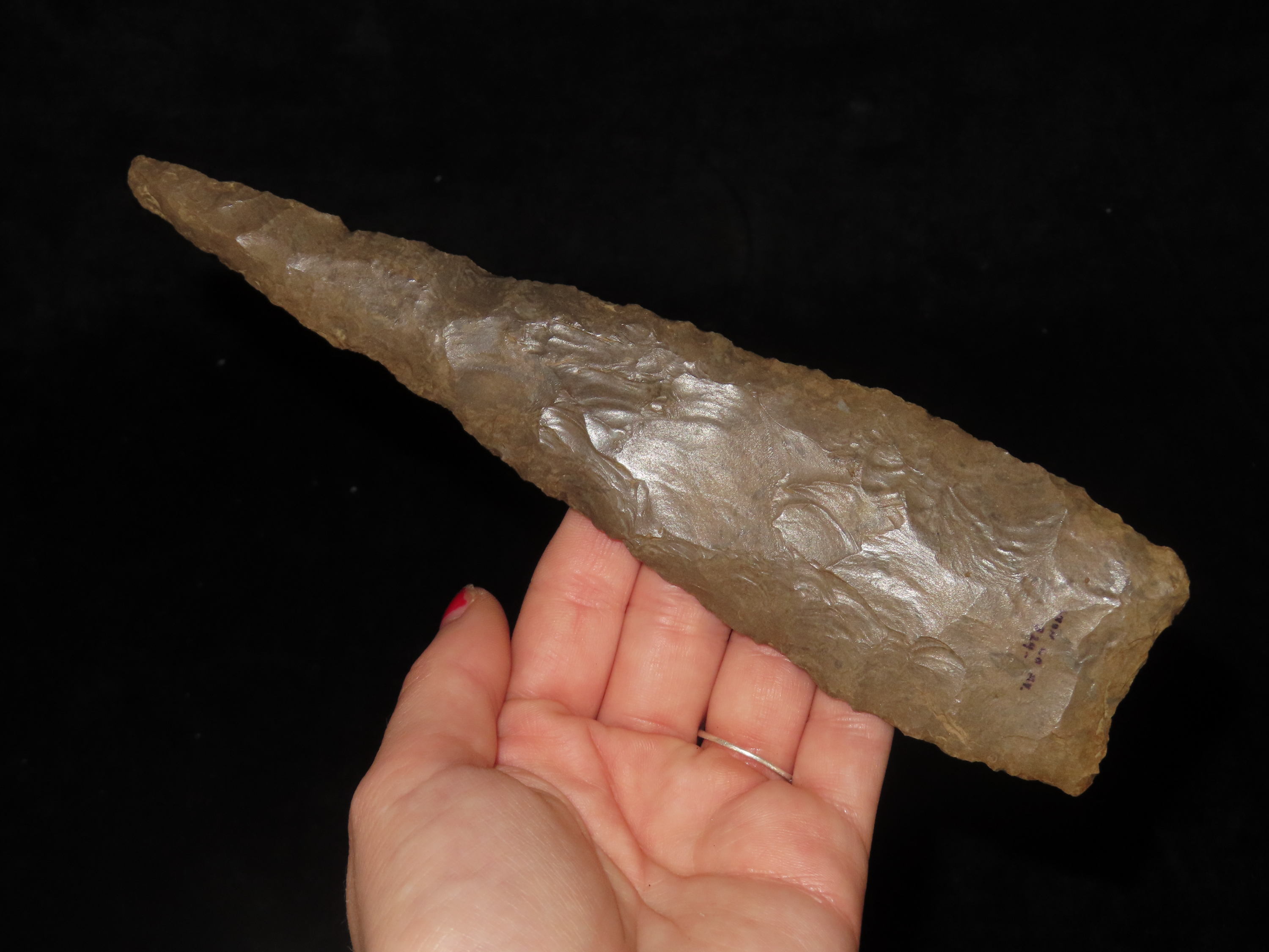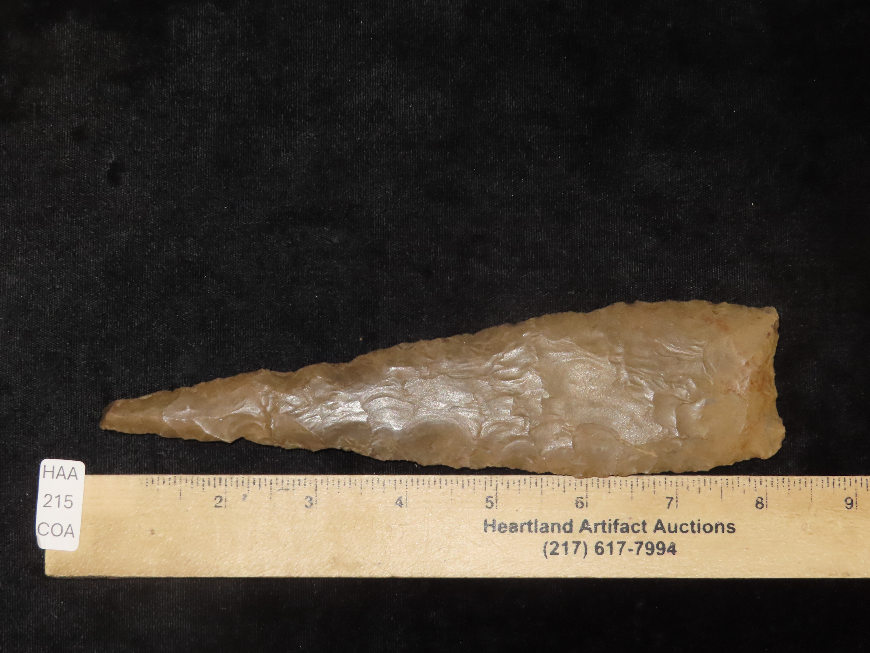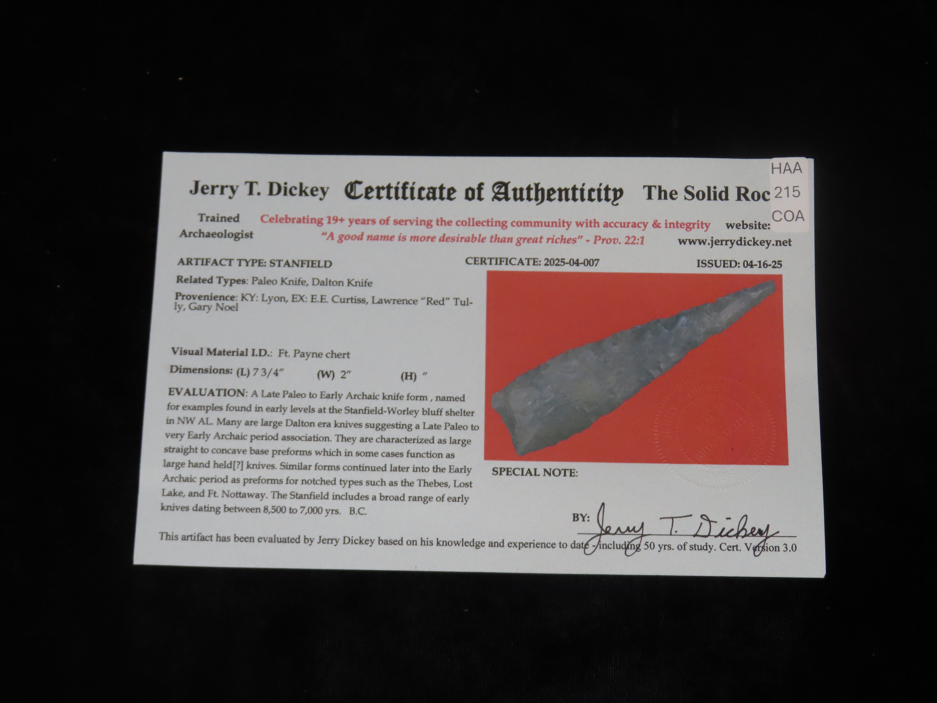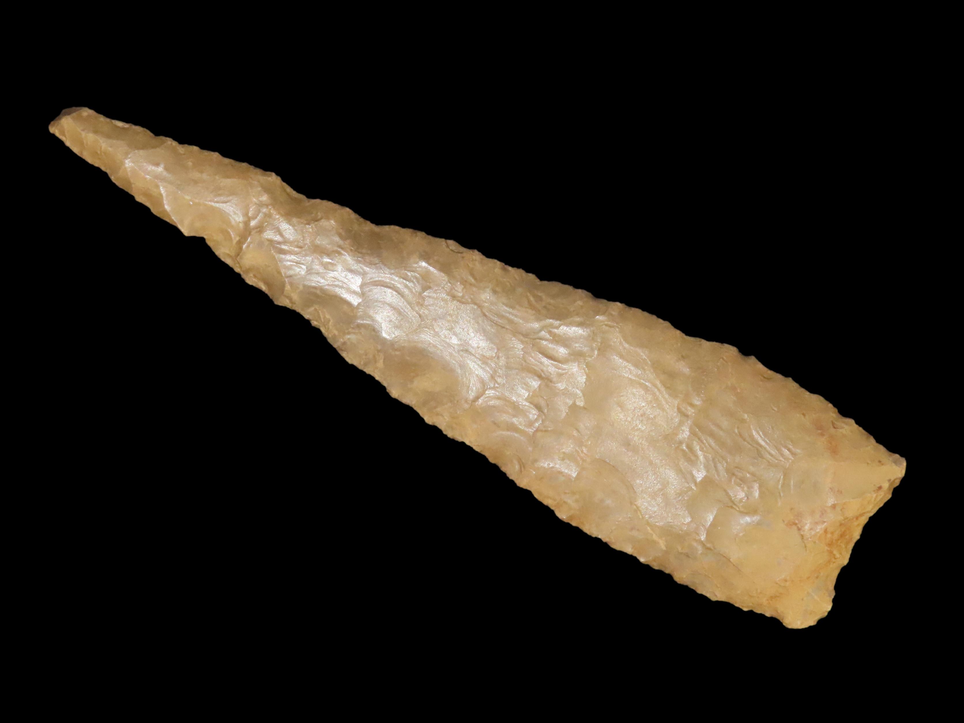 Massive 7 3/4″ Stanfield Dalton Knife, Lyon Co. Kentucky. Dickey COA. Ex E.E. Curtis, Red Tully, Gary Noel. Huge piece of flint, thin and well flaked with heavy patination.