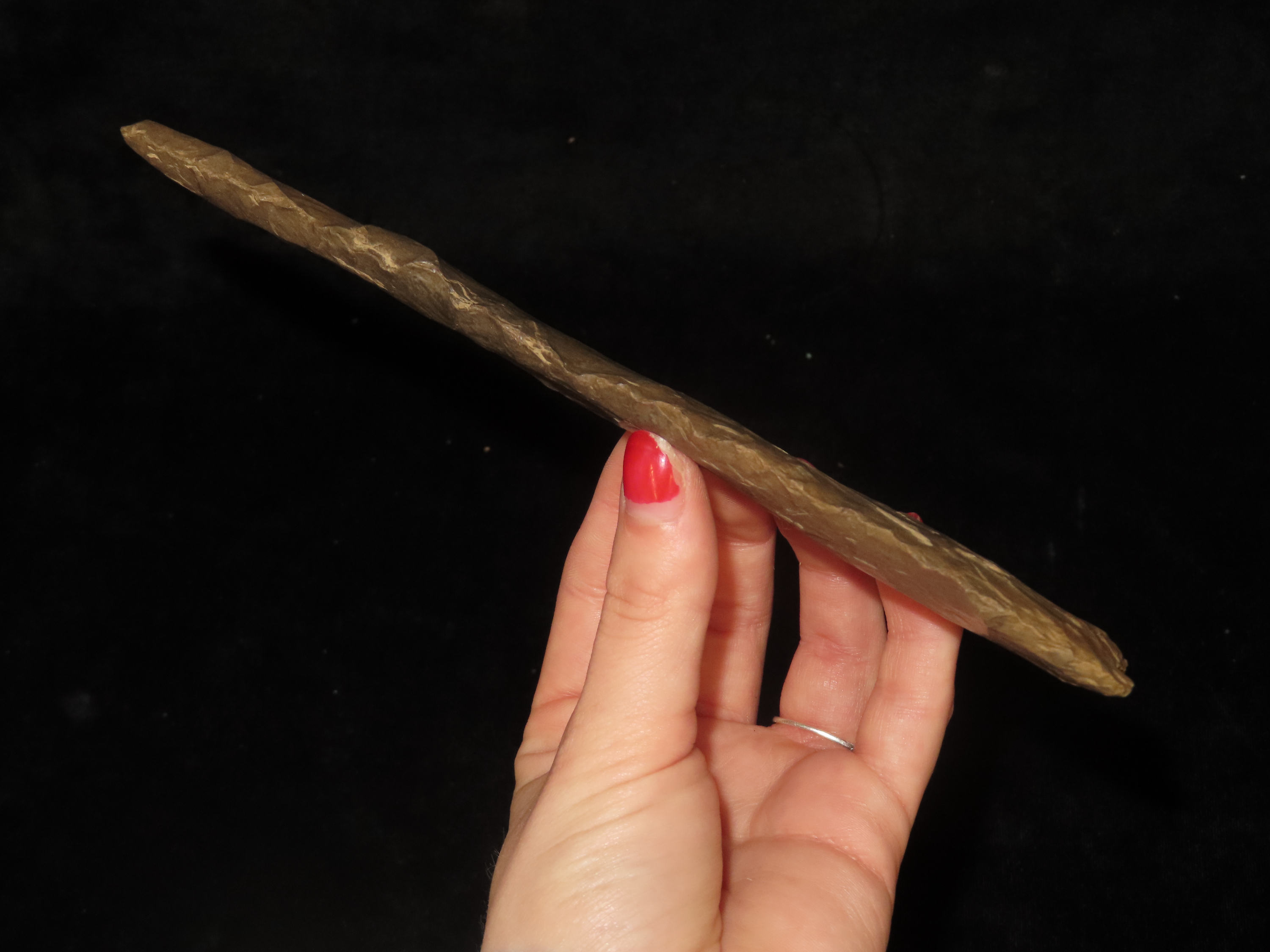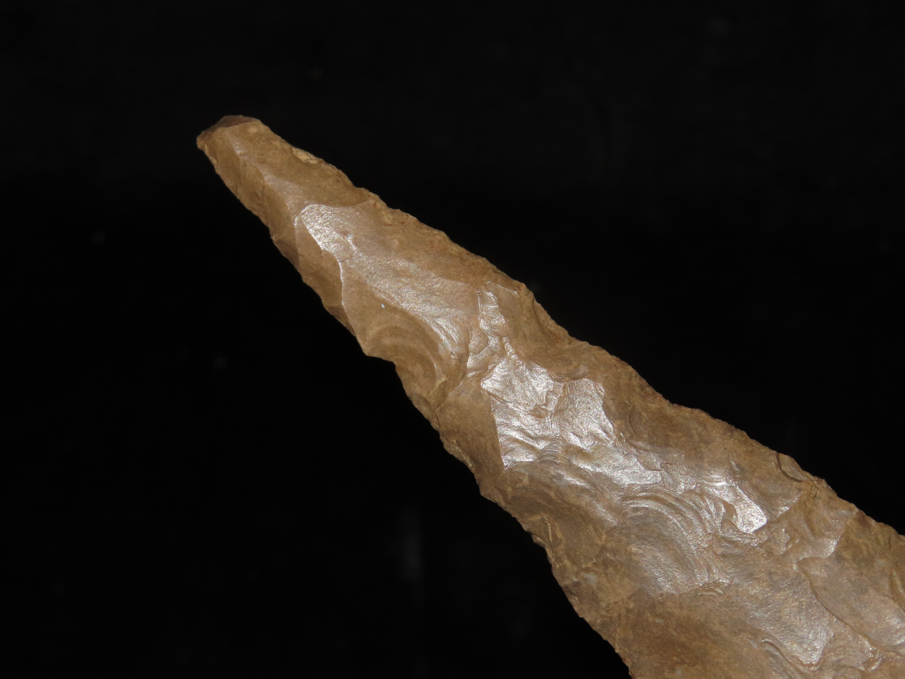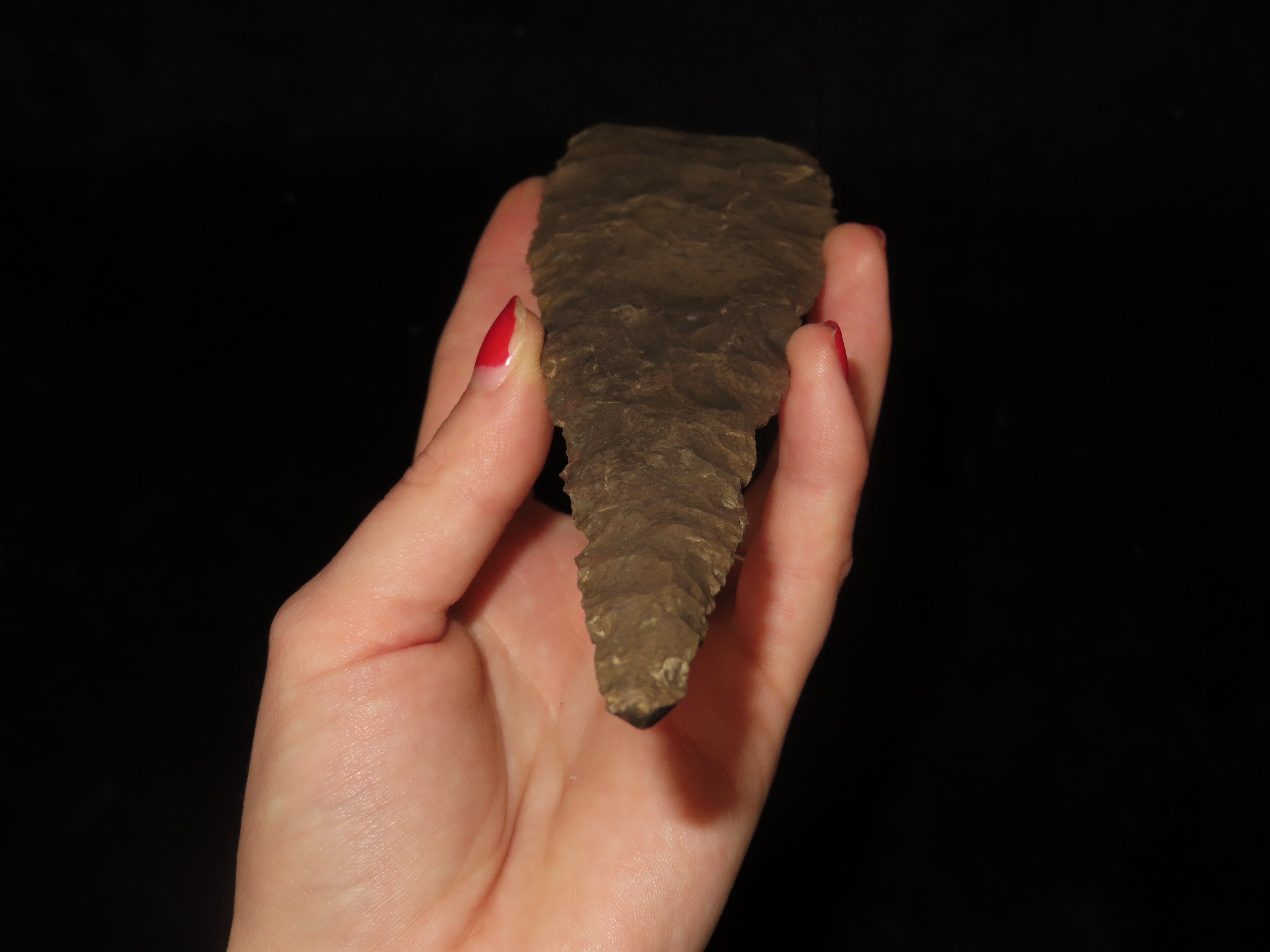 Massive 7 3/4″ Stanfield Dalton Knife, Lyon Co. Kentucky. Dickey COA. Ex E.E. Curtis, Red Tully, Gary Noel. Huge piece of flint, thin and well flaked with heavy patination.