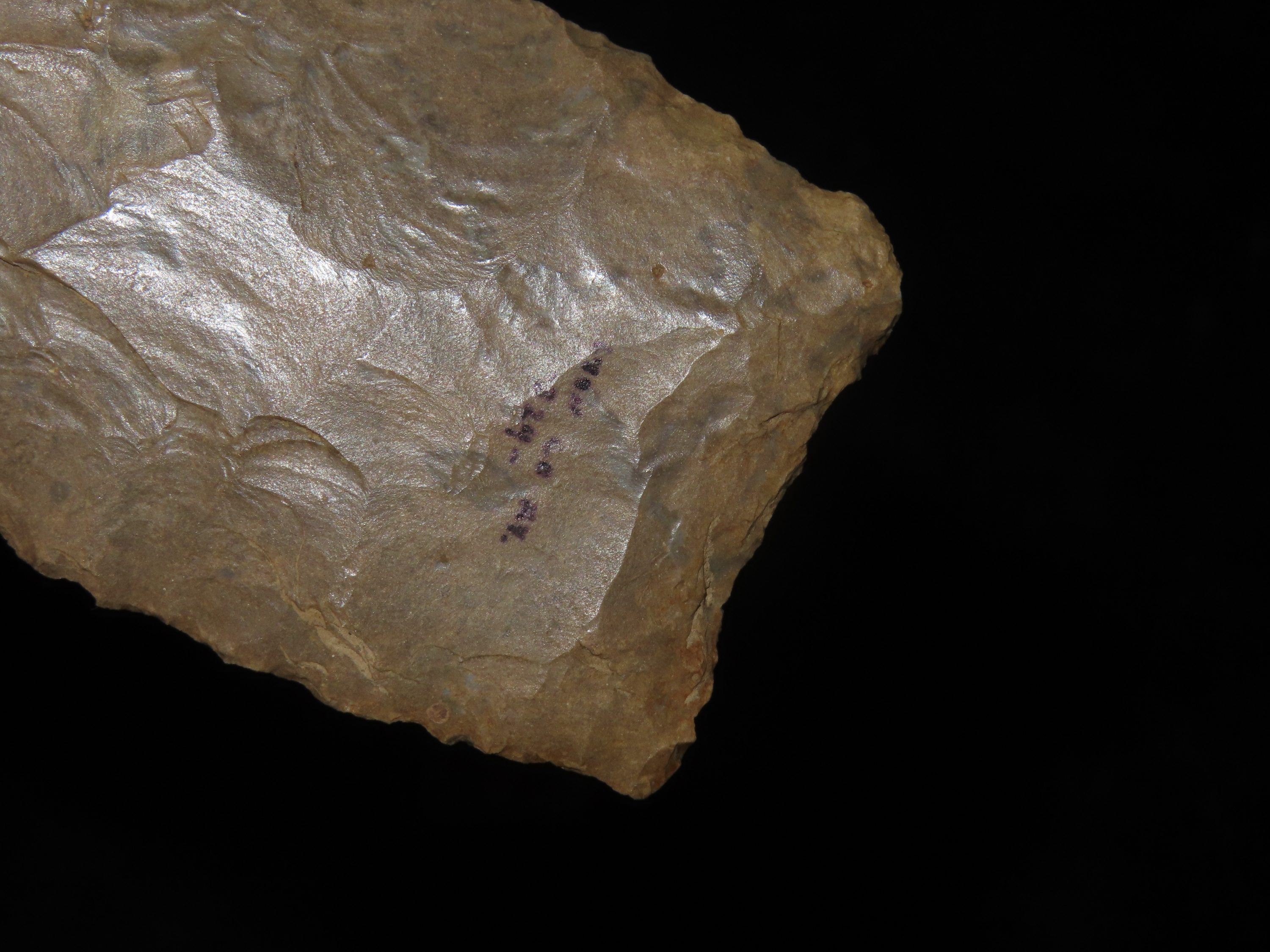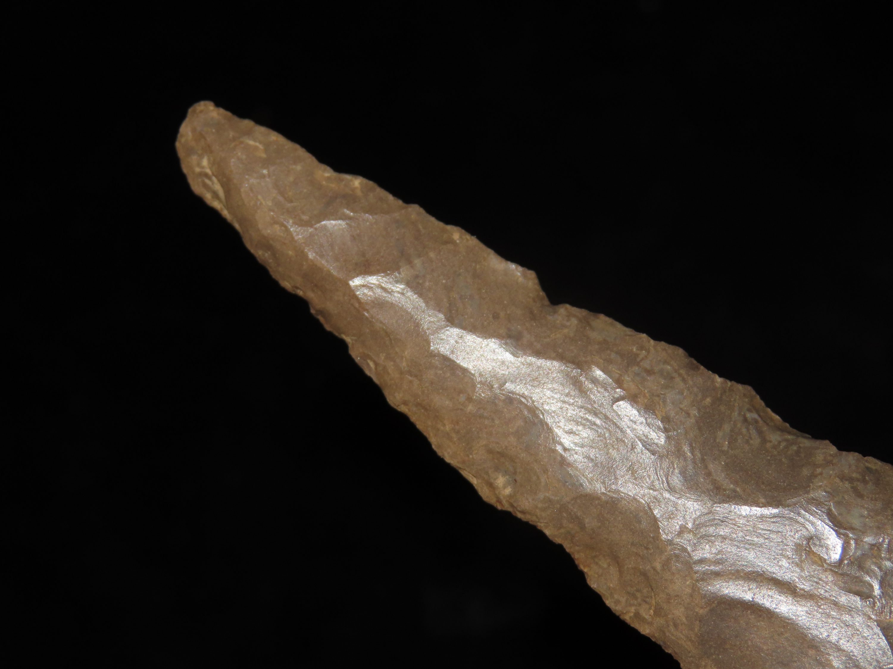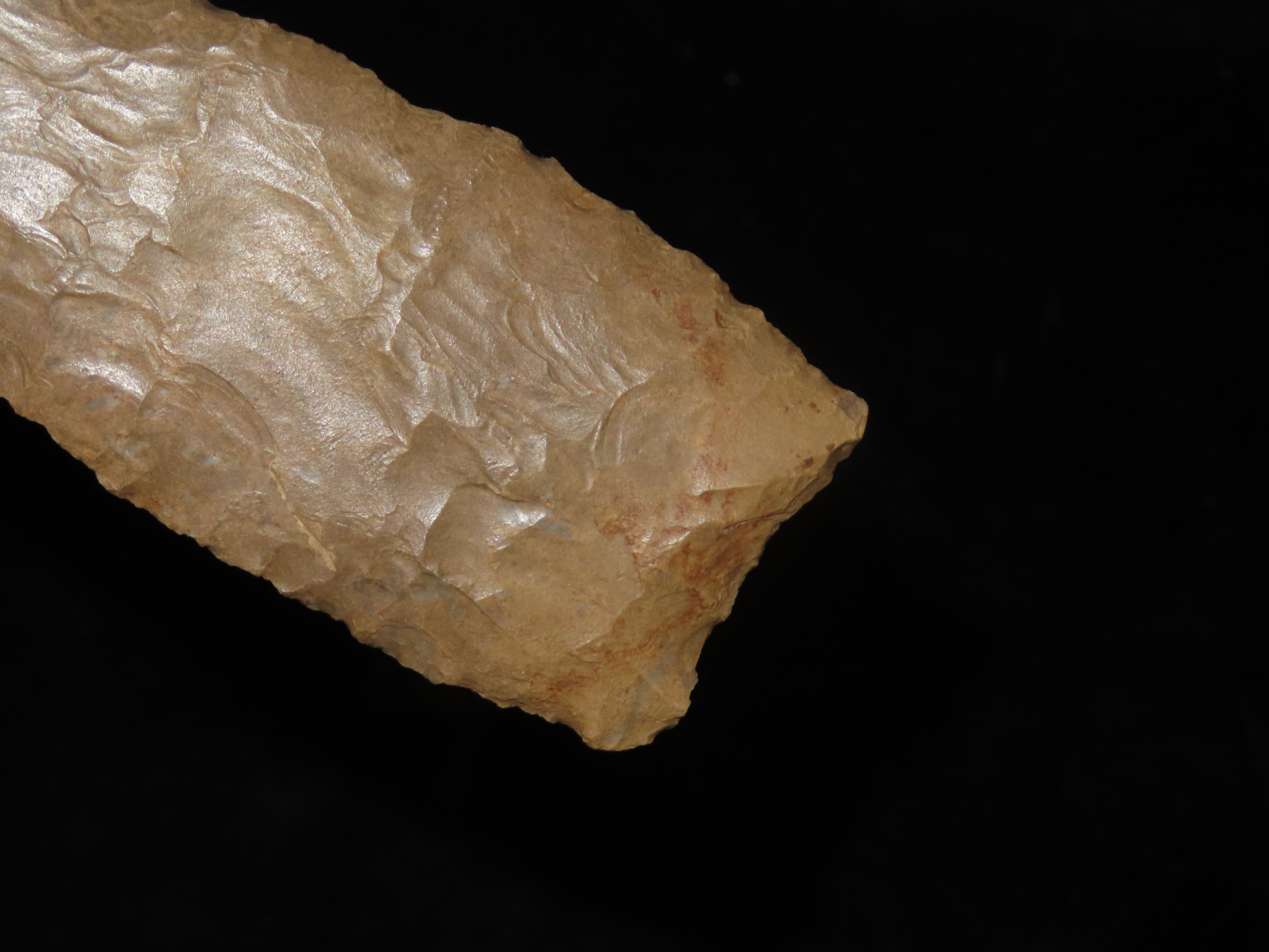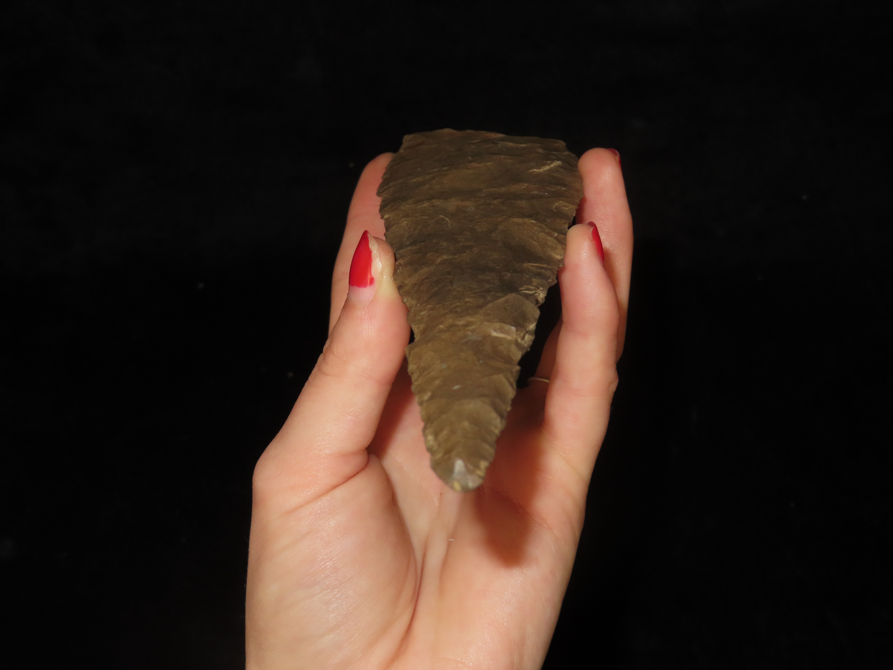 Massive 7 3/4″ Stanfield Dalton Knife, Lyon Co. Kentucky. Dickey COA. Ex E.E. Curtis, Red Tully, Gary Noel. Huge piece of flint, thin and well flaked with heavy patination.