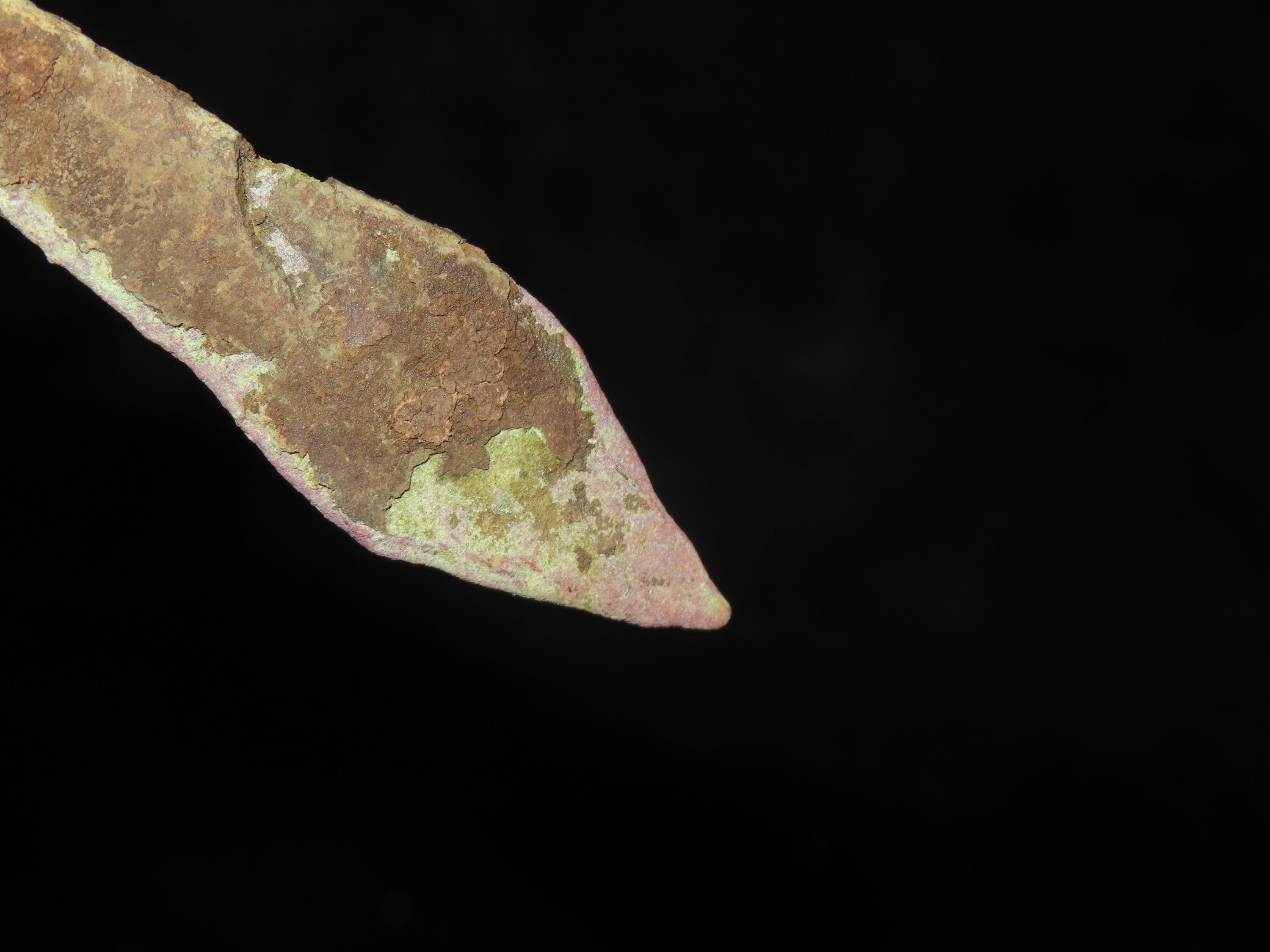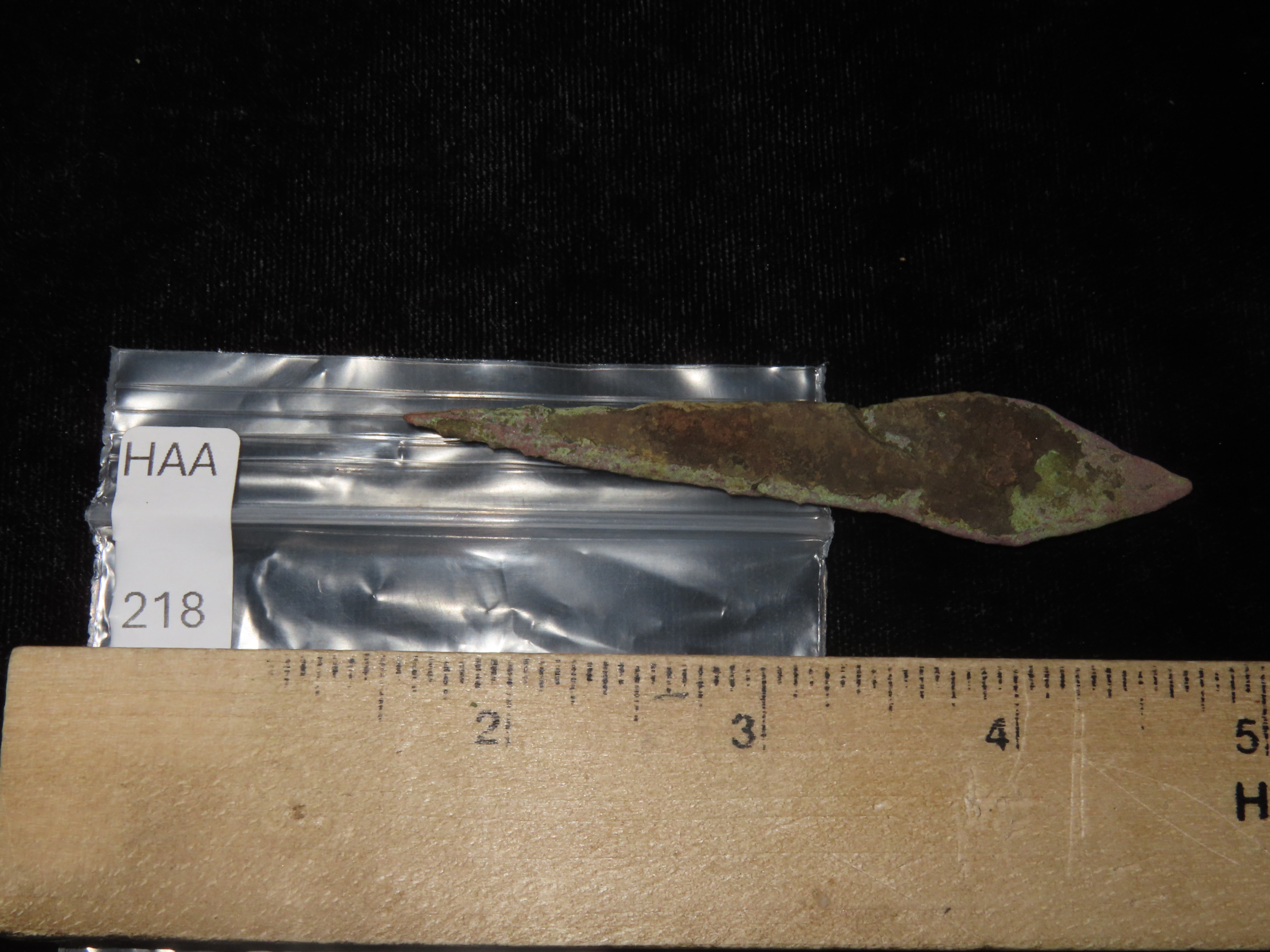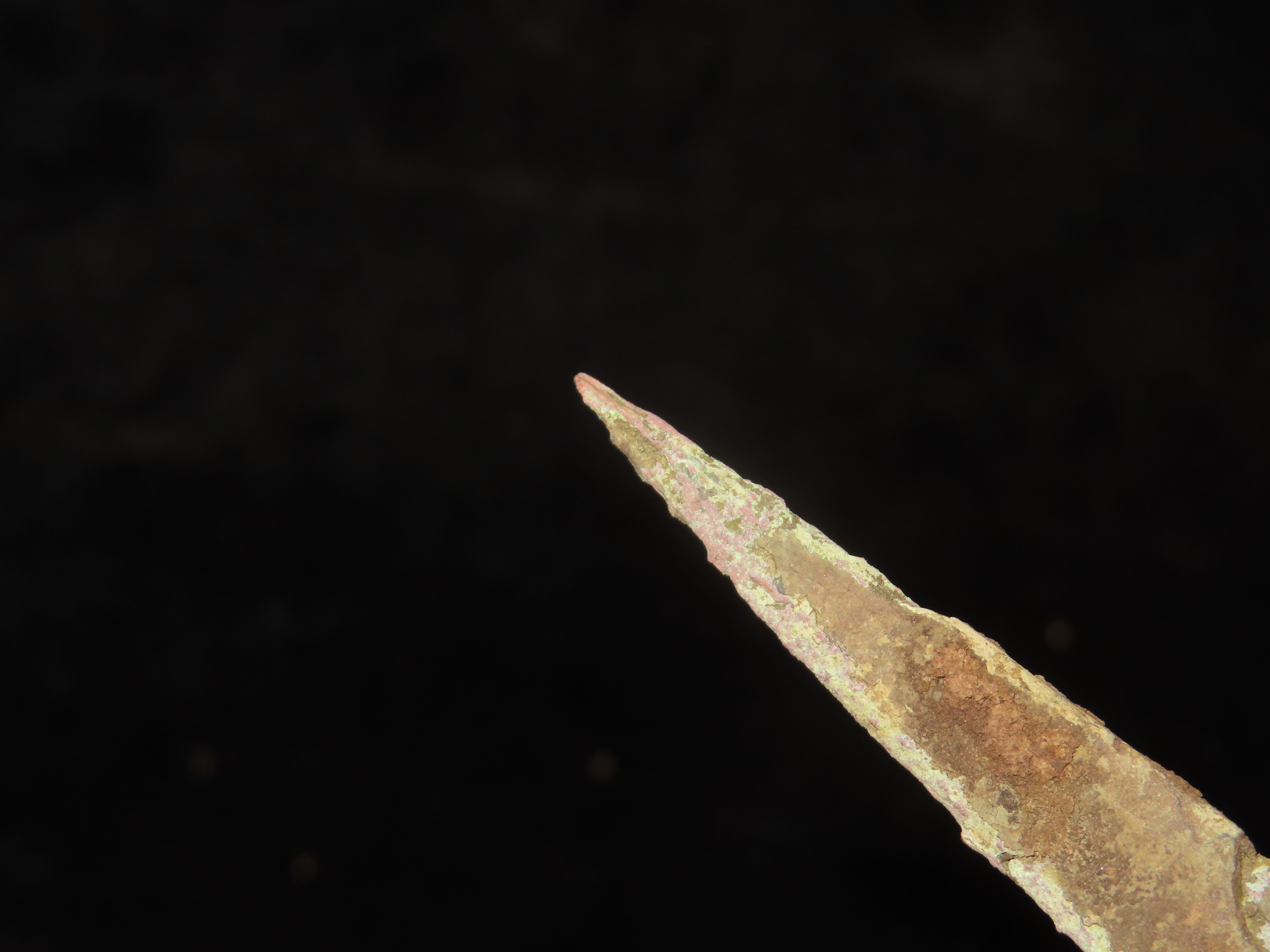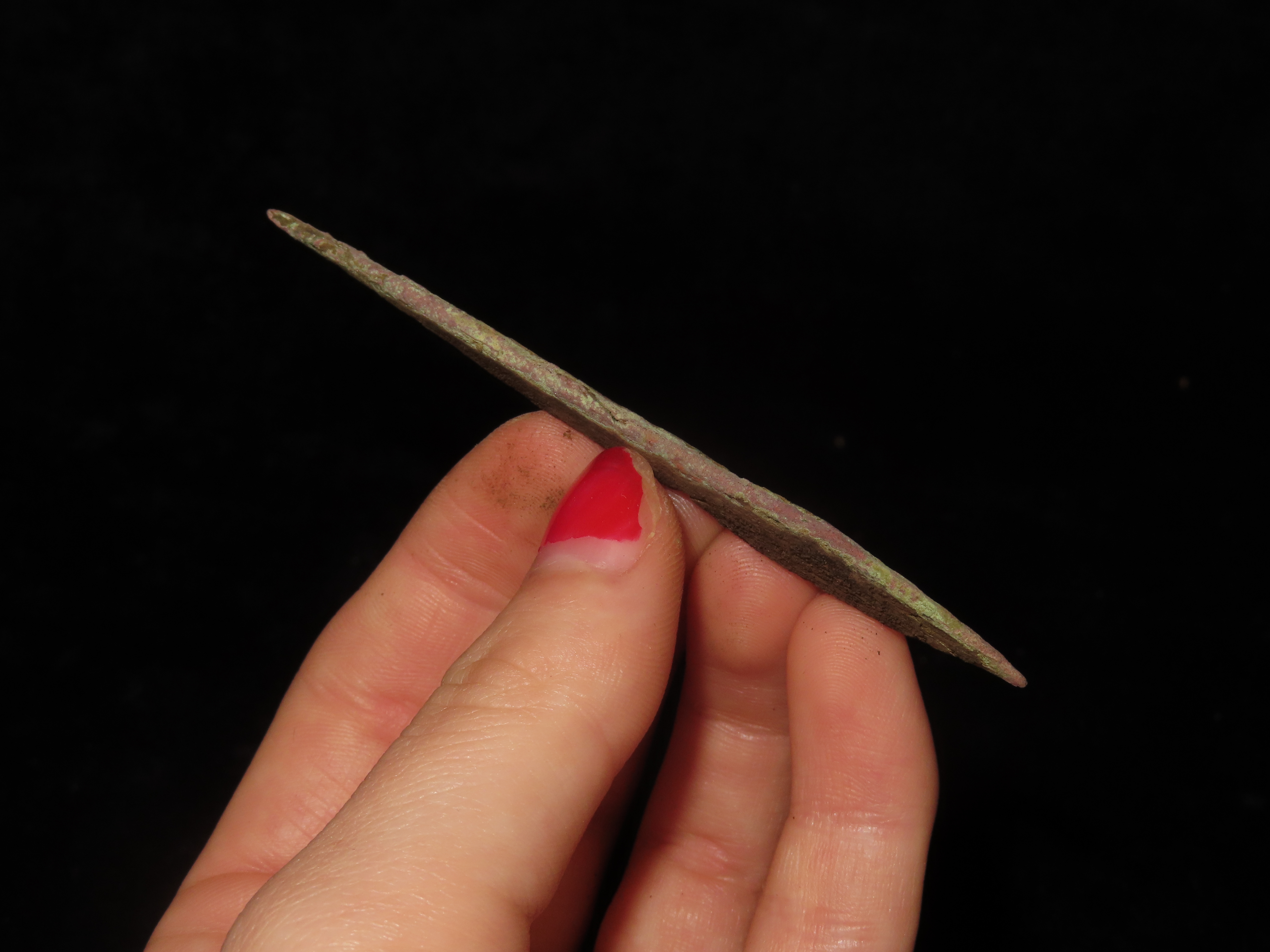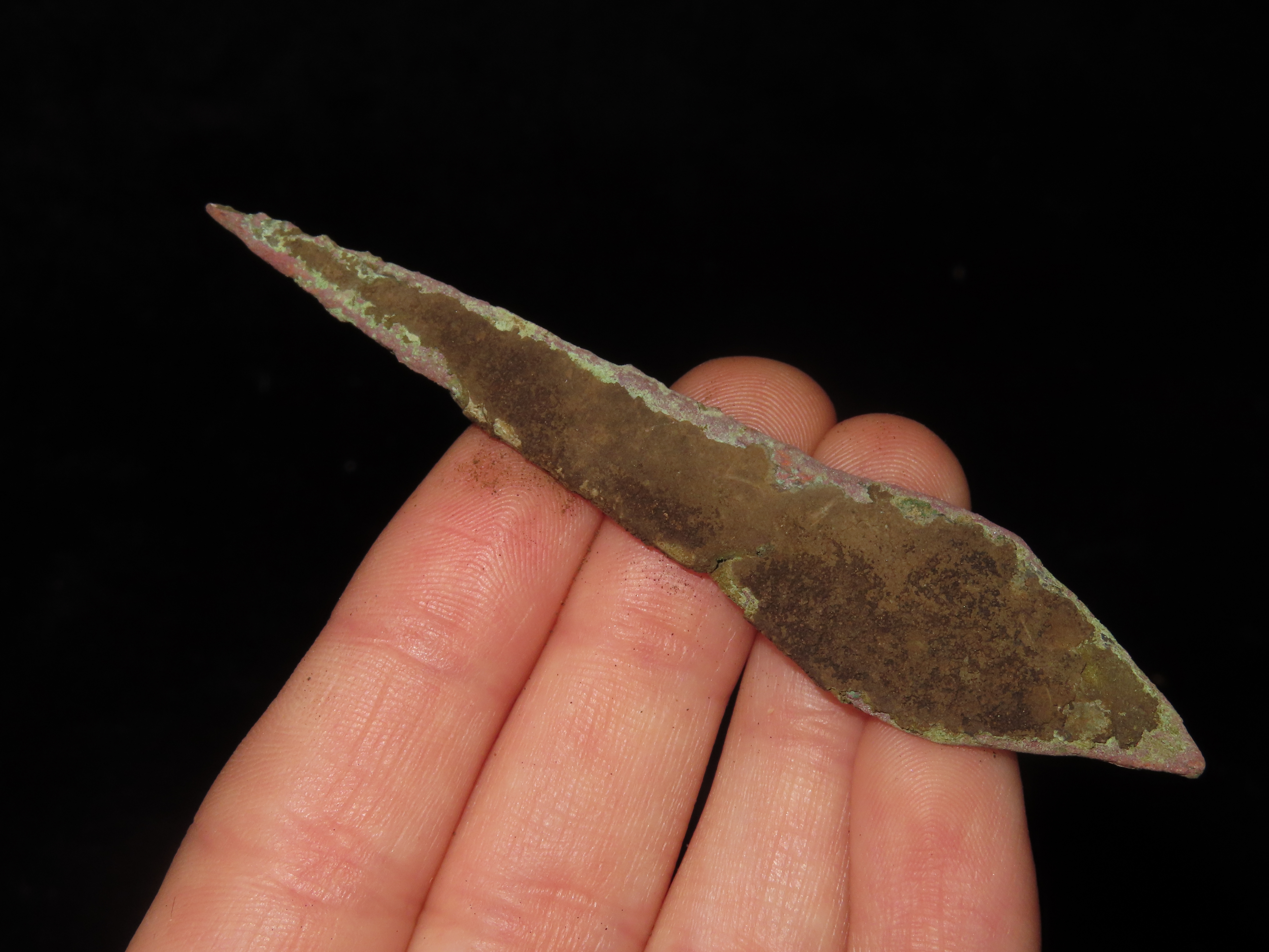 3 1/2″ Copper Rattail Spear, Vilas Co. Wisconsin. Great example with heavy no brainer age & patina. Nice shape!