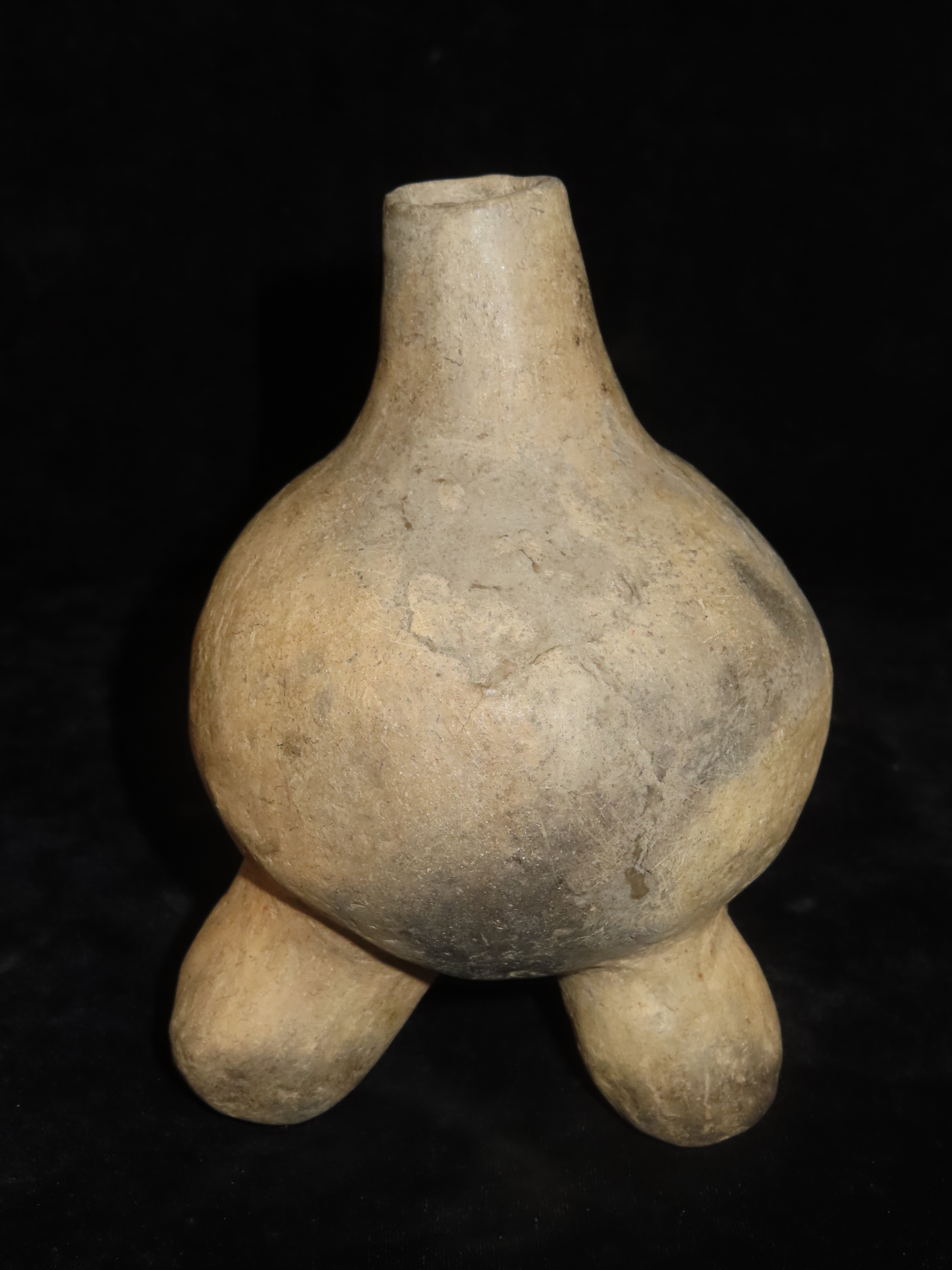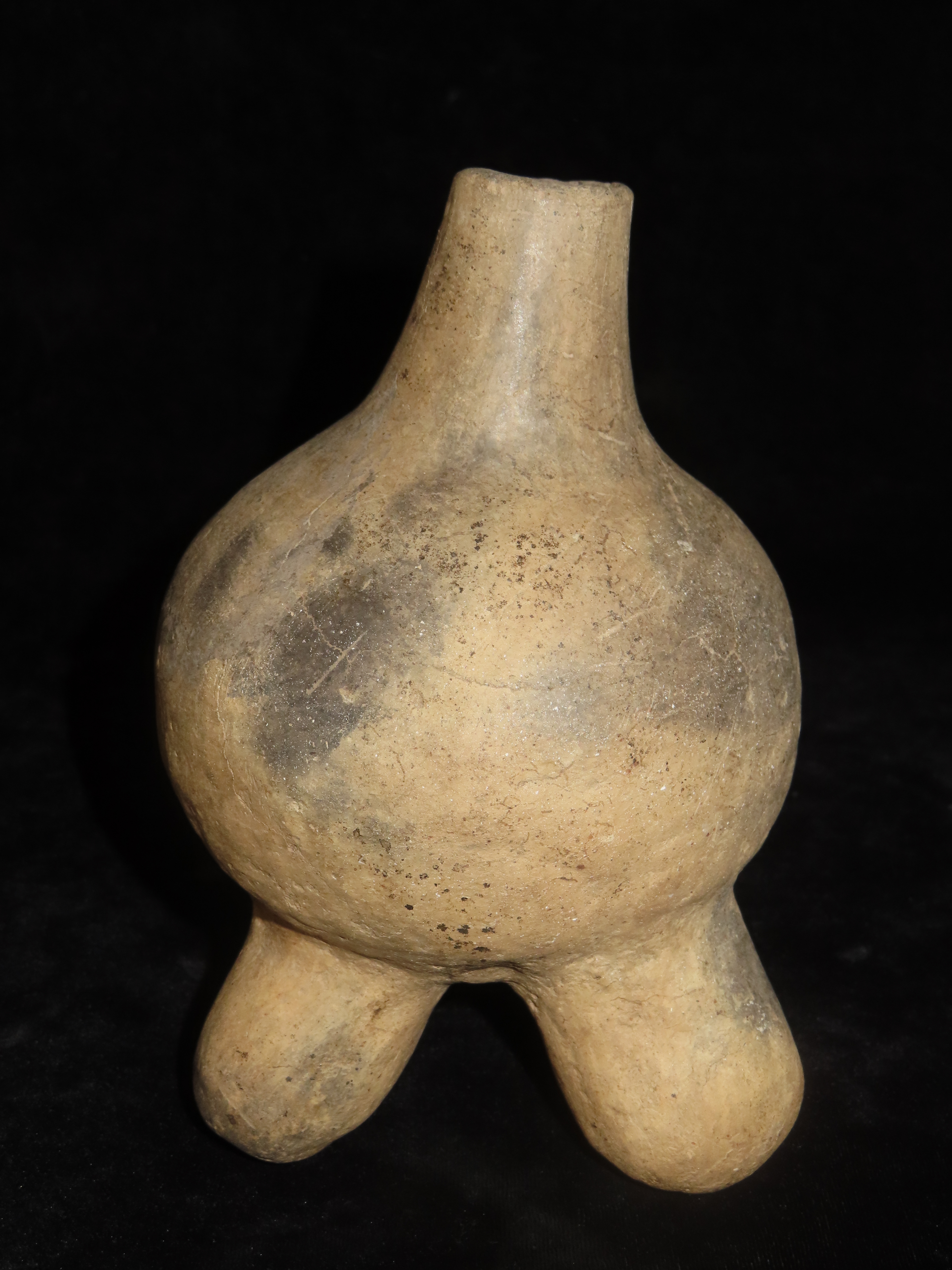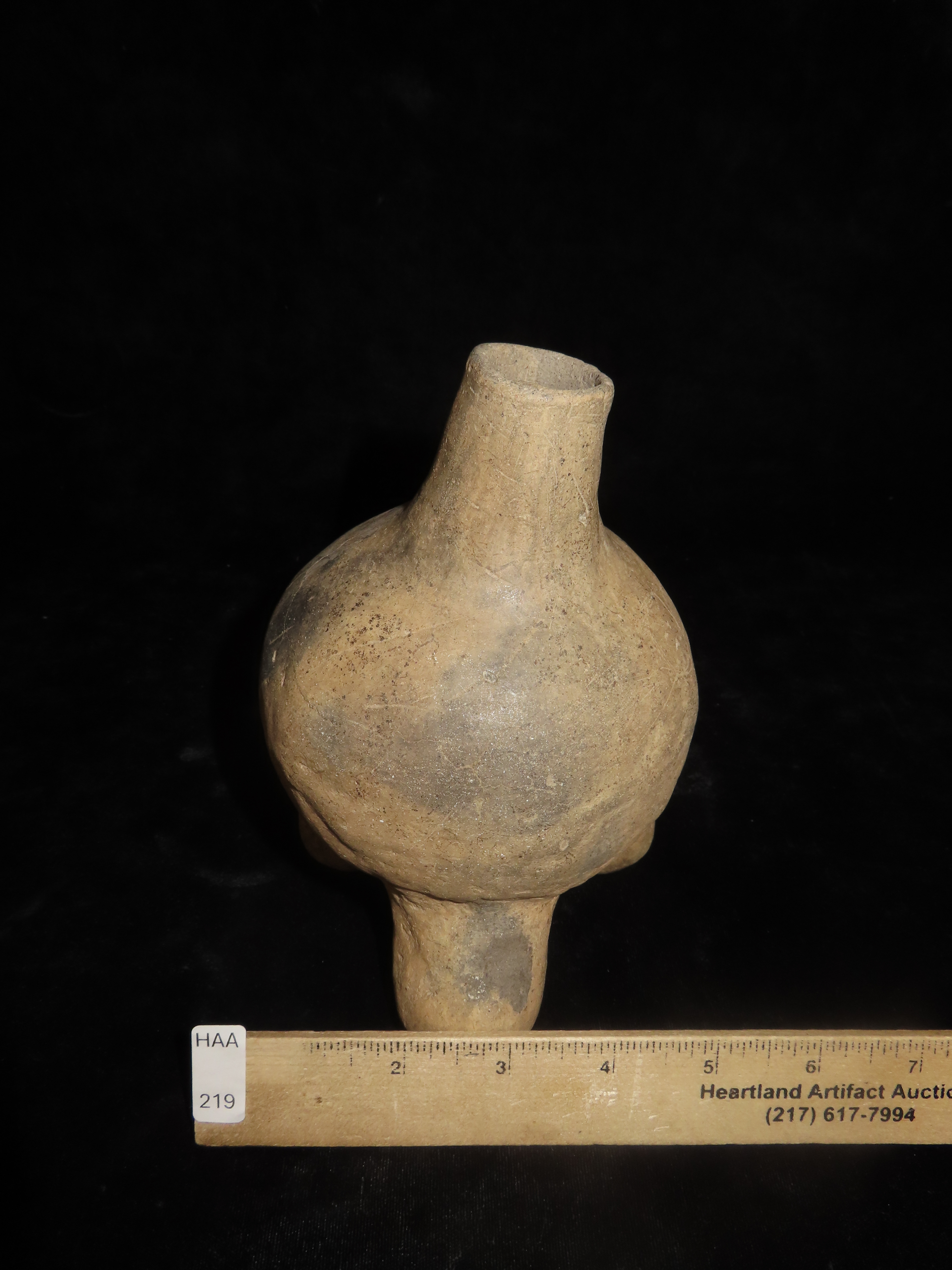 Amazing Pottery Tripod Water Bottle. Crittenden Co, Arkansas. Ex Ray Frasier, G.L. Johnson, Dan Wolf. 7′ tall by 4 1/2″ wide. Tiny amount of repair to a chip on the rim and a small probe hole on the side, otherwise solid. Great color and nice fire clouds. Nice rare example!