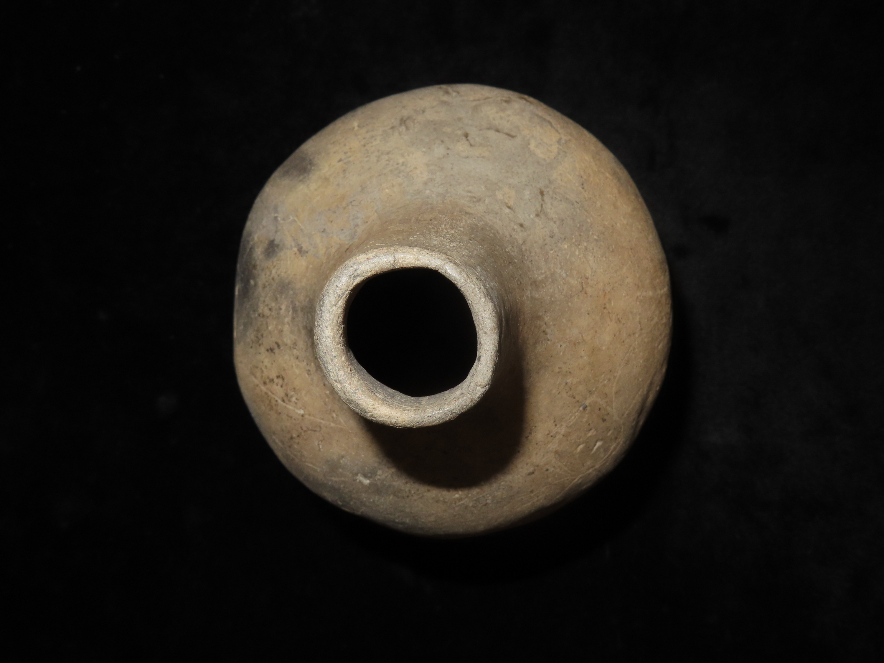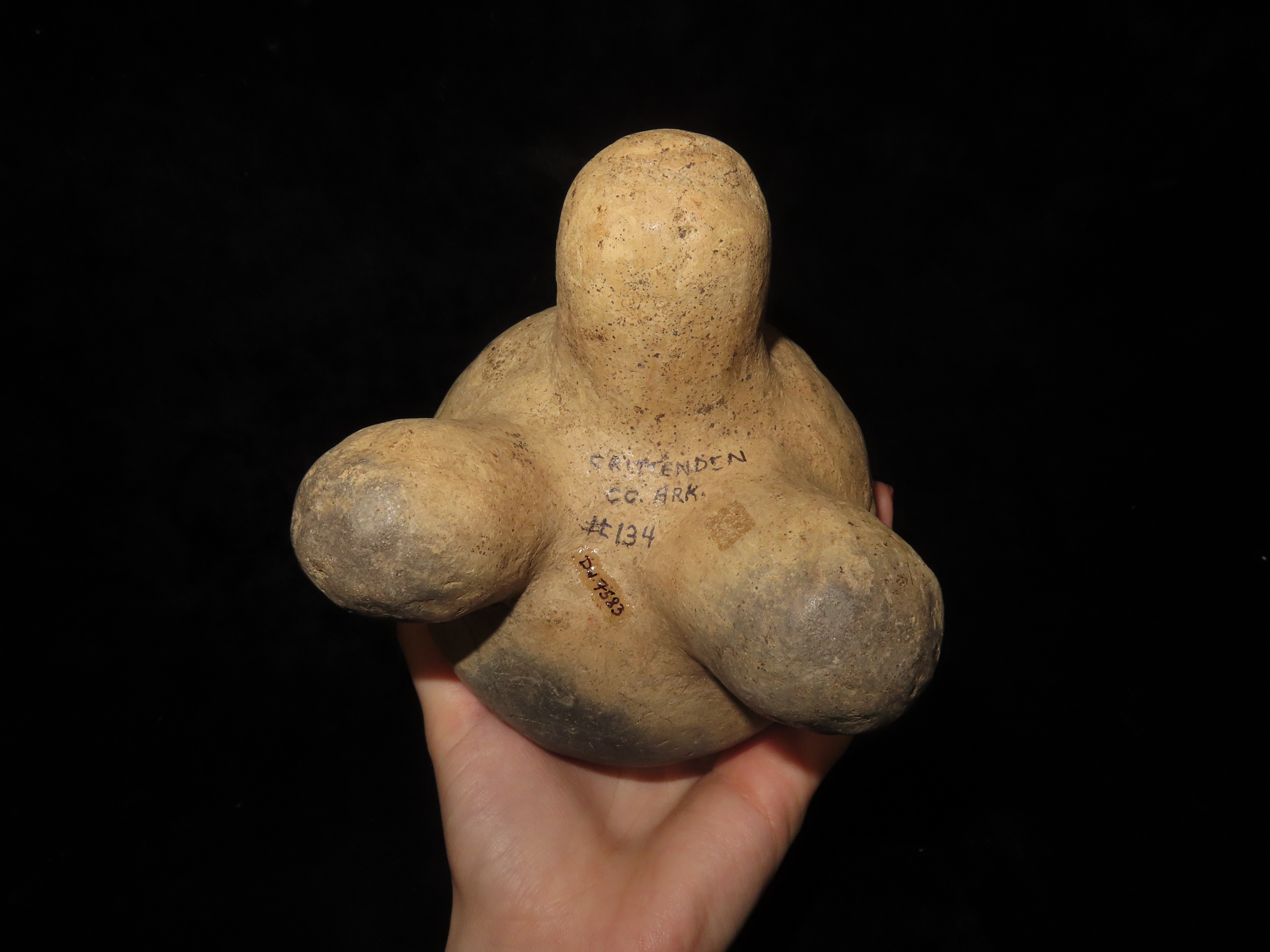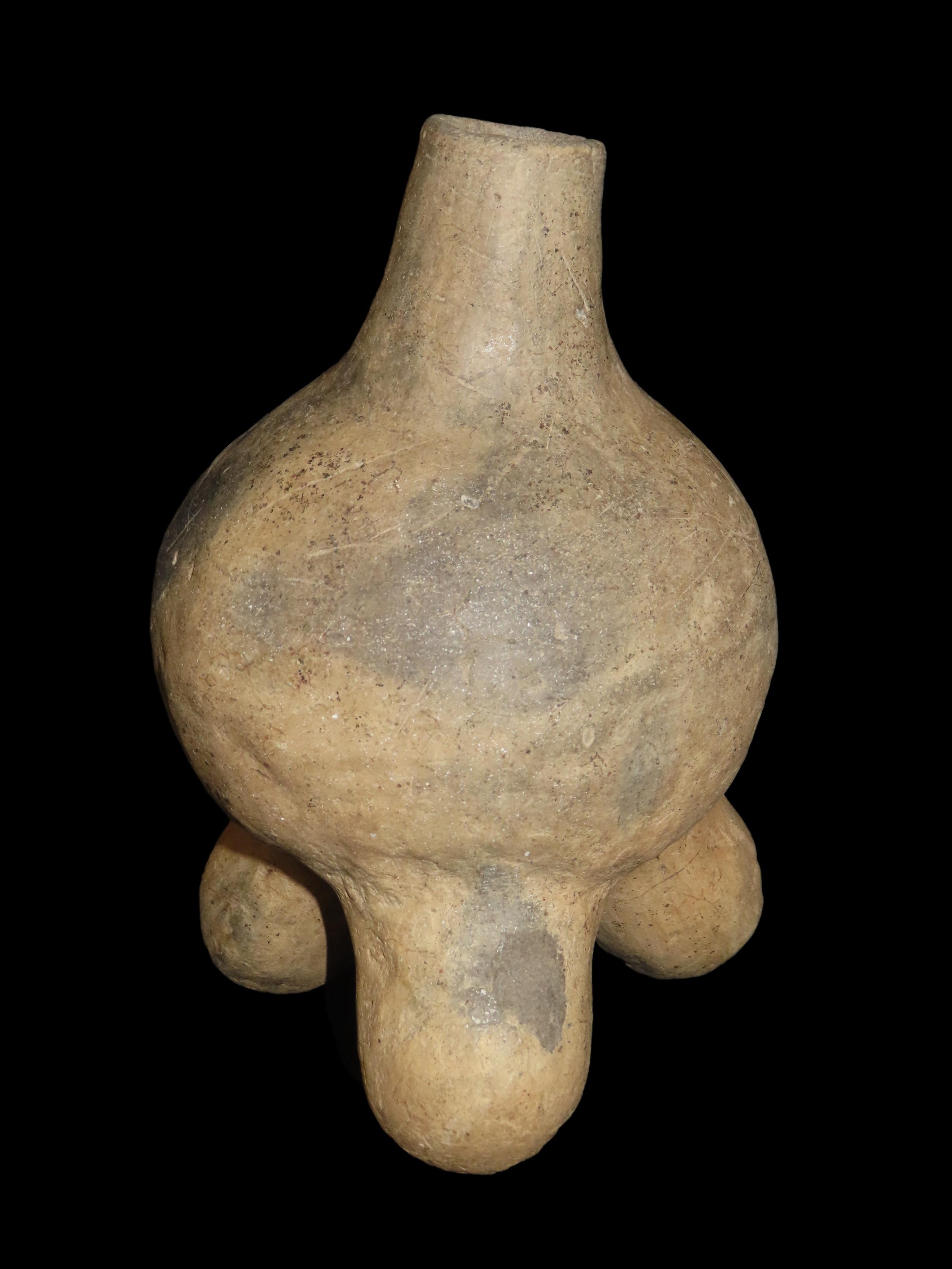 Amazing Pottery Tripod Water Bottle. Crittenden Co, Arkansas. Ex Ray Frasier, G.L. Johnson, Dan Wolf. 7′ tall by 4 1/2″ wide. Tiny amount of repair to a chip on the rim and a small probe hole on the side, otherwise solid. Great color and nice fire clouds. Nice rare example!