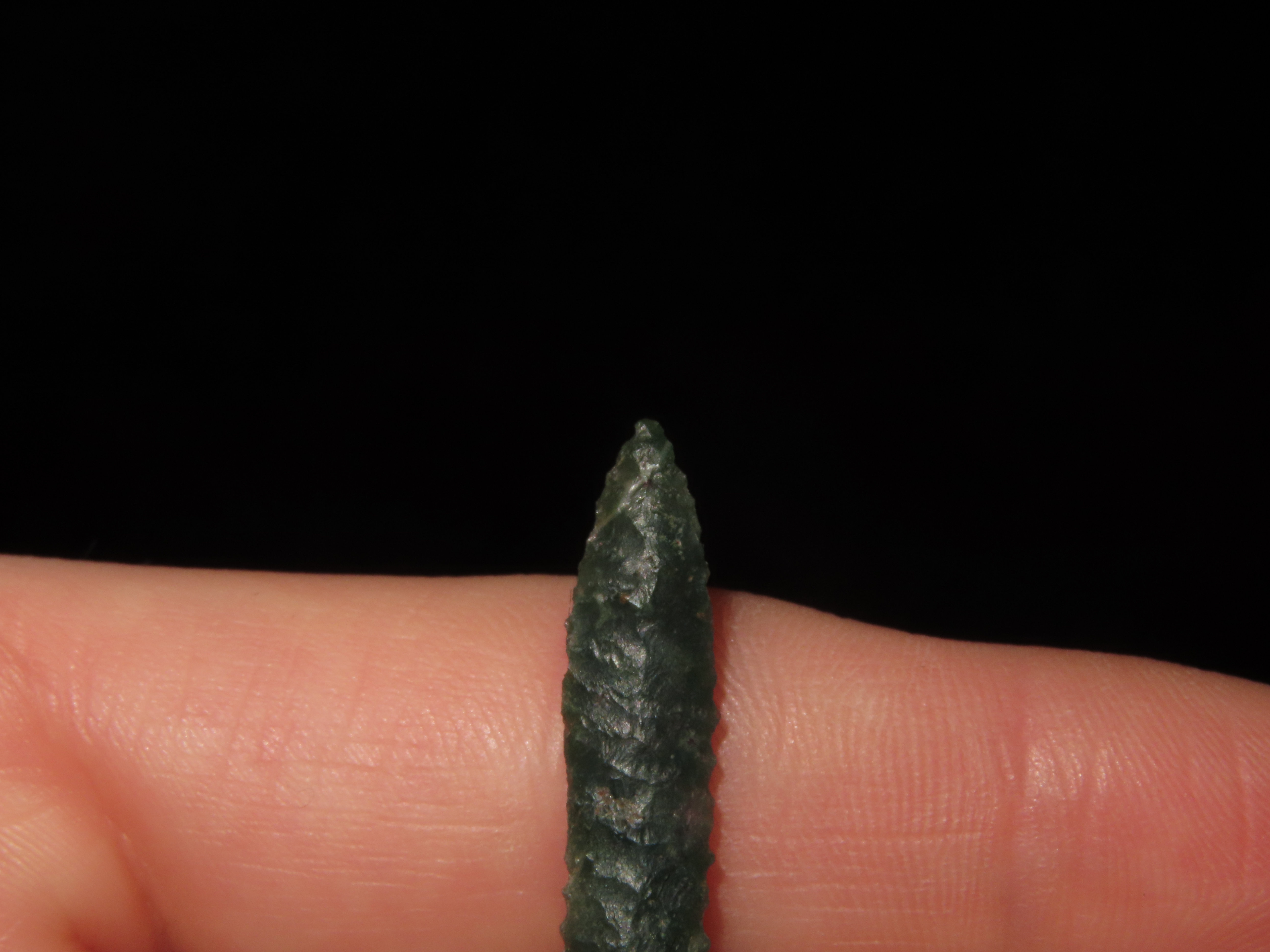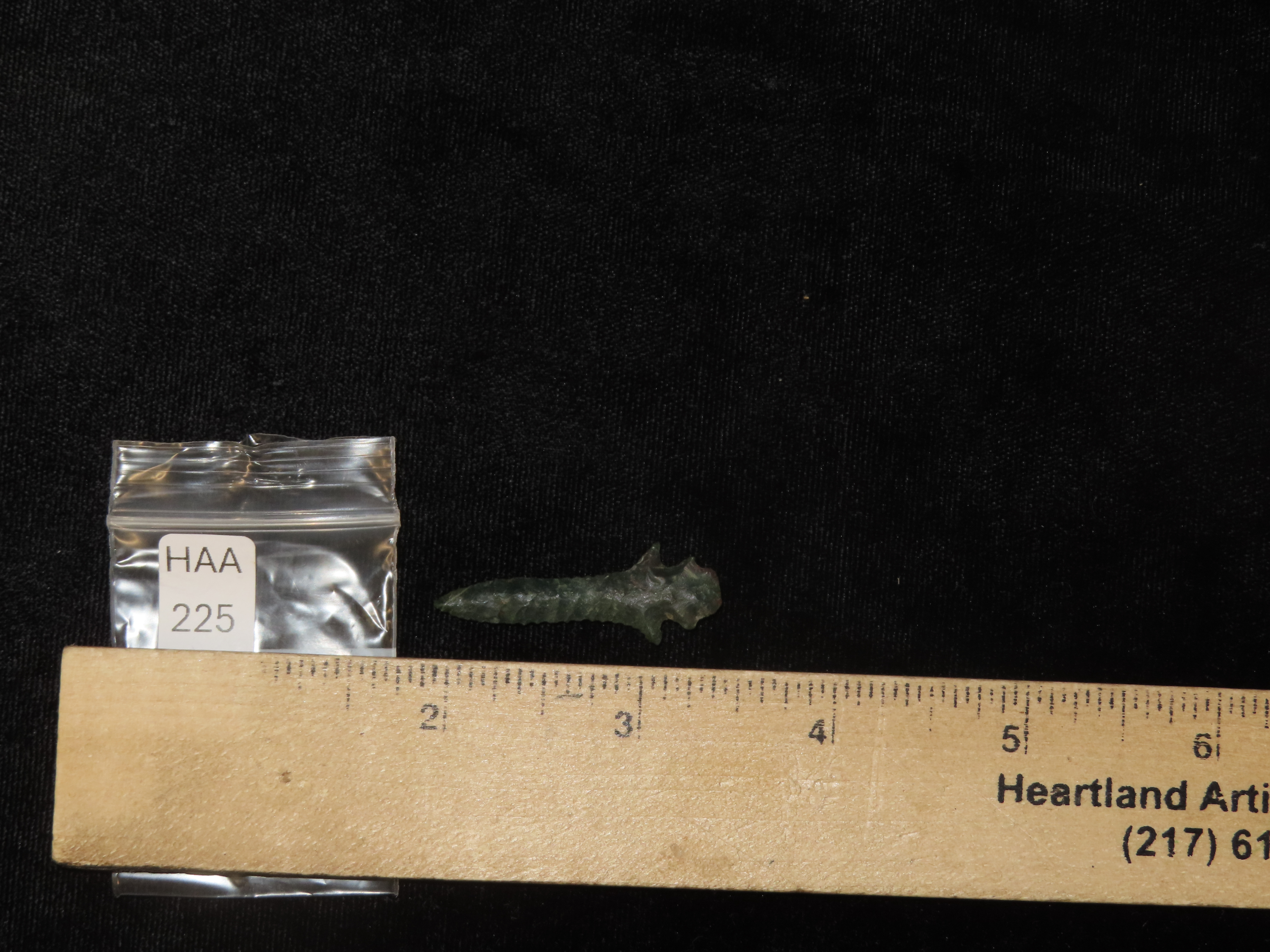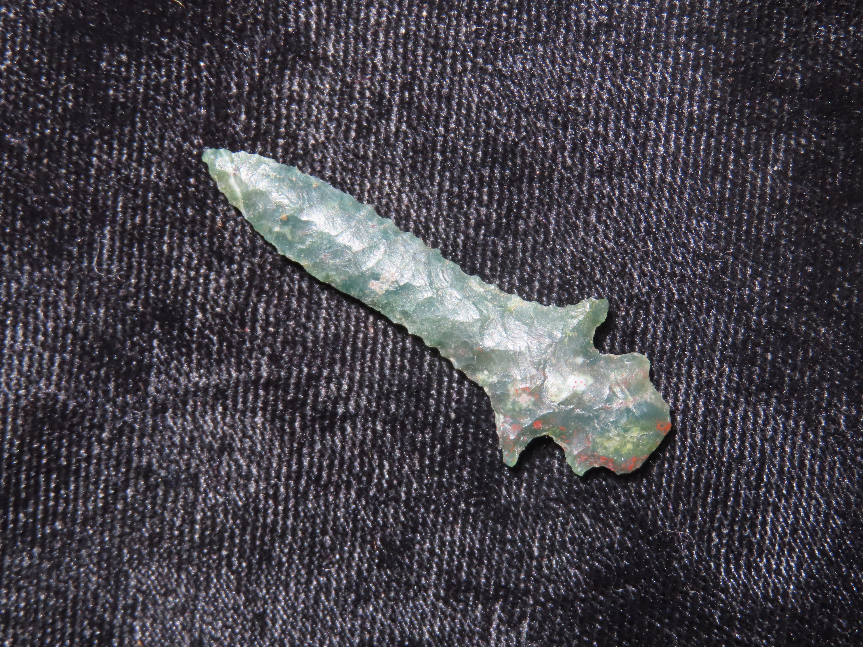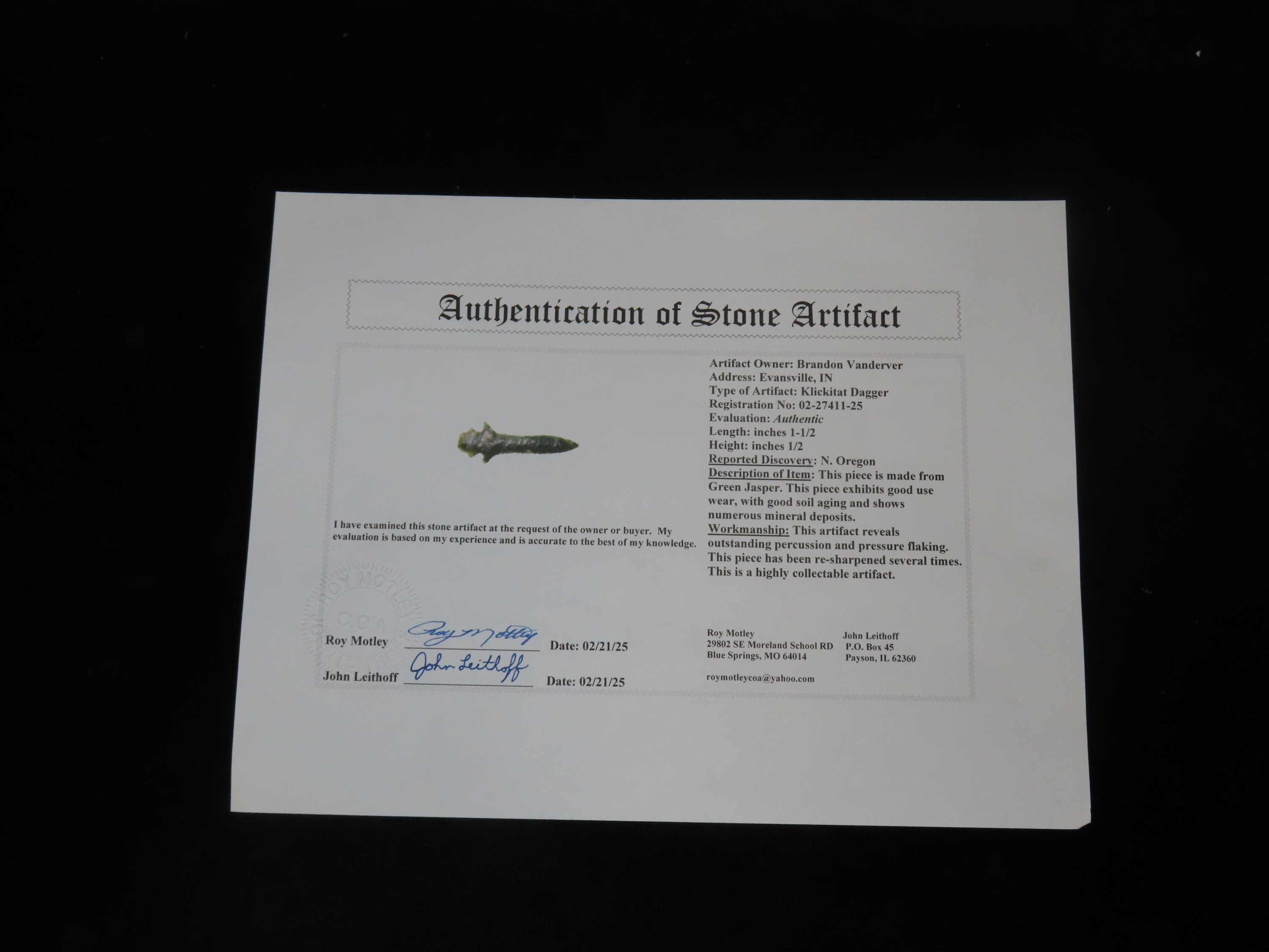 Incredible Klickitat Dagger, N. Oregon. Motley COA. Oustanding Rare Example made from a beautiful Translucent Green Jasper / Agate. Perfect Grade 10 example, thin and expert flaking with nice patination.