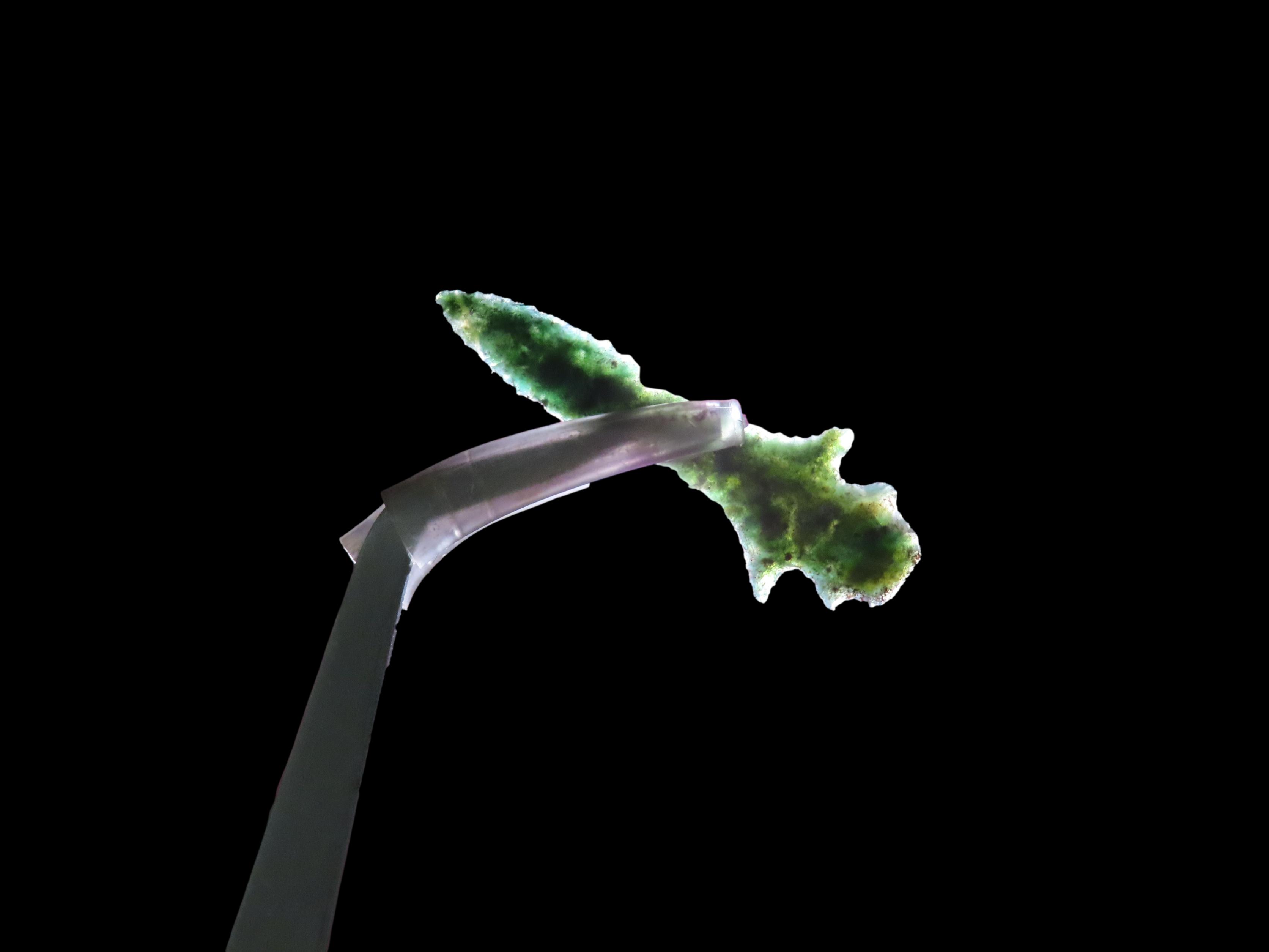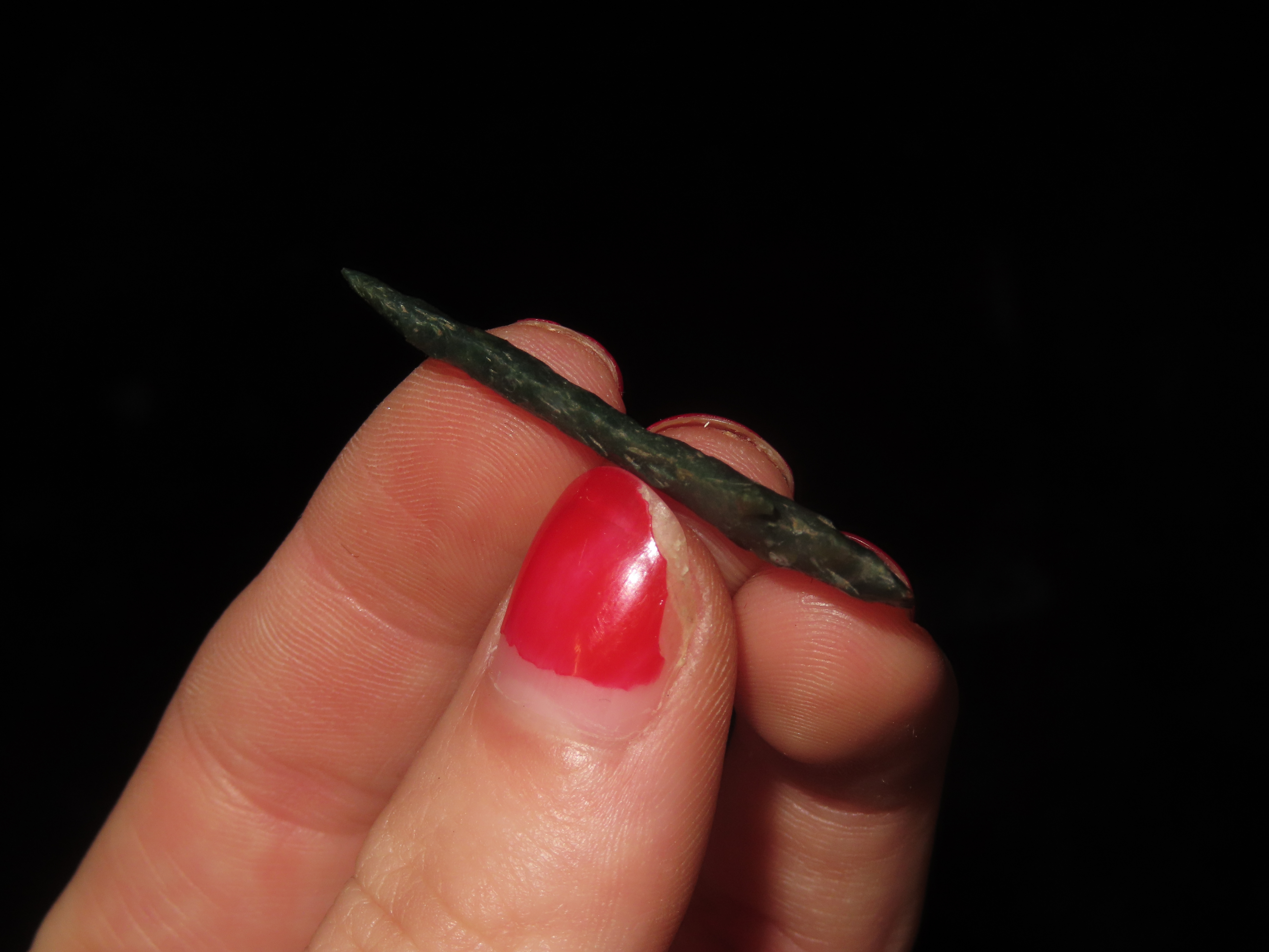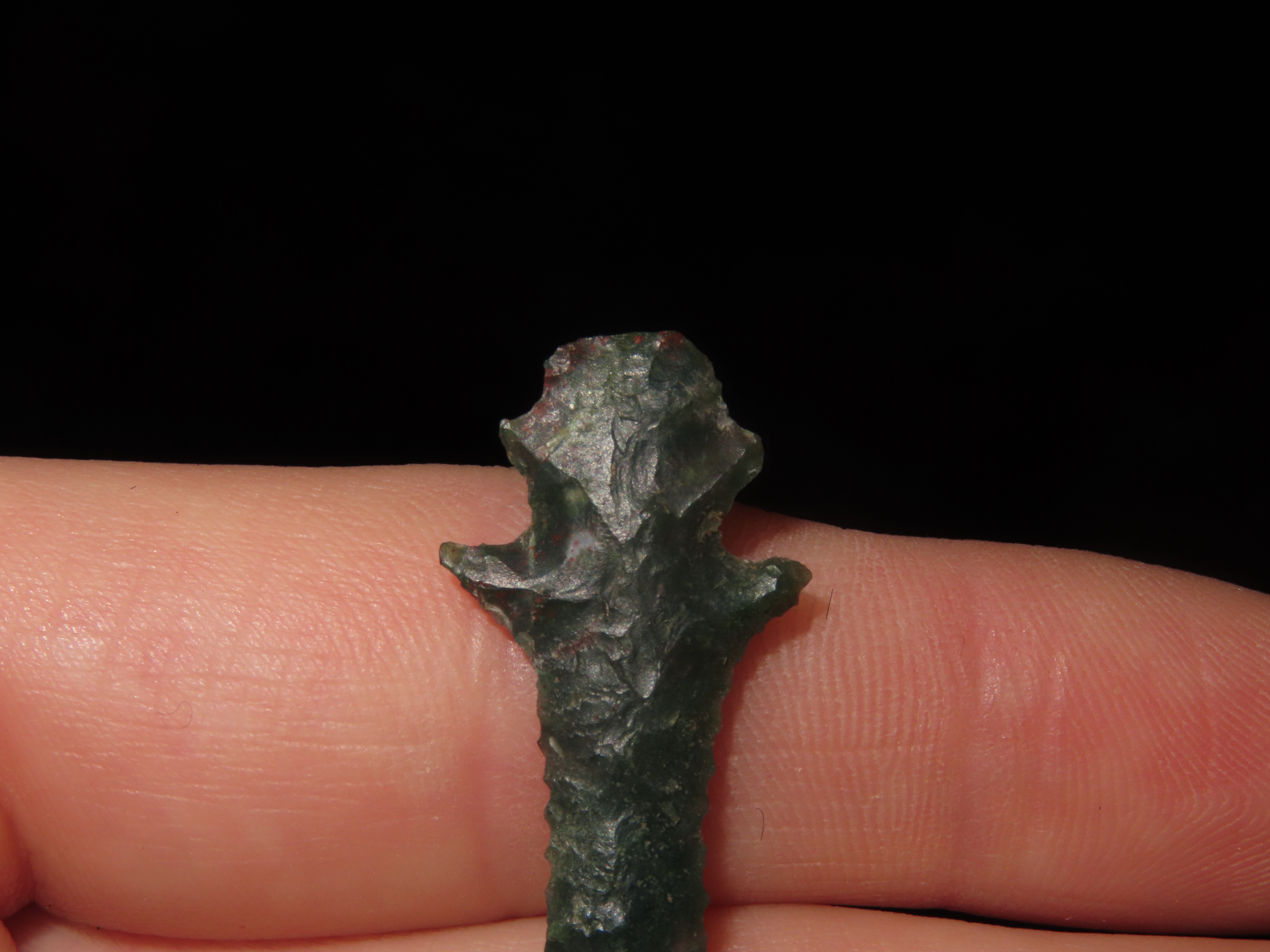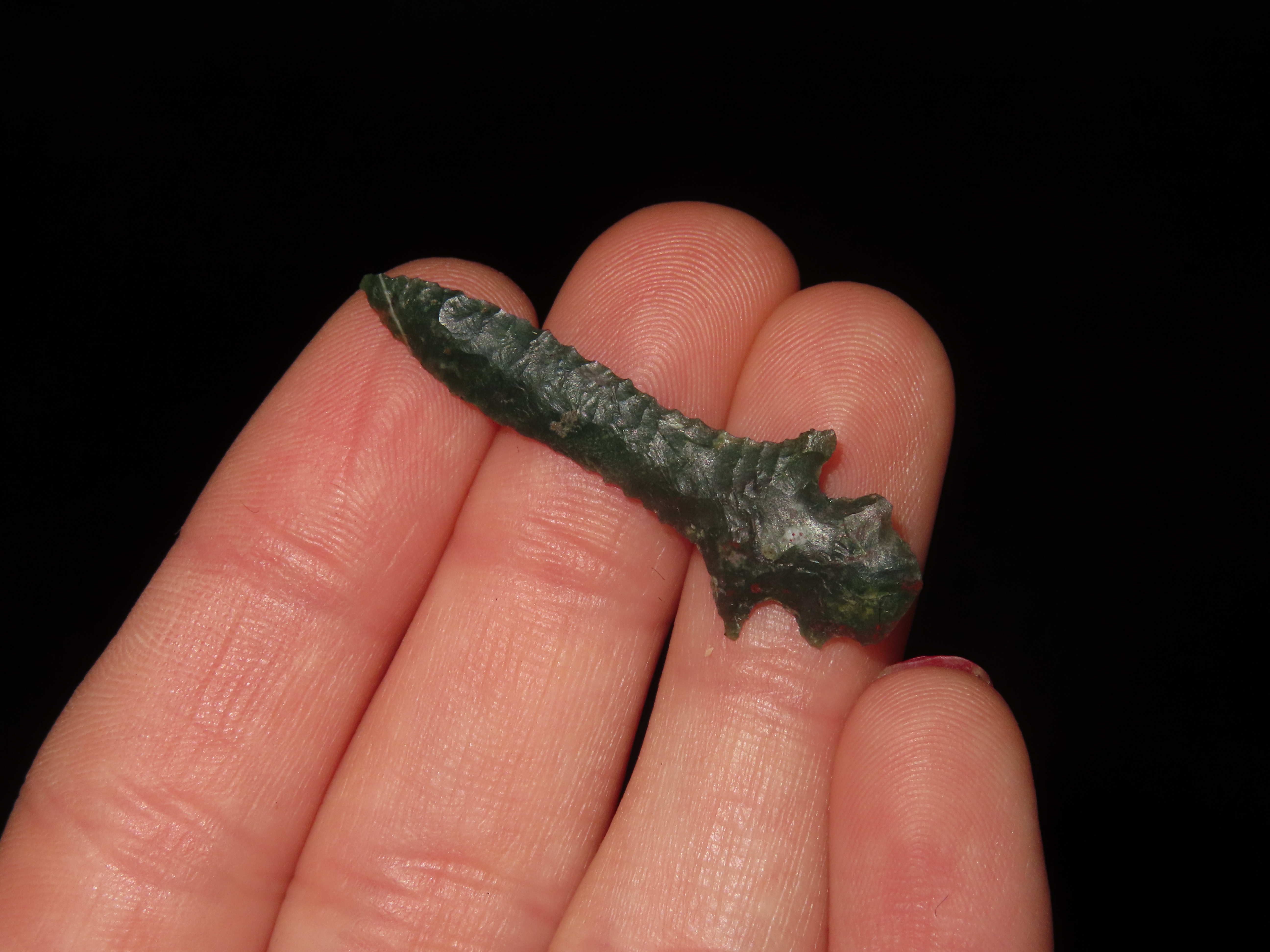 Incredible Klickitat Dagger, N. Oregon. Motley COA. Oustanding Rare Example made from a beautiful Translucent Green Jasper / Agate. Perfect Grade 10 example, thin and expert flaking with nice patination.