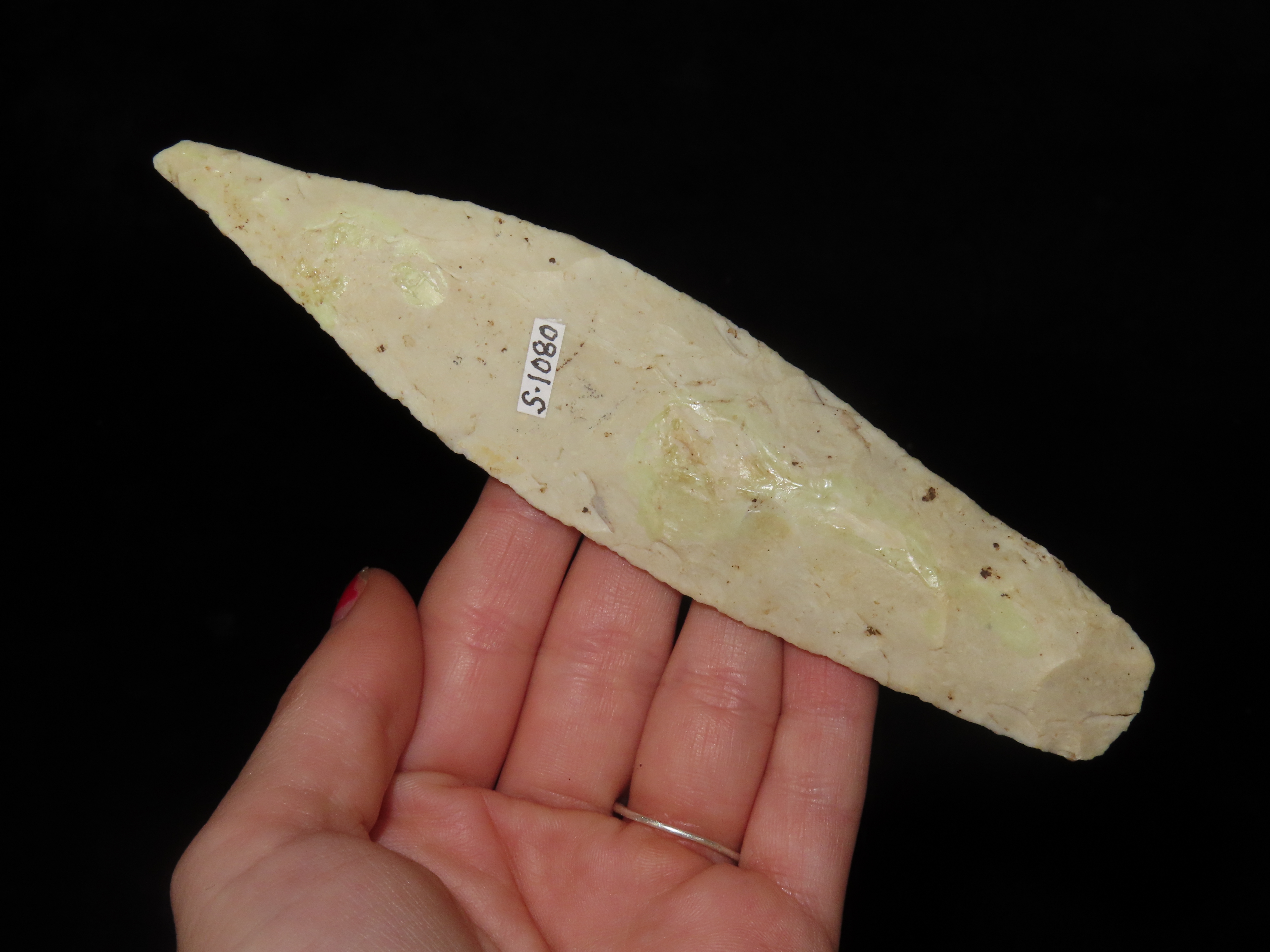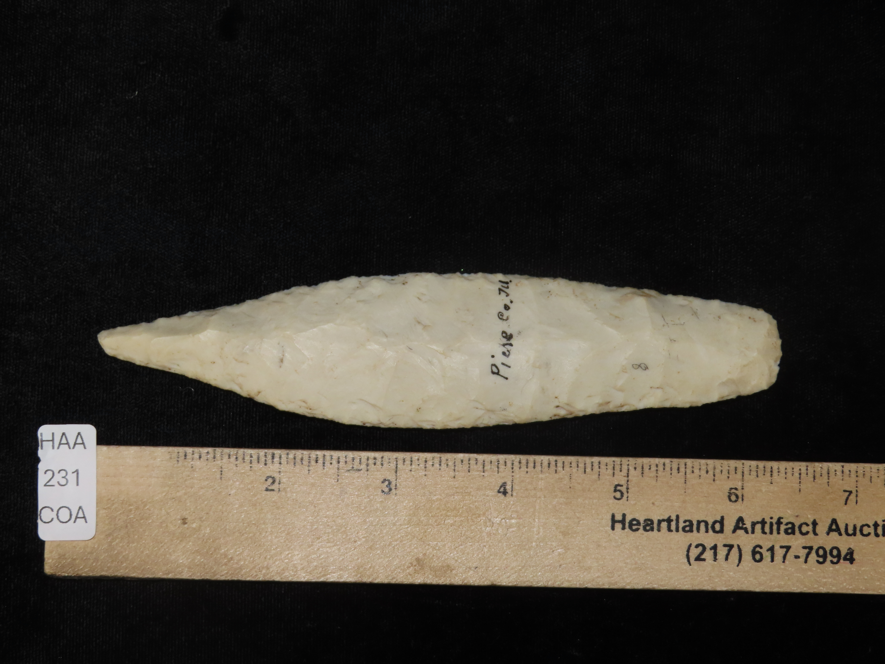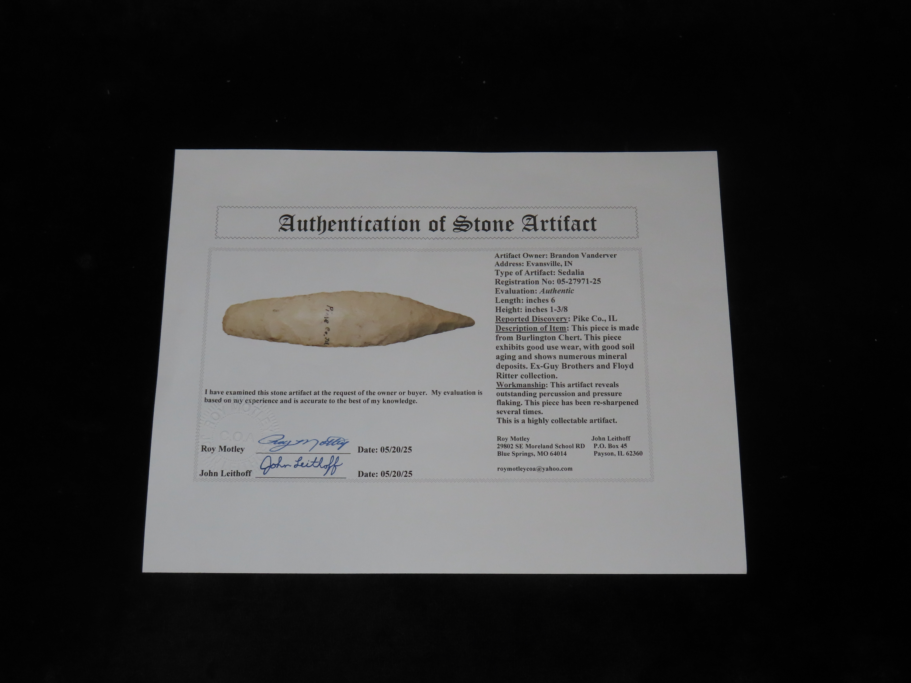 6″ Sedalia, Pike Co. Illinois. Motley COA. Ex Guy Brothers, Floyd Ritter. Wonderful large classic example with great flaking and nice mineral deposits