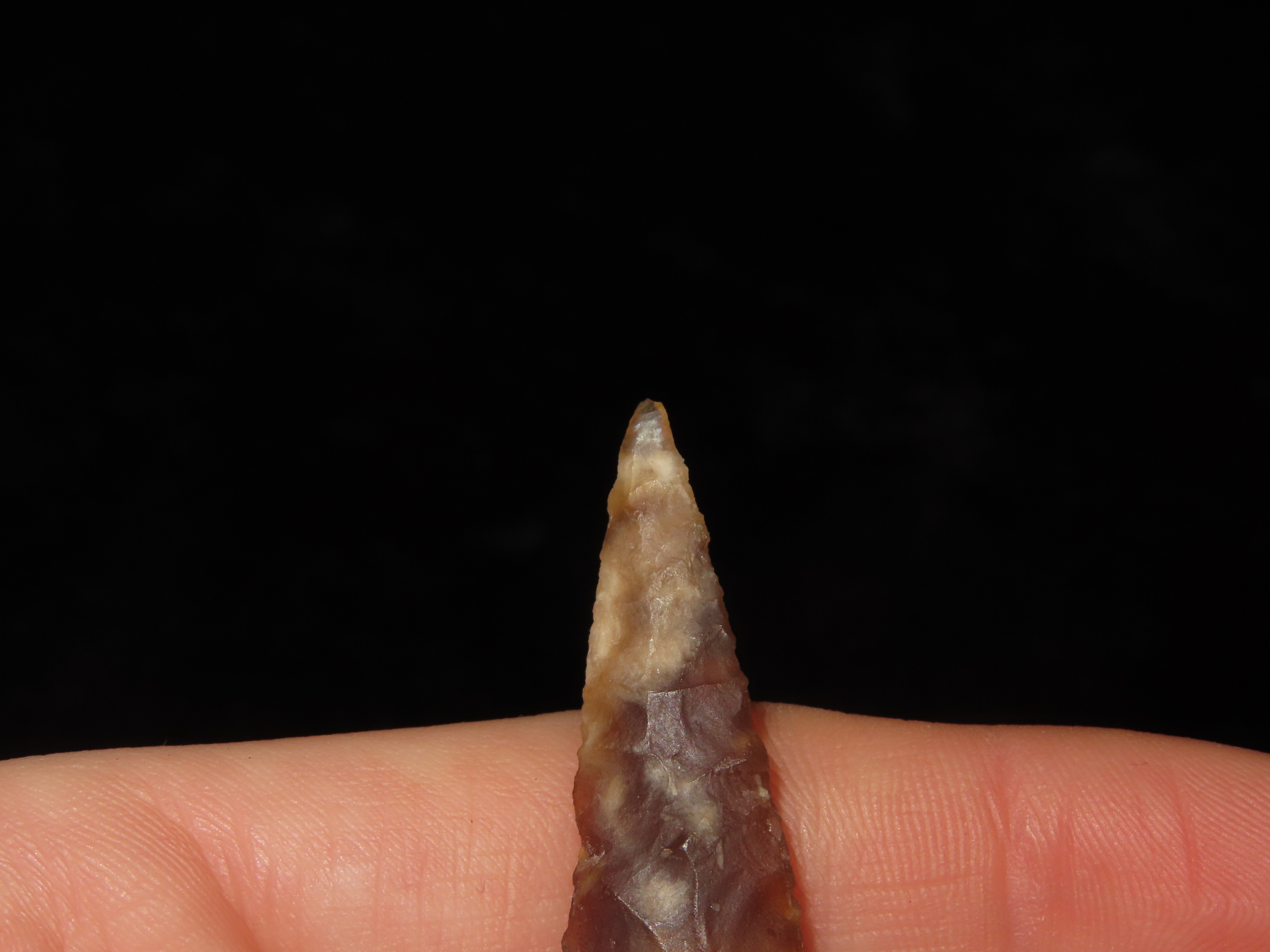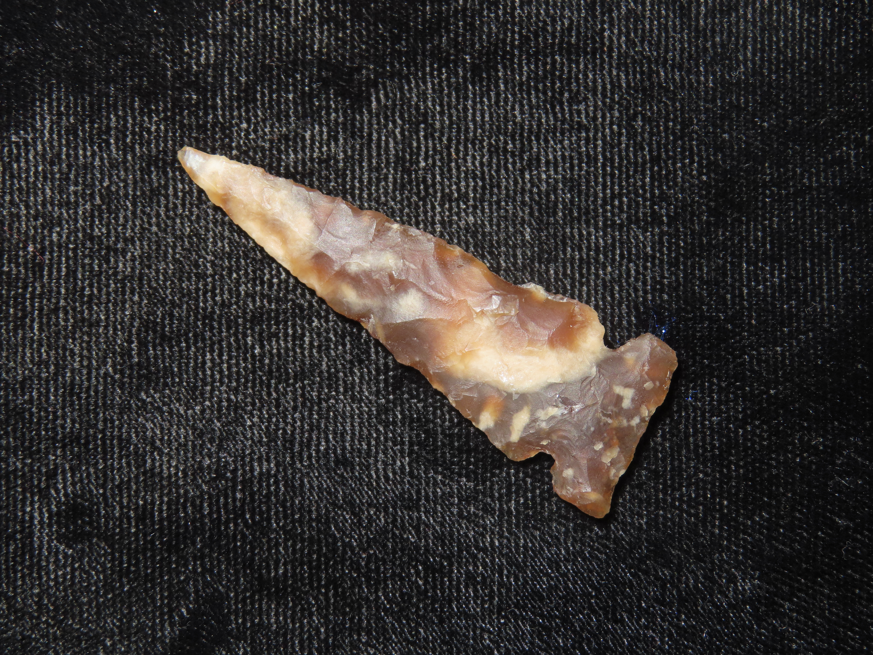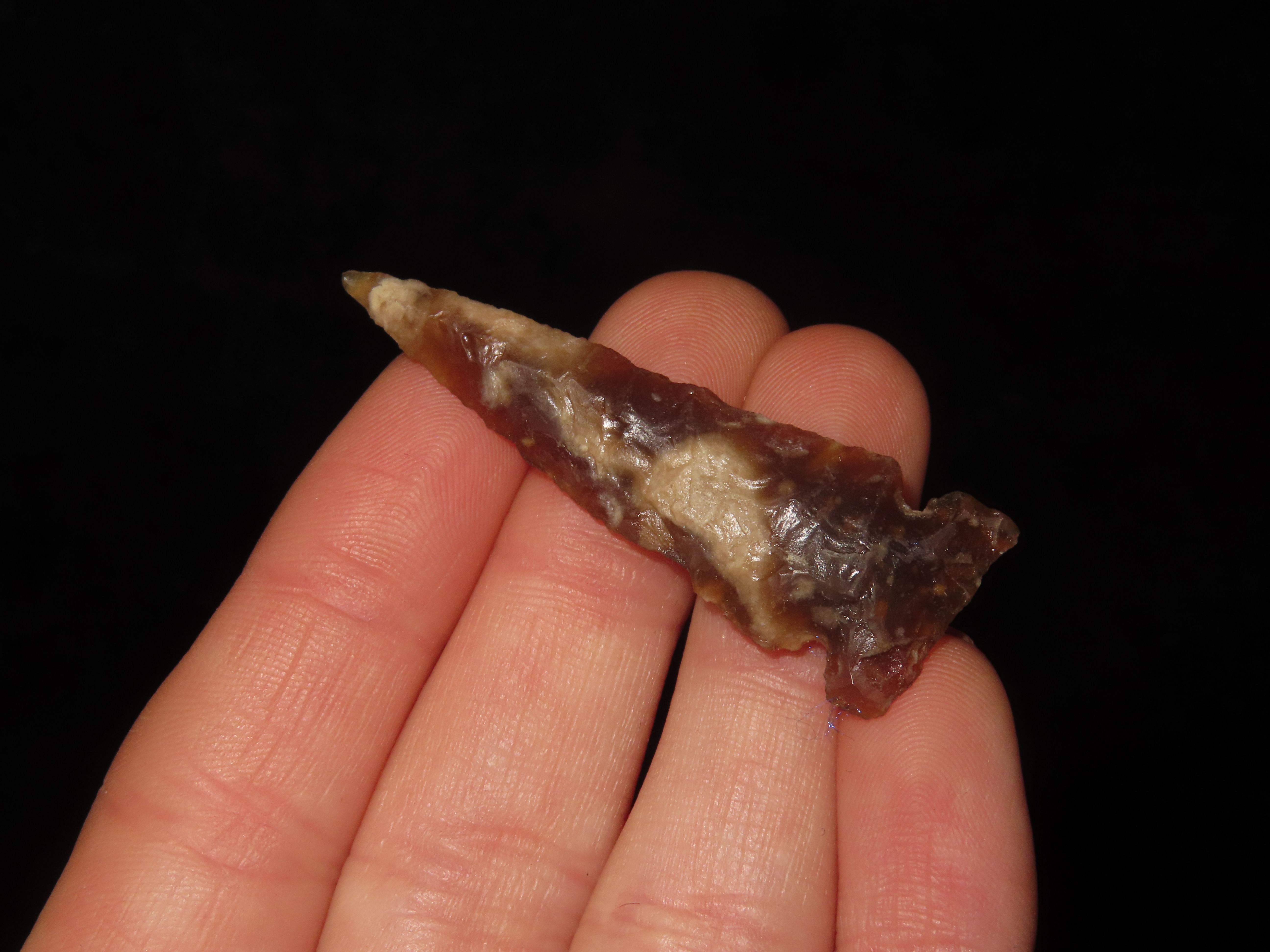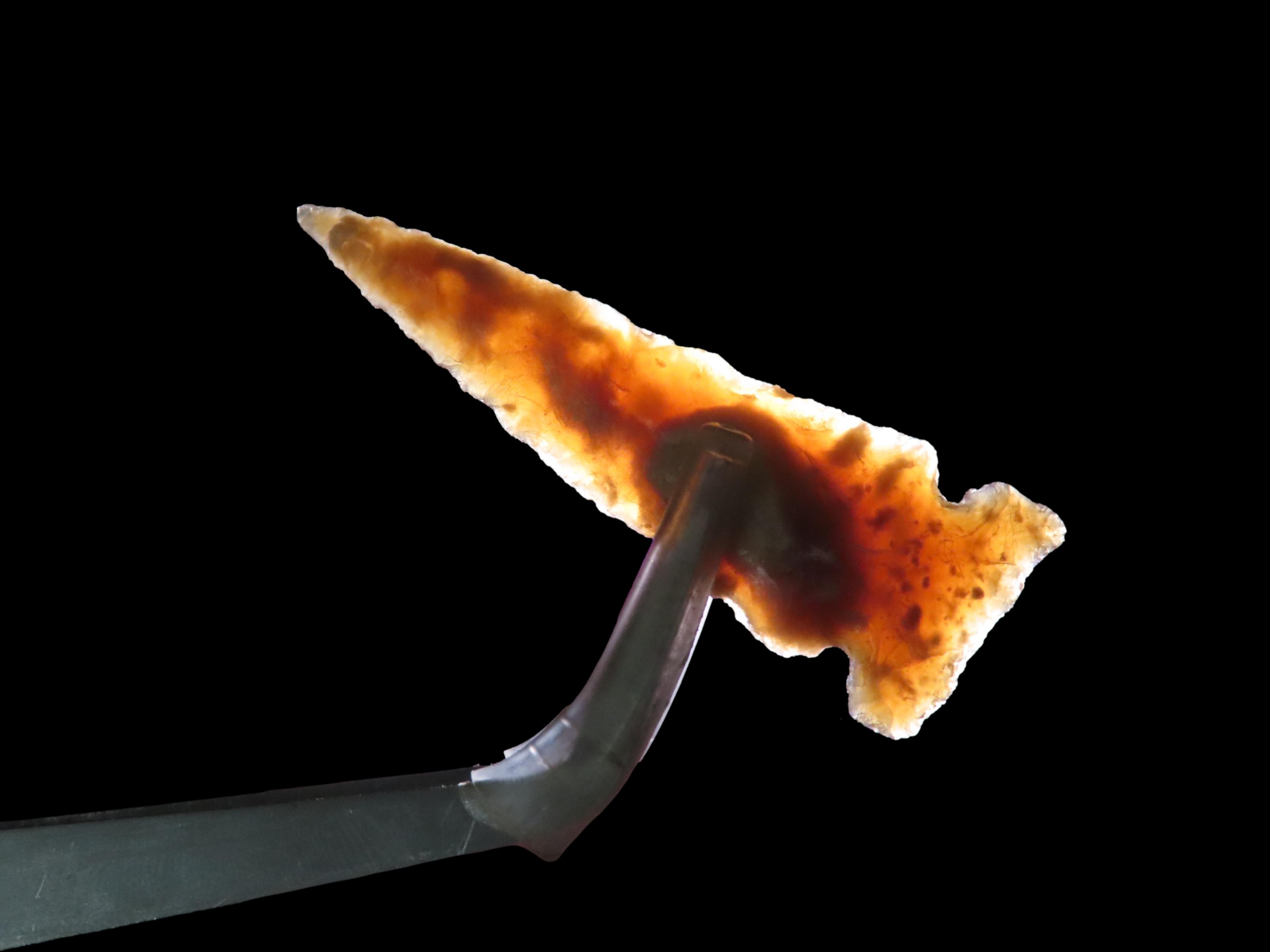 Translucent Knife River Sidenotch, Montana. Nice long Slender example, thin and well flaked with great color. Highly Translucent Example!