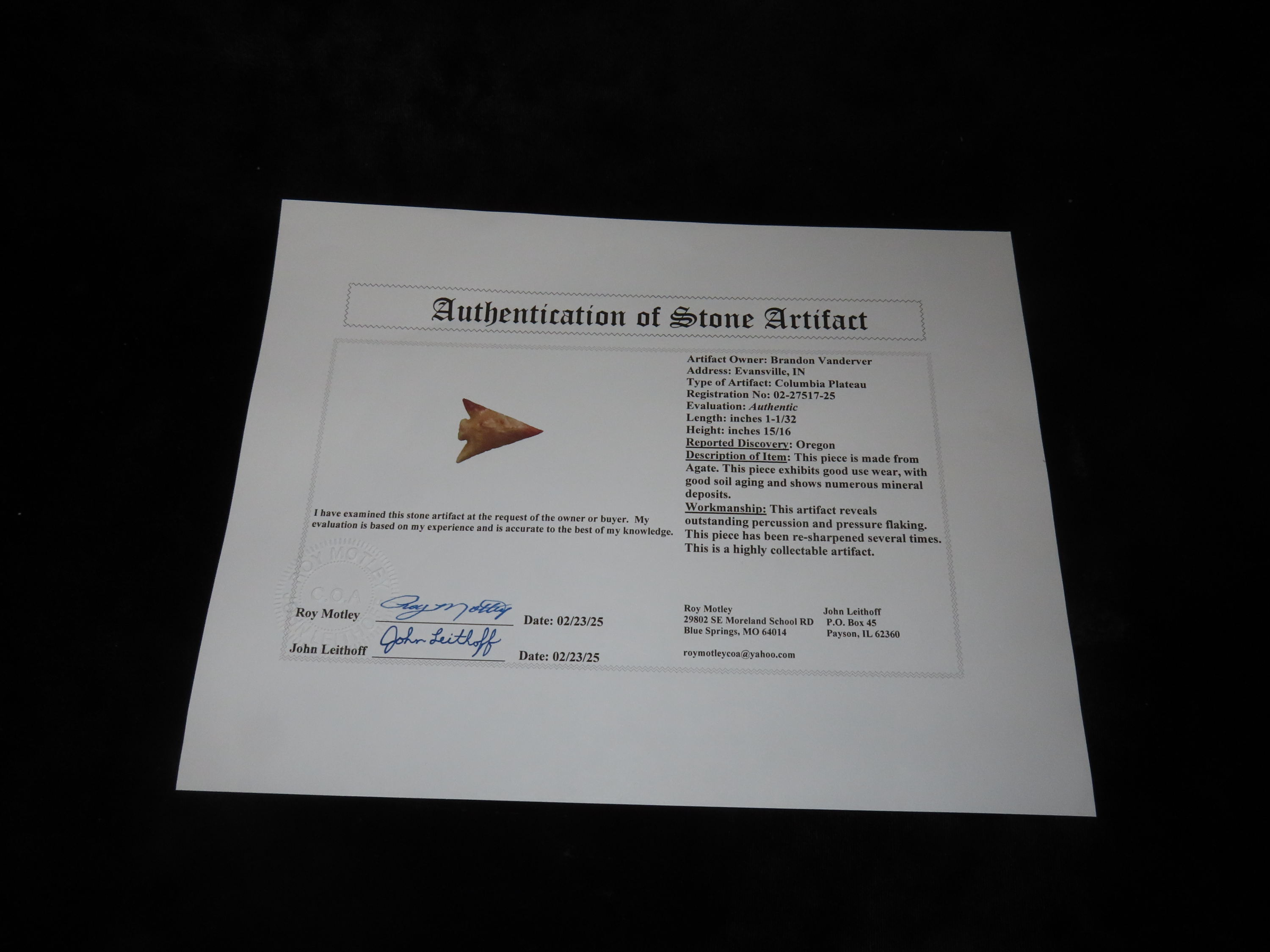 Amazing Columbia Plateau, Oregon. Motley COA. Perfect grade 10 example, very colorful with impeccable flaking. Made from a beautiful piece of highly translucent orange and peach agate! Nice High Grade example!