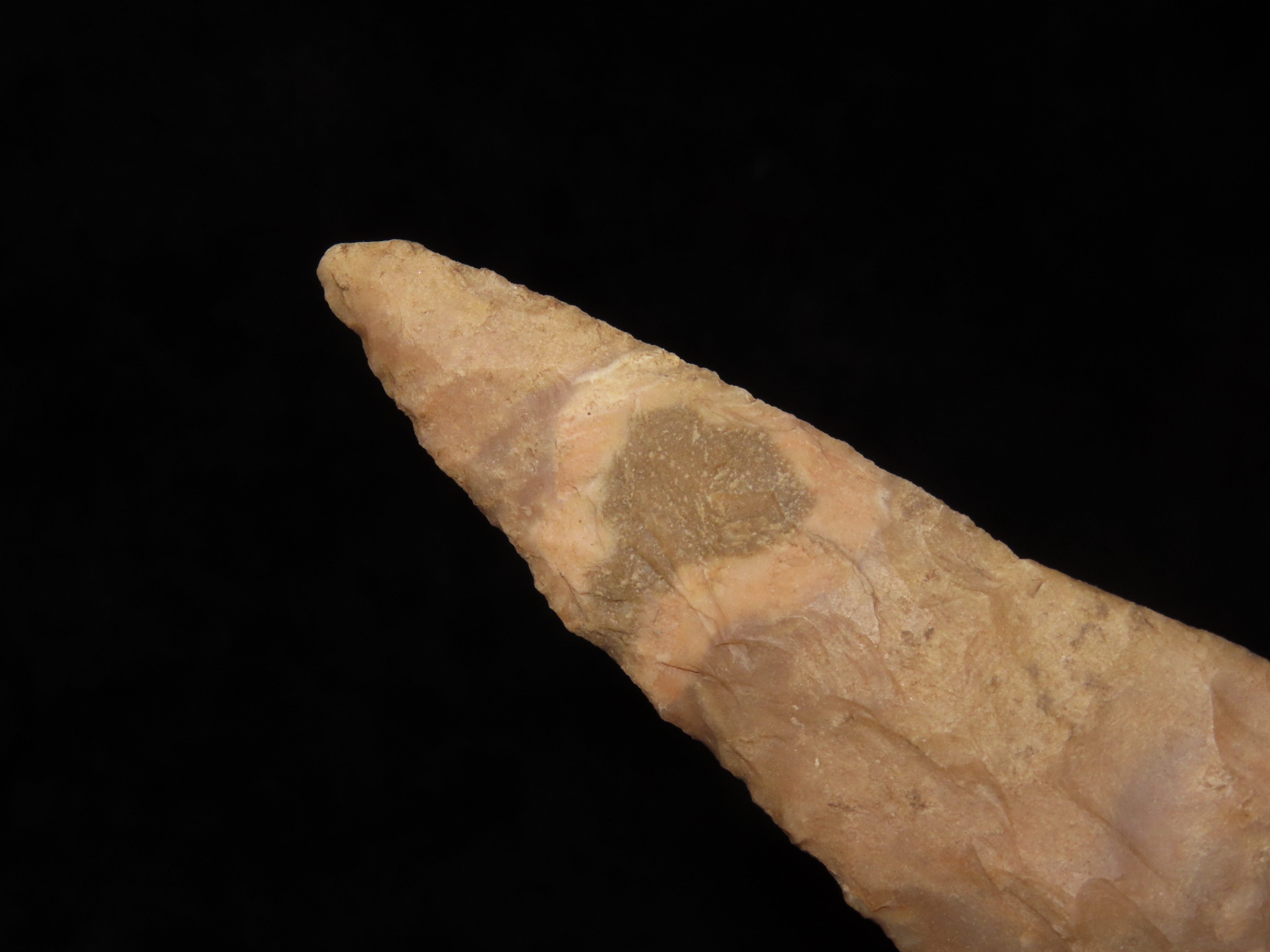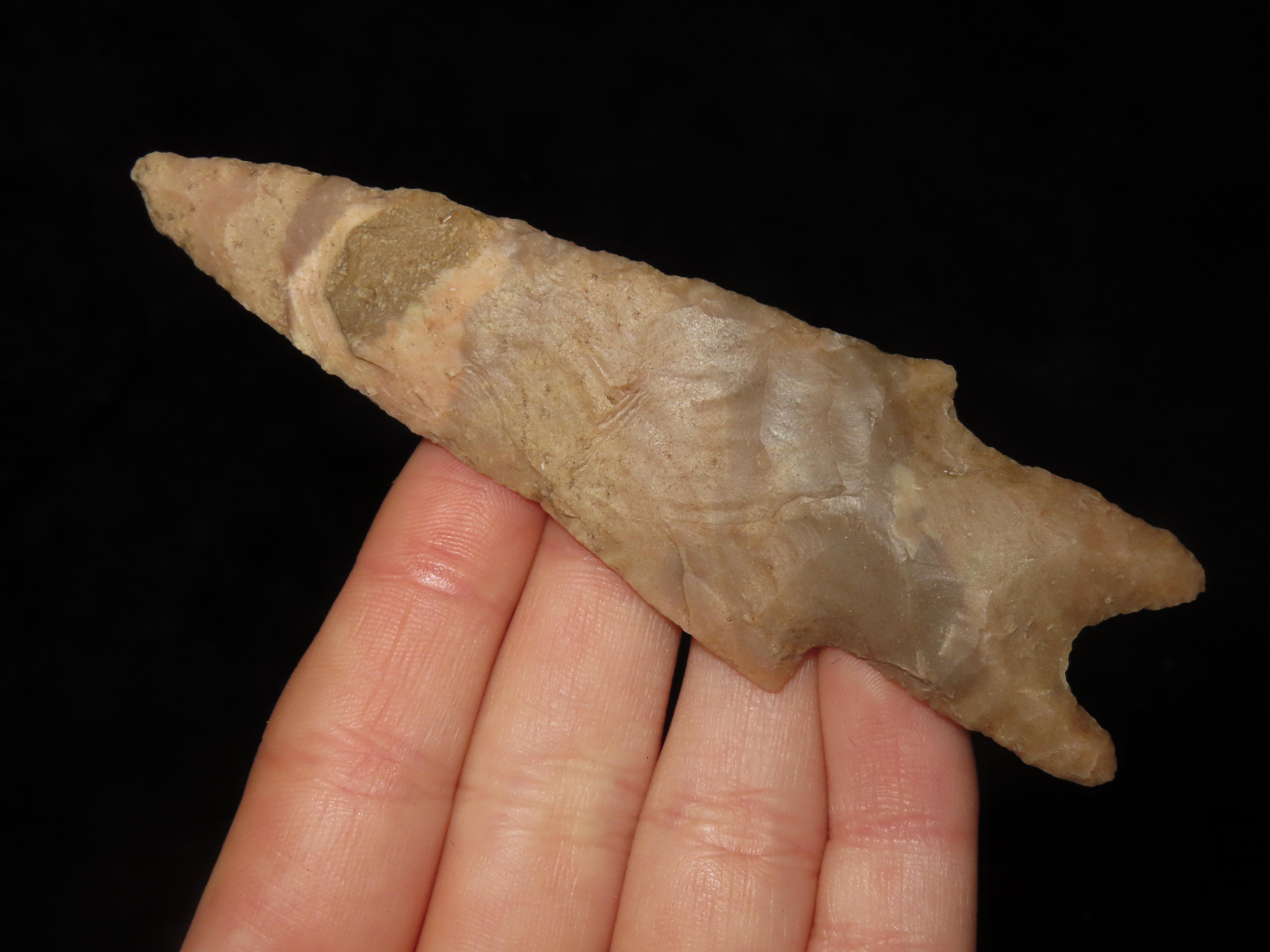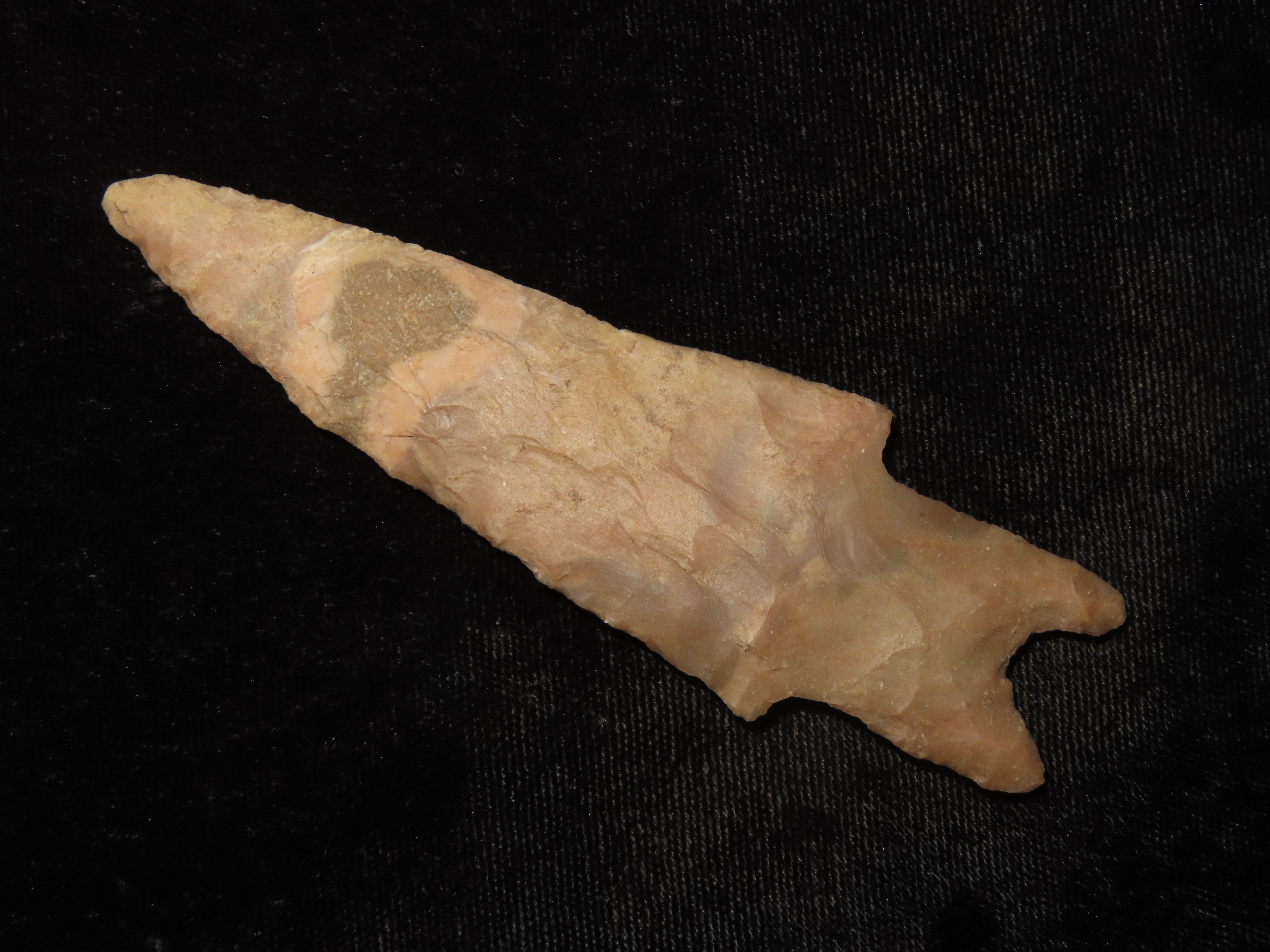 Colorful 4″ Pedernales, Bandera Co. Texas. Thin & well flaked with heavy patina & deposits. Nice colorful mottled brown, orange, and tan chert.
