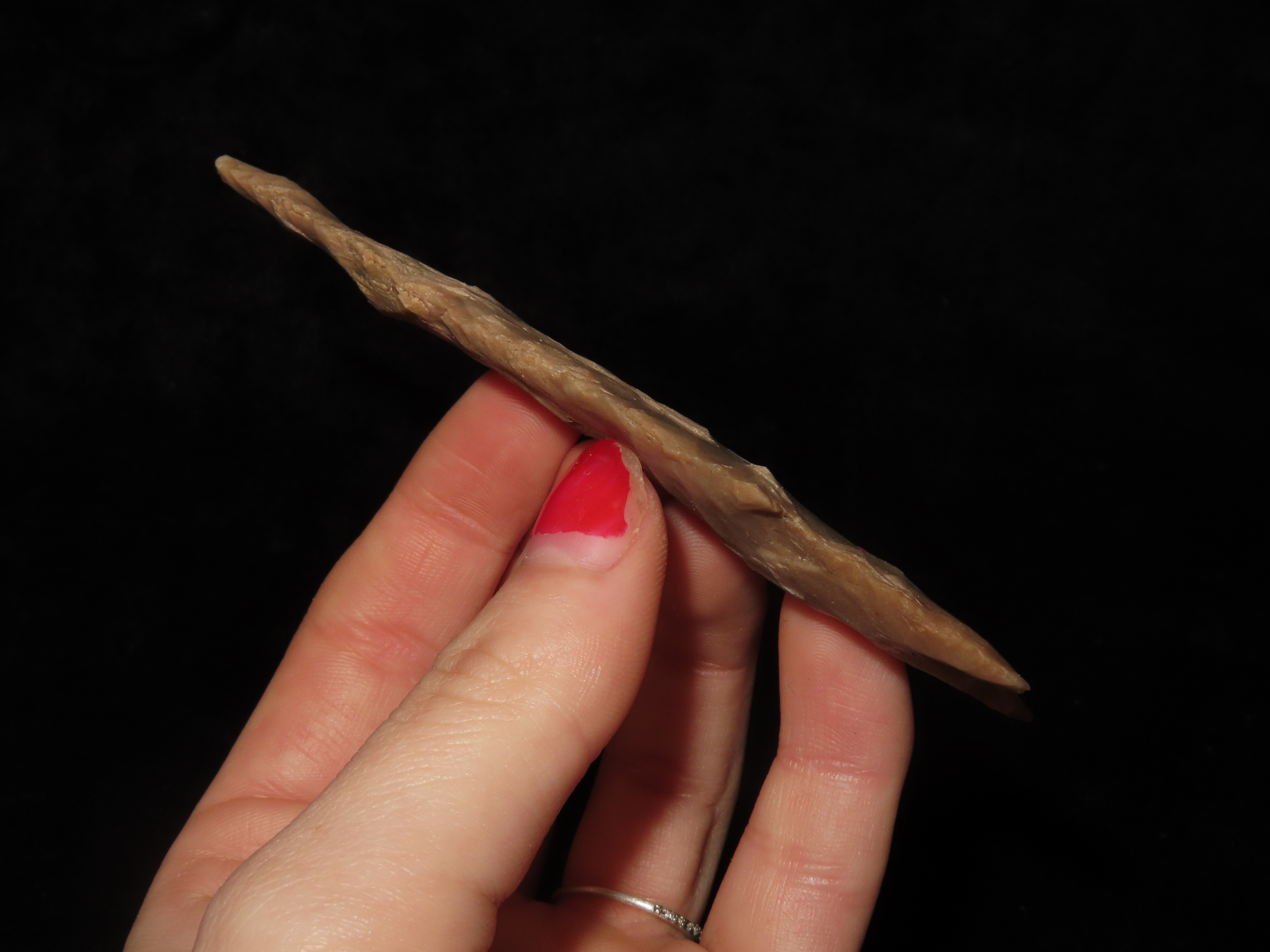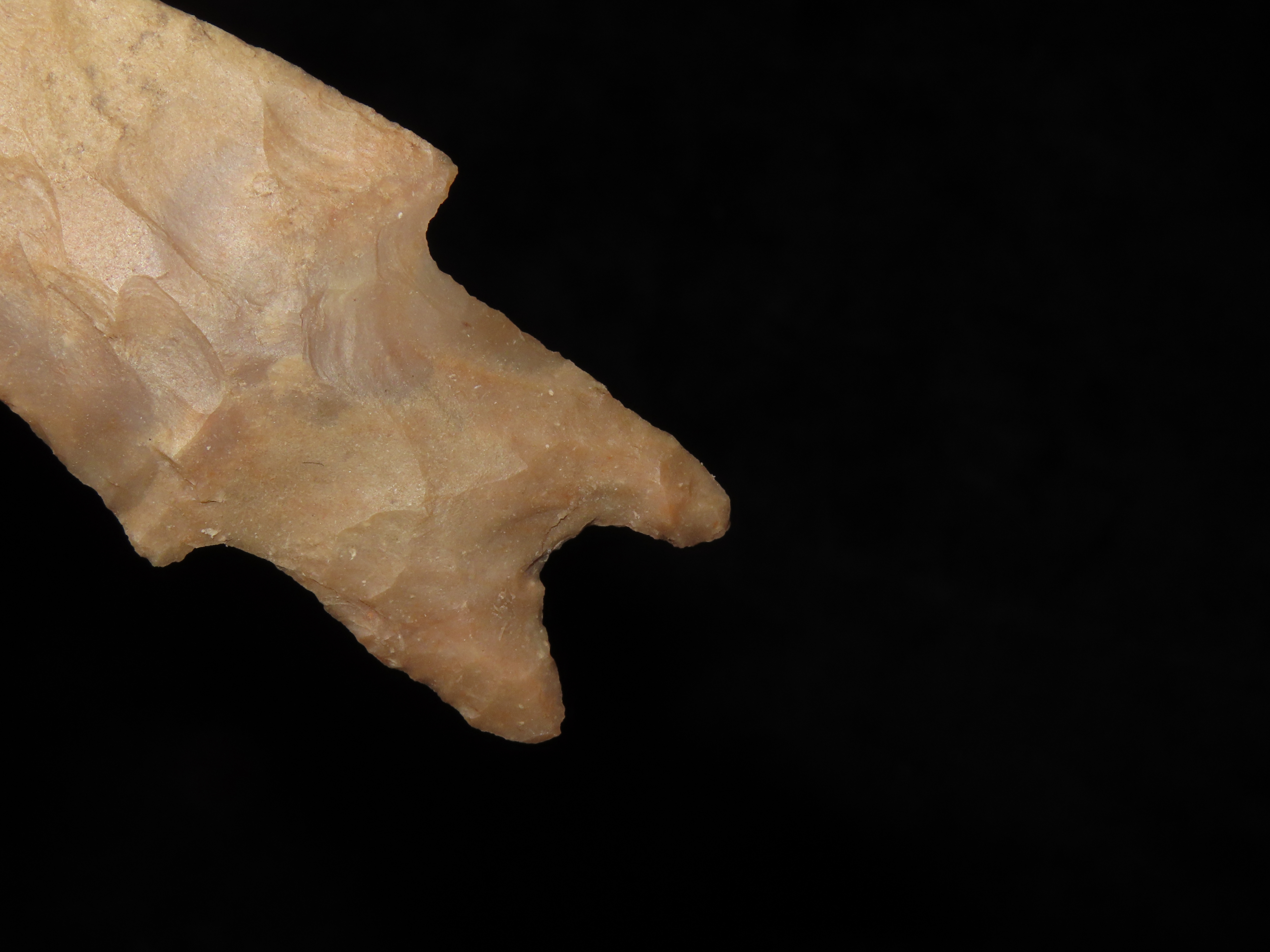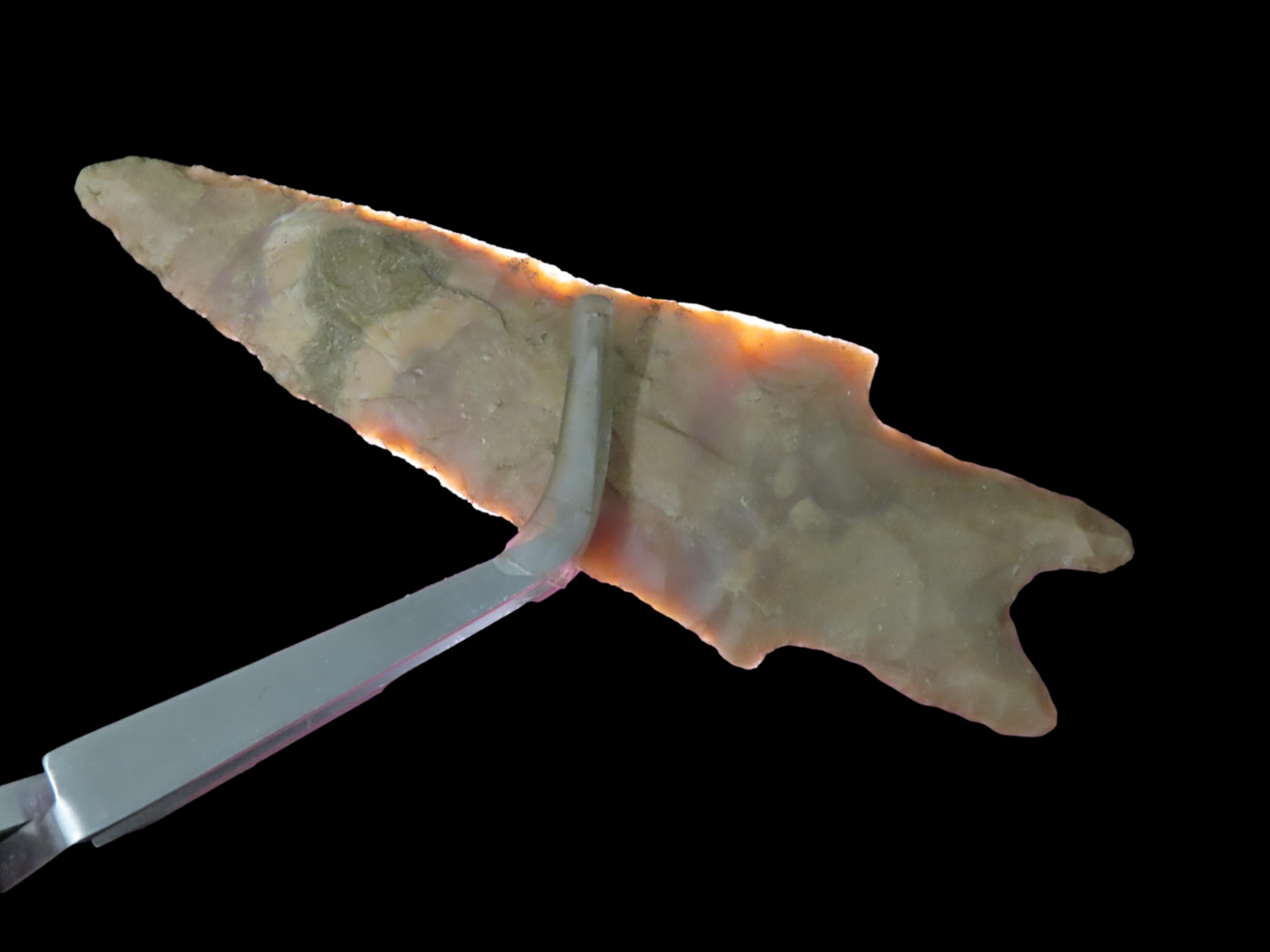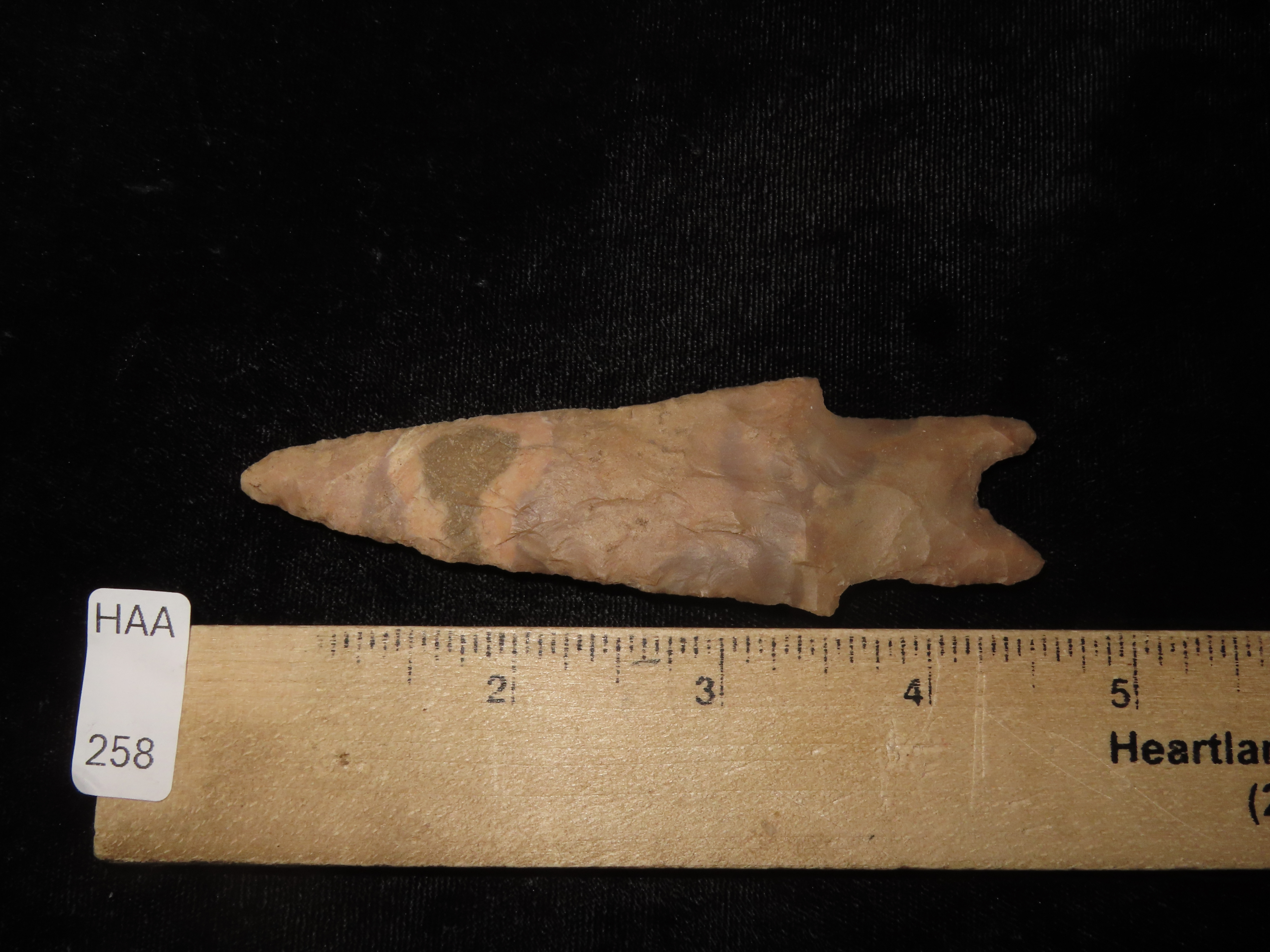 Colorful 4″ Pedernales, Bandera Co. Texas. Thin & well flaked with heavy patina & deposits. Nice colorful mottled brown, orange, and tan chert.