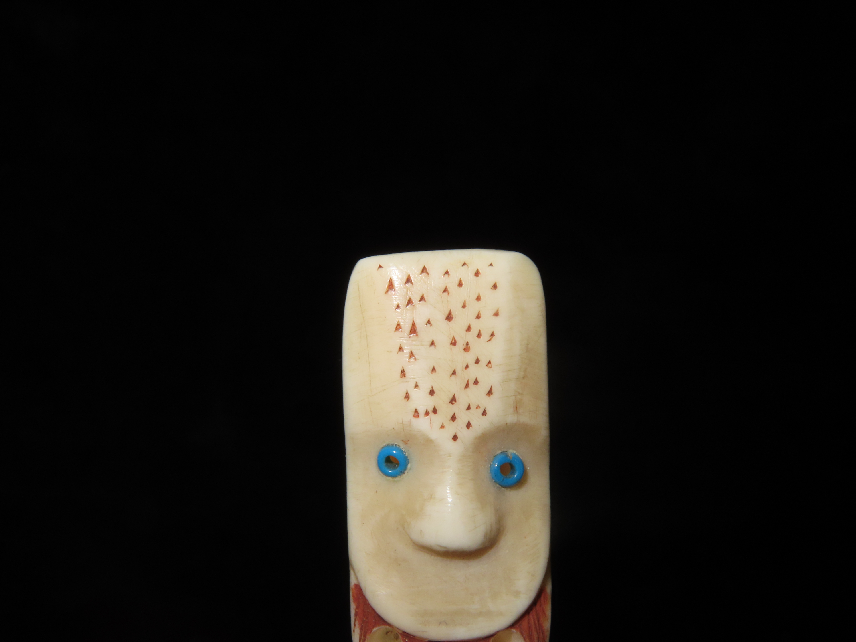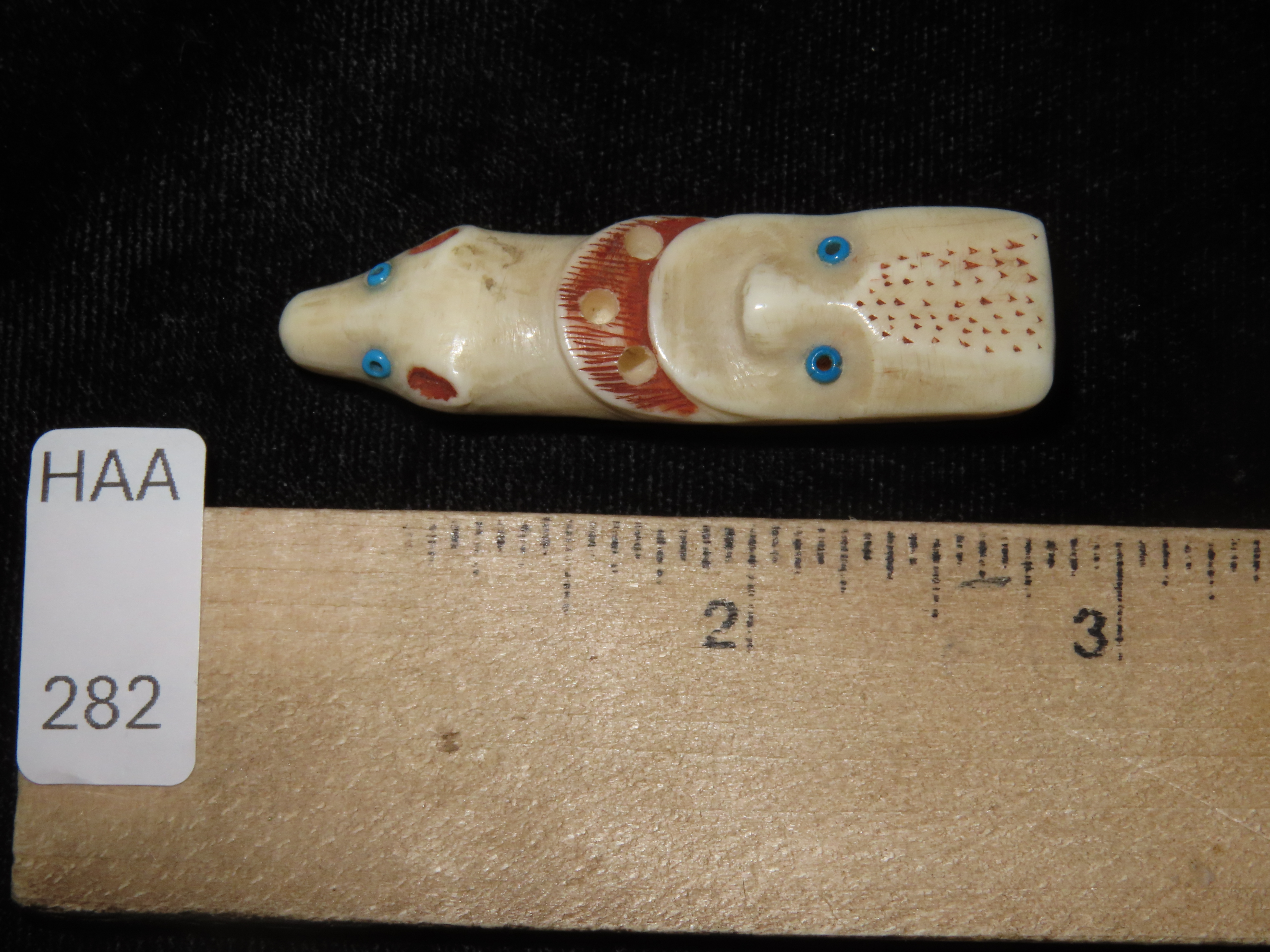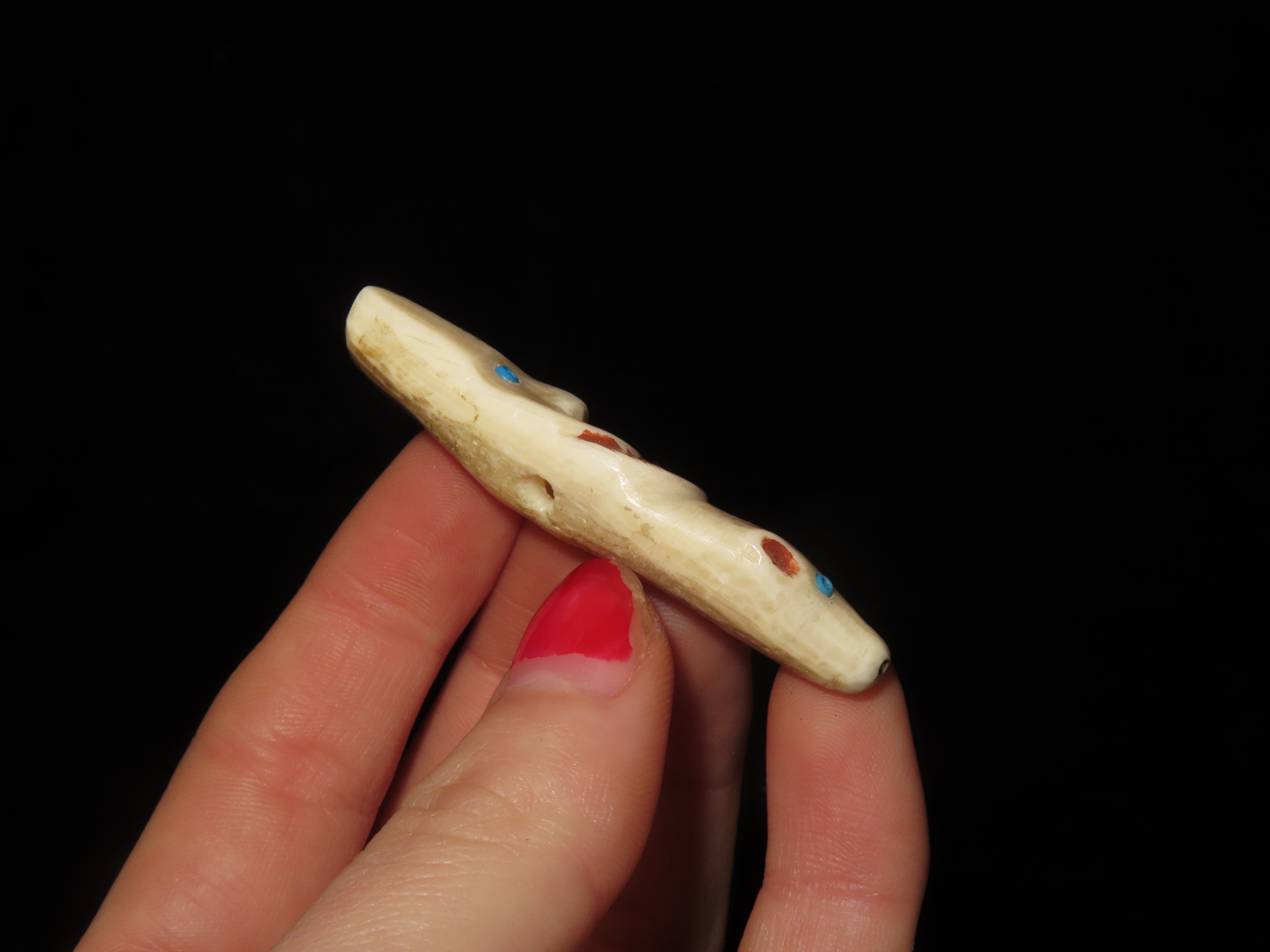 Amazing Northwest Coast Carved Bone Totem Effigy Pendant, Human & Bear effigies Intricately Carved in Relief with inlaid beads for the eyes. Drilled in the center on the back side for suspension. Very neat old piece.