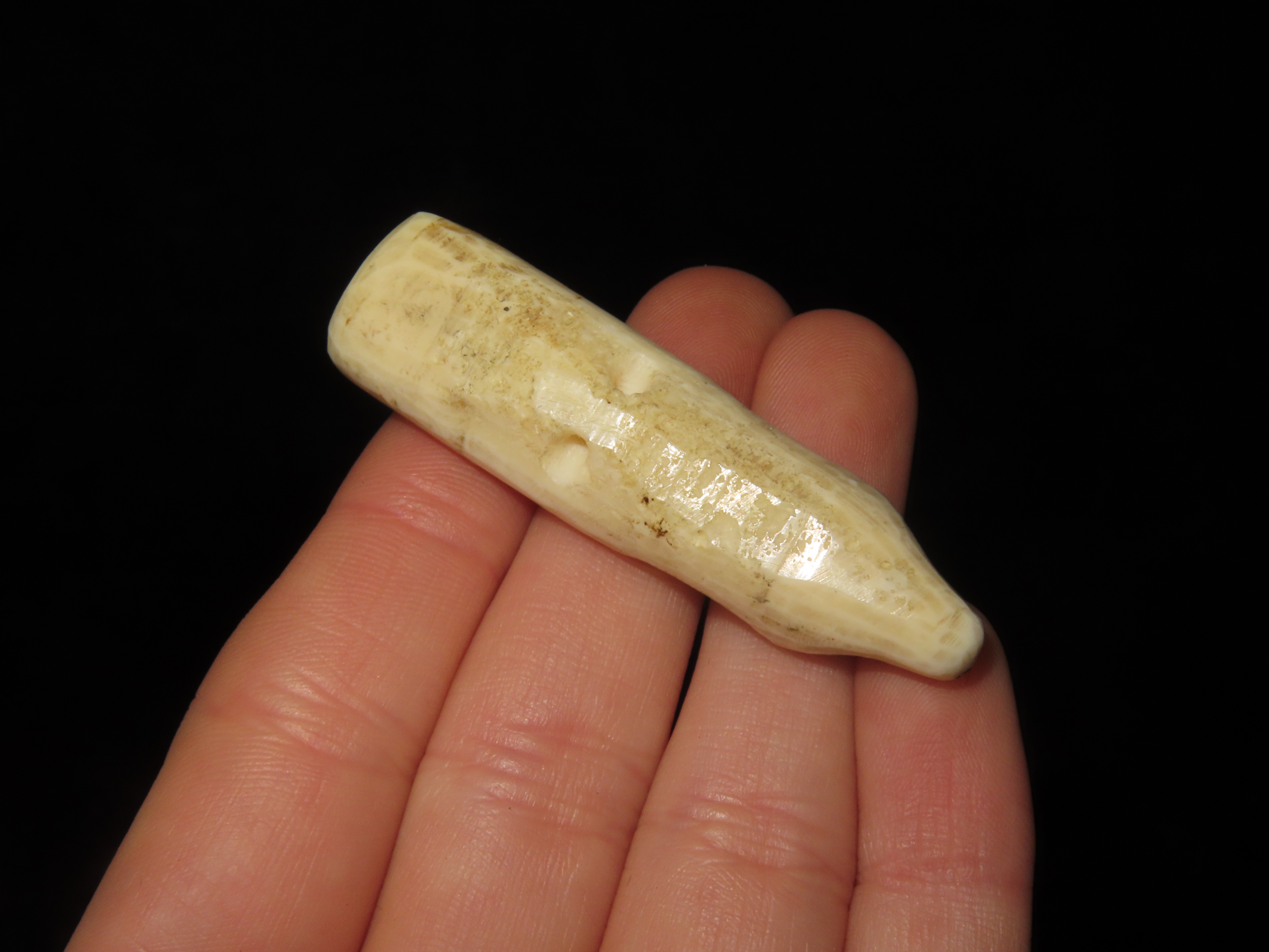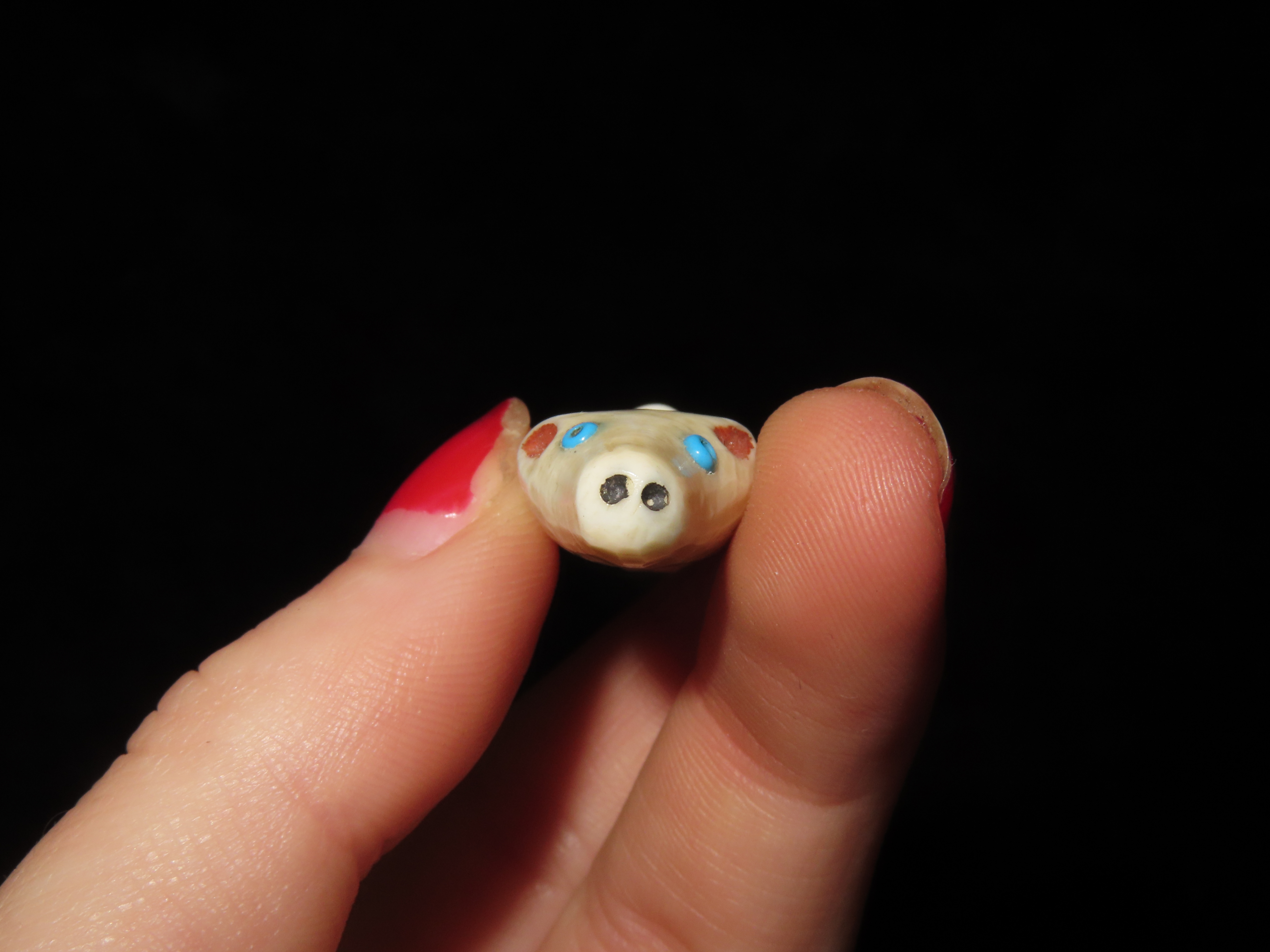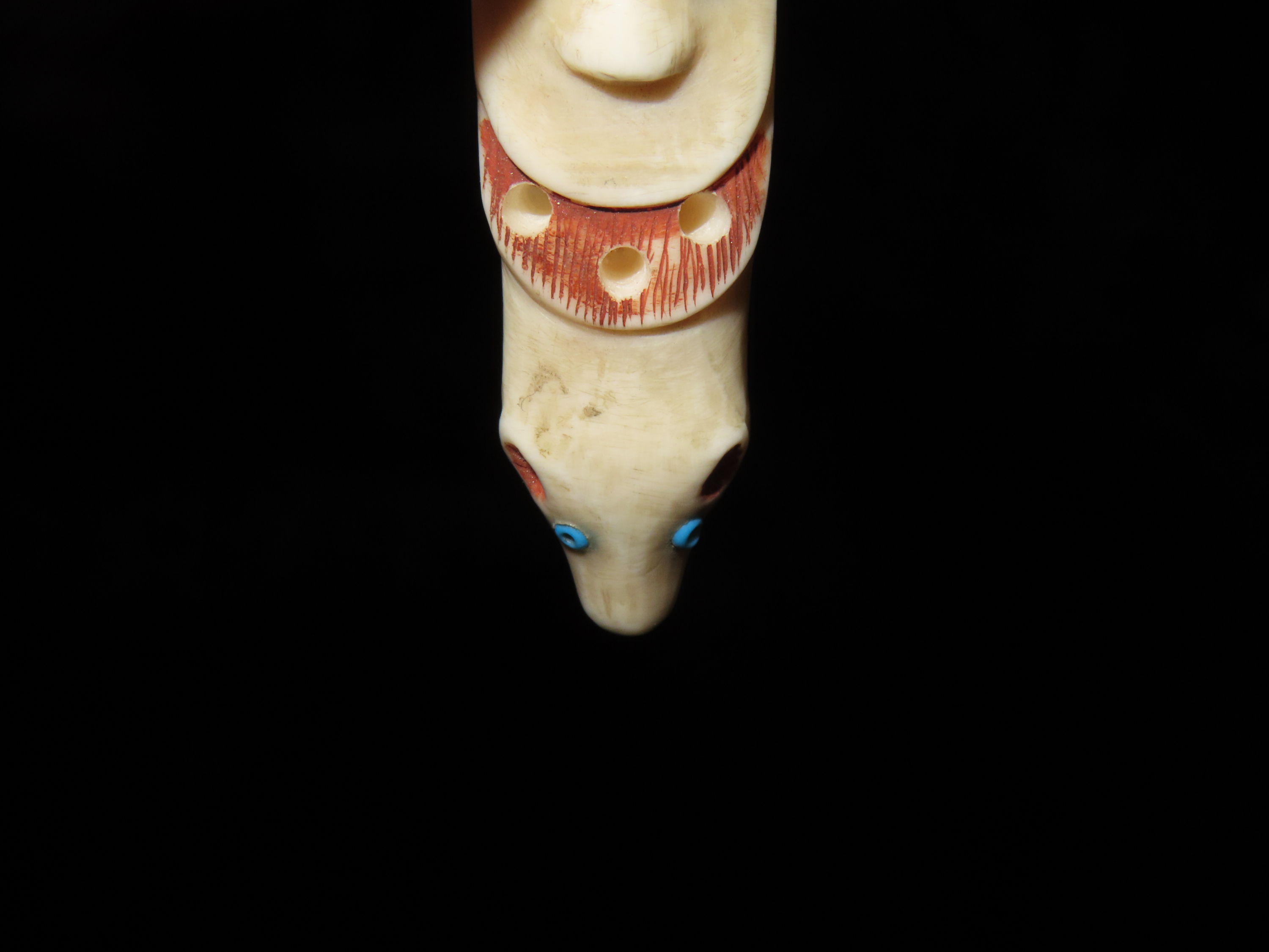 Amazing Northwest Coast Carved Bone Totem Effigy Pendant, Human & Bear effigies Intricately Carved in Relief with inlaid beads for the eyes. Drilled in the center on the back side for suspension. Very neat old piece.