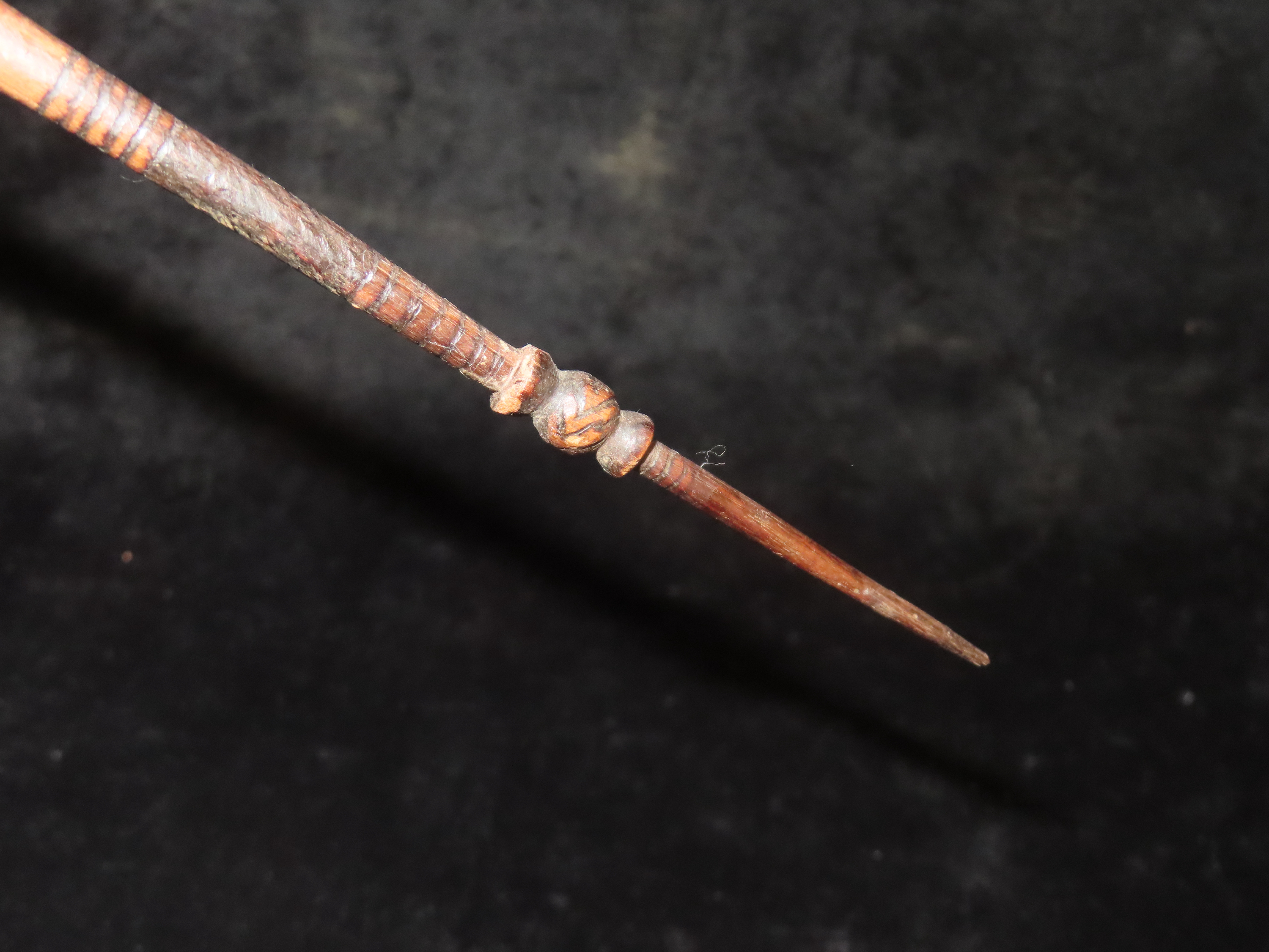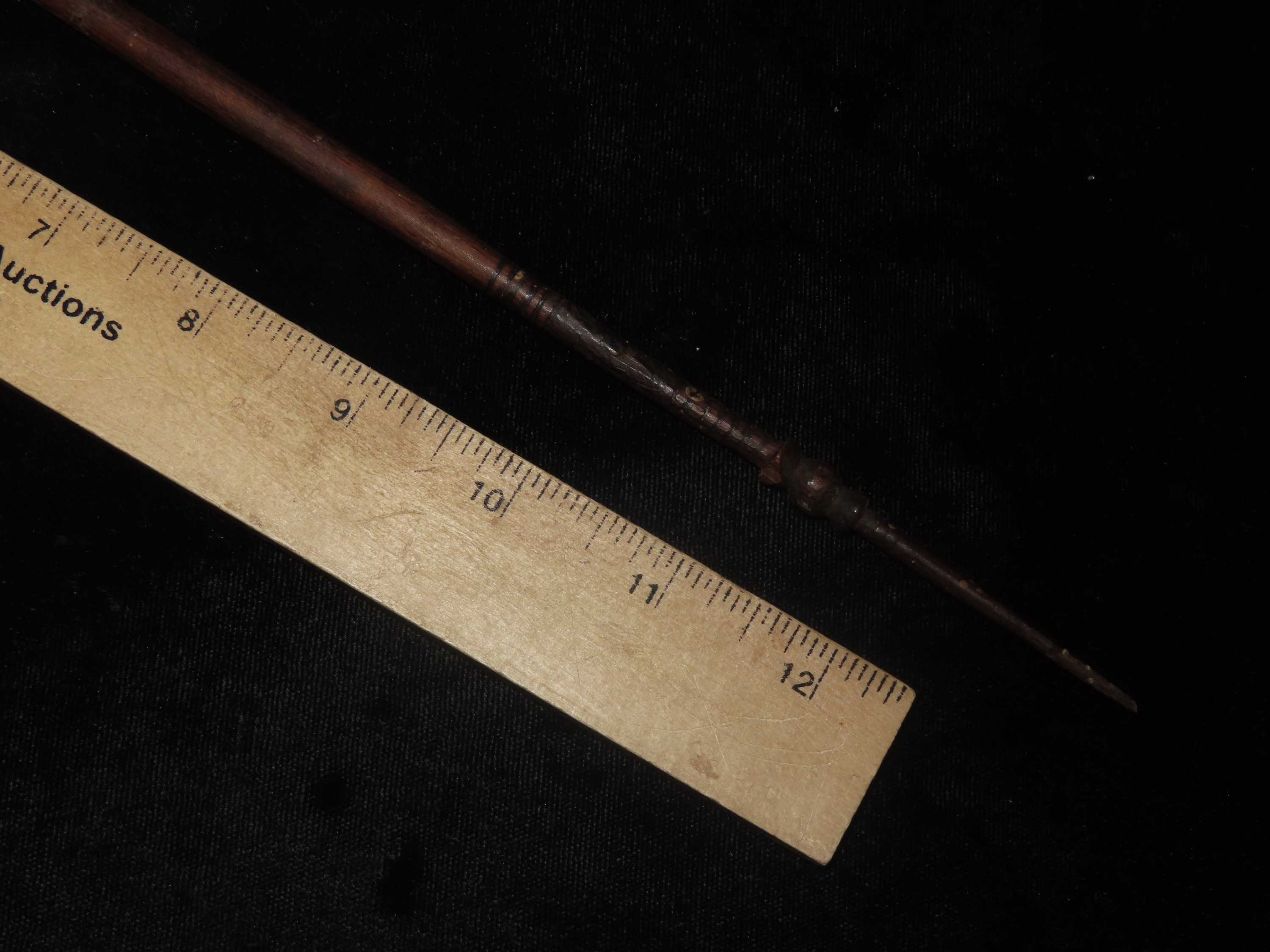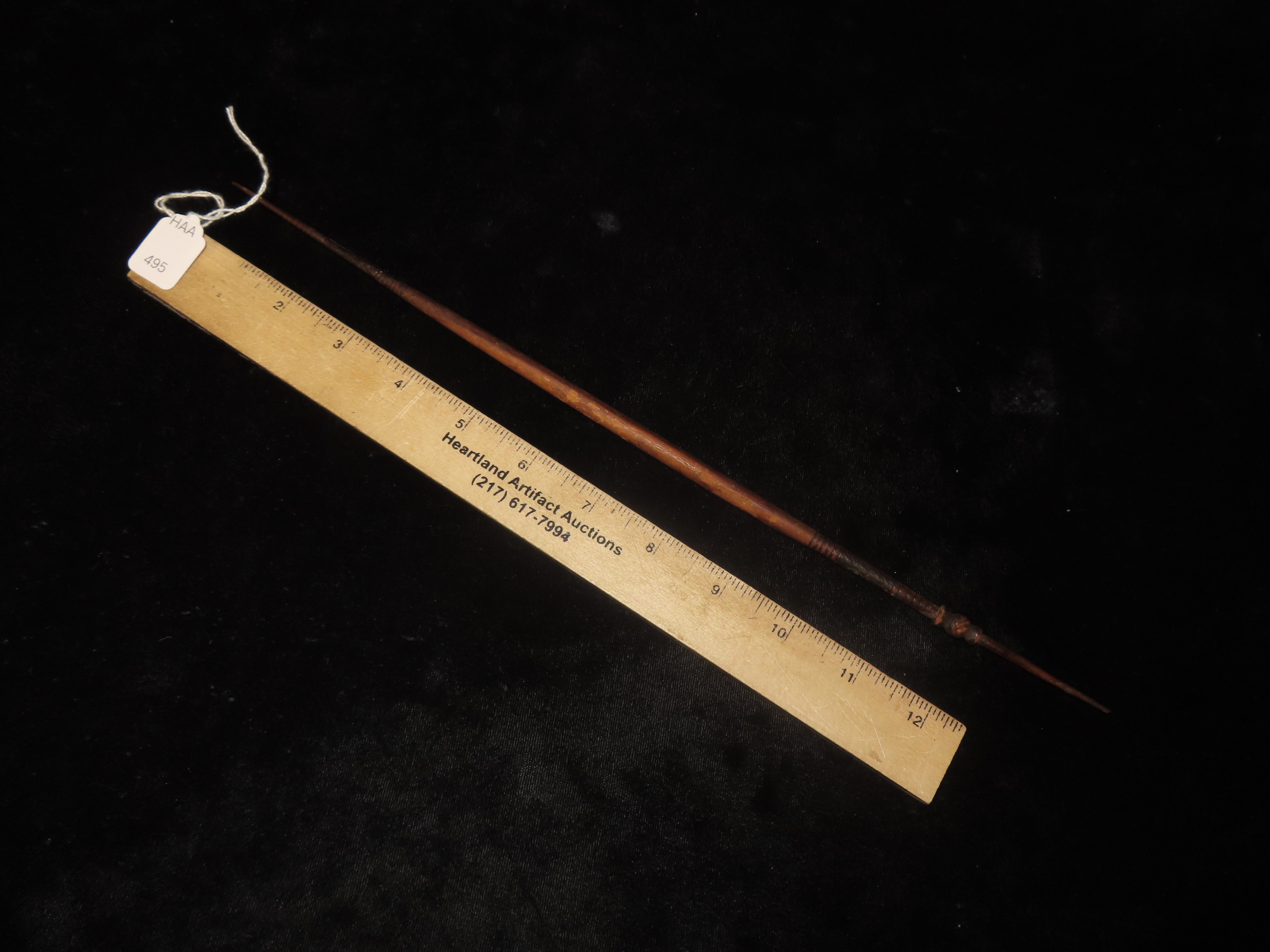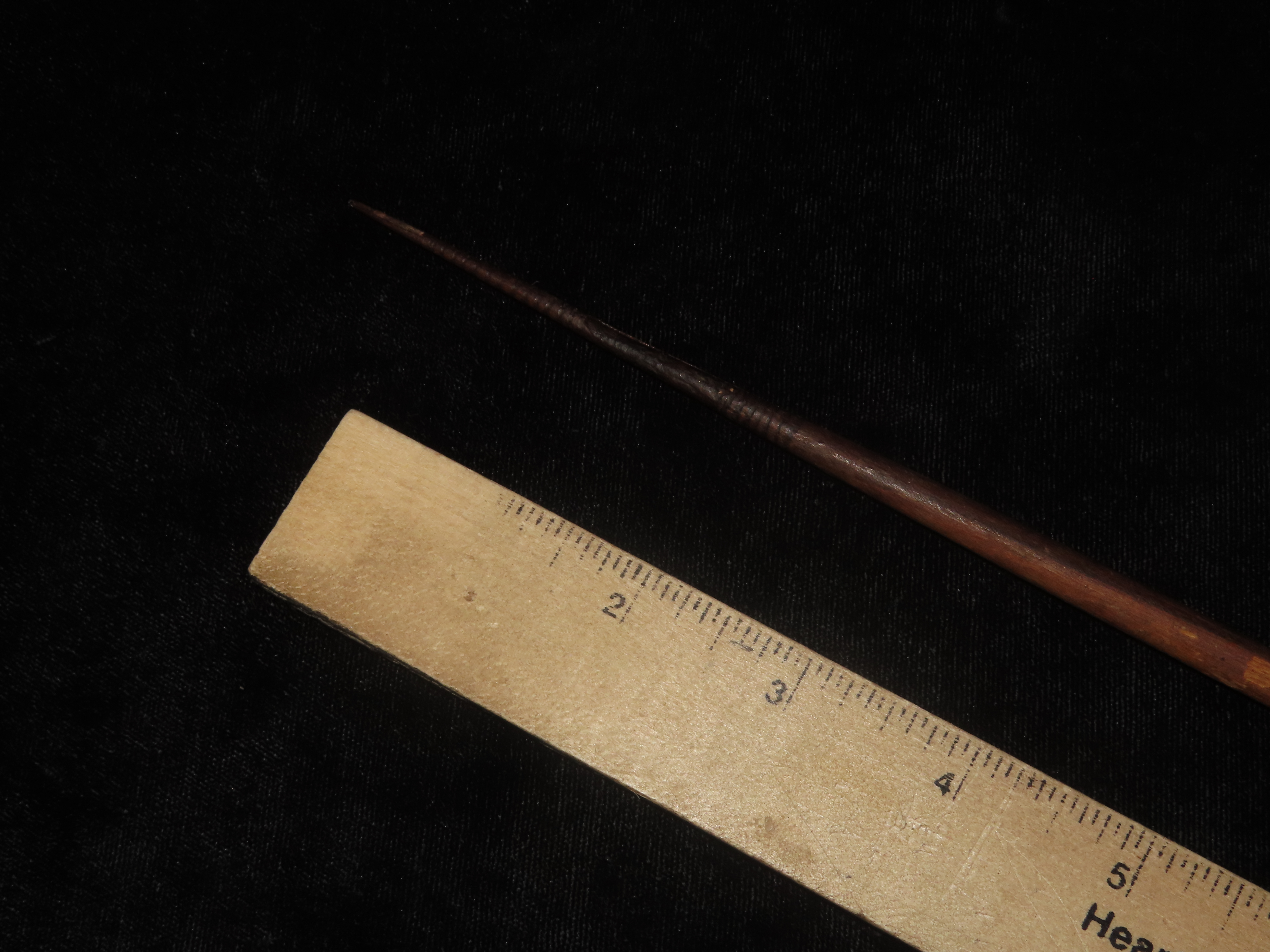 Amazing 14″ Original Spindle Whorl Loom Stick, Peru. Nicely Decorated Zexample with Original Painted designs still present. These were used in the processes for making textiles. Original Perishable Materials Circa 1000-1250 AD.