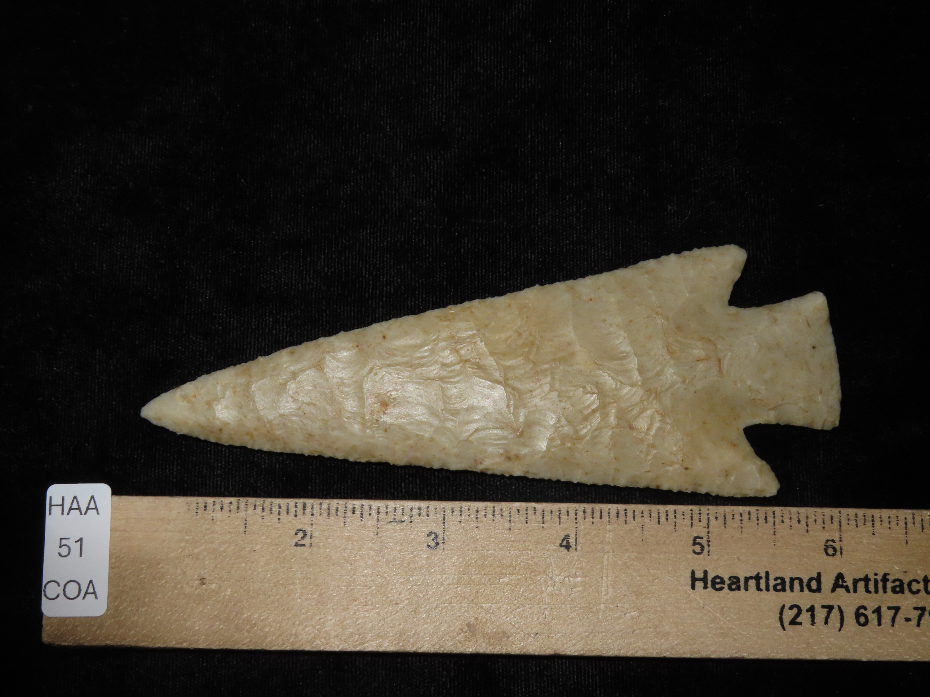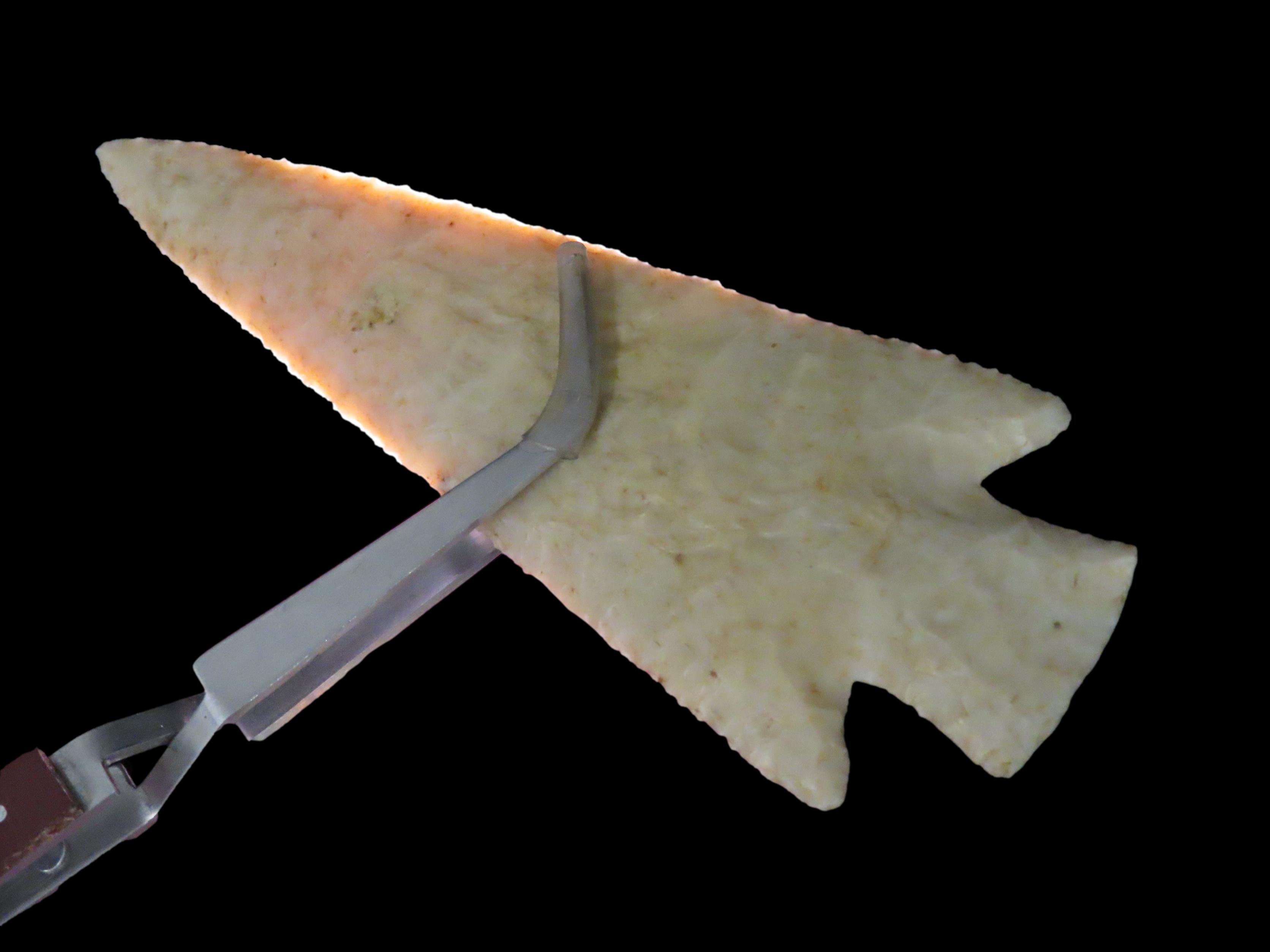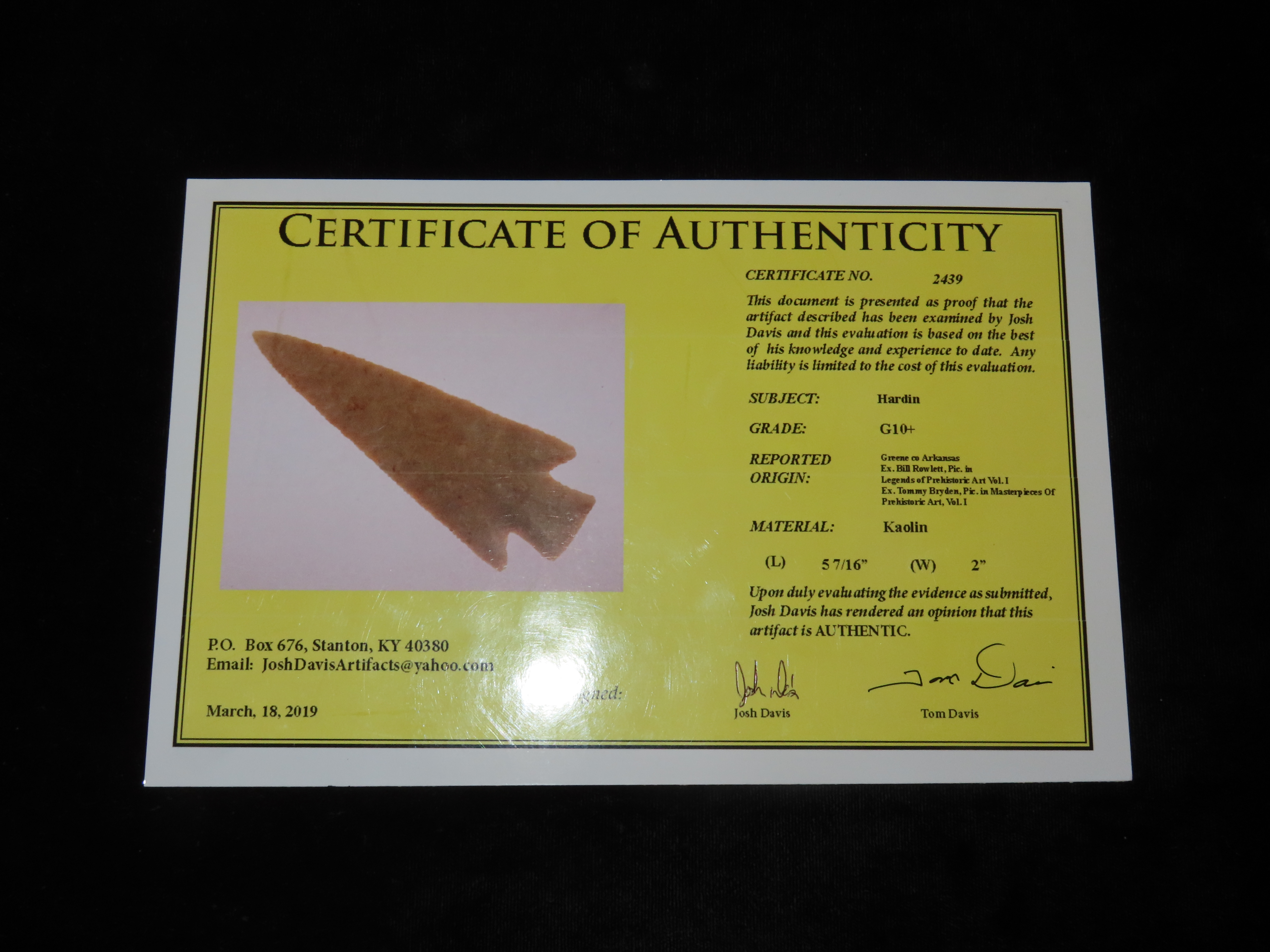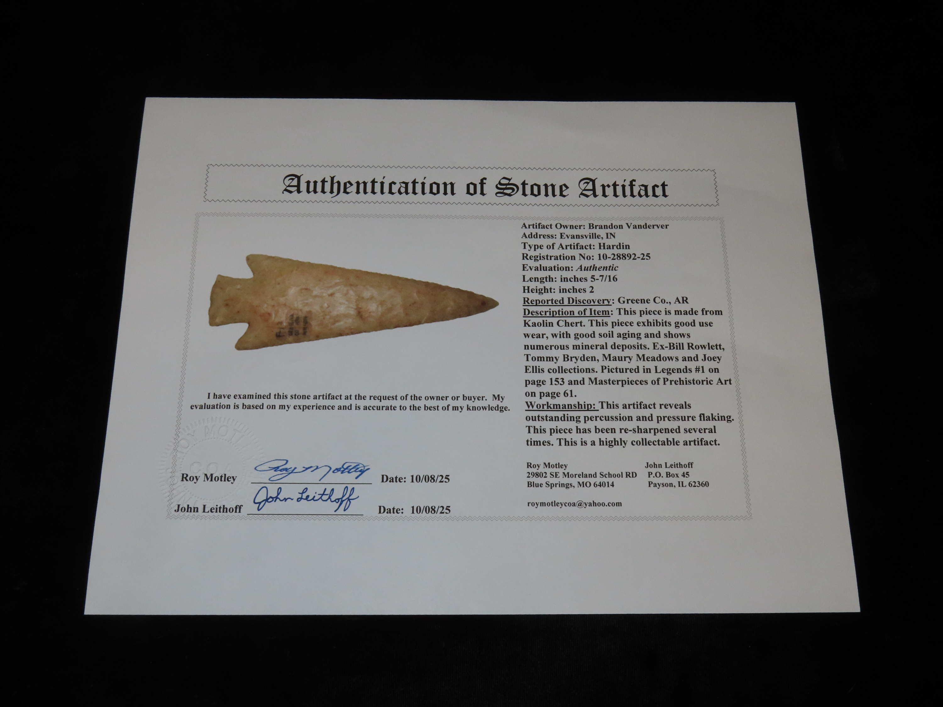 World Class 5 7/16″ Kaolin Hardin, Greene Co. Arkansas. Pictured. Roy Motley & Davis G10+ COA’s. Ex Collections of Bill Rowlett, Tommy Bryden, Maury Meadows, and Joey Ellis. Well pictured in Masterpieces of Prehistoric Art, page 61 and also in Legends 1, page 153. Made from highly Translucent Kaolin Flint, thin and expertlly flaked with great patination. This was the Centerpiece of Joey’s impressive Hardin Frame. A rare oppurtunity to own a true Masterpiece of an ancient relic!