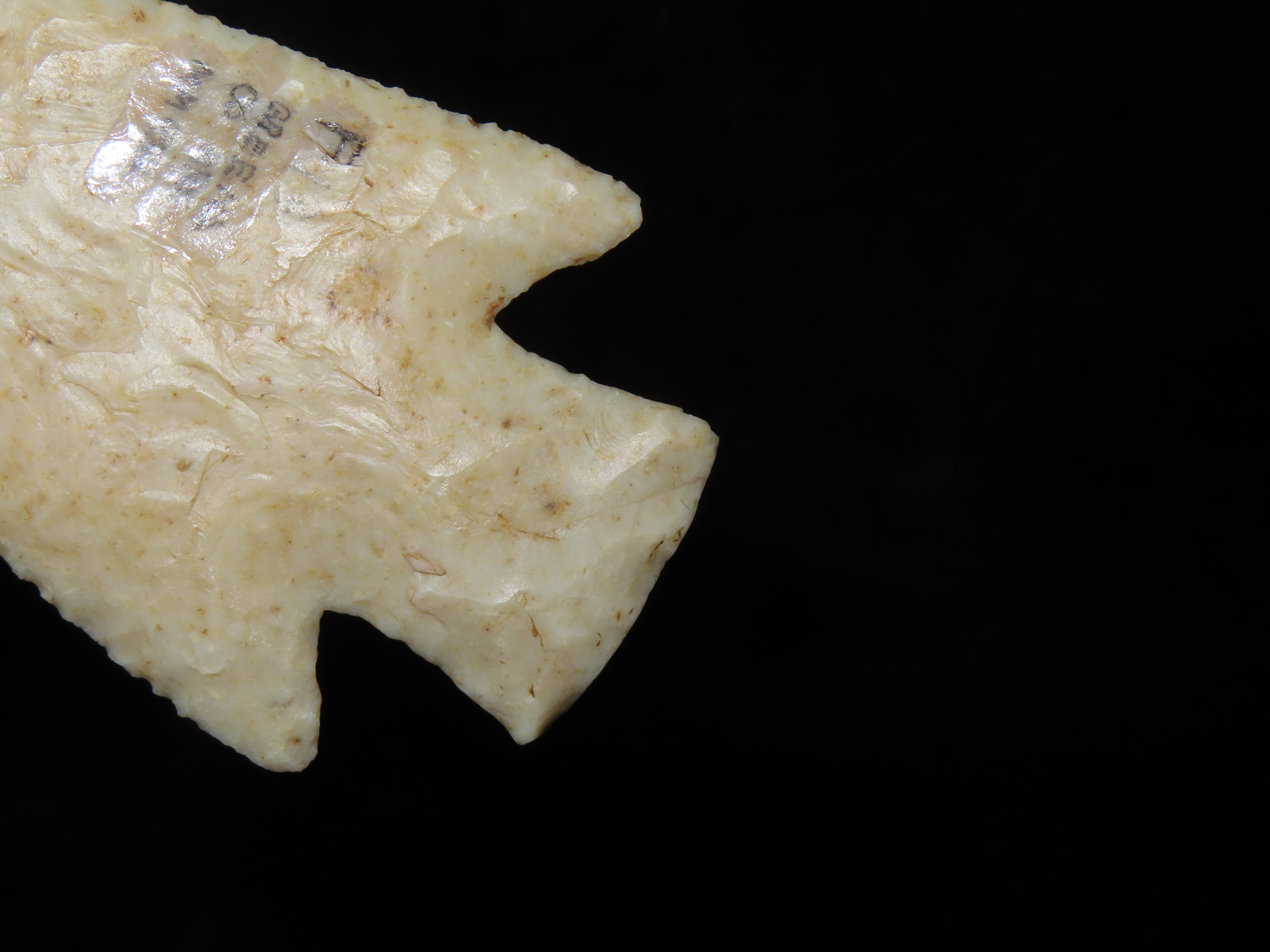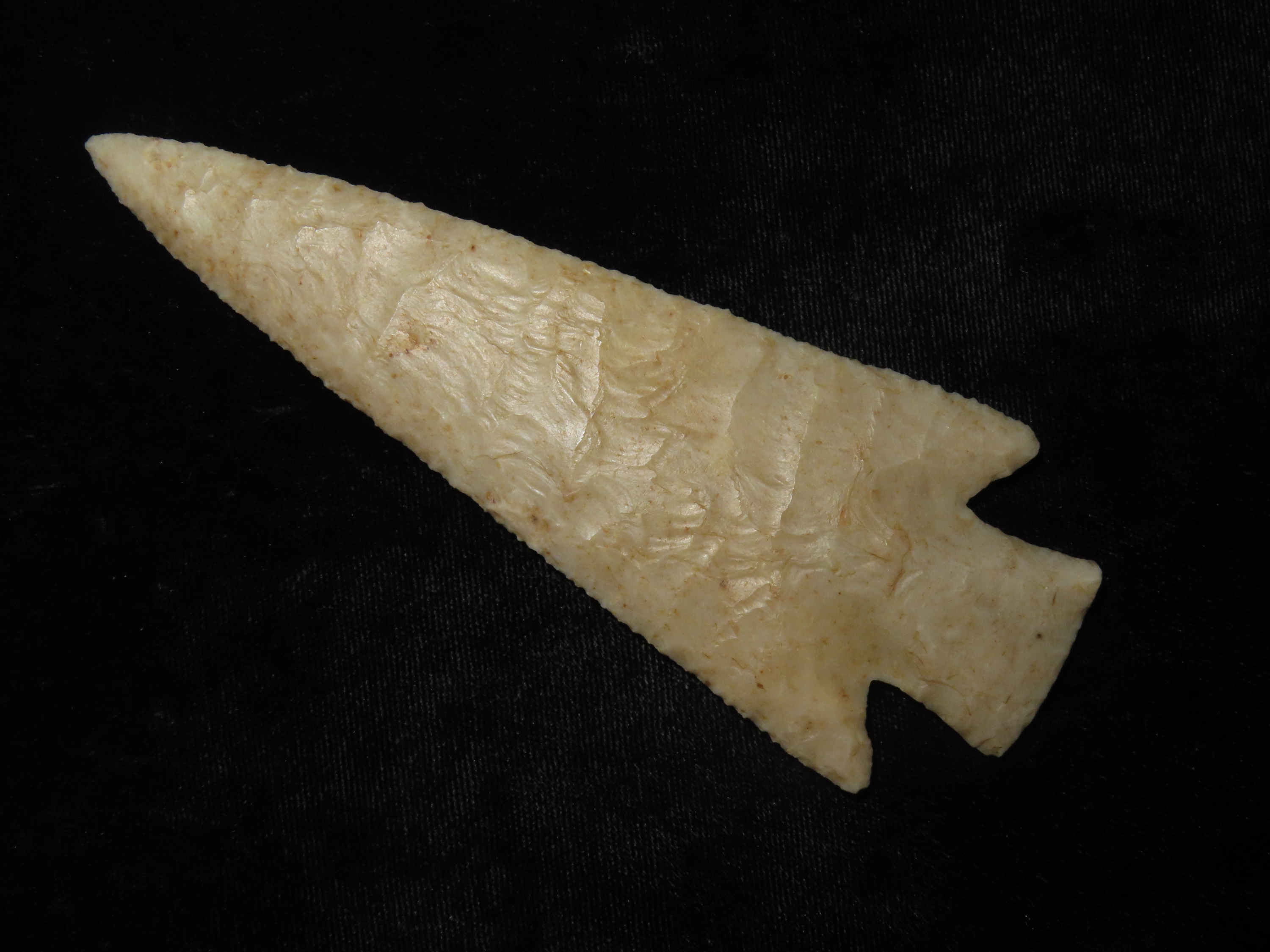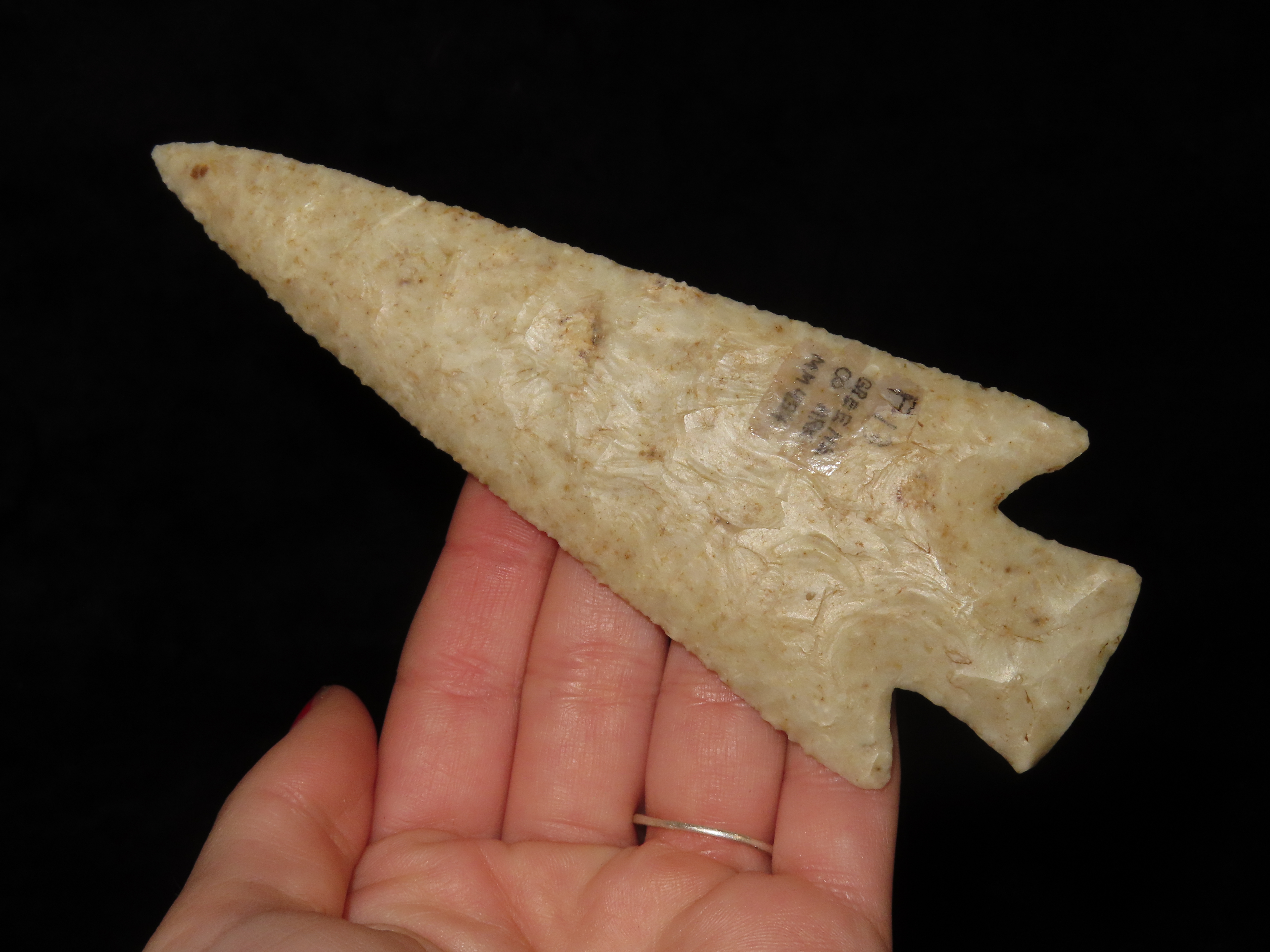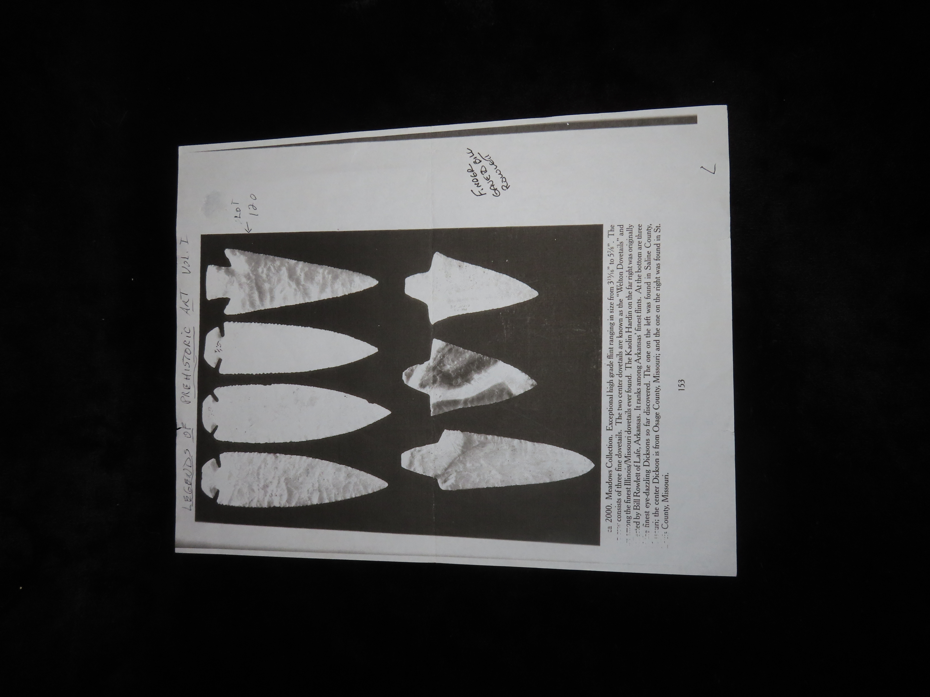 World Class 5 7/16″ Kaolin Hardin, Greene Co. Arkansas. Pictured. Roy Motley & Davis G10+ COA’s. Ex Collections of Bill Rowlett, Tommy Bryden, Maury Meadows, and Joey Ellis. Well pictured in Masterpieces of Prehistoric Art, page 61 and also in Legends 1, page 153. Made from highly Translucent Kaolin Flint, thin and expertlly flaked with great patination. This was the Centerpiece of Joey’s impressive Hardin Frame. A rare oppurtunity to own a true Masterpiece of an ancient relic!
