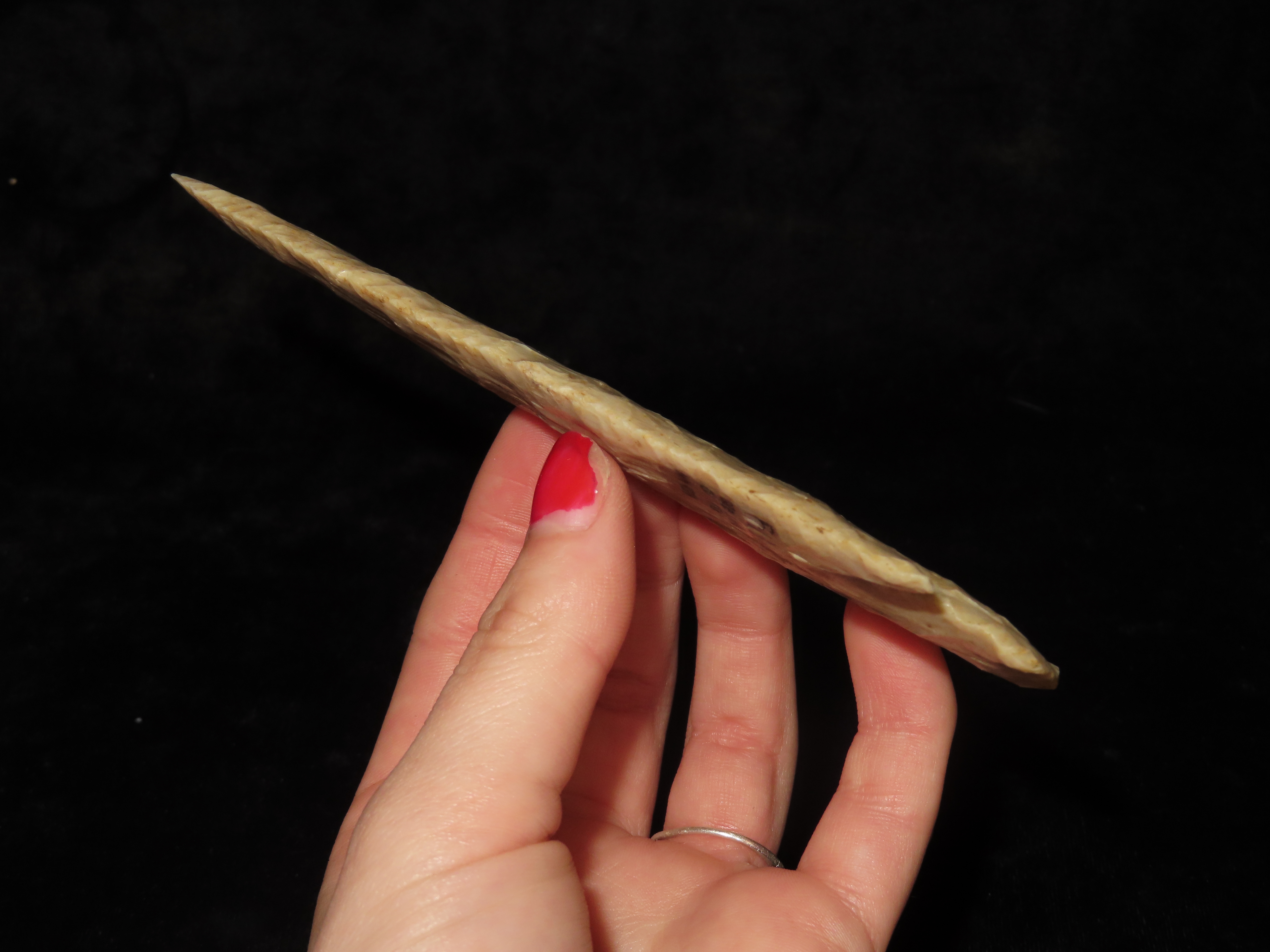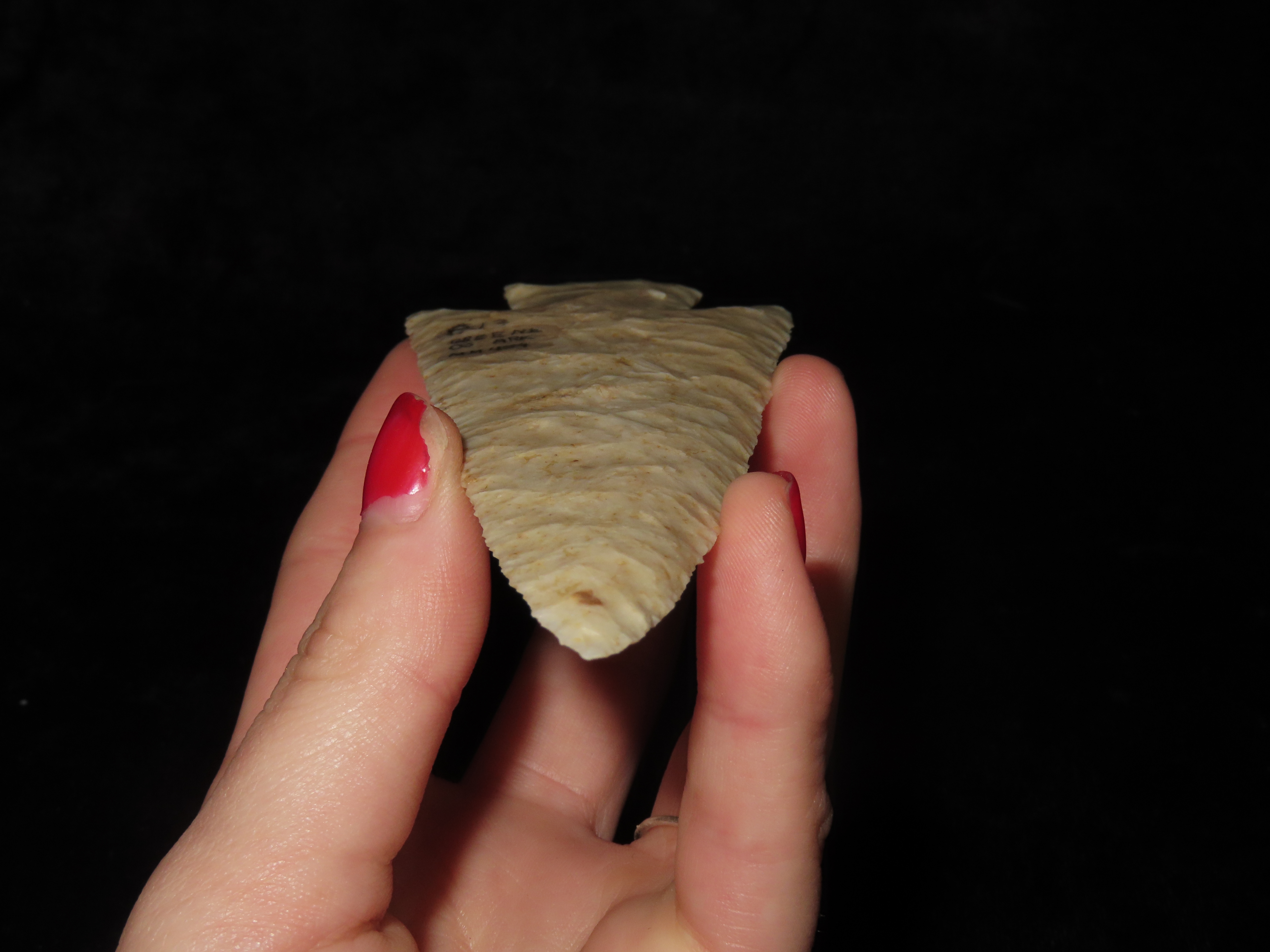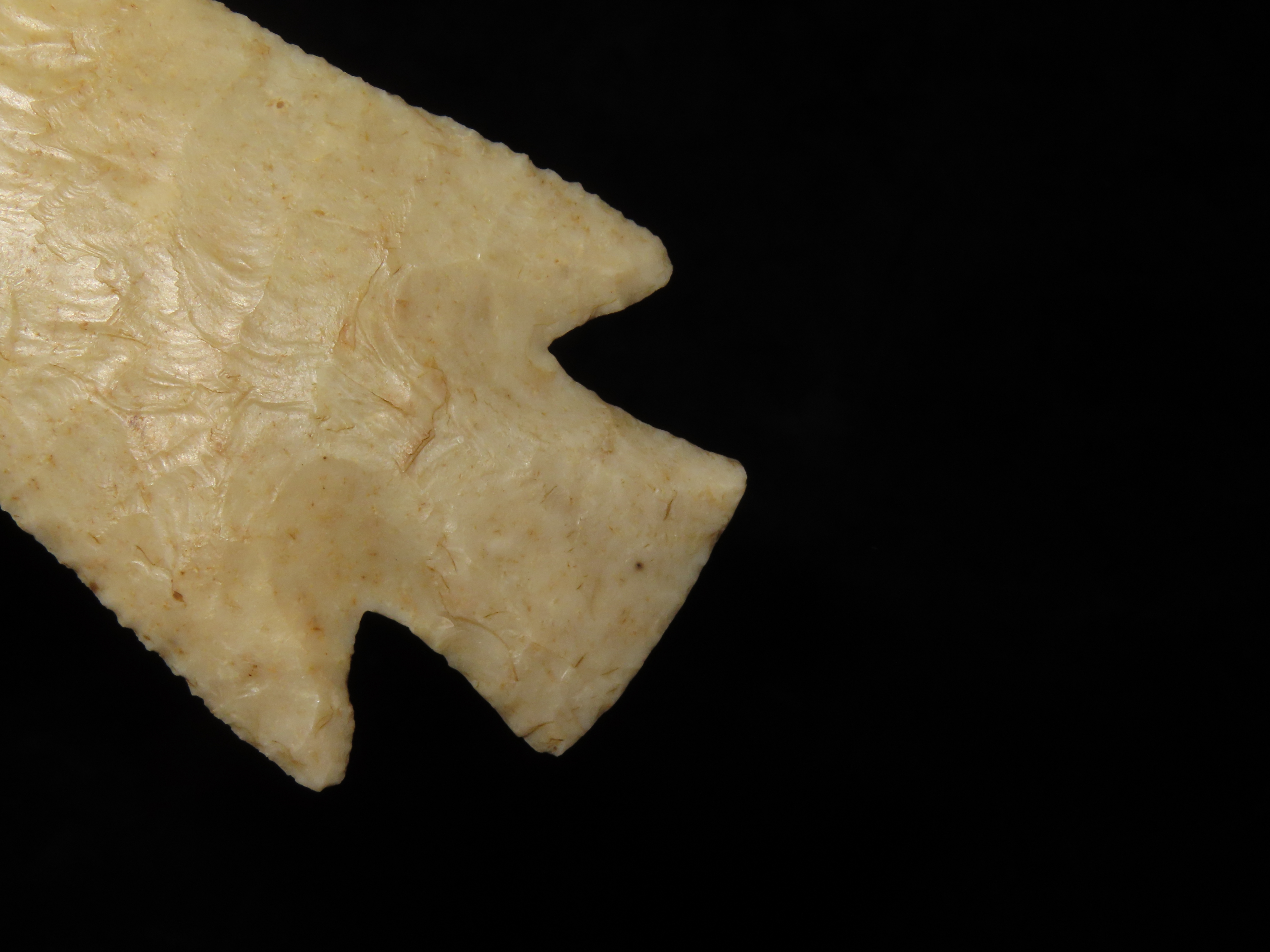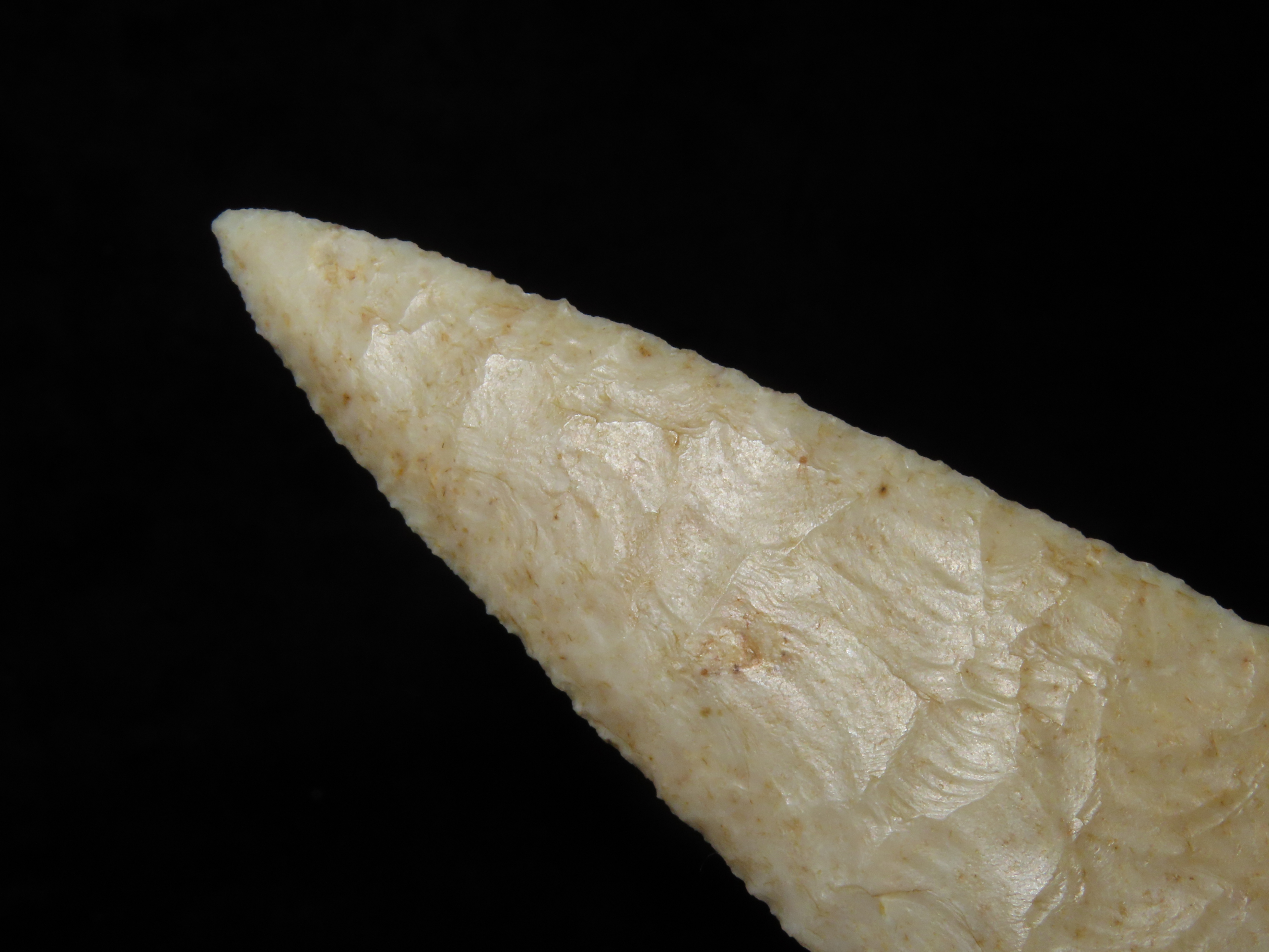 World Class 5 7/16″ Kaolin Hardin, Greene Co. Arkansas. Pictured. Roy Motley & Davis G10+ COA’s. Ex Collections of Bill Rowlett, Tommy Bryden, Maury Meadows, and Joey Ellis. Well pictured in Masterpieces of Prehistoric Art, page 61 and also in Legends 1, page 153. Made from highly Translucent Kaolin Flint, thin and expertlly flaked with great patination. This was the Centerpiece of Joey’s impressive Hardin Frame. A rare oppurtunity to own a true Masterpiece of an ancient relic!