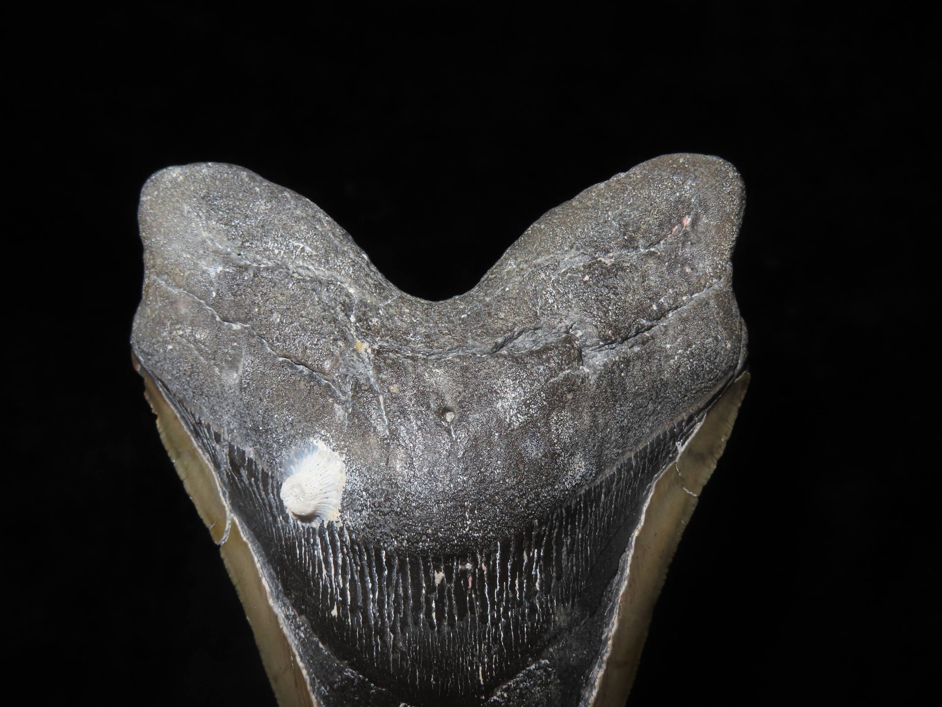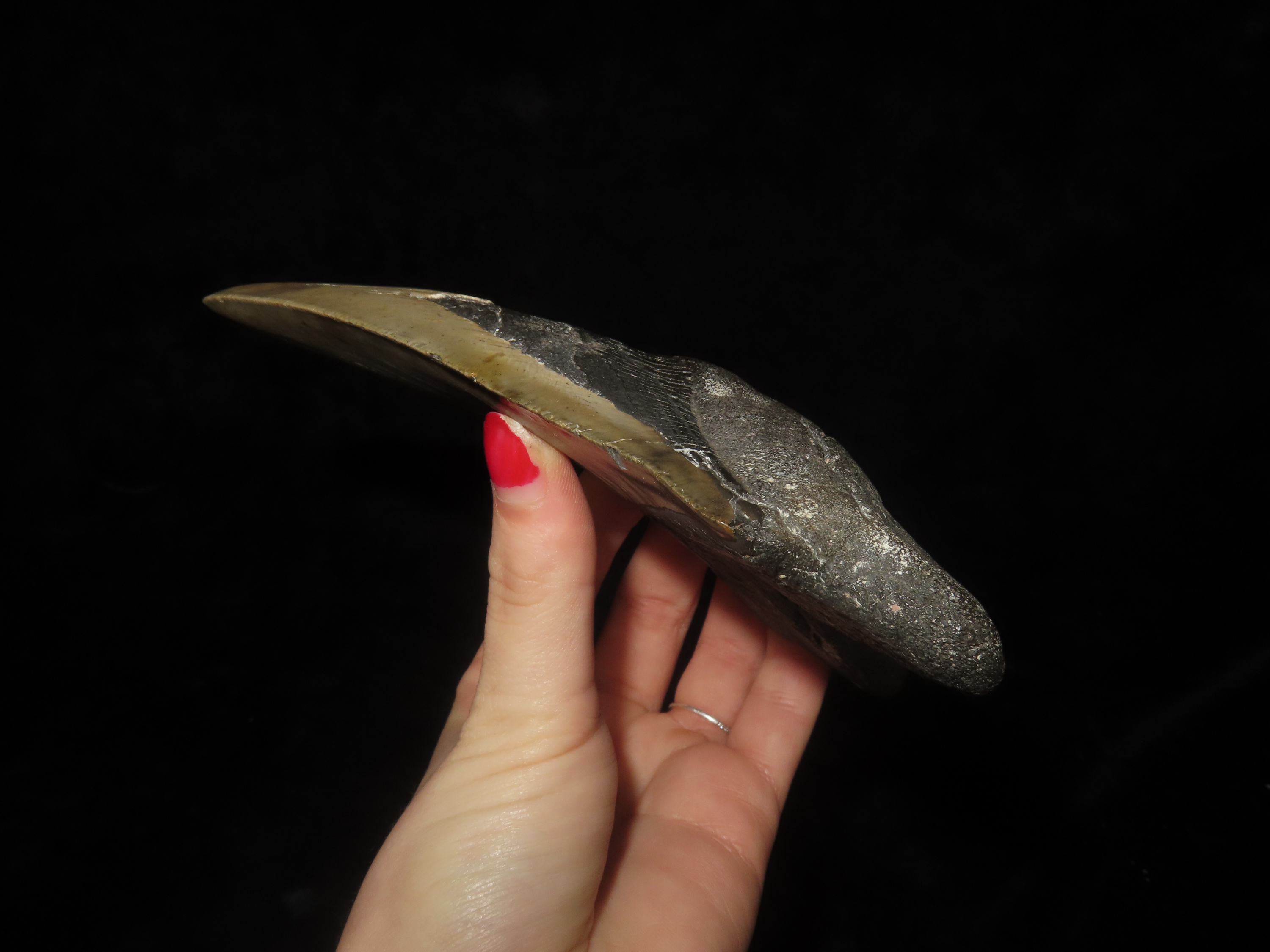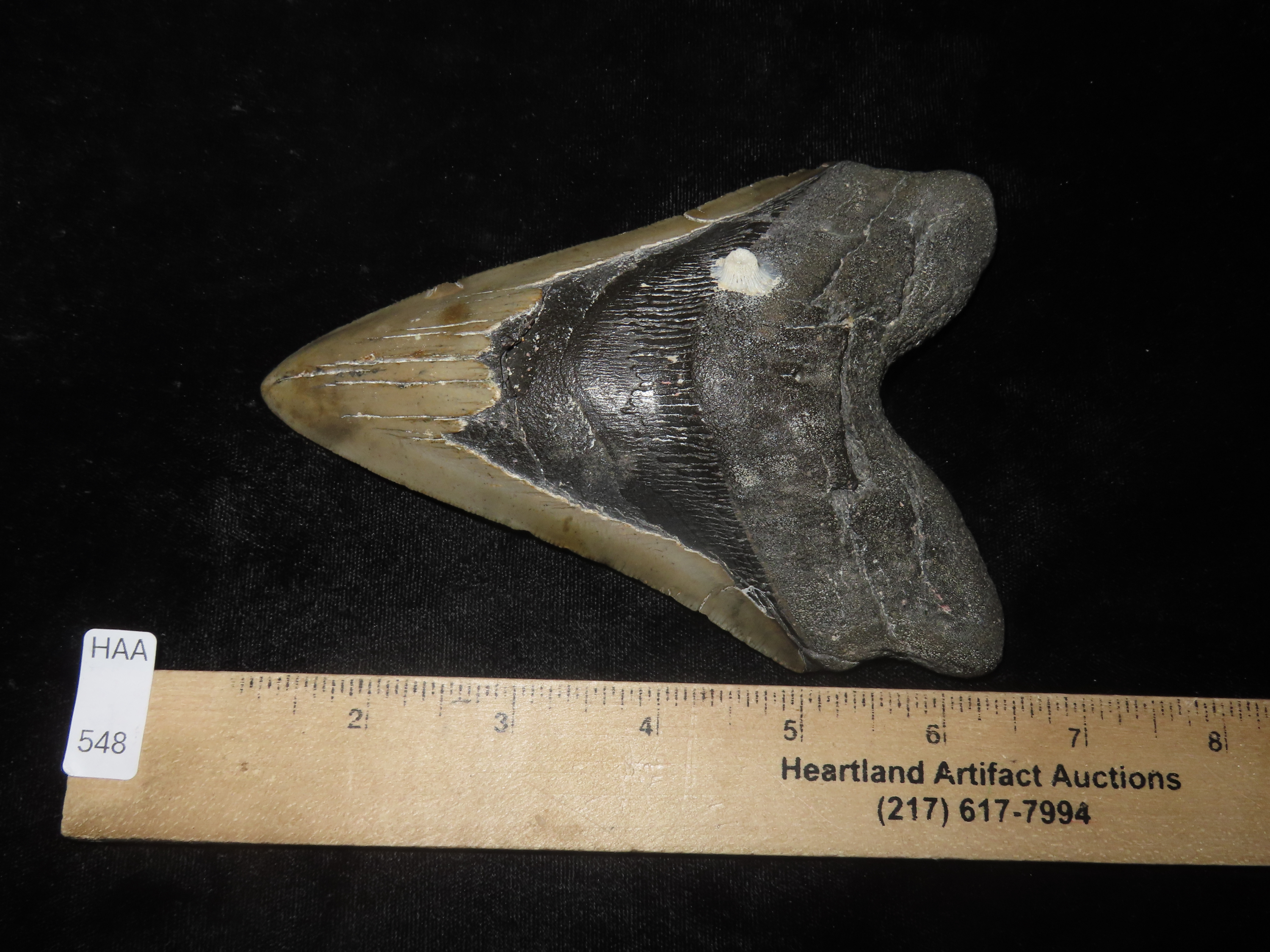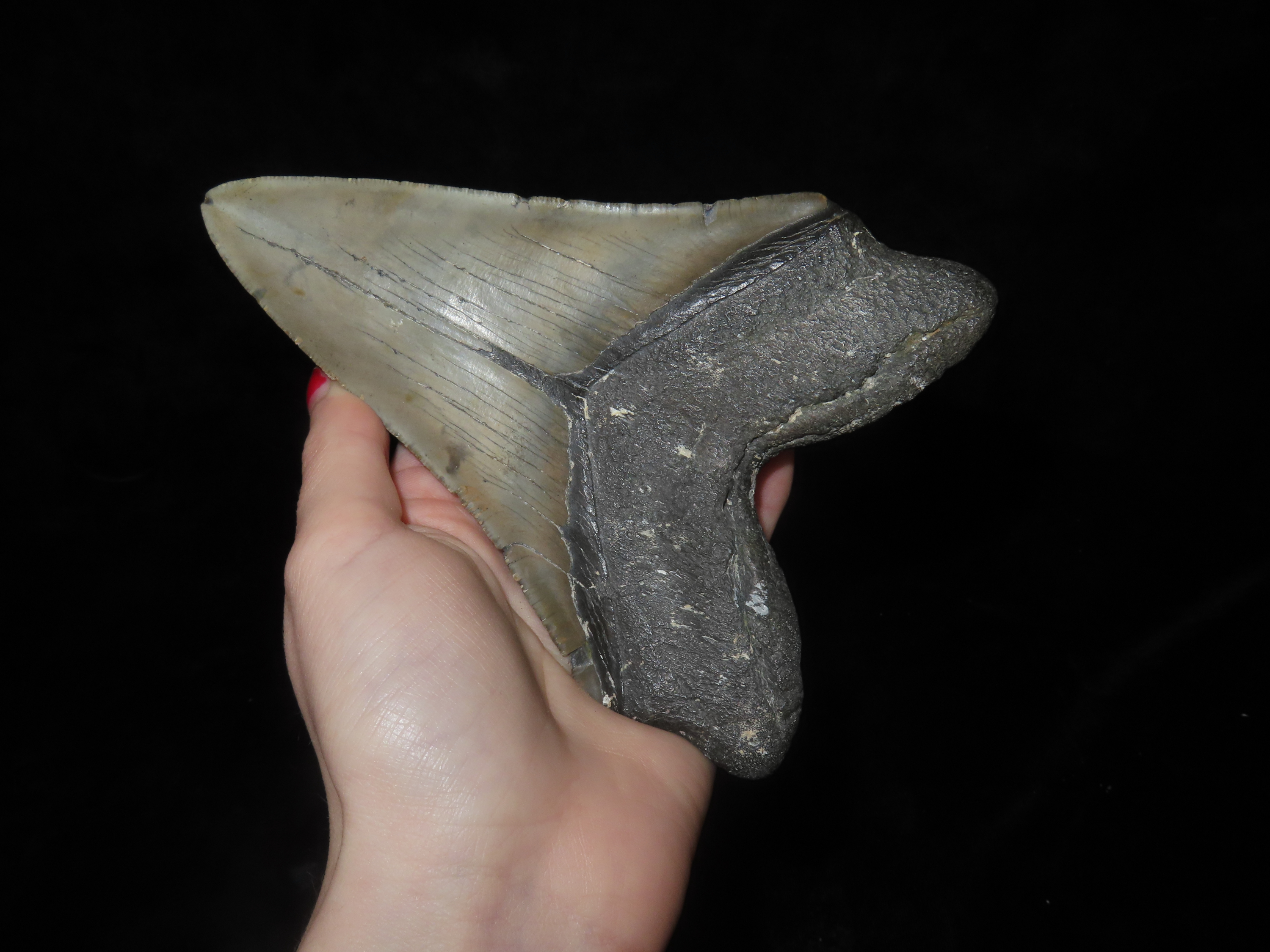 Impressive HUGE 5 15/16″ Megalodon Shark Tooth, Nice Sharp serrated edges! 2.5-23 Million Year Old Fossil found off the coast of the Carolinas. No Repair, No Resto, No Polishing. Super Example with nice symetrical form!