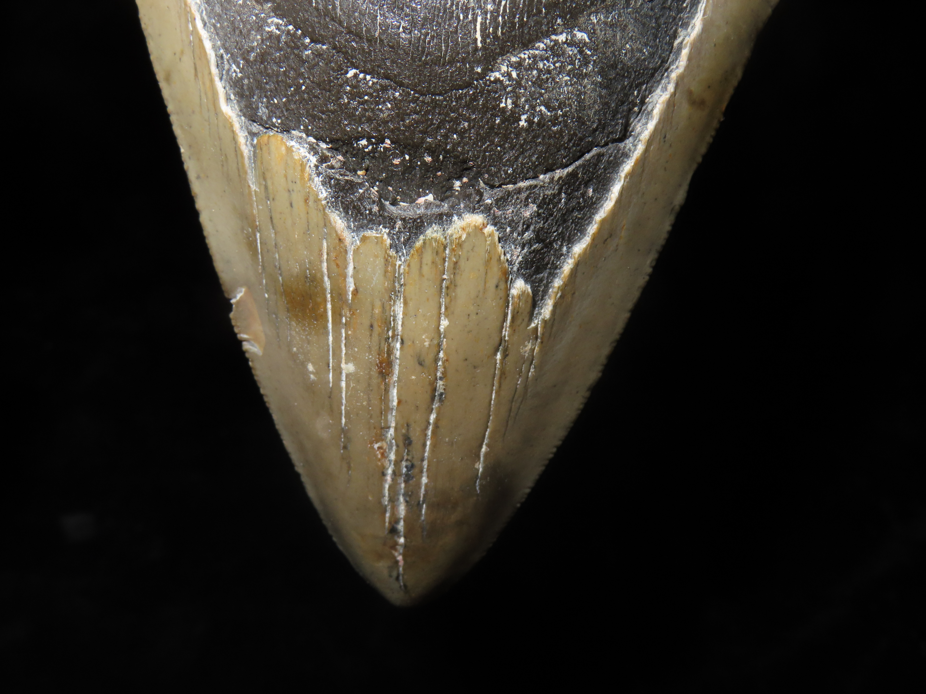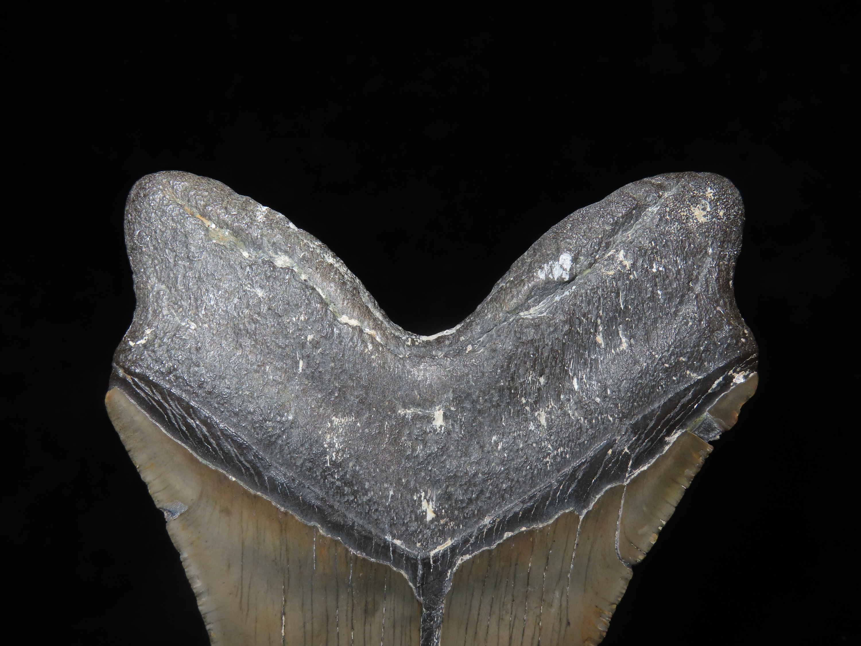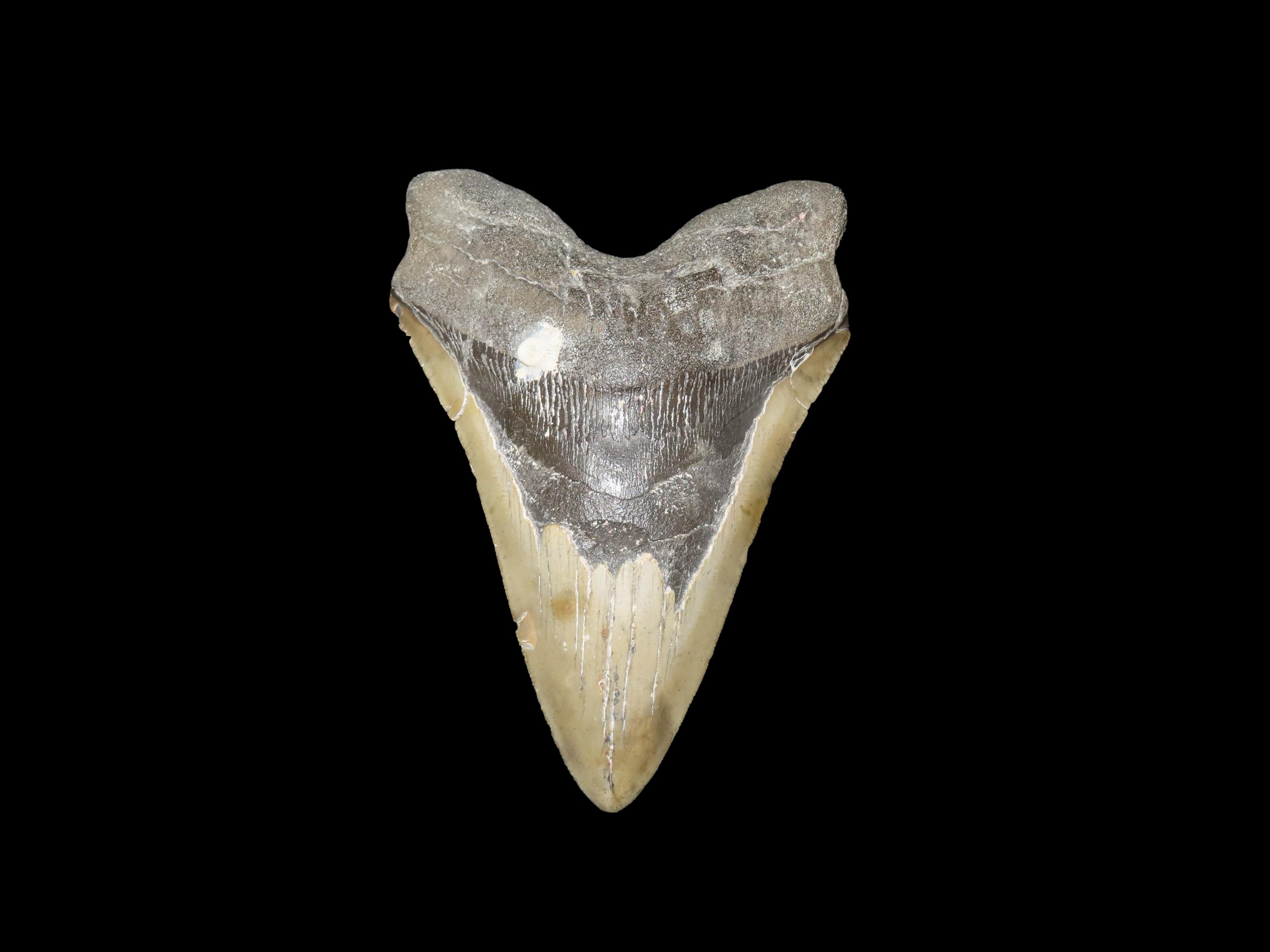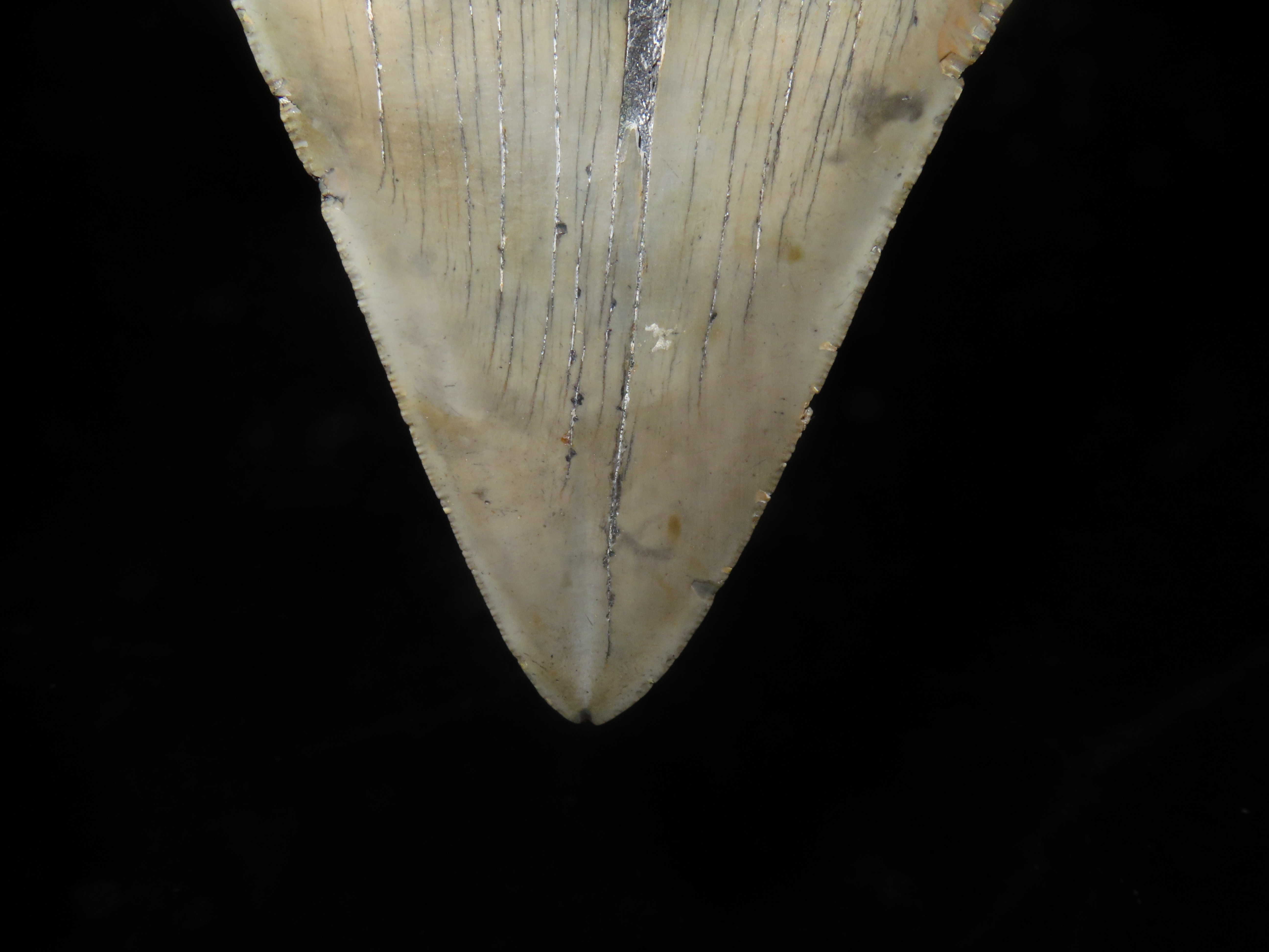 Impressive HUGE 5 15/16″ Megalodon Shark Tooth, Nice Sharp serrated edges! 2.5-23 Million Year Old Fossil found off the coast of the Carolinas. No Repair, No Resto, No Polishing. Super Example with nice symetrical form!