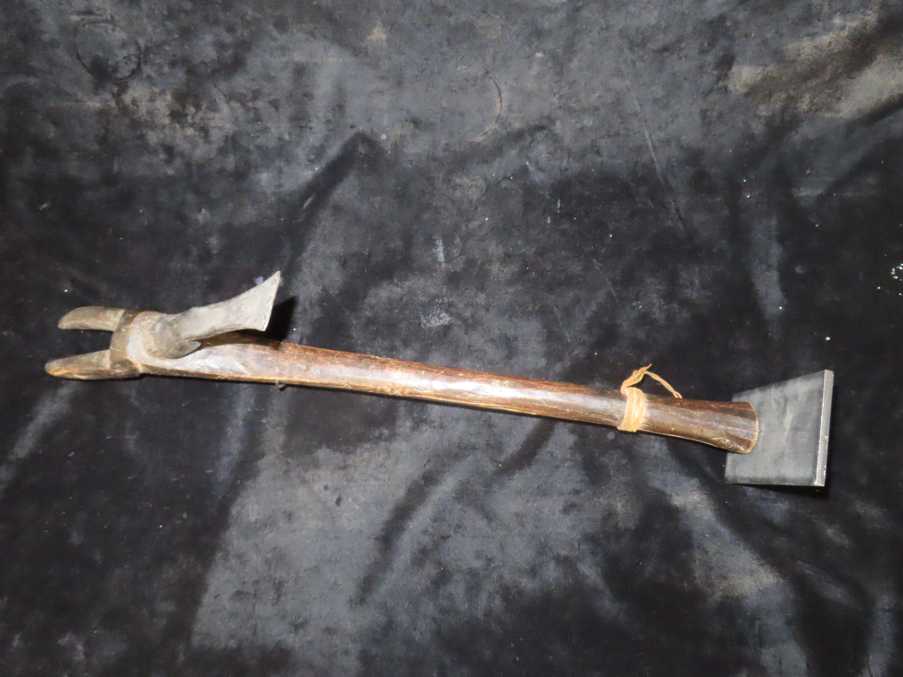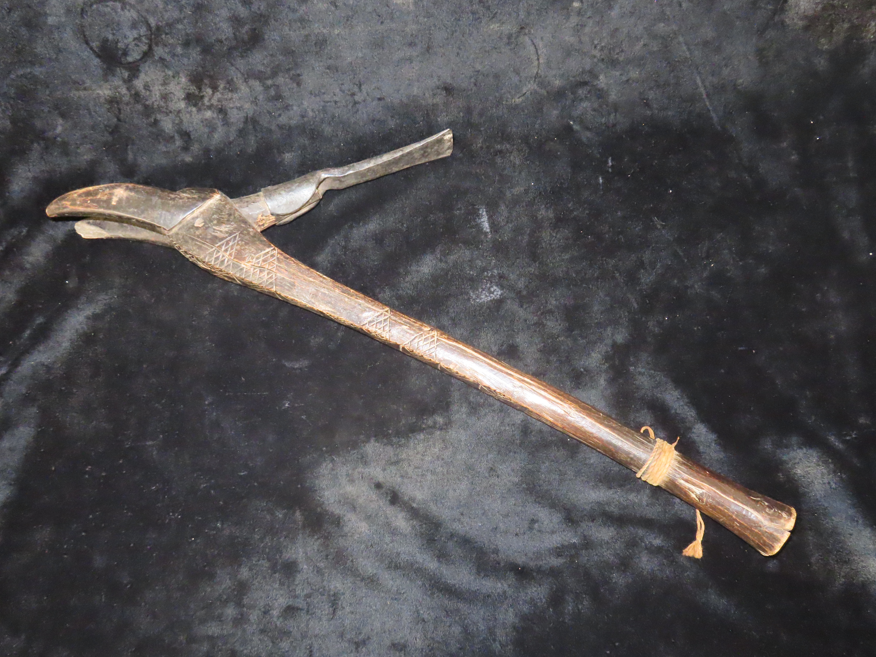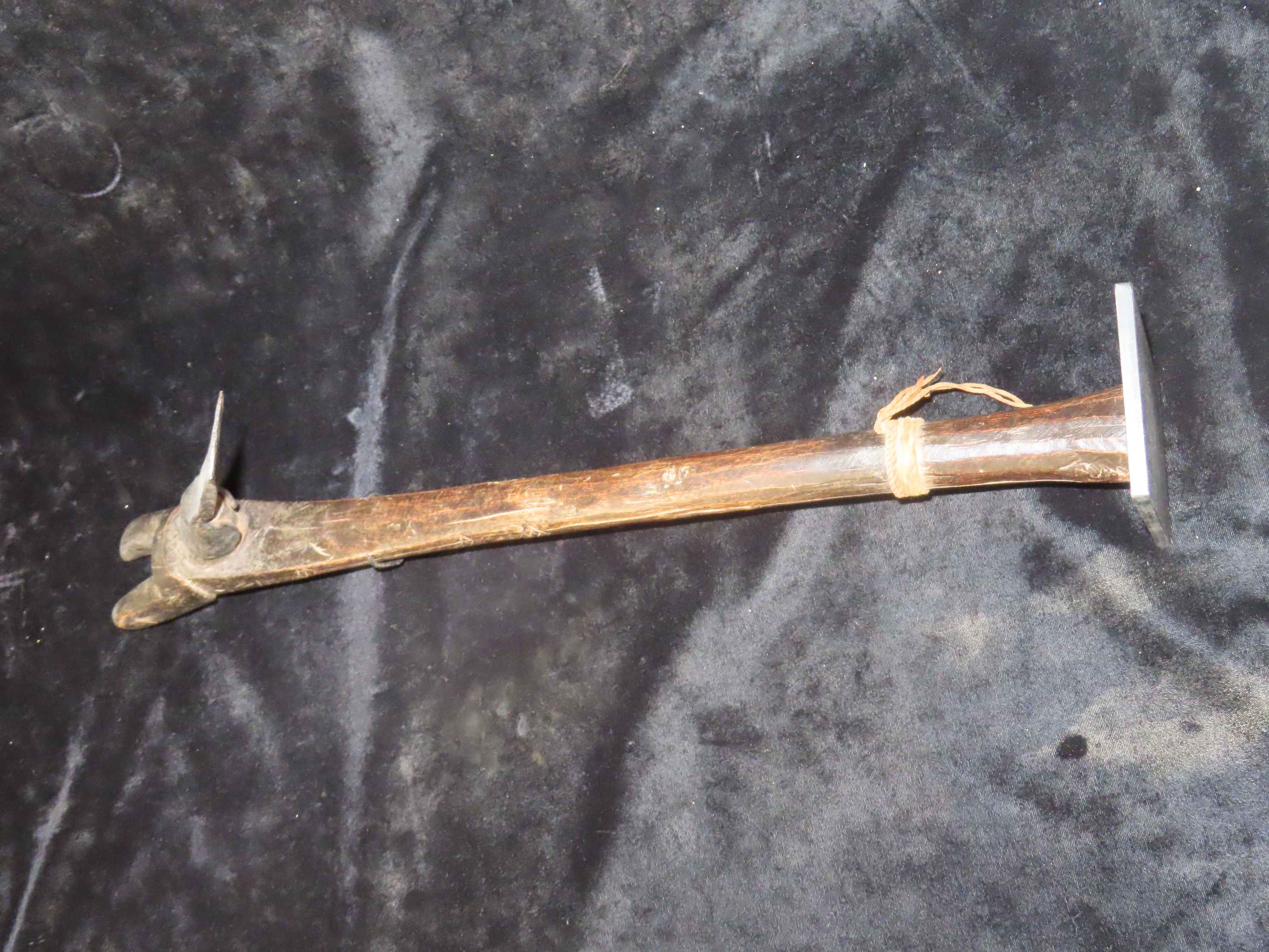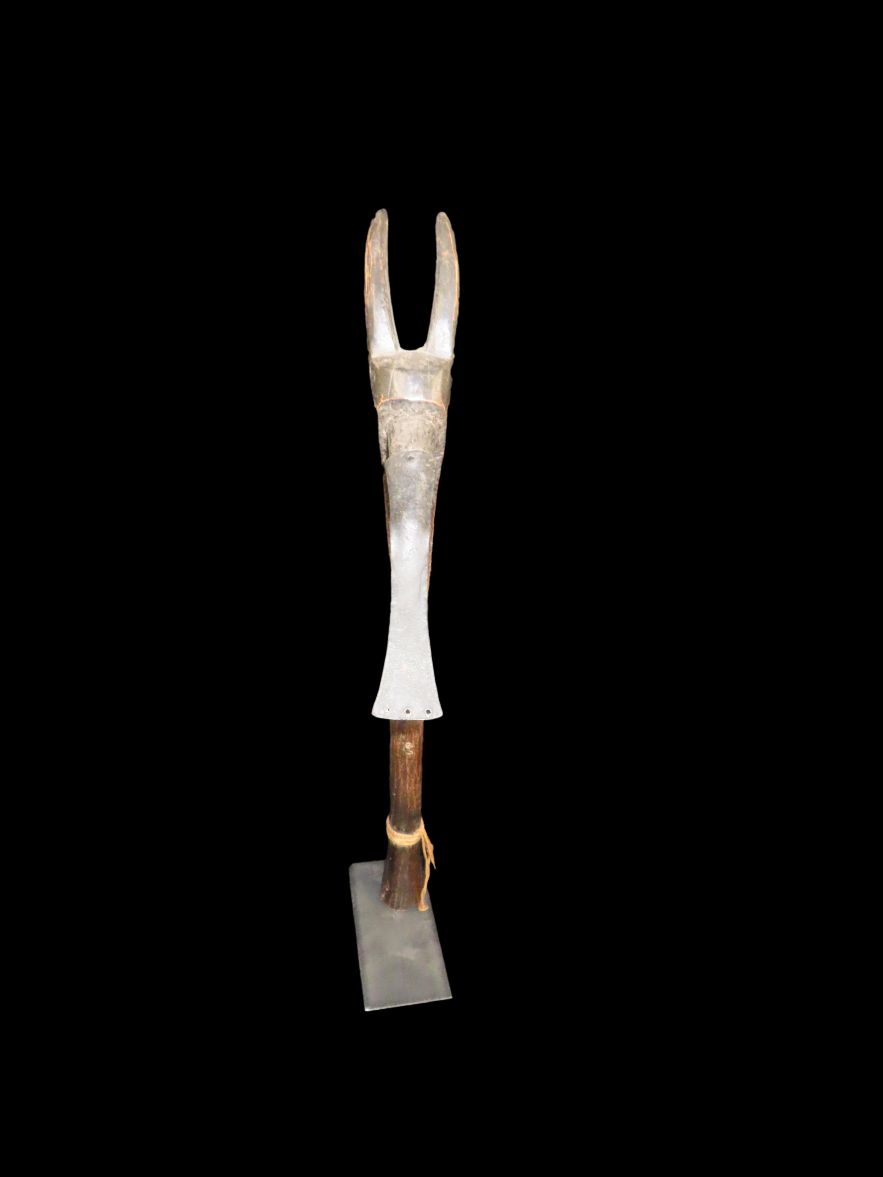 Amazing 24″ Animal Effigy Duckbill hafted Axe, Mali. Great, Well Designed handle with excellent age and patina. Comes with a Custom museum metal display stand.